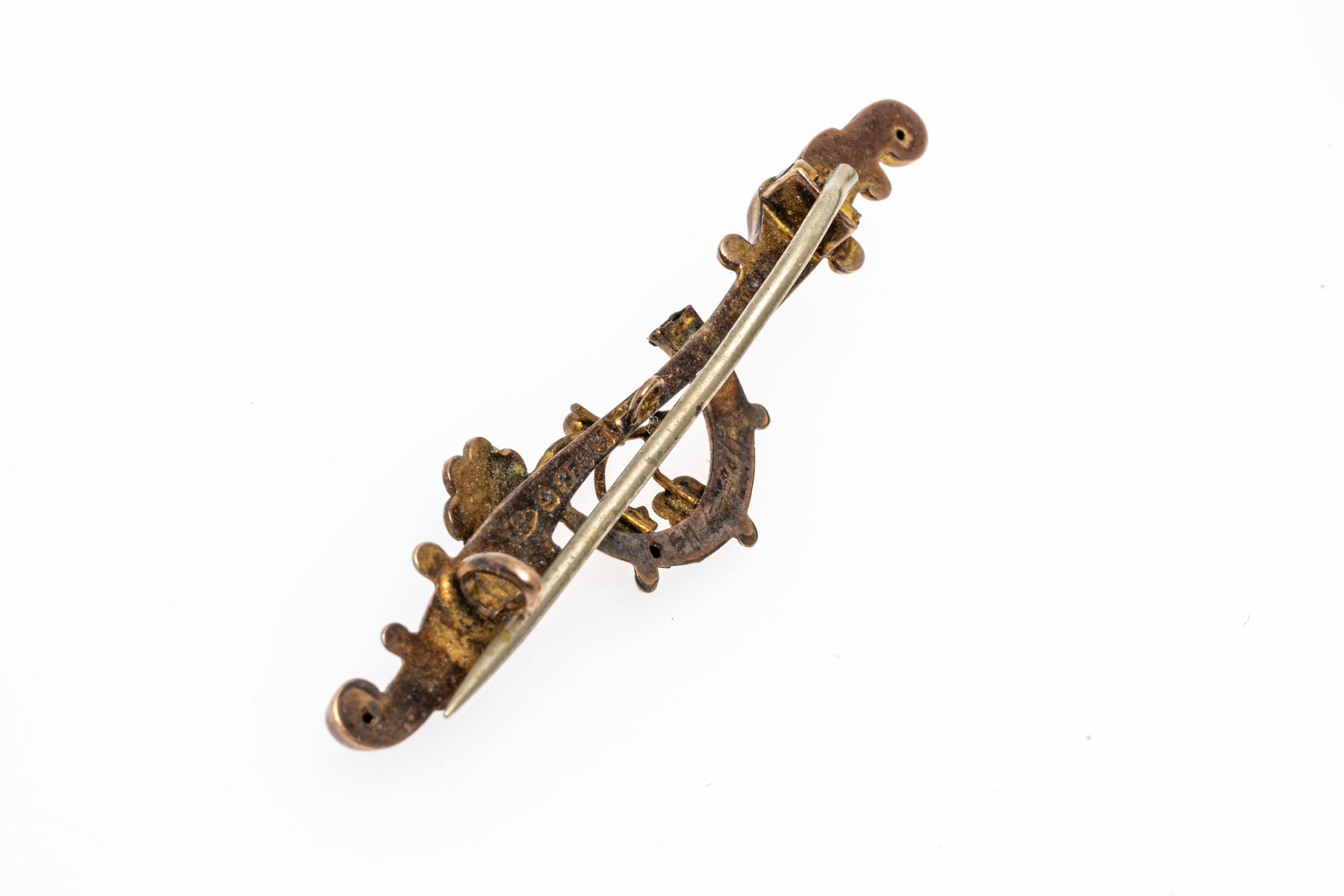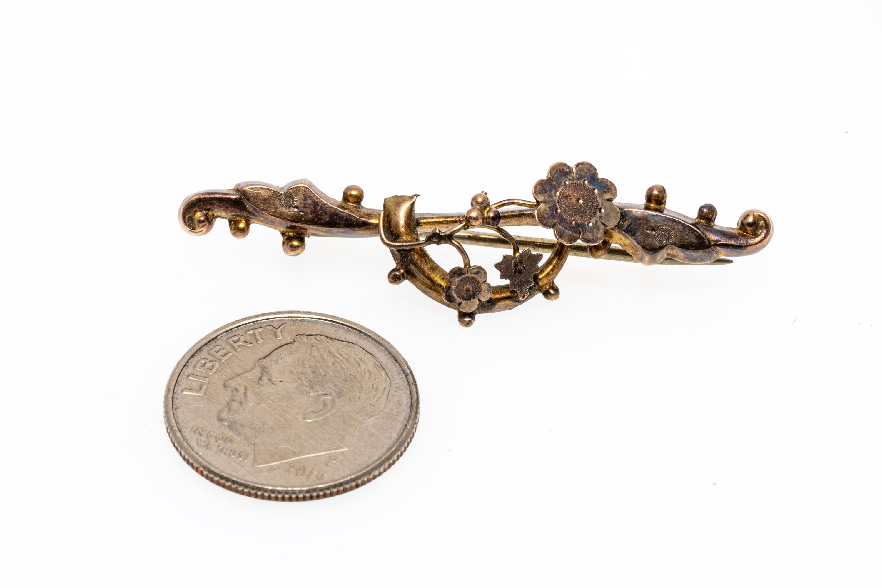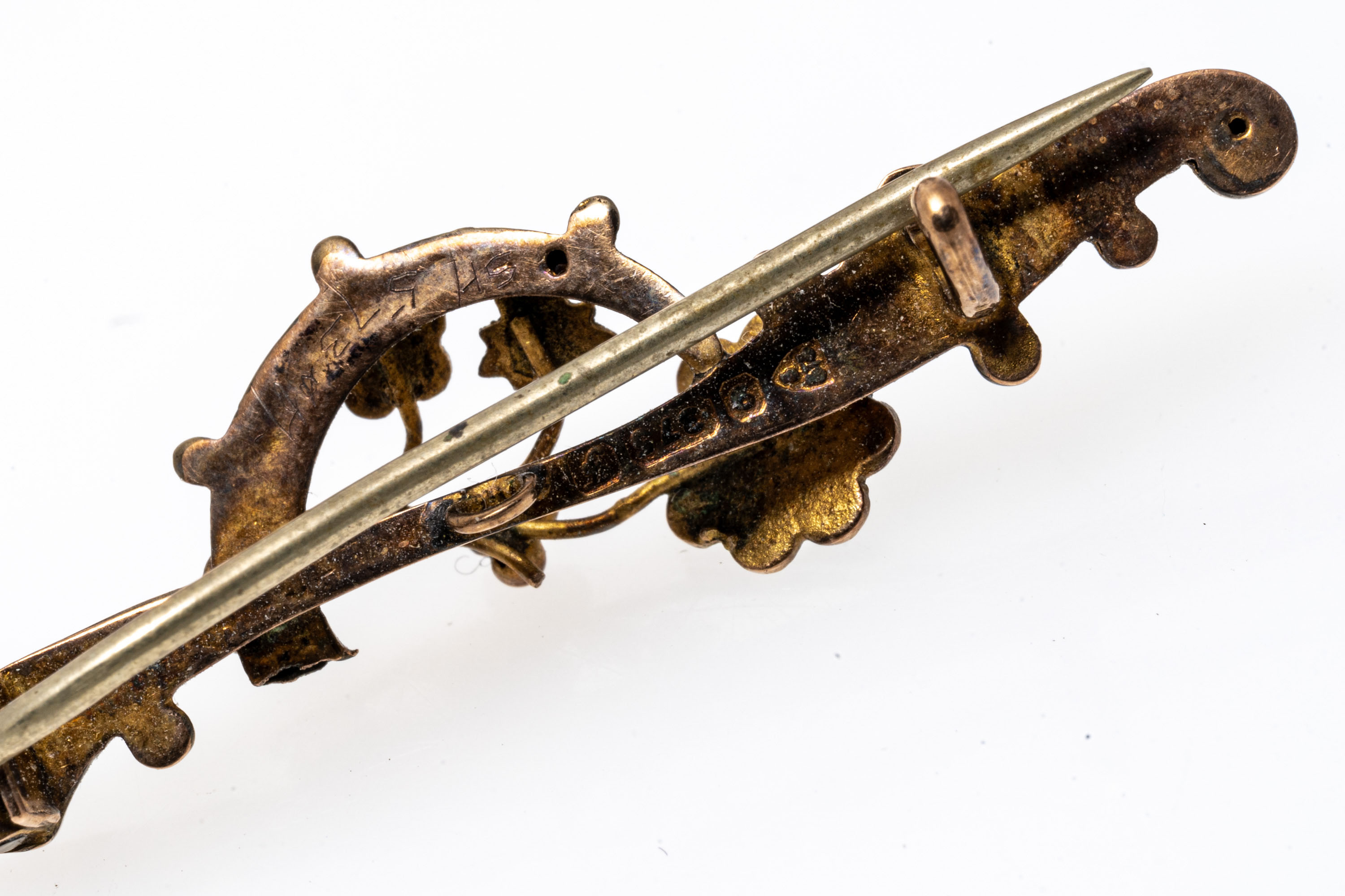 Collection of Victorian mourning jewelry, 9K and gold filled. Group of gold filled jewelry including bangle bracelet, and brooch. A gold filled and 9K circular brooch and a pair of screw clip back earrings. With this is a 9K yellow gold bar pin with a delicate floral design.