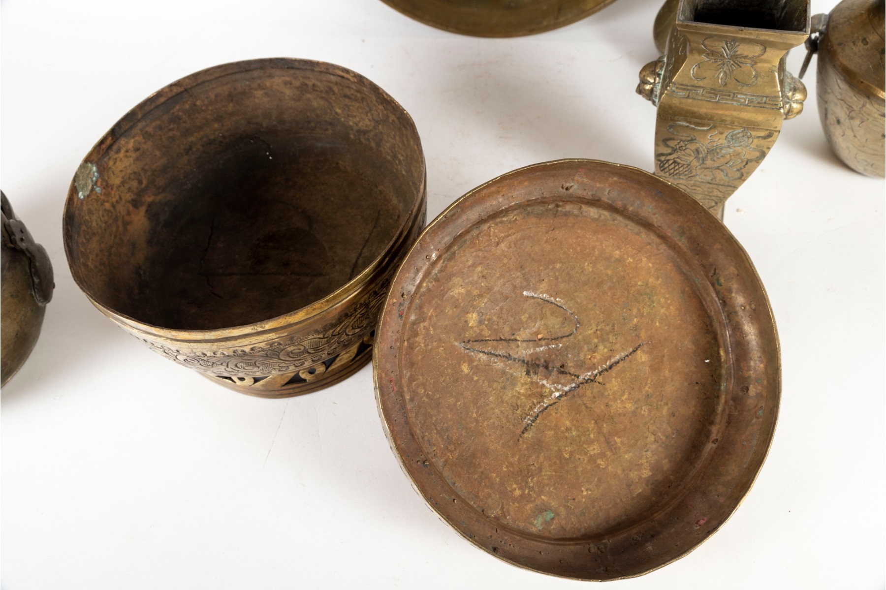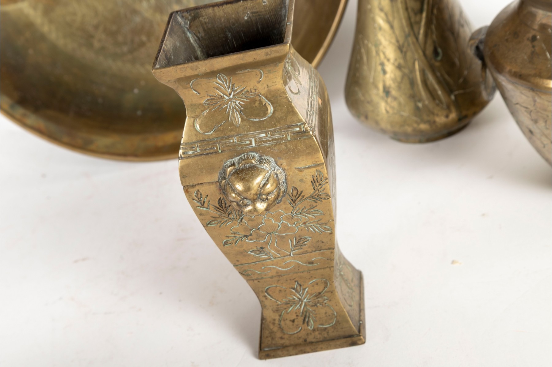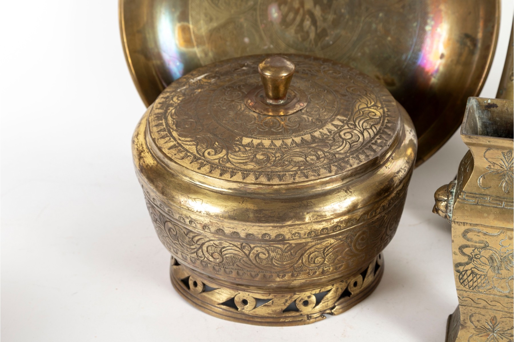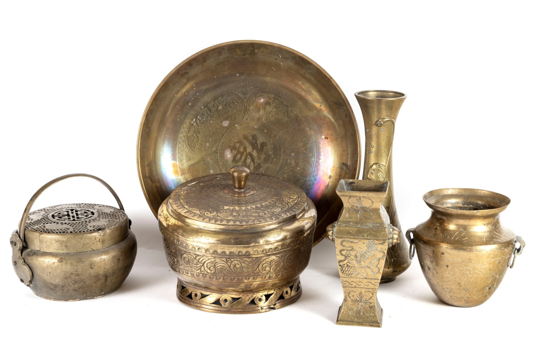 A mixed group of six vintage to antique brass items, showcasing ornate engraved designs and diverse cultural influences.