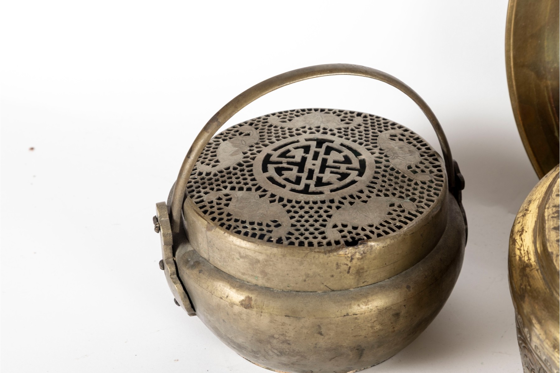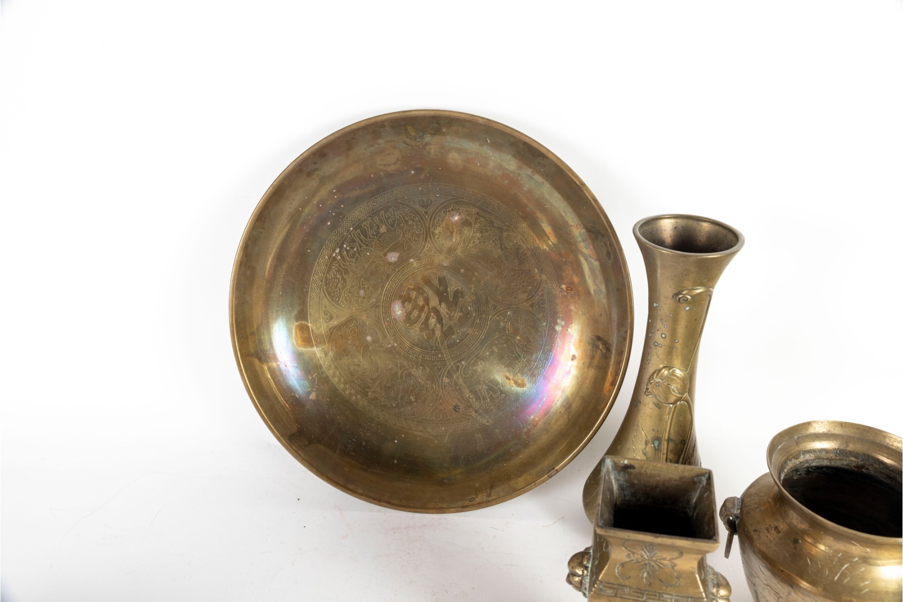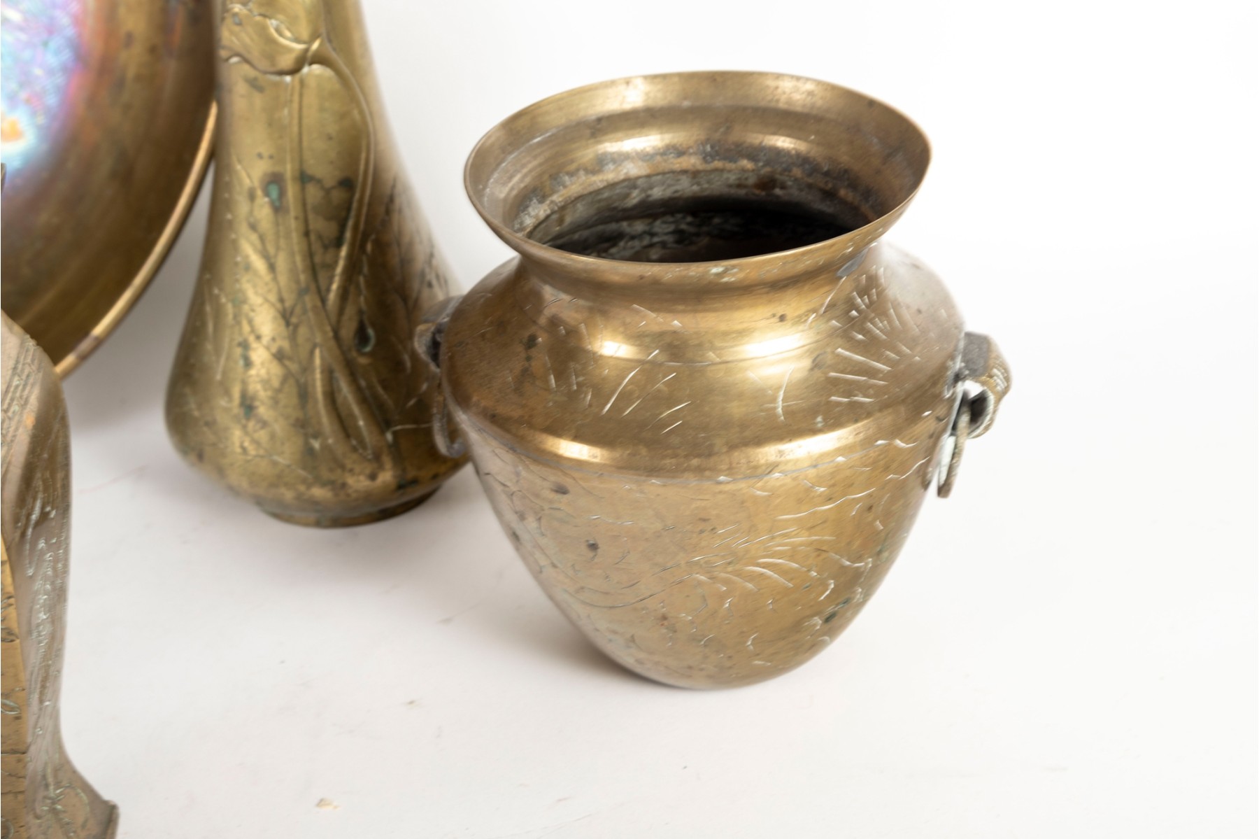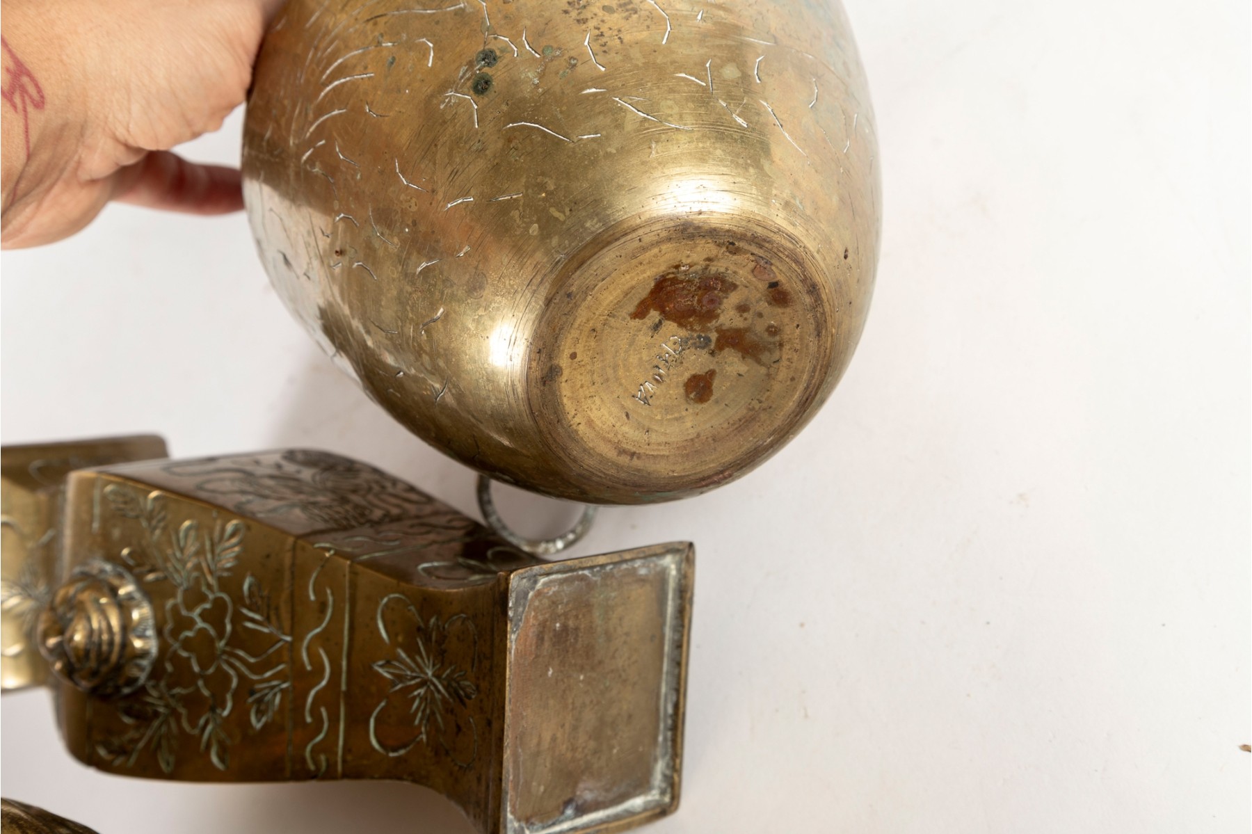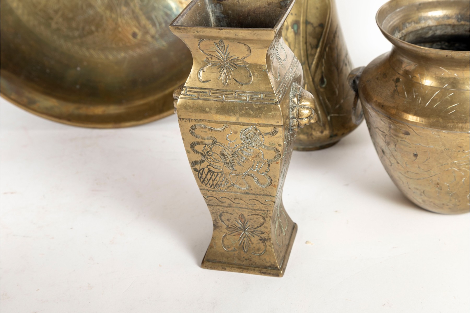 A mixed group of six vintage to antique brass items, showcasing ornate engraved designs and diverse cultural influences.