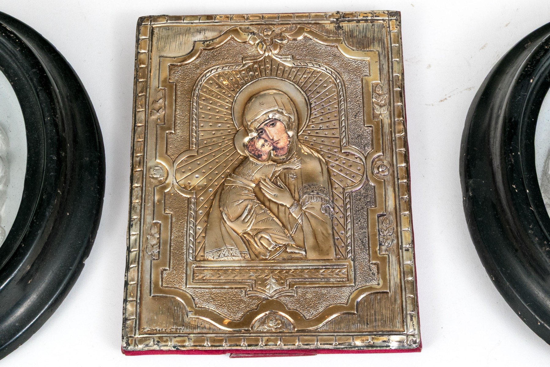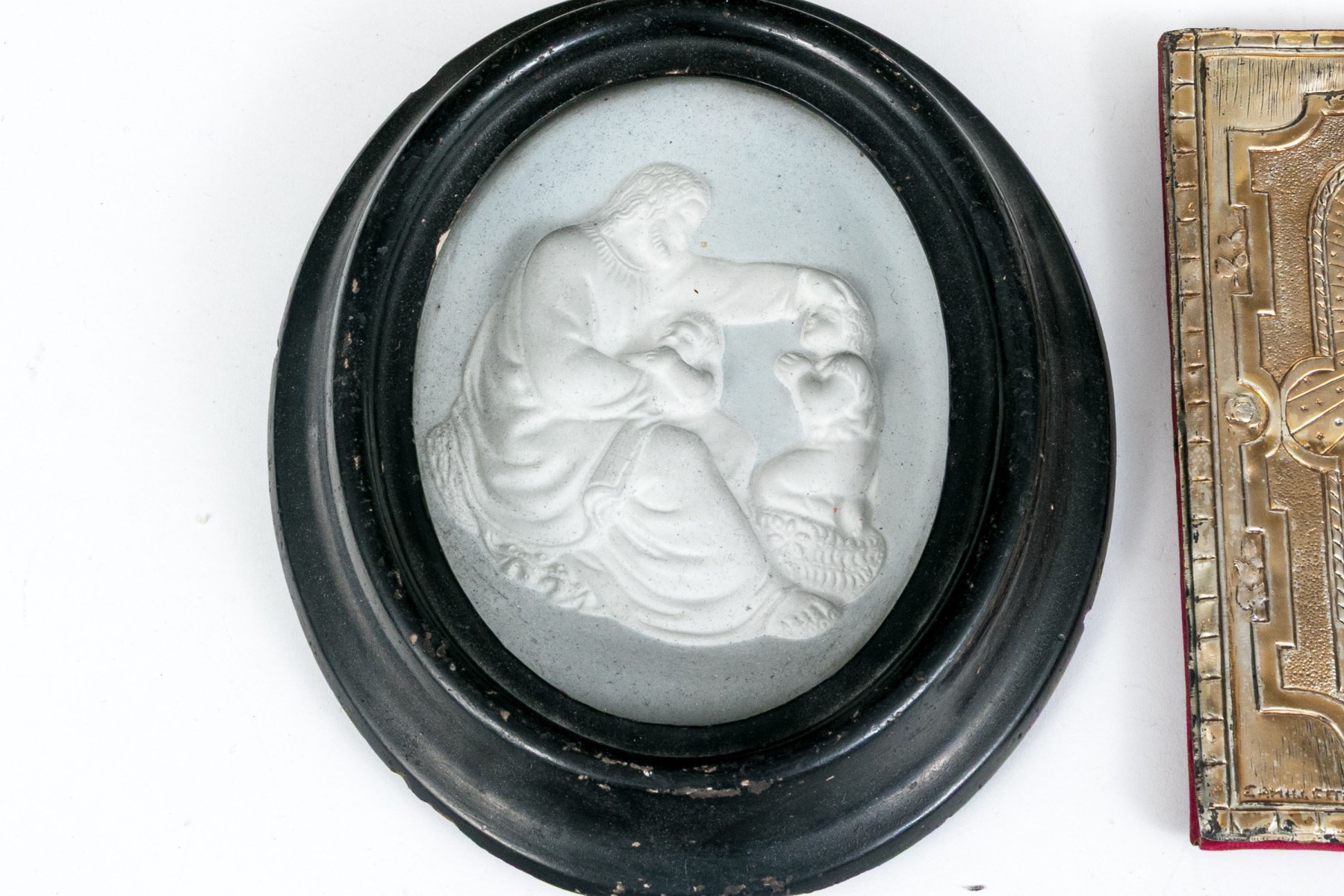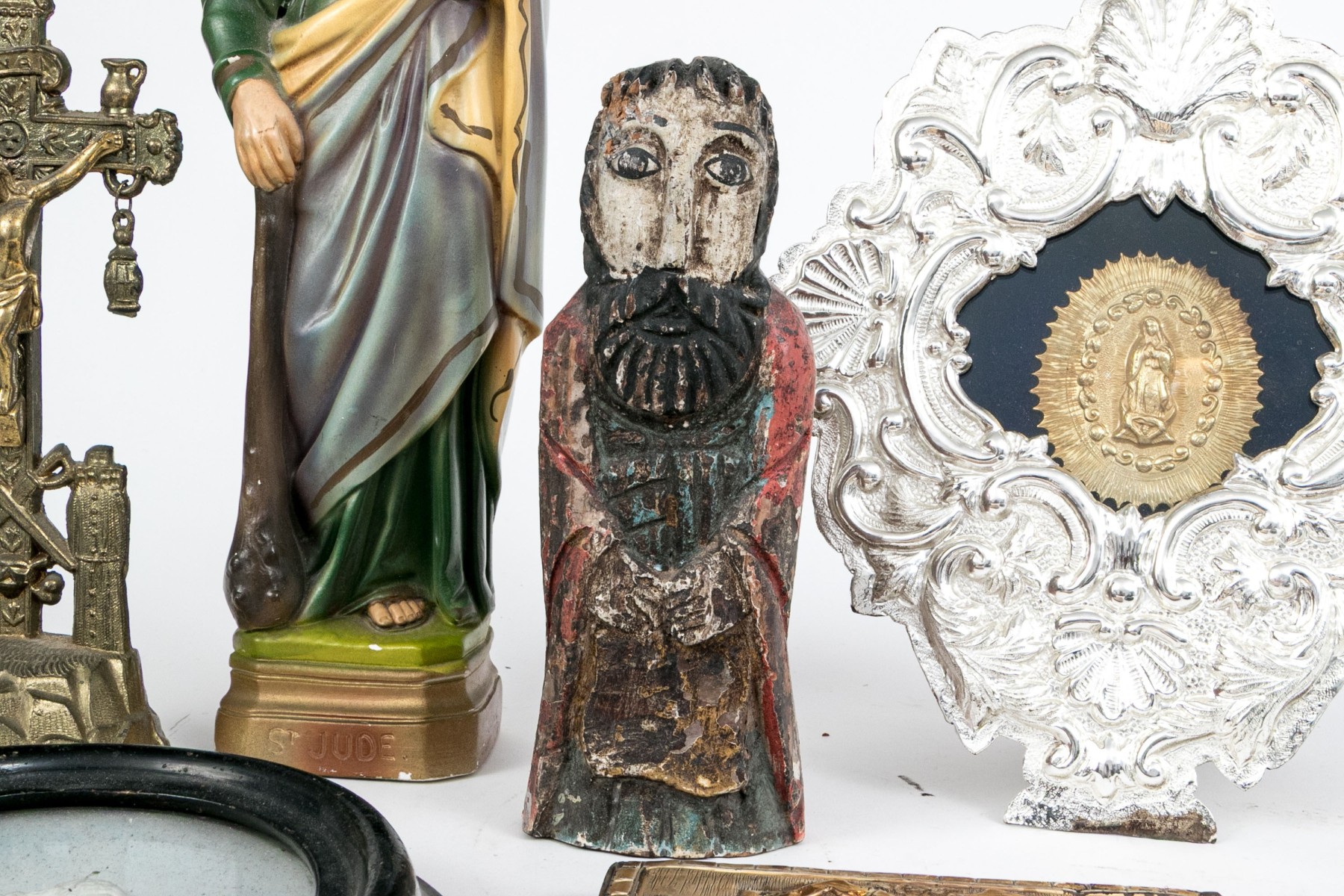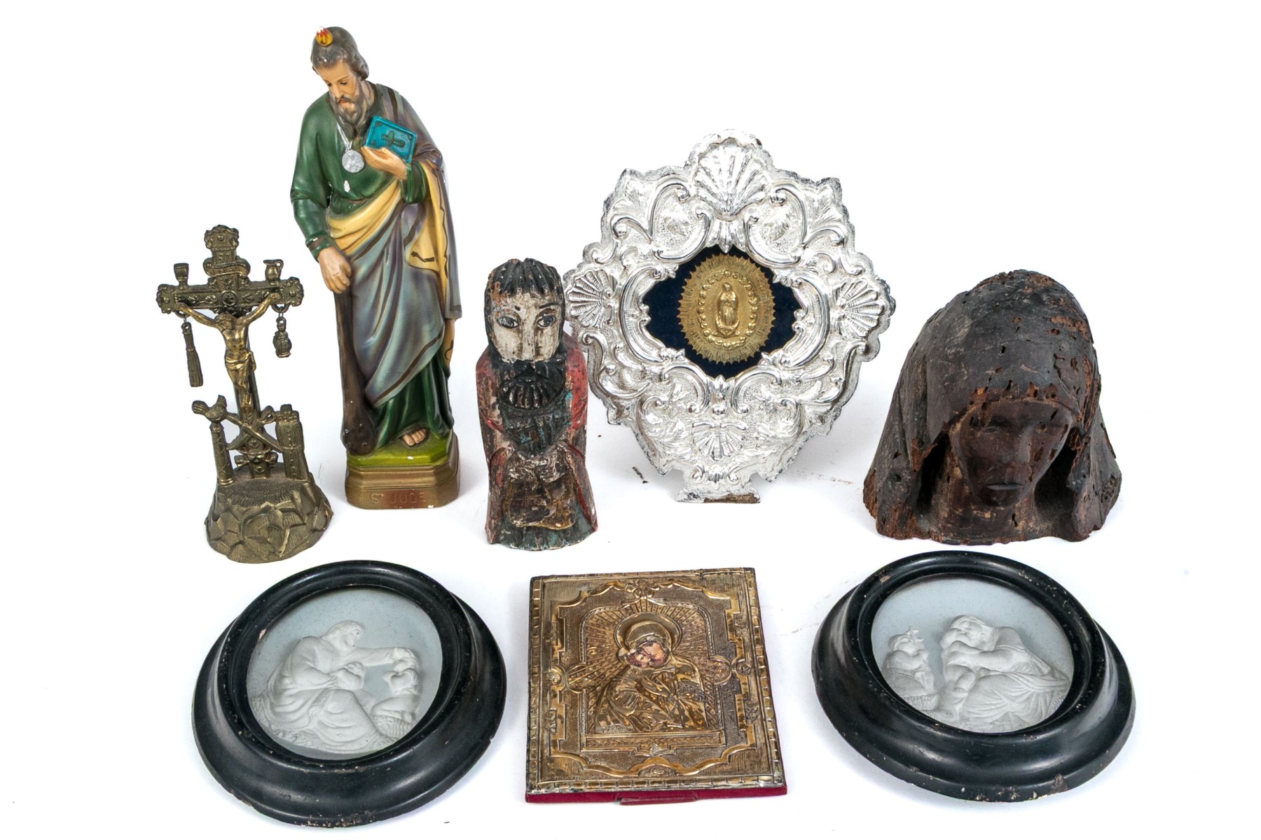 Comprised of carved wood figures, 19th century. intaglio shadow plaques, a reproduction Russian icon, and a vintage plaster saint.