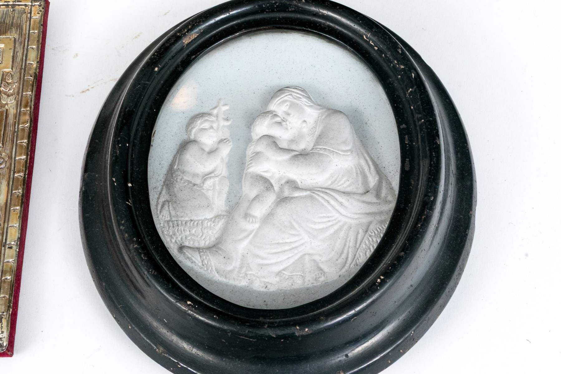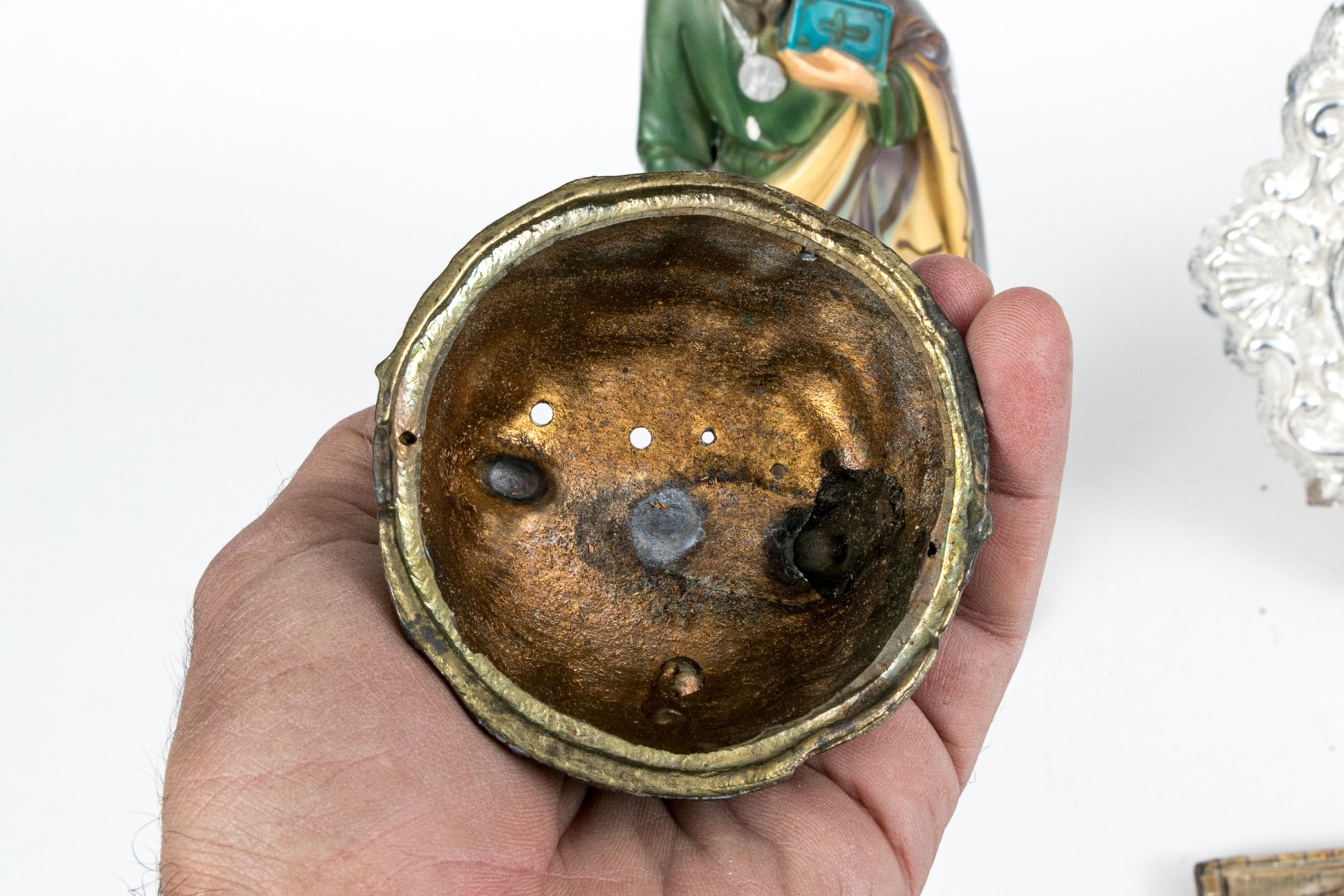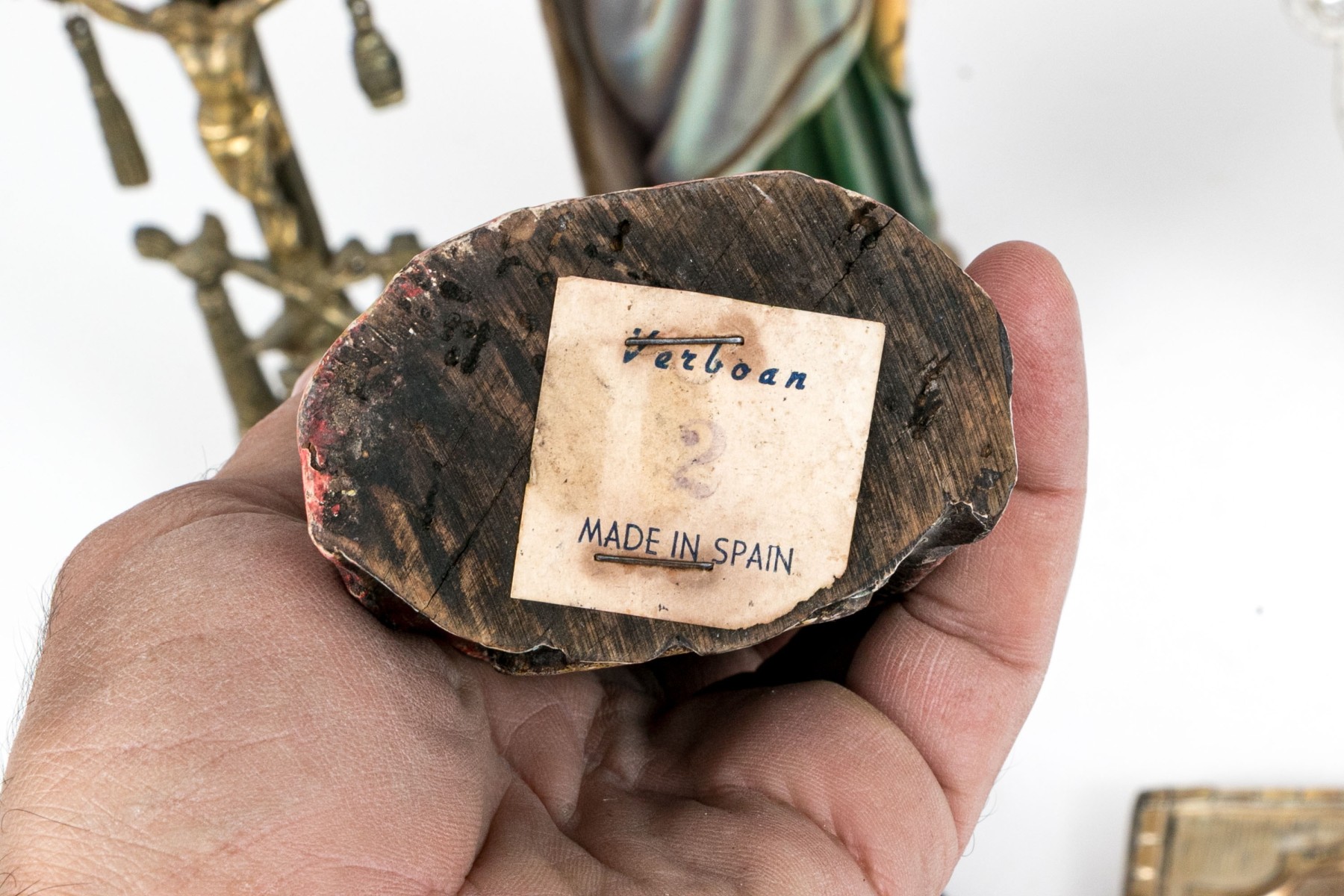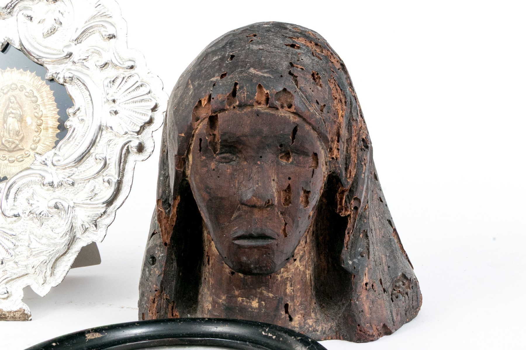 Comprised of carved wood figures, 19th century. intaglio shadow plaques, a reproduction Russian icon, and a vintage plaster saint.