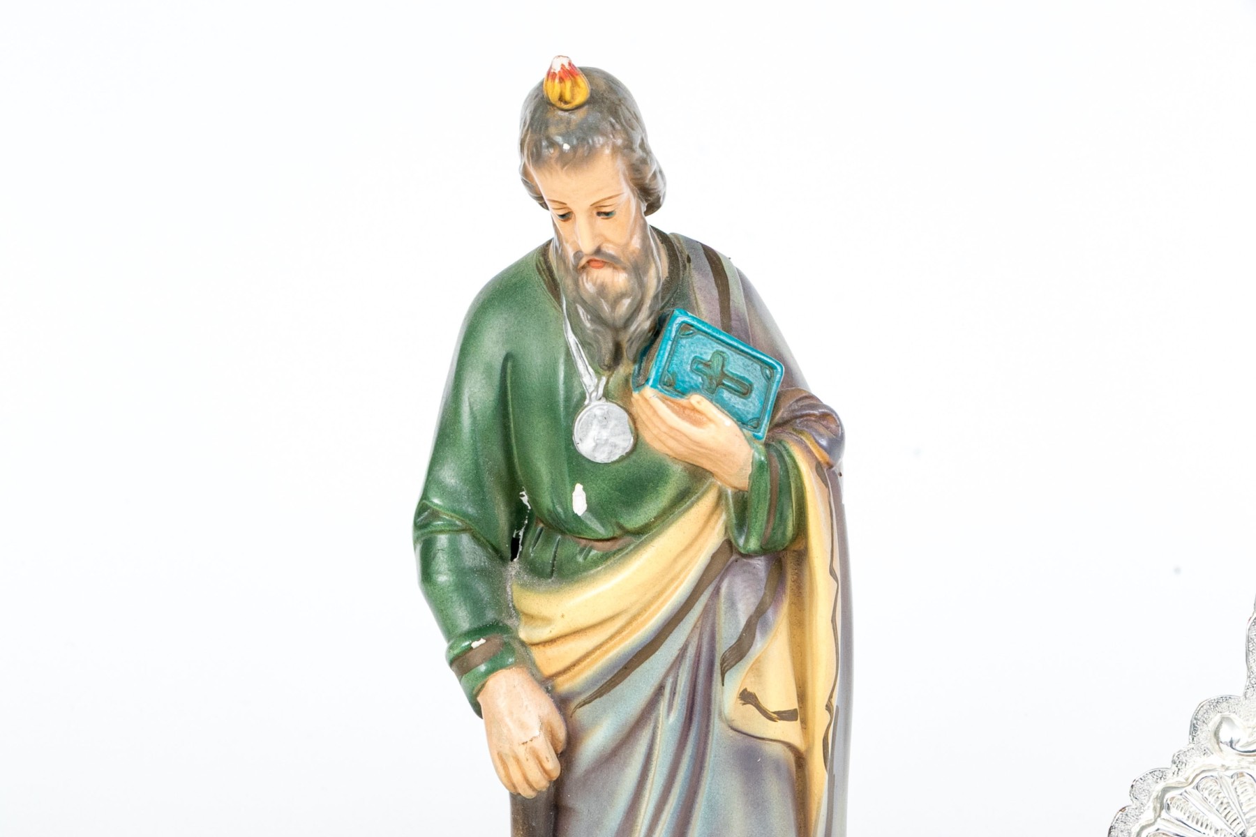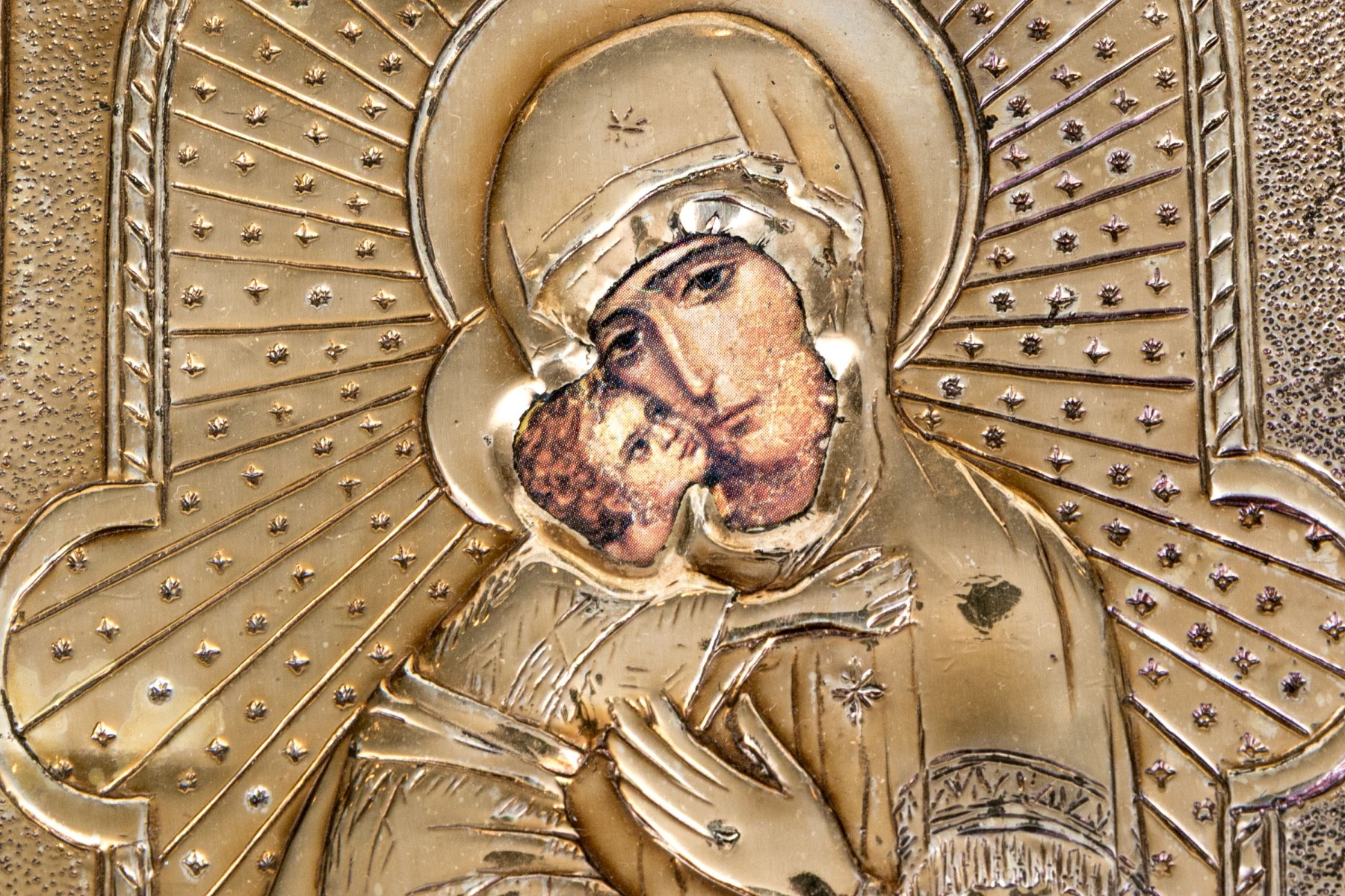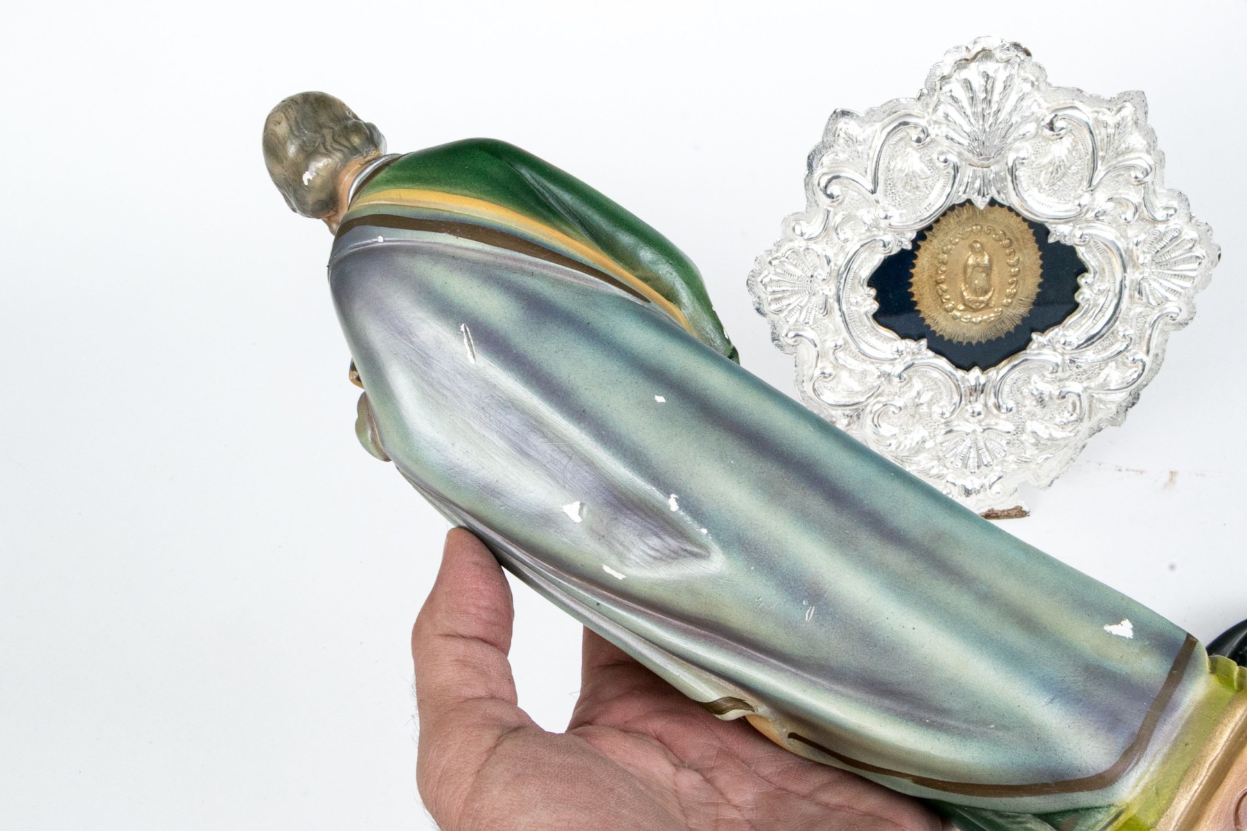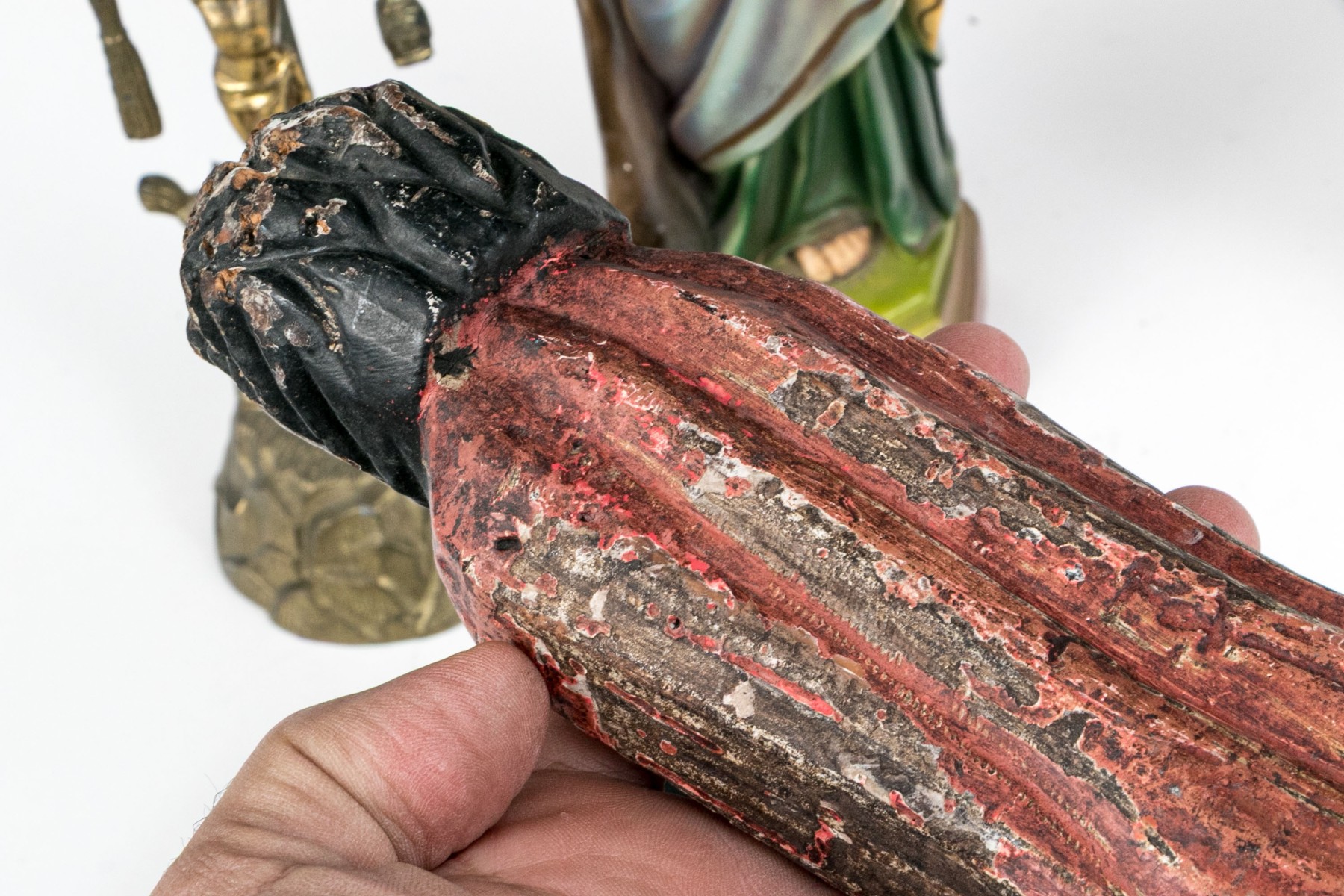 Comprised of carved wood figures, 19th century. intaglio shadow plaques, a reproduction Russian icon, and a vintage plaster saint.