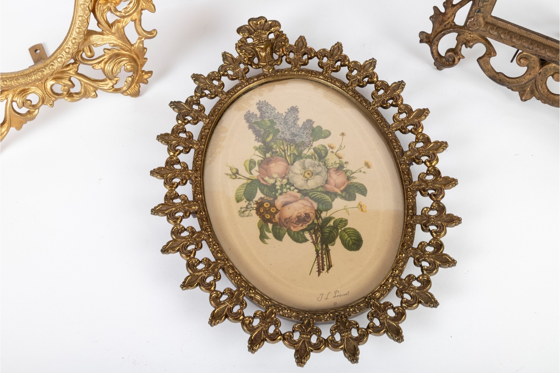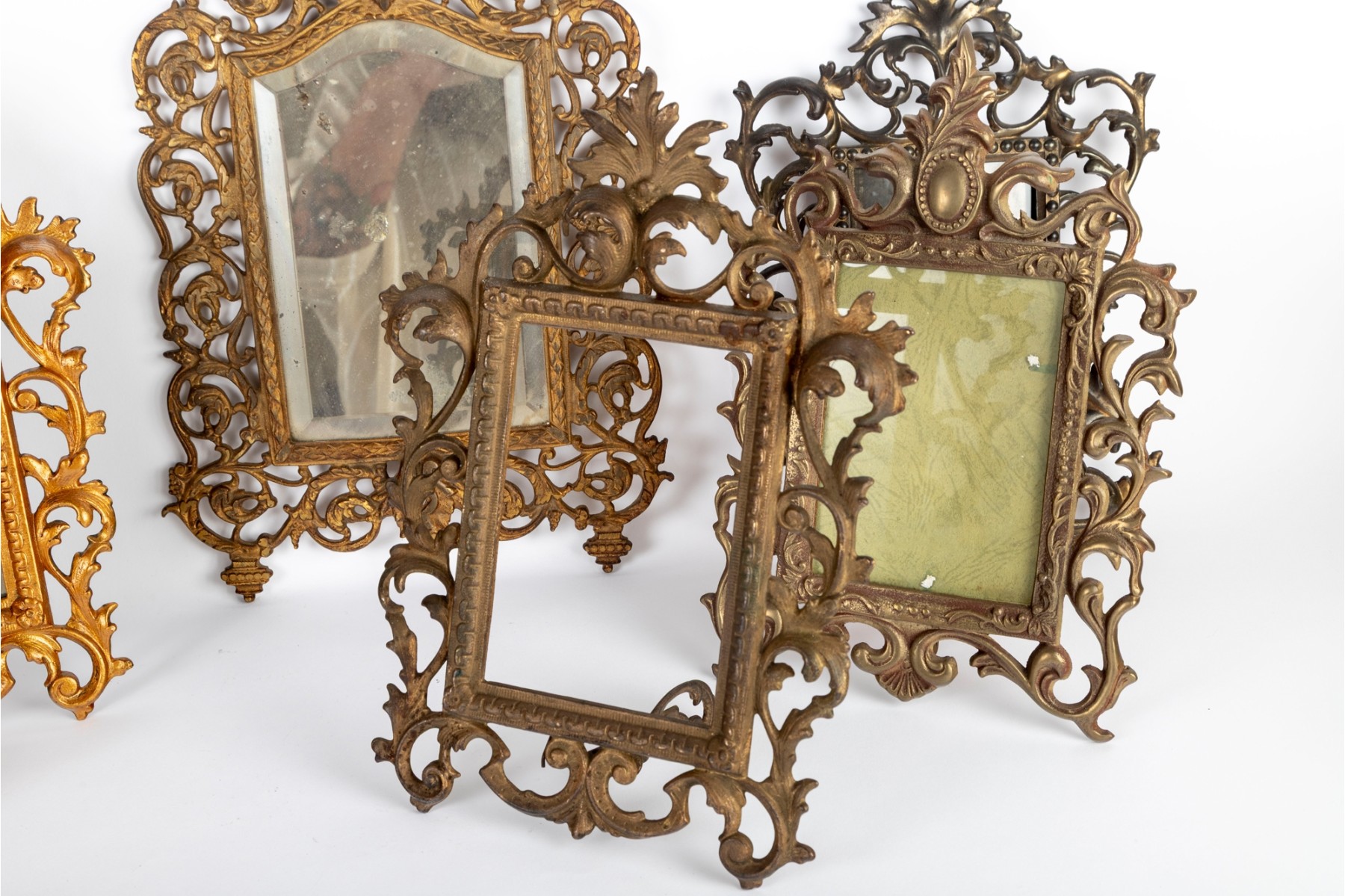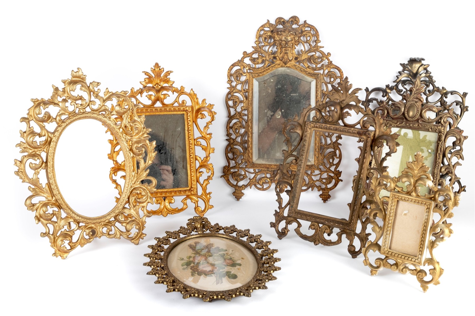 A fantastic collection of vintage frames, mostly tabletop mirrors with easel backs. Frames are all designed with gorgeous foliate openwork, one with a Green Man motif at the crest. One with a print of flowers surrounded by a fleur-de-lis border.