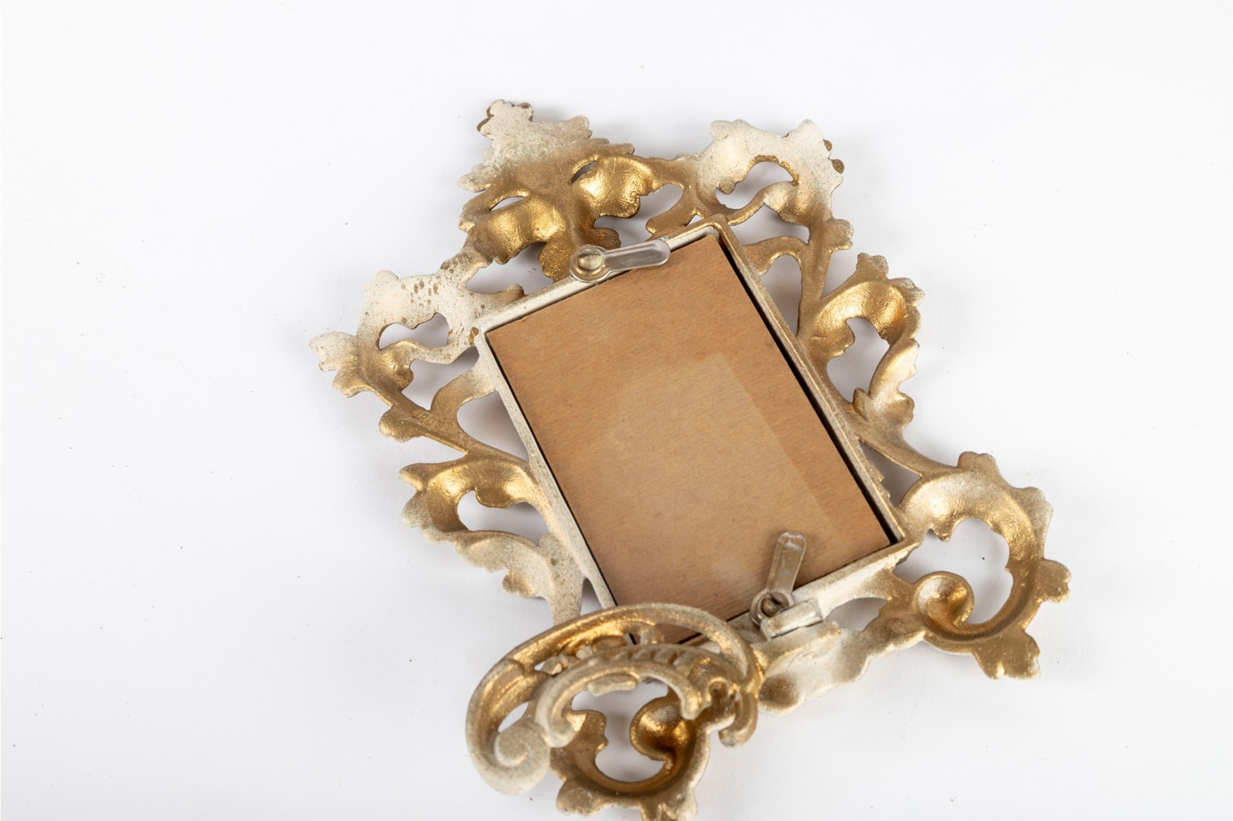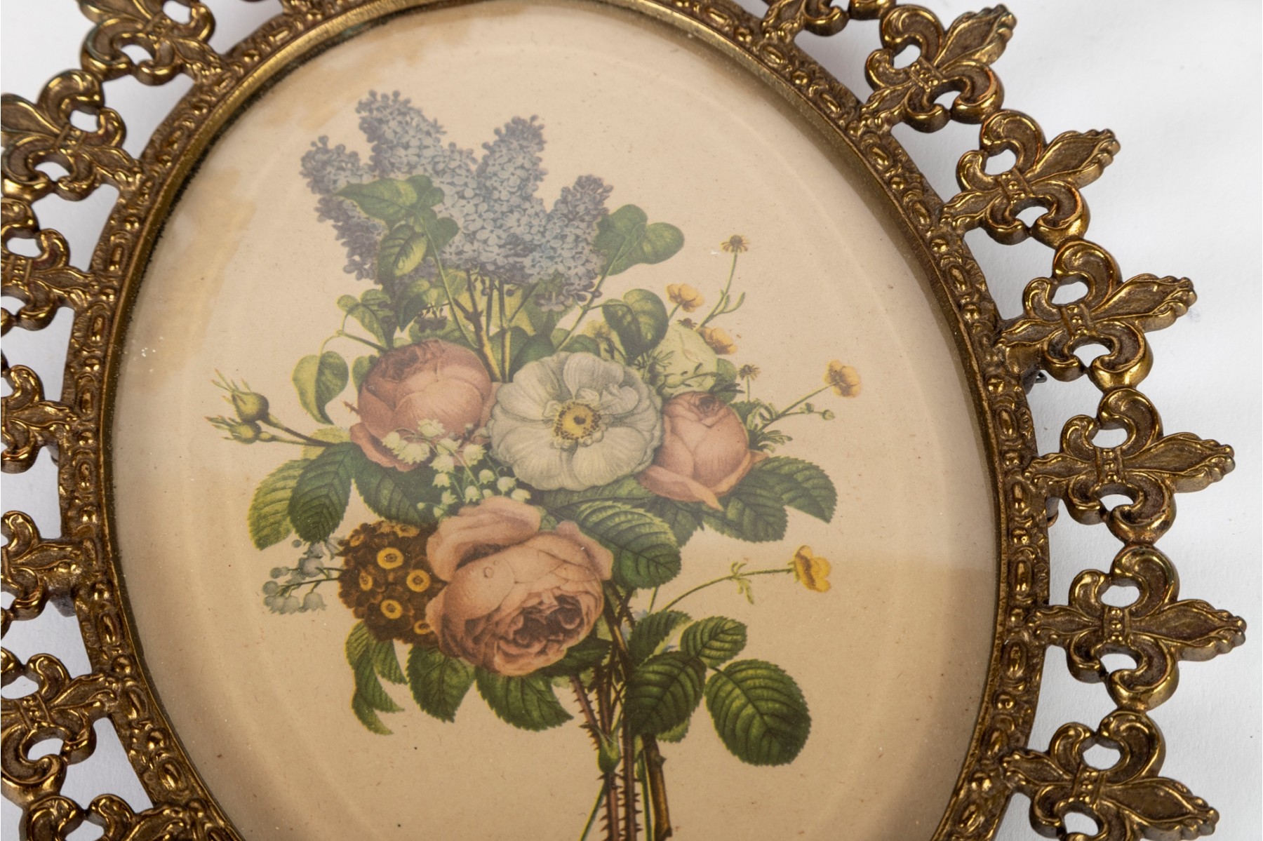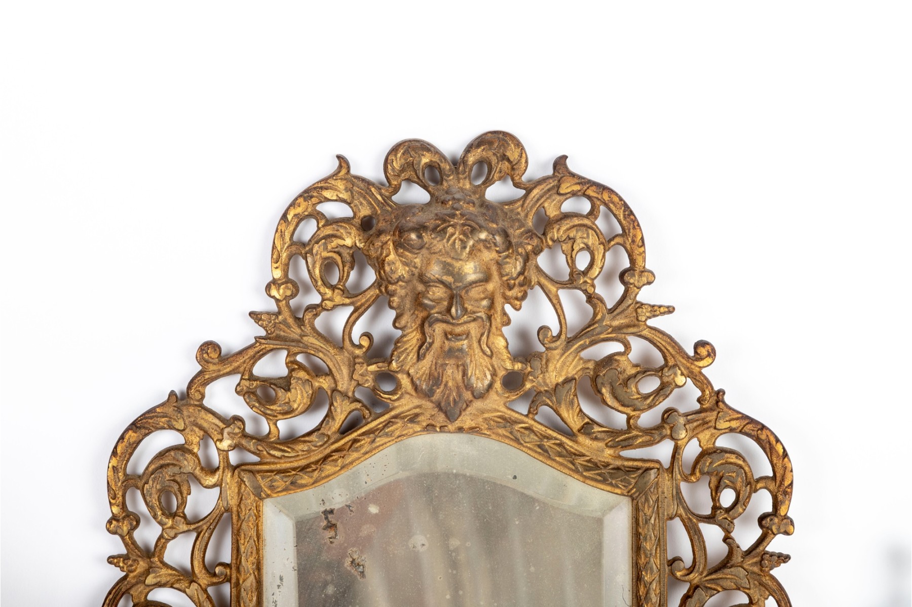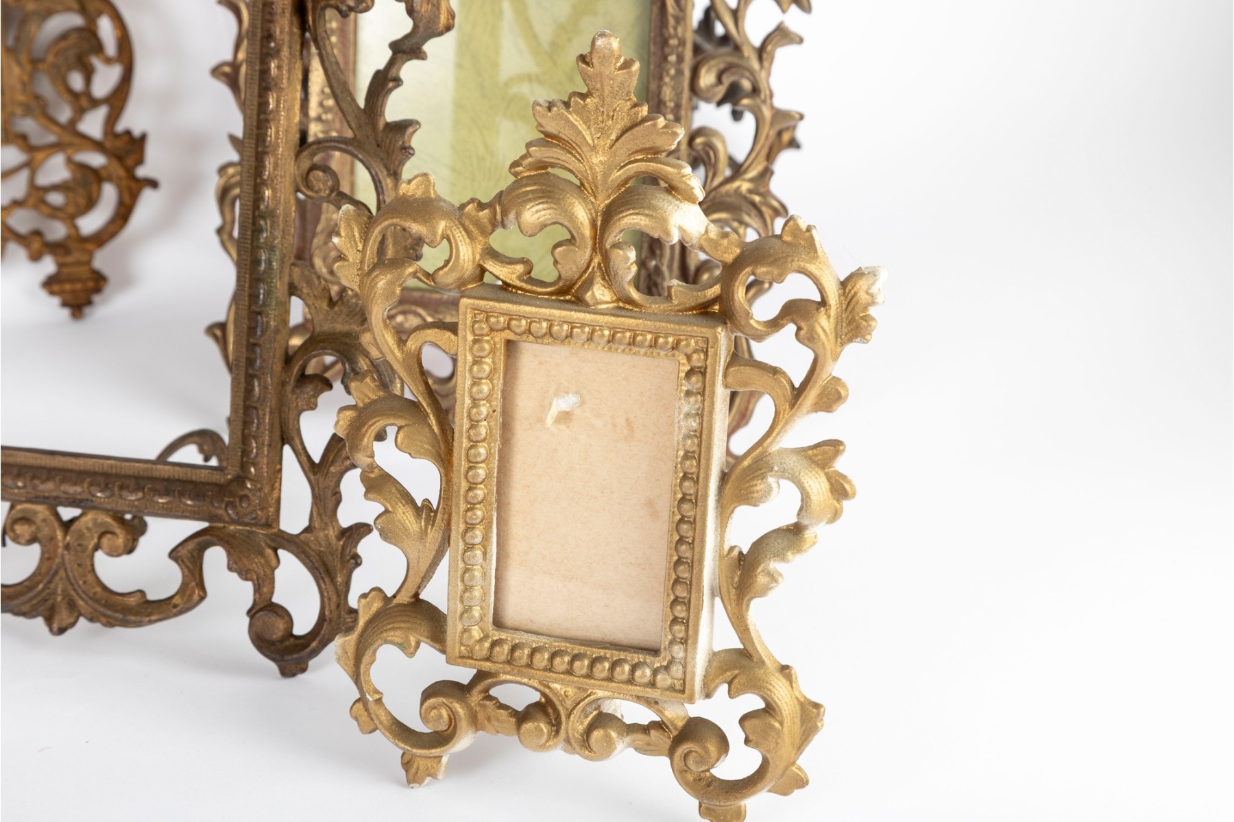 A fantastic collection of vintage frames, mostly tabletop mirrors with easel backs. Frames are all designed with gorgeous foliate openwork, one with a Green Man motif at the crest. One with a print of flowers surrounded by a fleur-de-lis border.