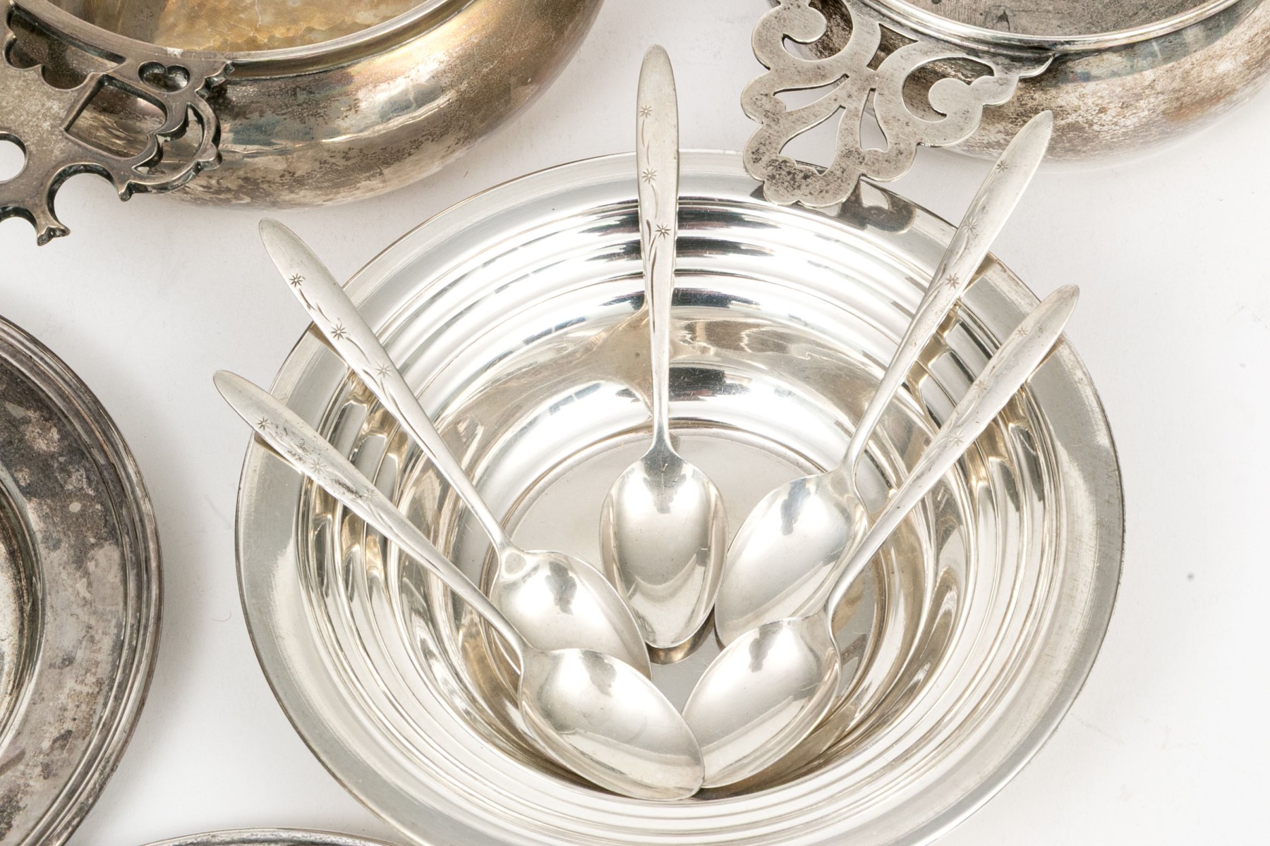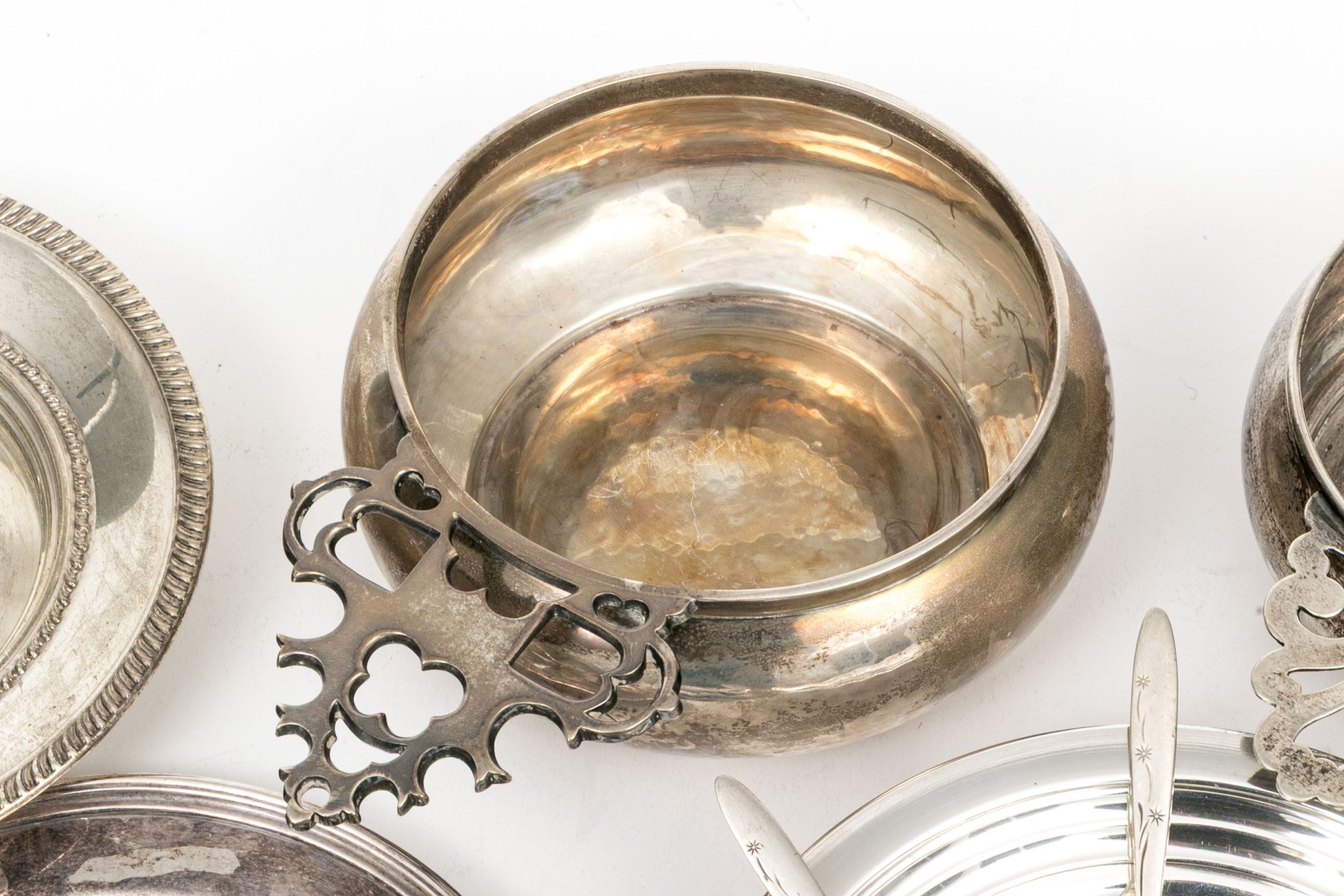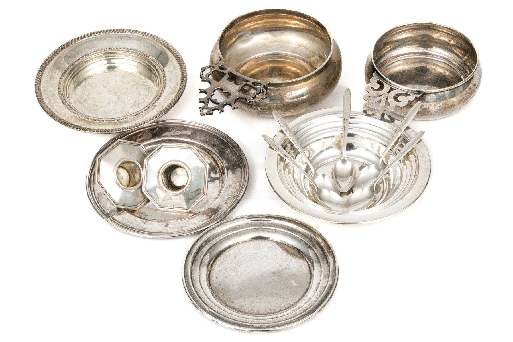 A wonderful collection of antique sterling silver including a J.E. Caldwell porringer, Boardman porringer, plates, bobeches, and a set of three demitasse spoons.