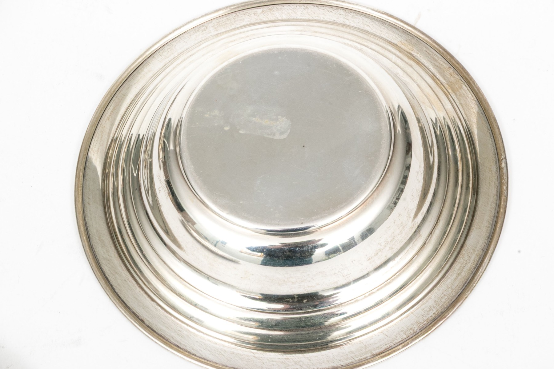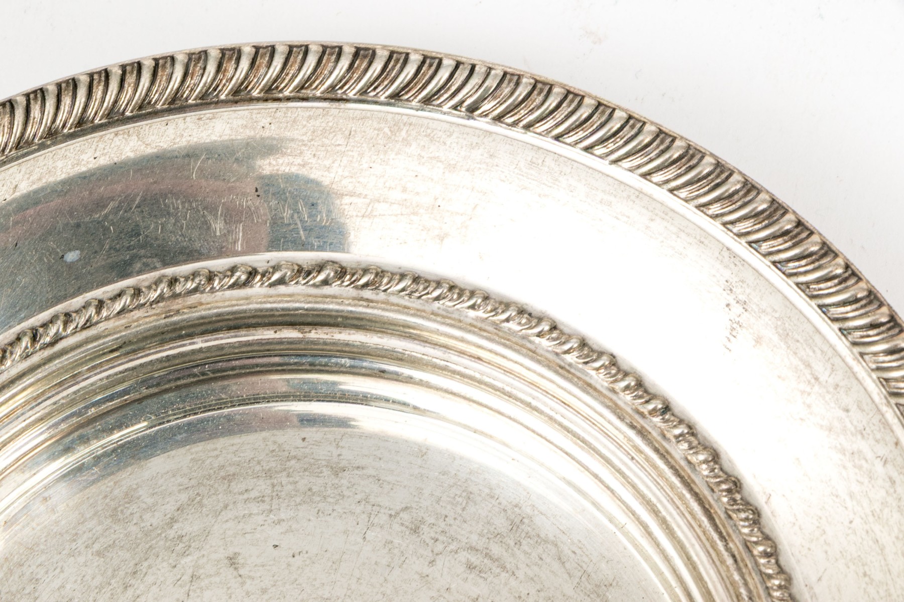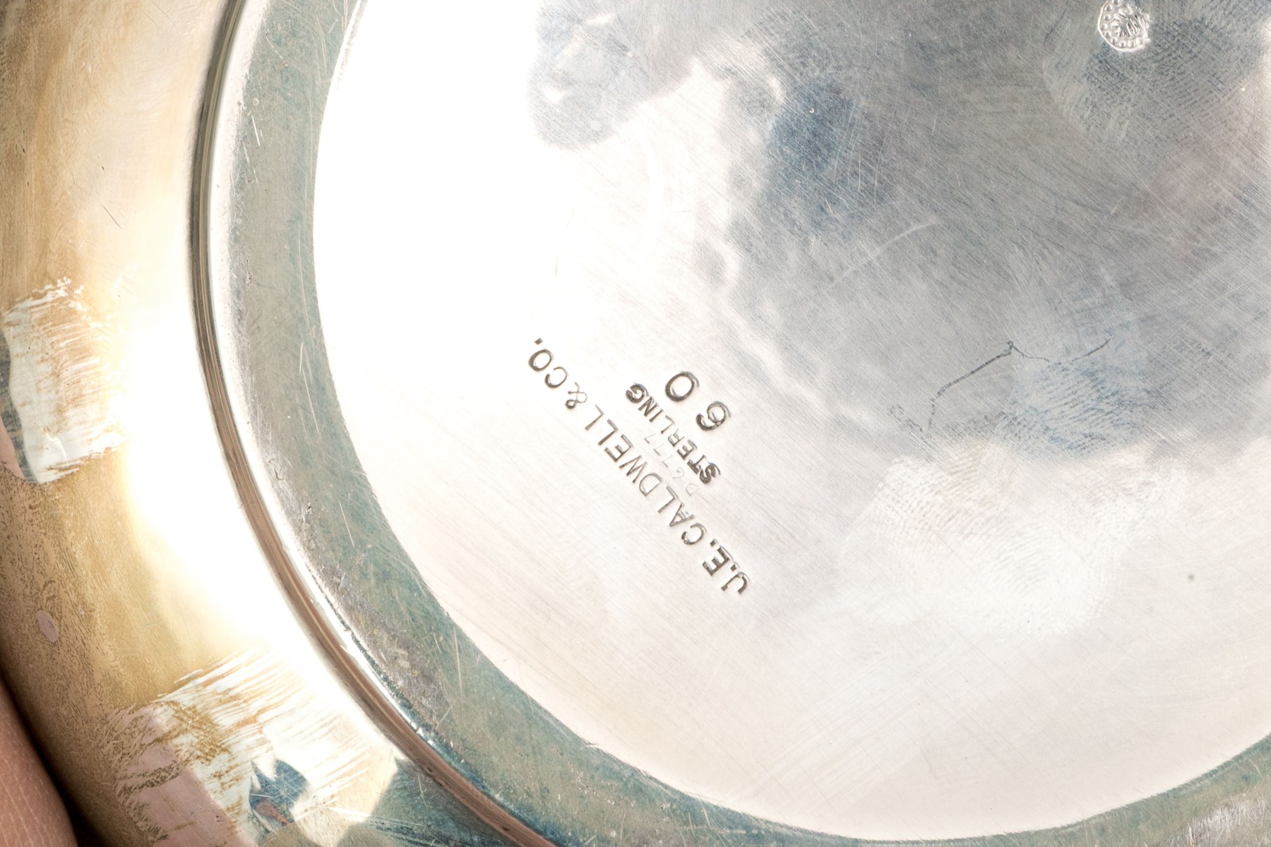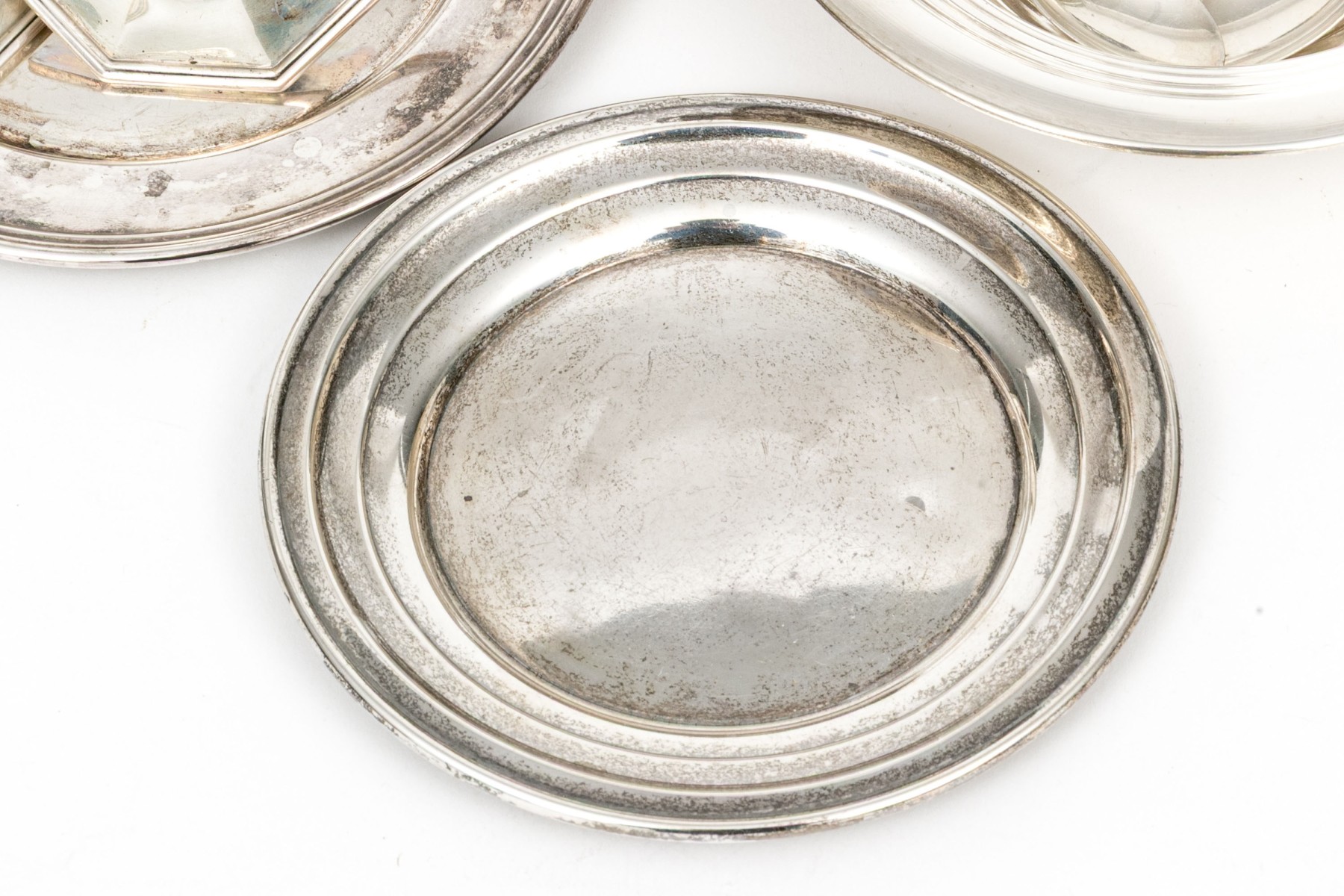 A wonderful collection of antique sterling silver including a J.E. Caldwell porringer, Boardman porringer, plates, bobeches, and a set of three demitasse spoons.