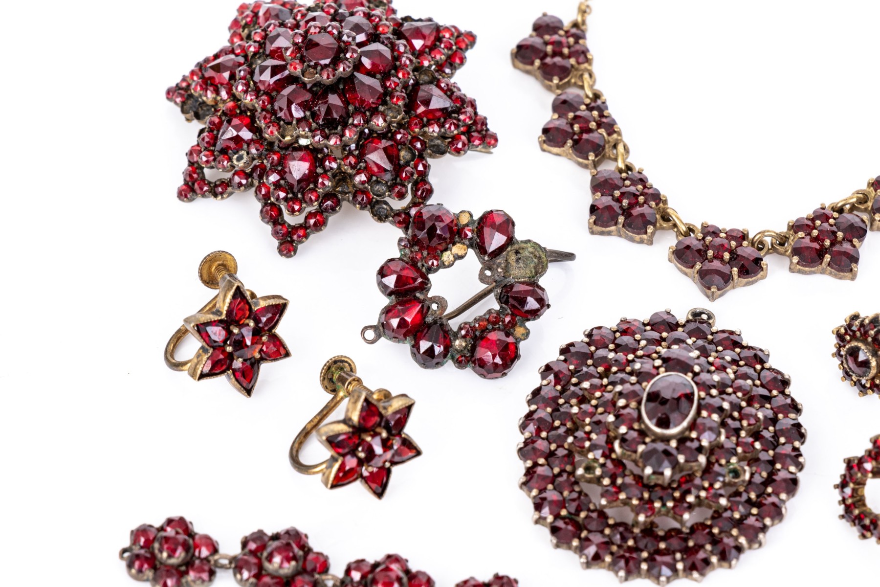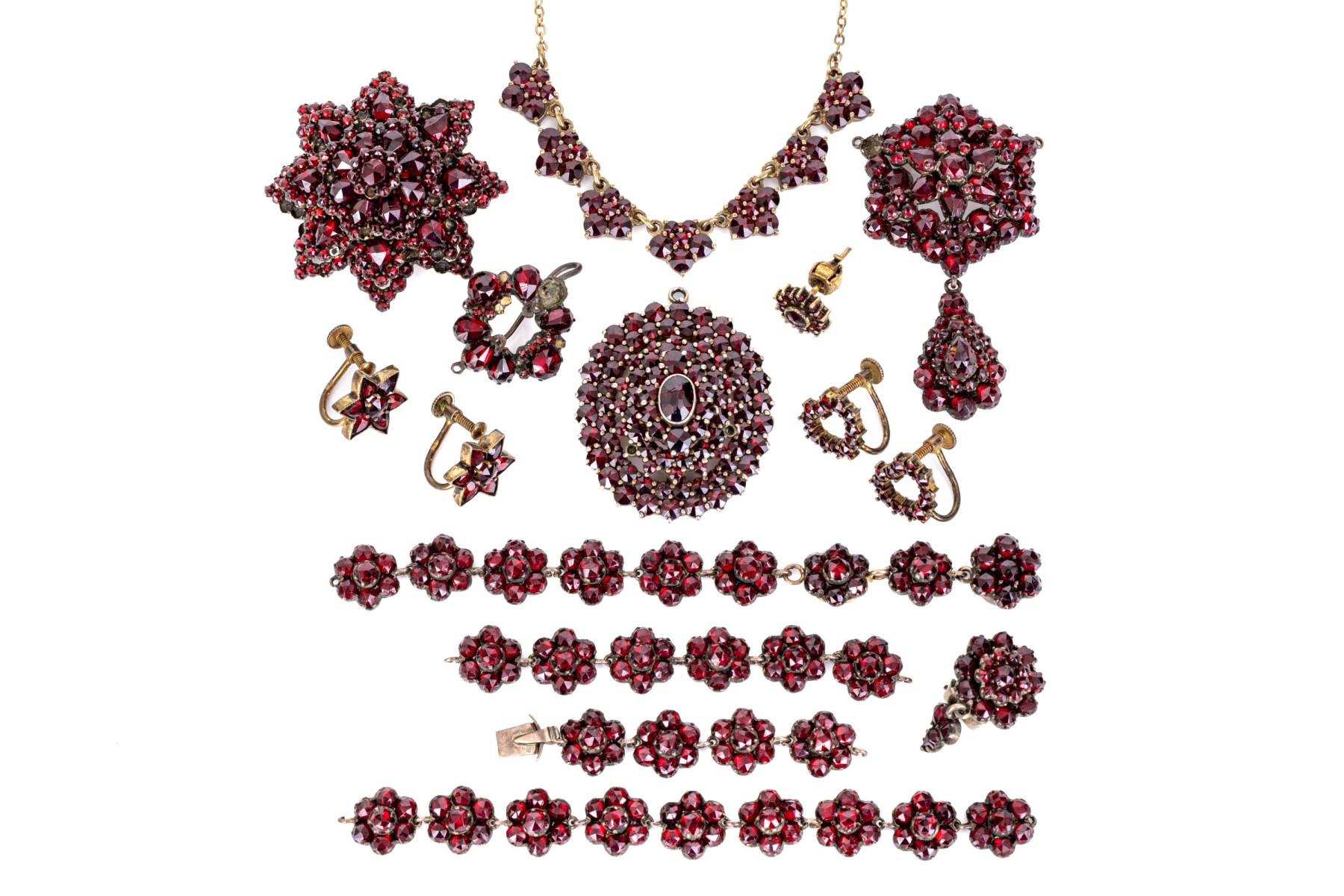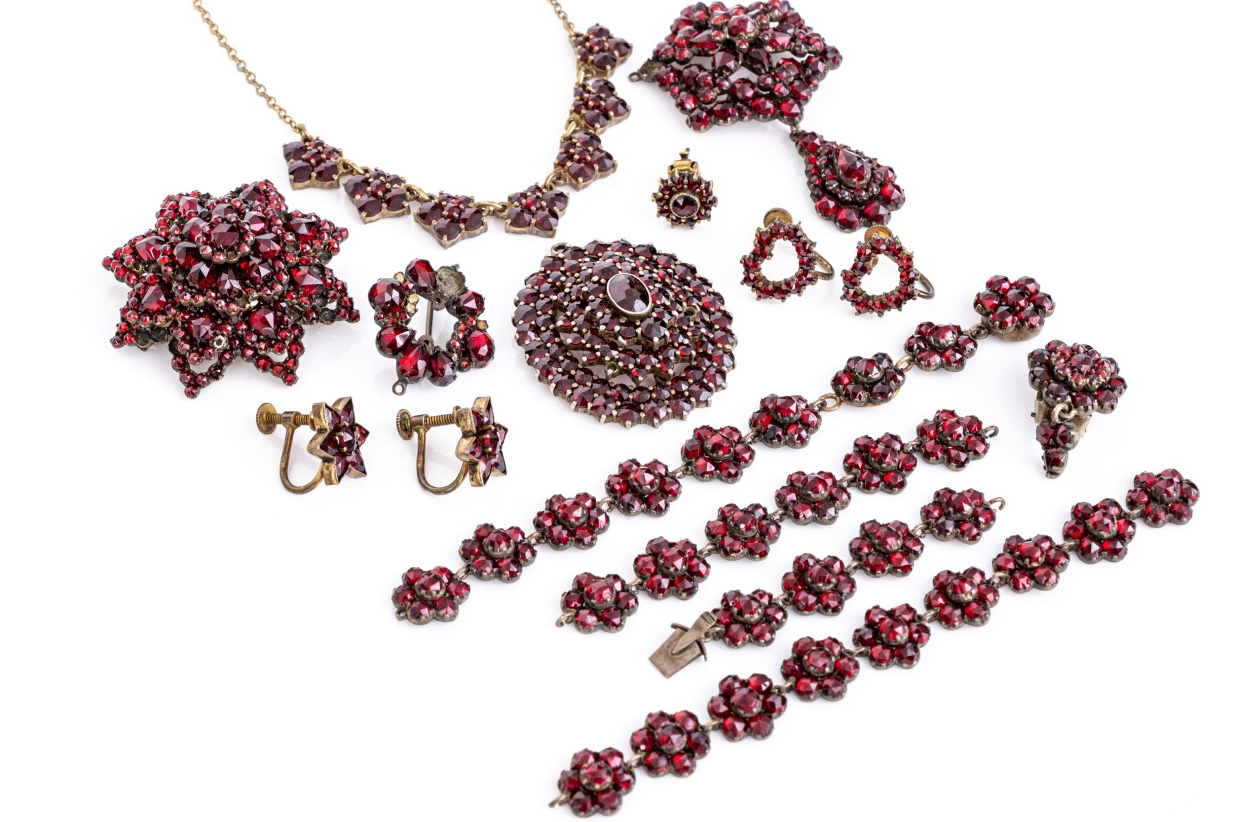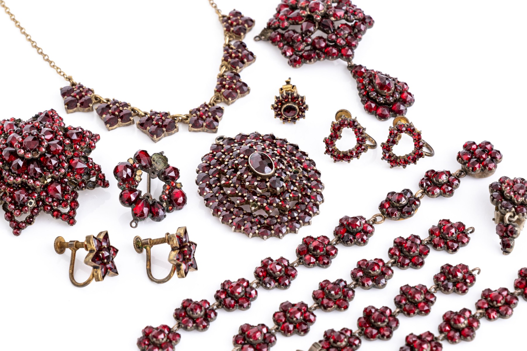 Collection of vintage burgundy Czech crystal motif jewelry pieces, gold filled and silverplated