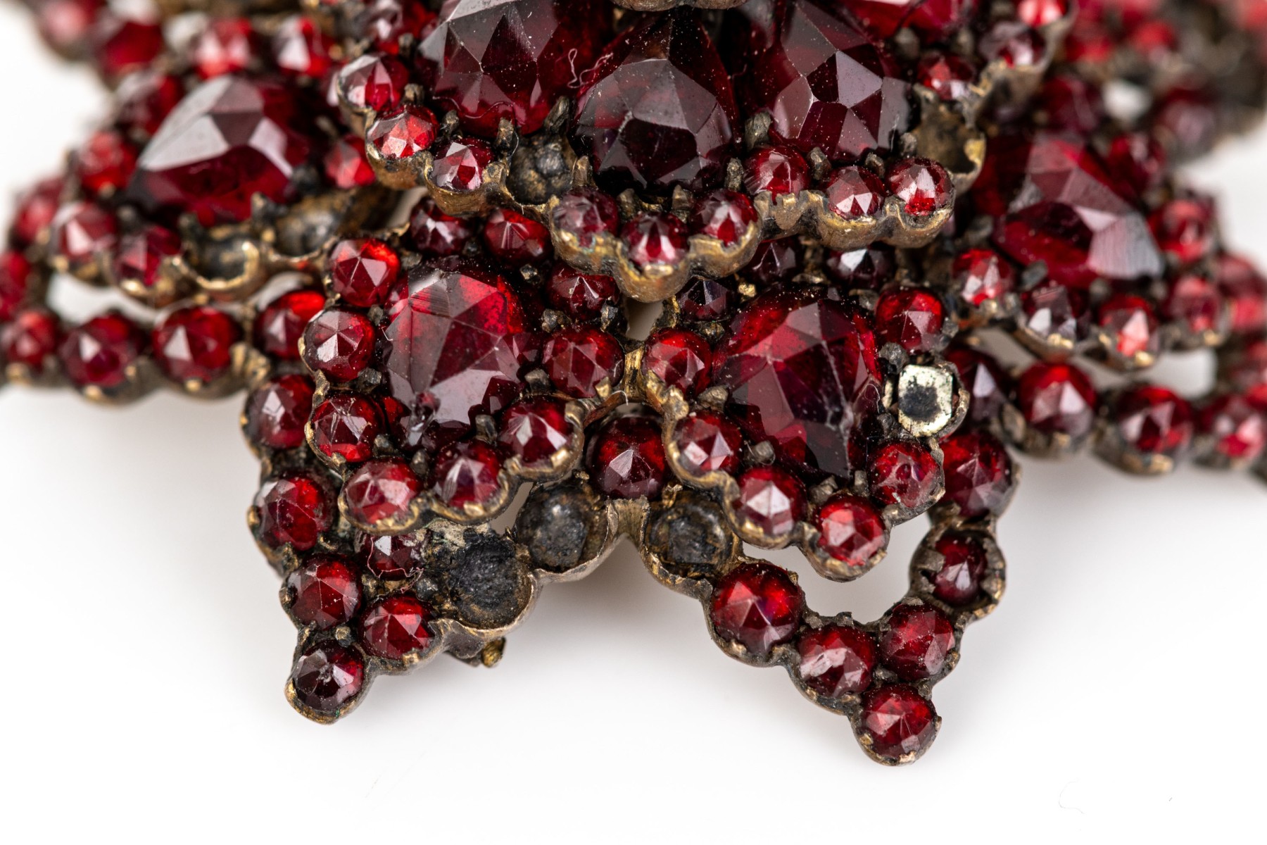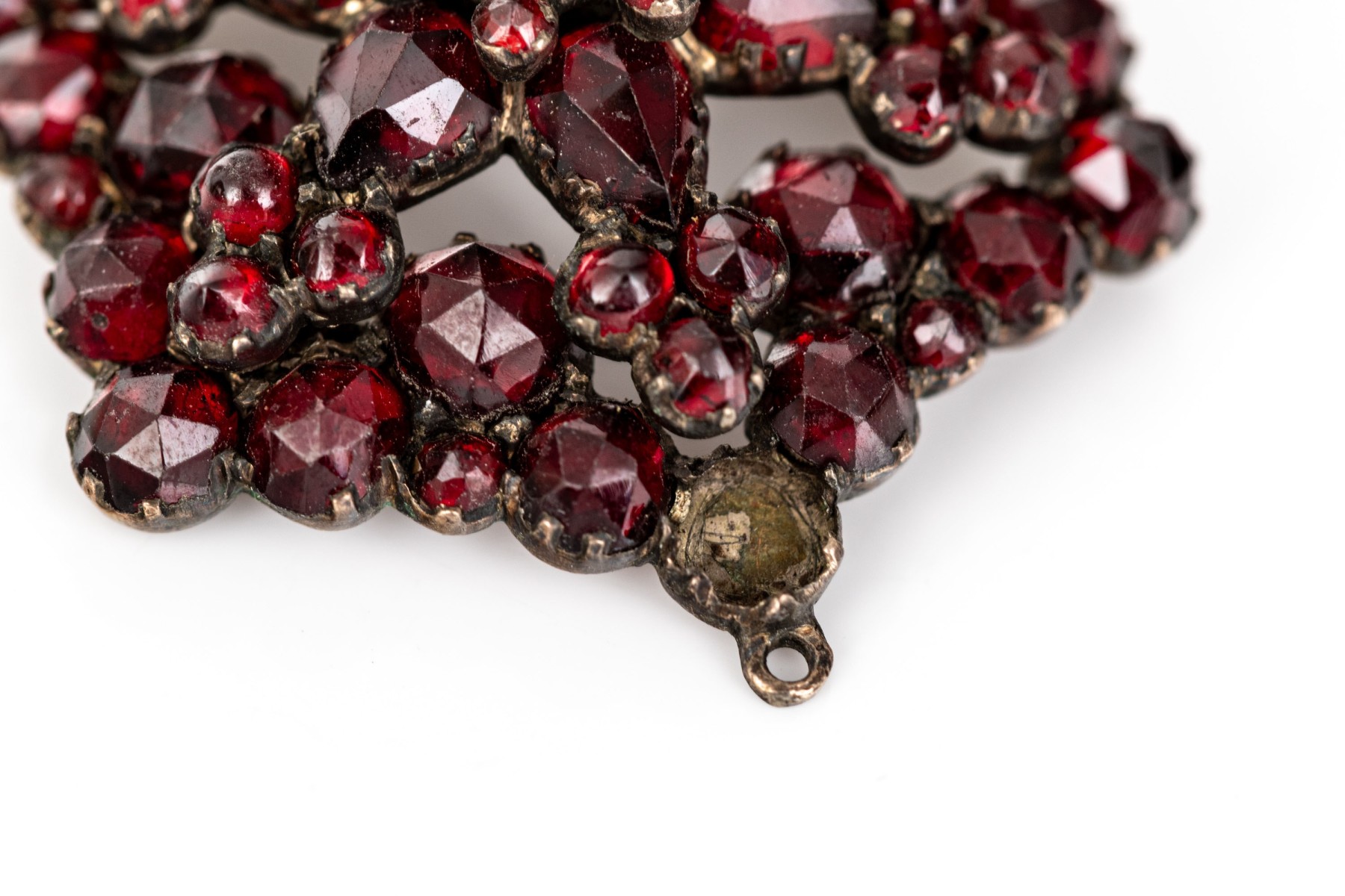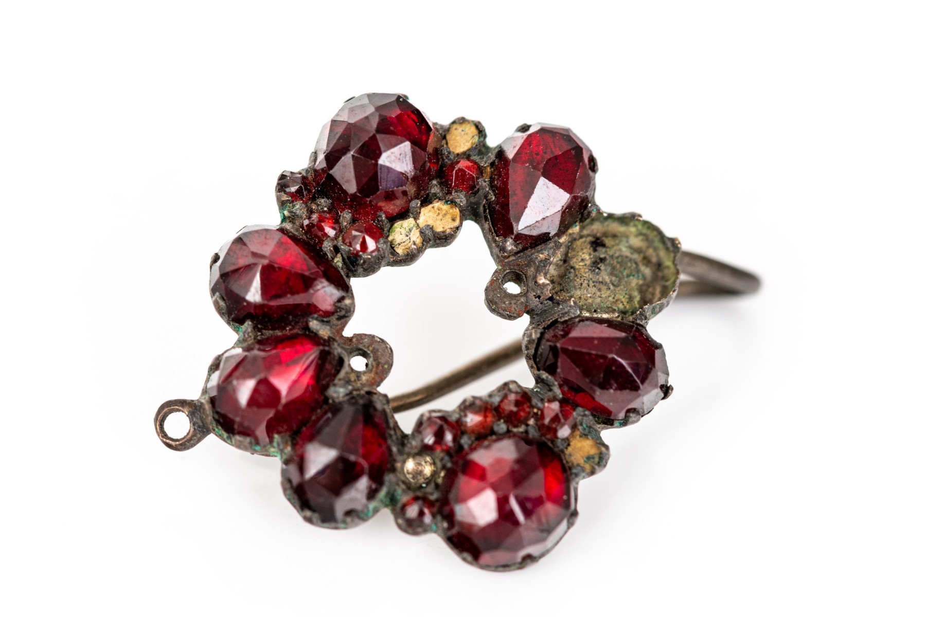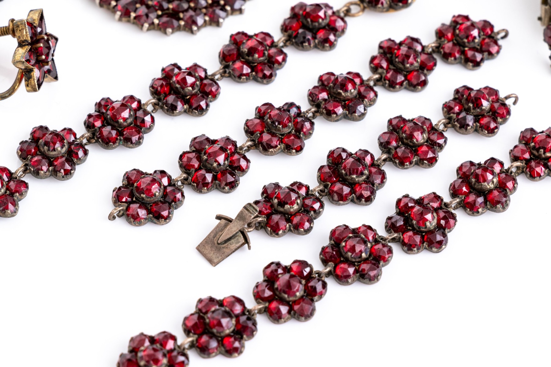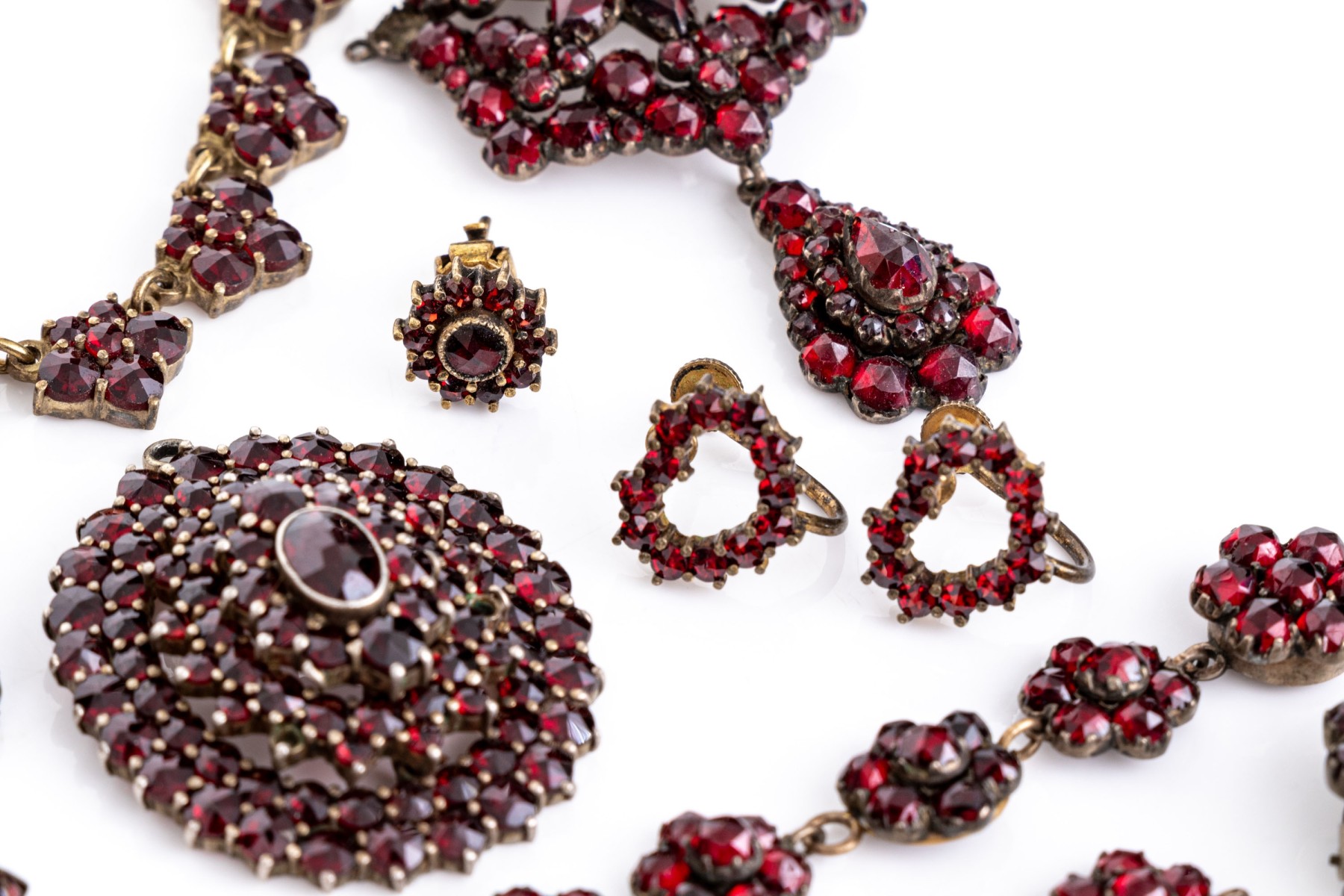 Collection of vintage burgundy Czech crystal motif jewelry pieces, gold filled and silverplated