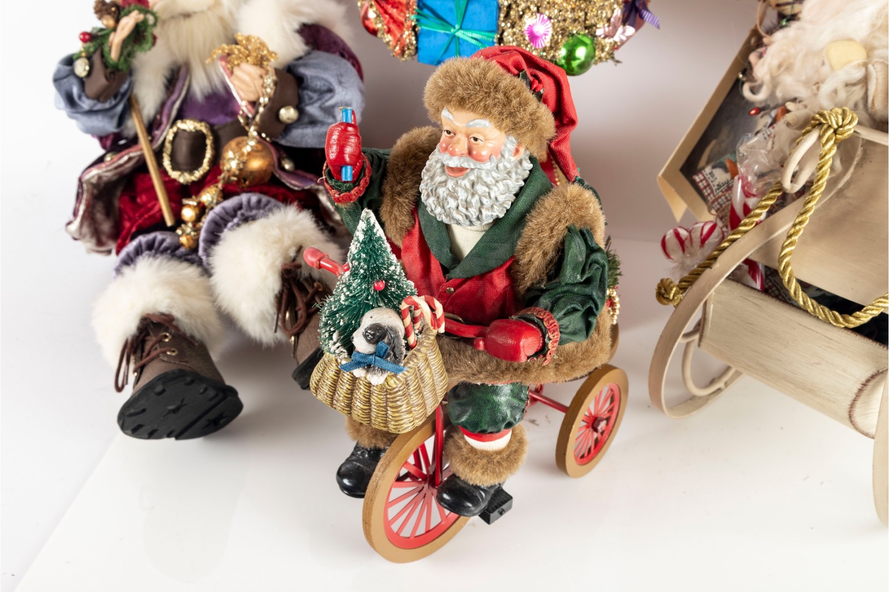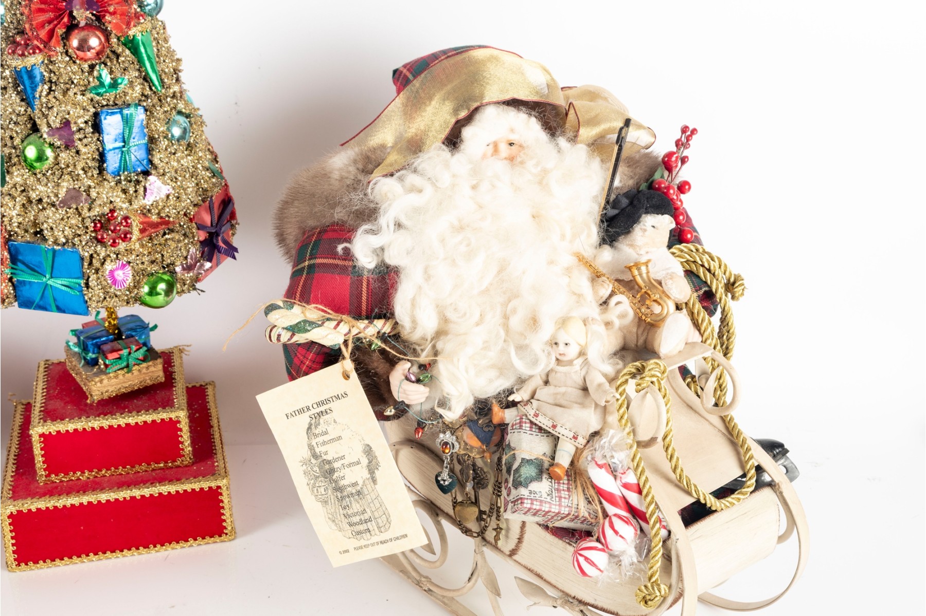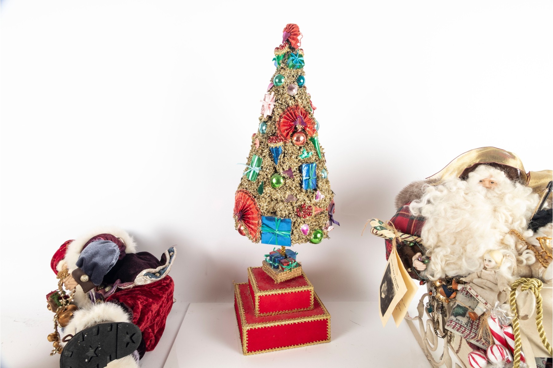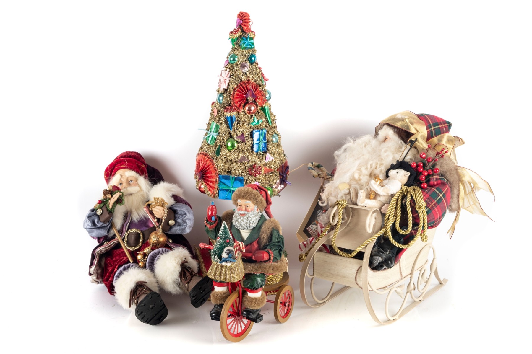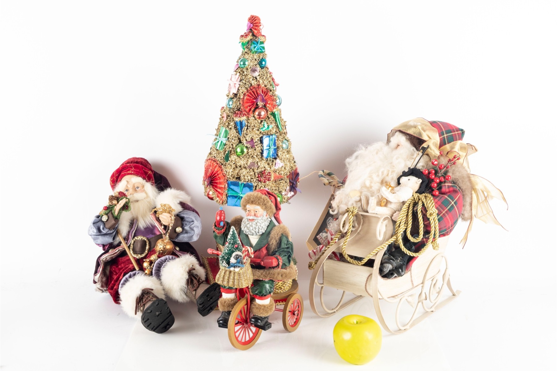 A lovely collection of vintage Christmas decor including a gilt decorated tree figure and three figures of Santa in beautiful detail. One Santa on sleigh by Kay Burkart
