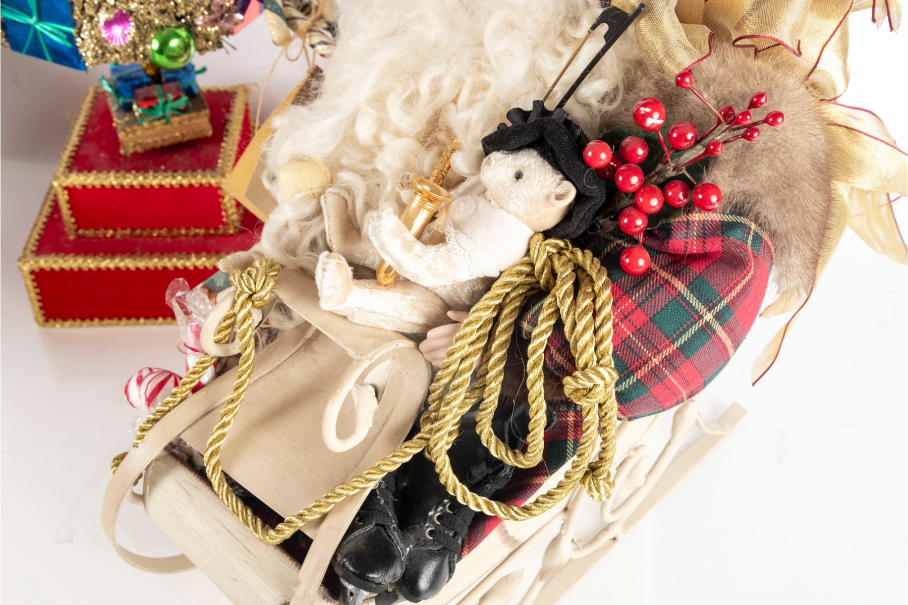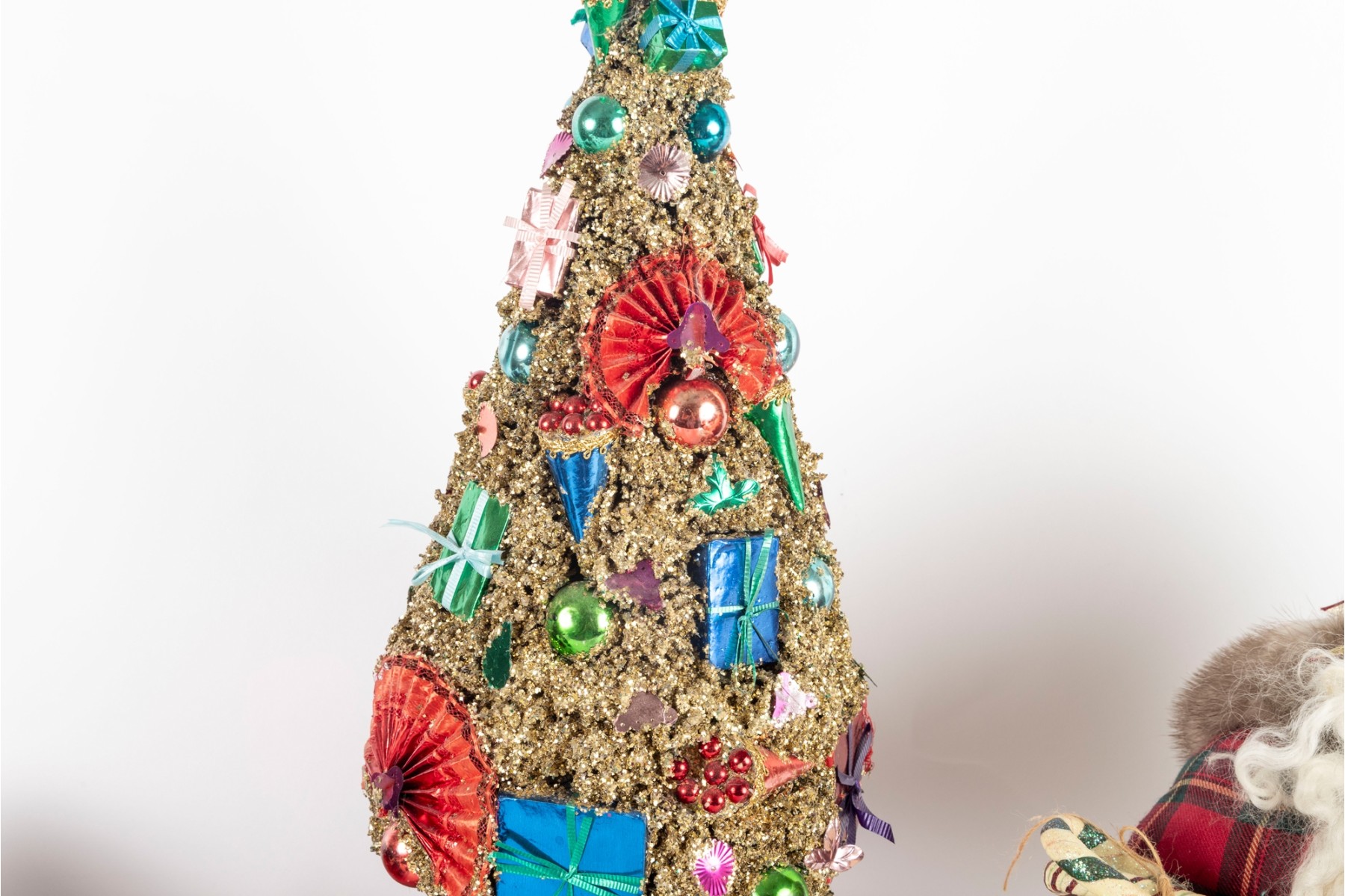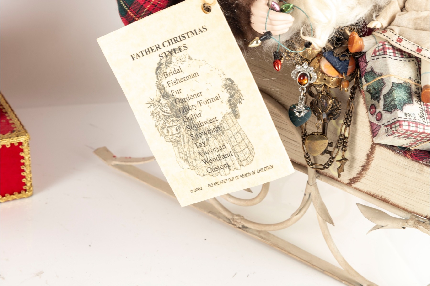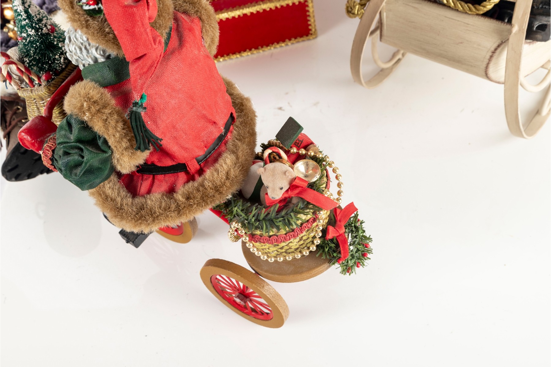 A lovely collection of vintage Christmas decor including a gilt decorated tree figure and three figures of Santa in beautiful detail. One Santa on sleigh by Kay Burkart