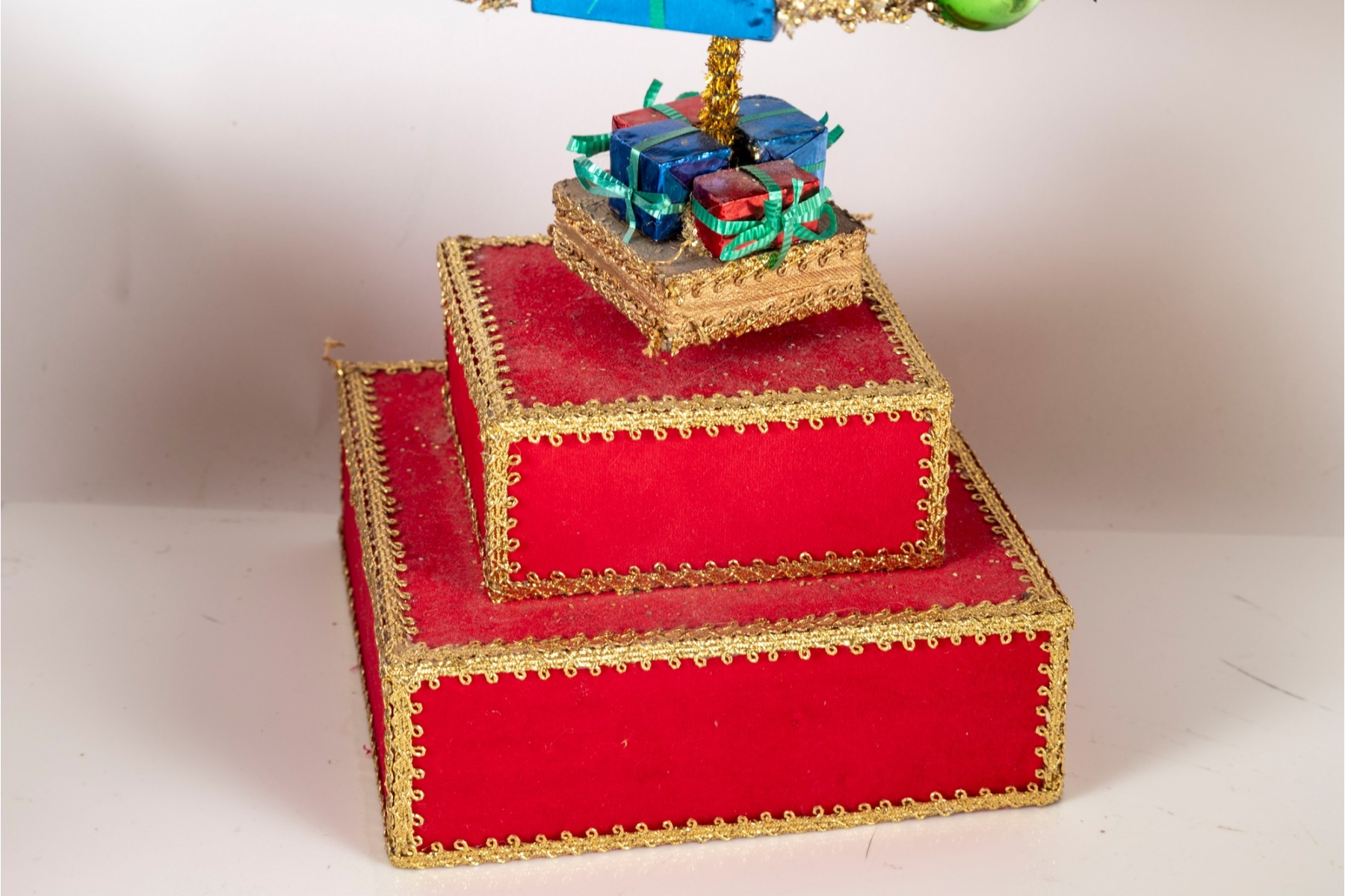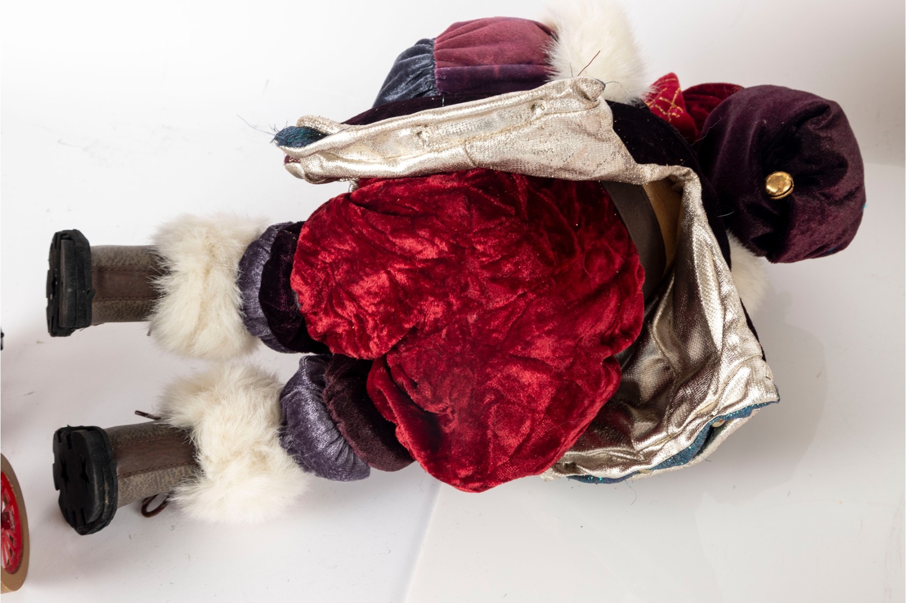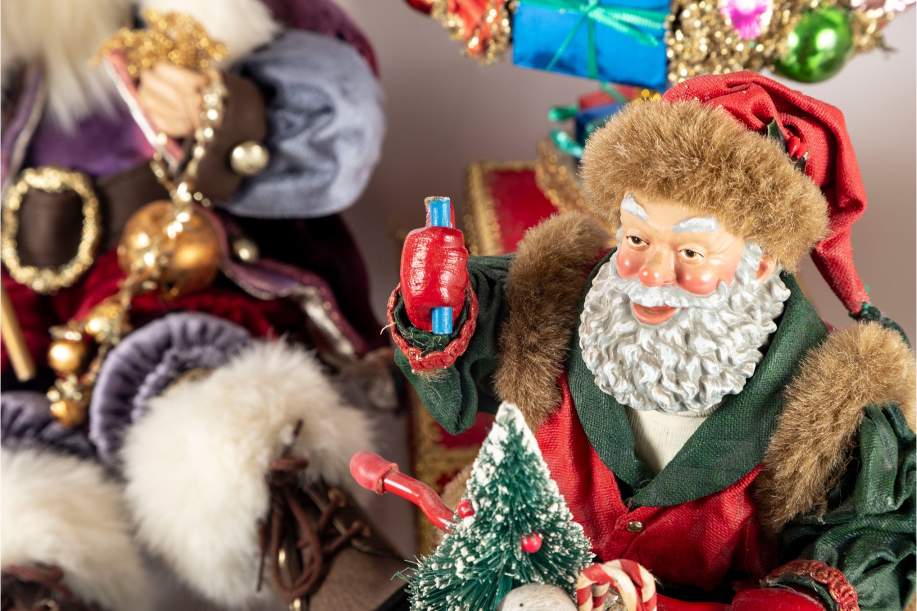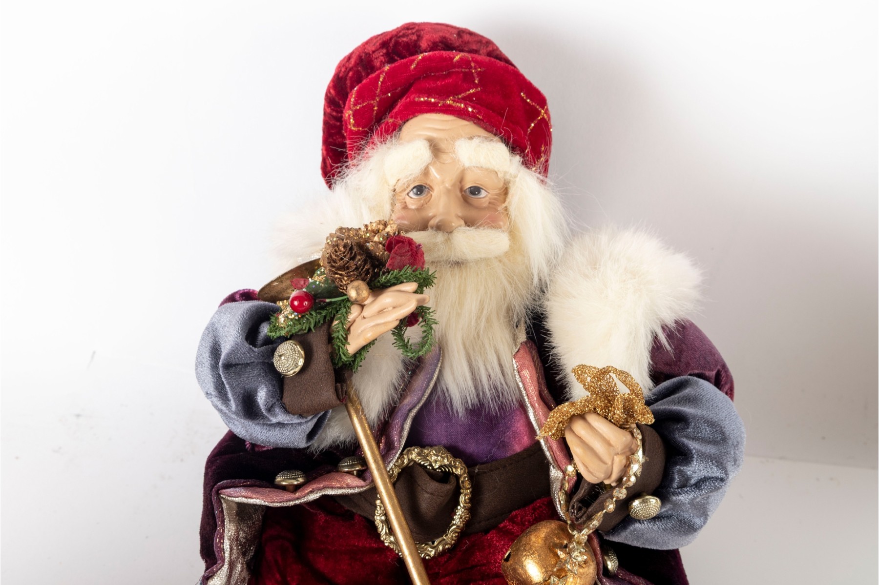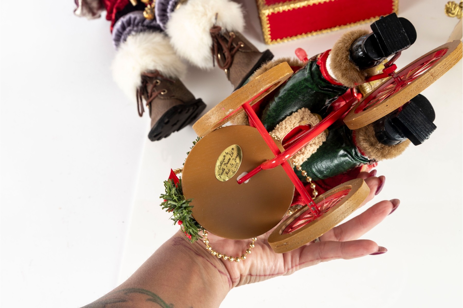 A lovely collection of vintage Christmas decor including a gilt decorated tree figure and three figures of Santa in beautiful detail. One Santa on sleigh by Kay Burkart
