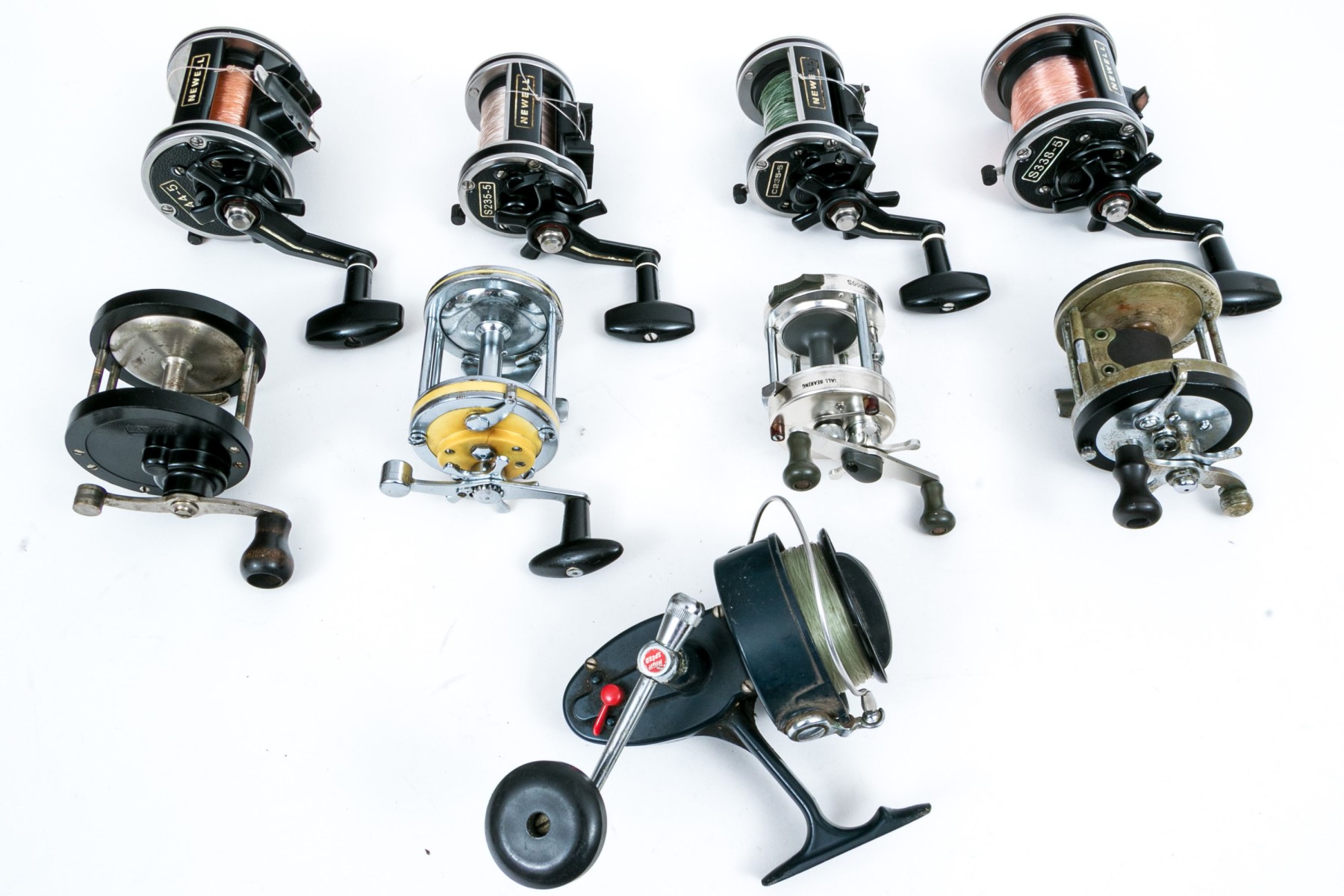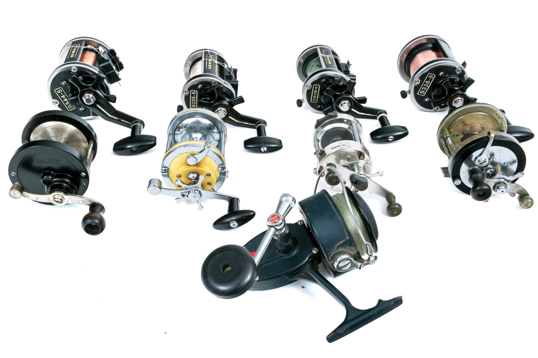 Collection of eight conventional fishing reels and one spinning reel. Conventional reels includes four Newell graphite reels (two C235-5, S338-5 and S344-5), one Pflueger Capitol, one Sea-Scout and one Shakespeare SKP2000S. The spinning reel is a vintage Mitchell '402 Salt Water'.