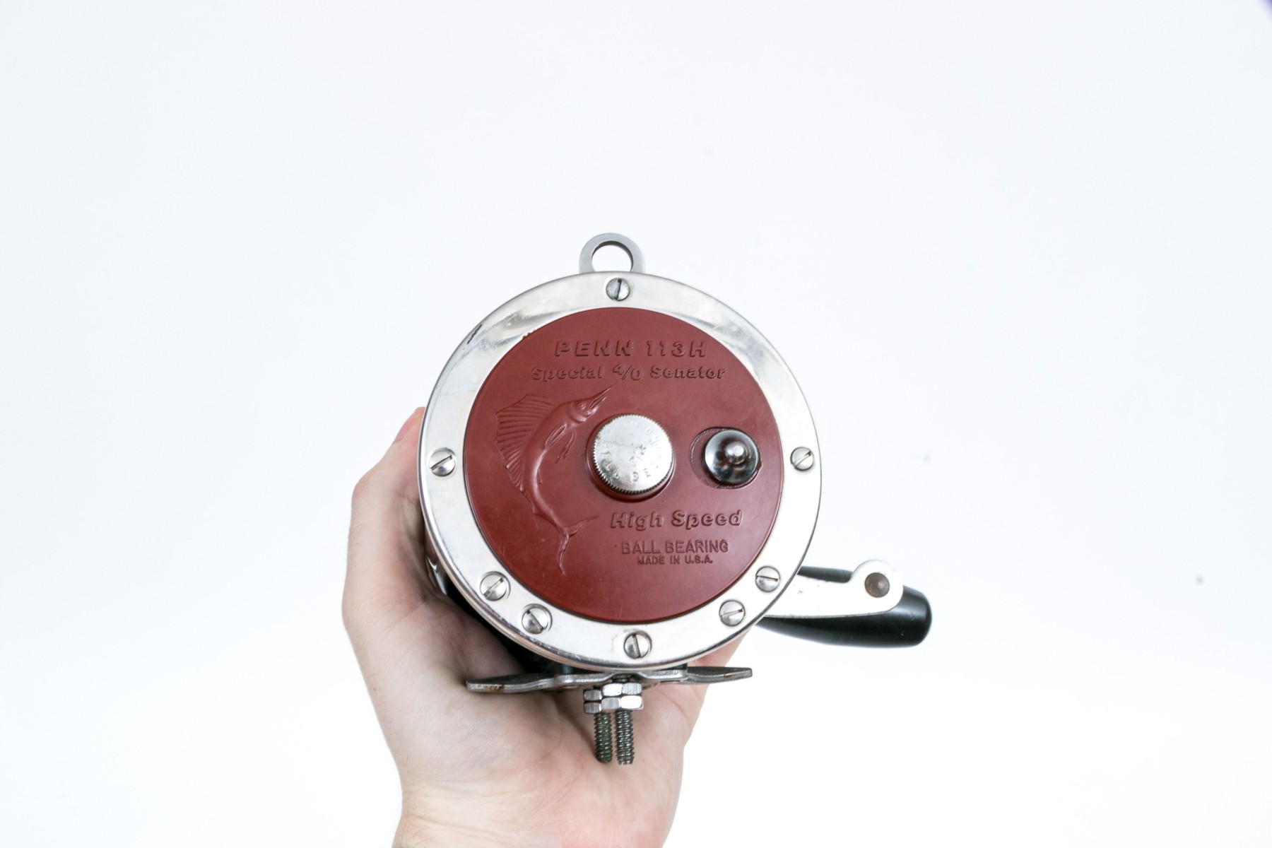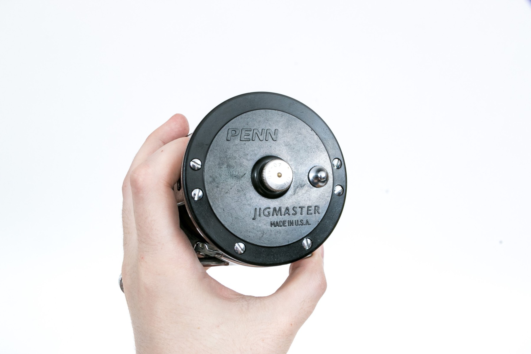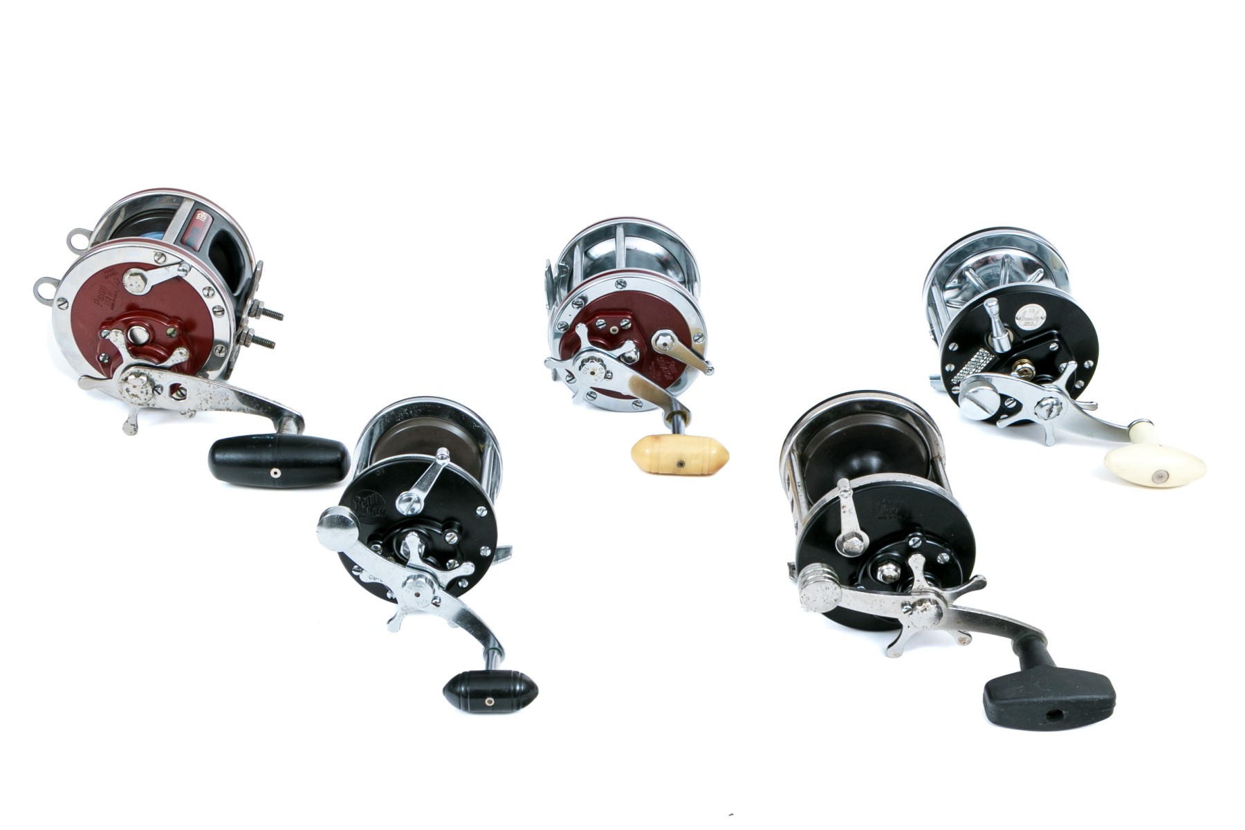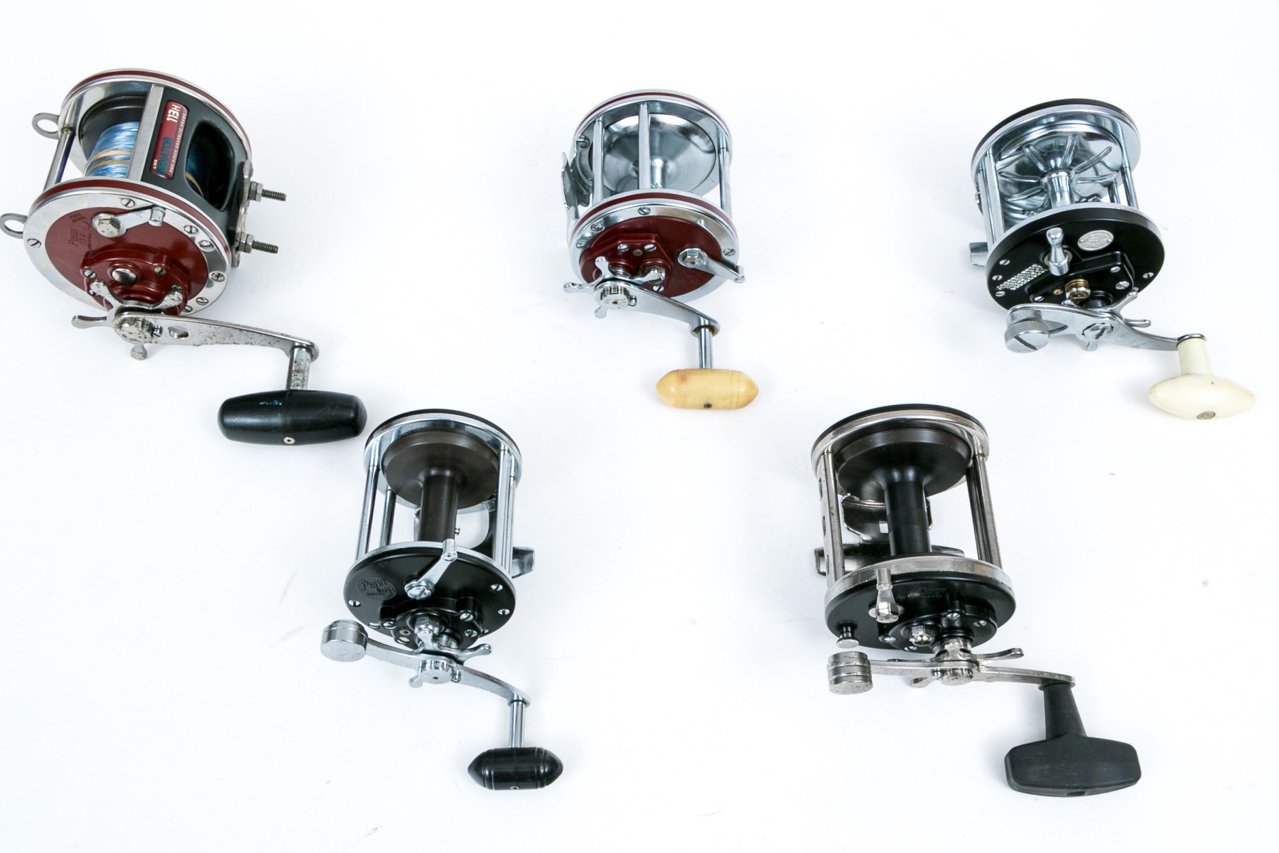 Collection of conventional fishing reels. Penn JigMaster, Penn No155, Ocean City 113. Two Penn Senator 112H and 113H.