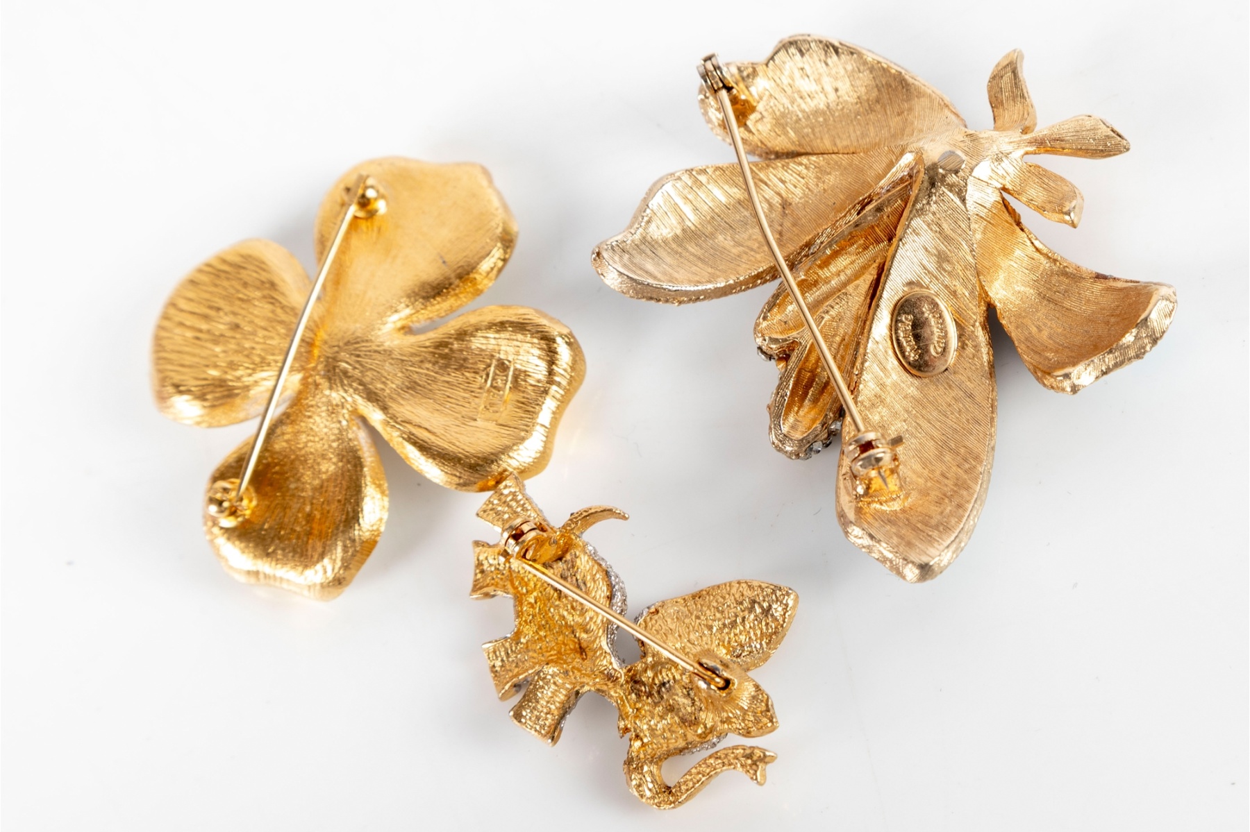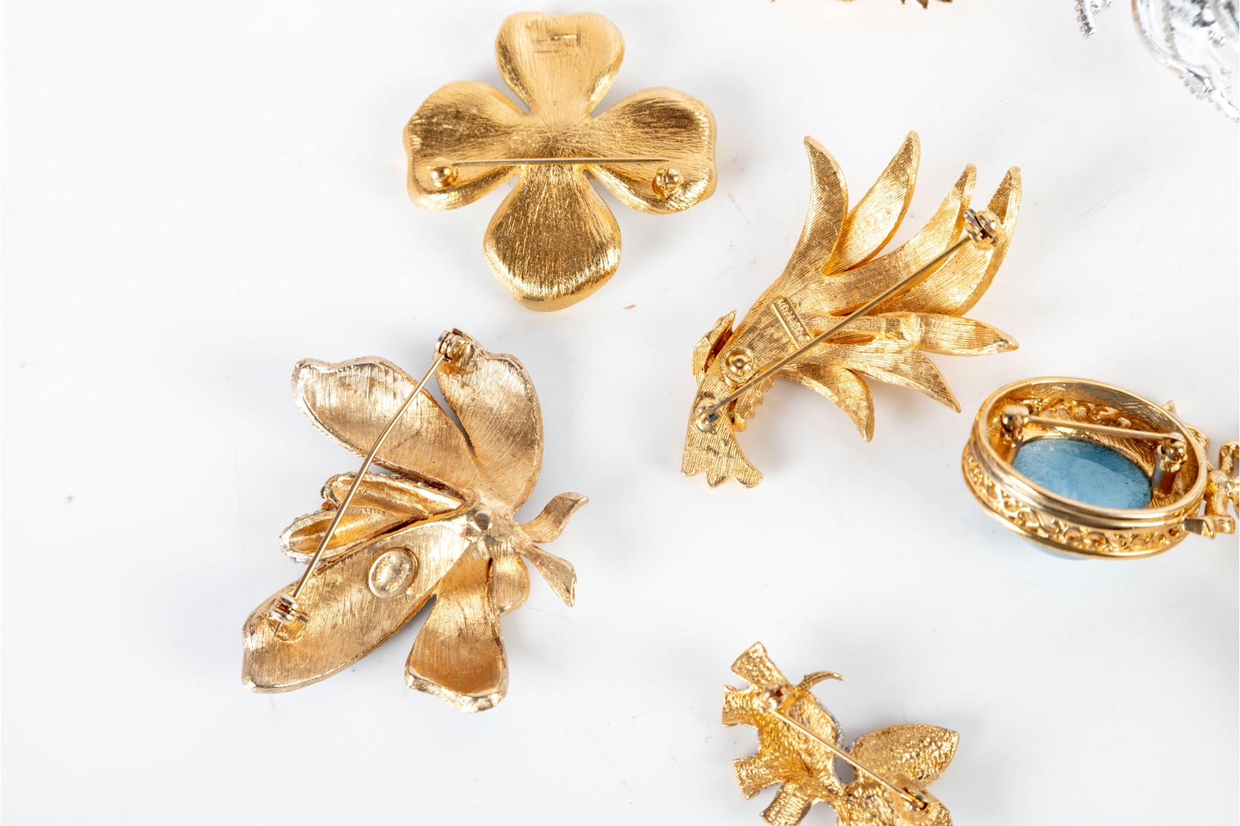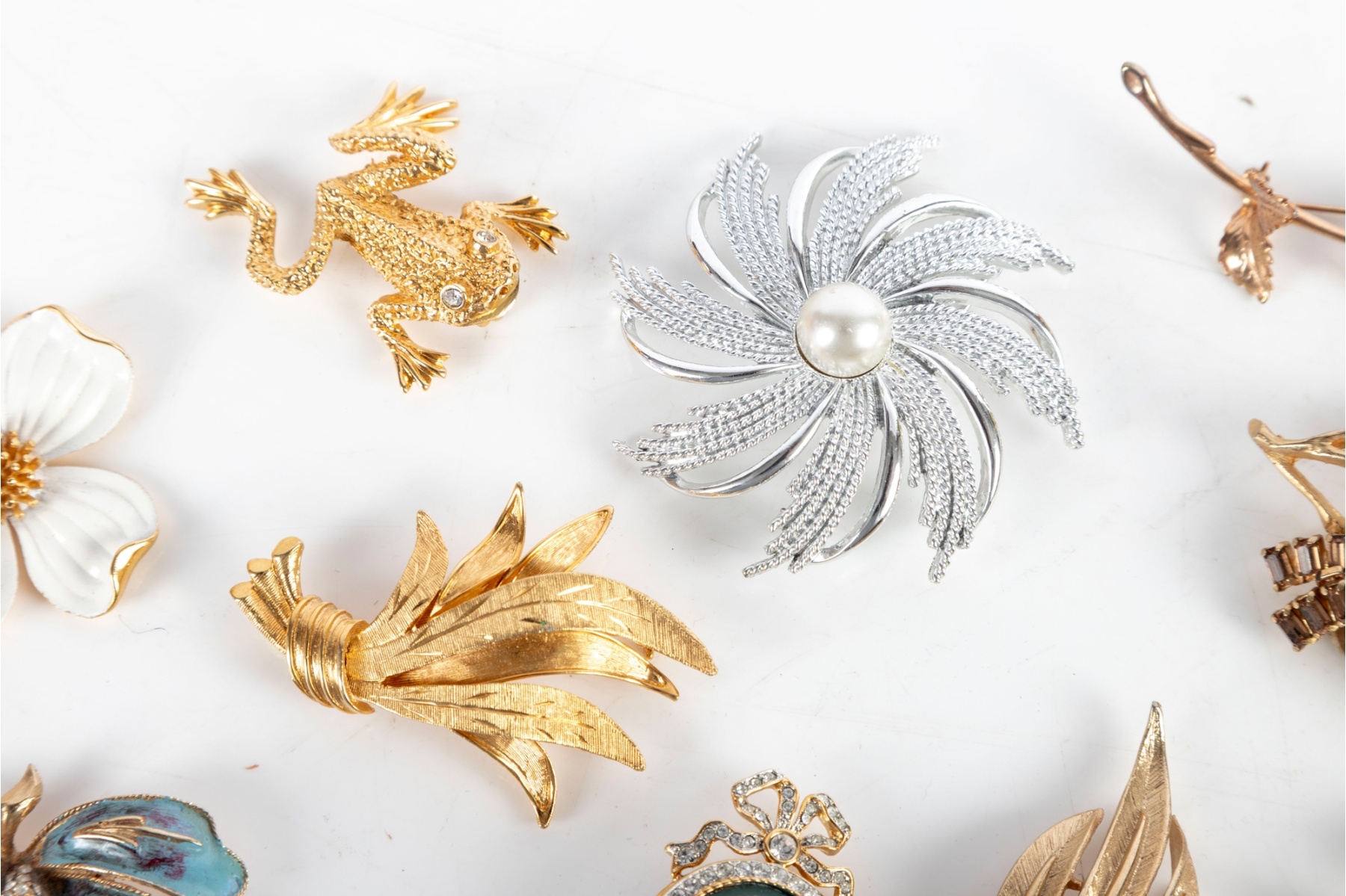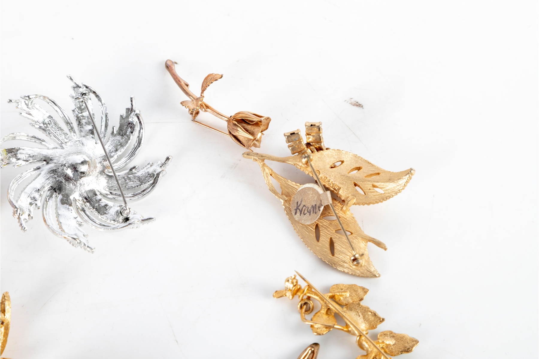 Lovely assortment of mid-century and later costume jewelry brooches featuring floral, figural, and abstract designs. Includes gold-tone and silver-tone pieces, rhinestone-set forms, enamel-decorated accents, faux pearl embellishments, and whimsical motifs such as a butterfly, elephant, lizard, leaves, and stylized blossoms.