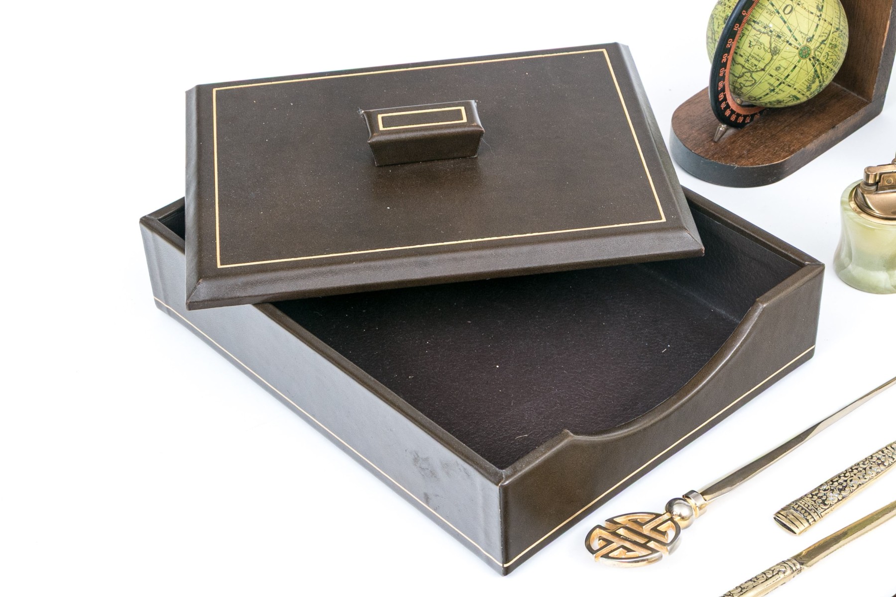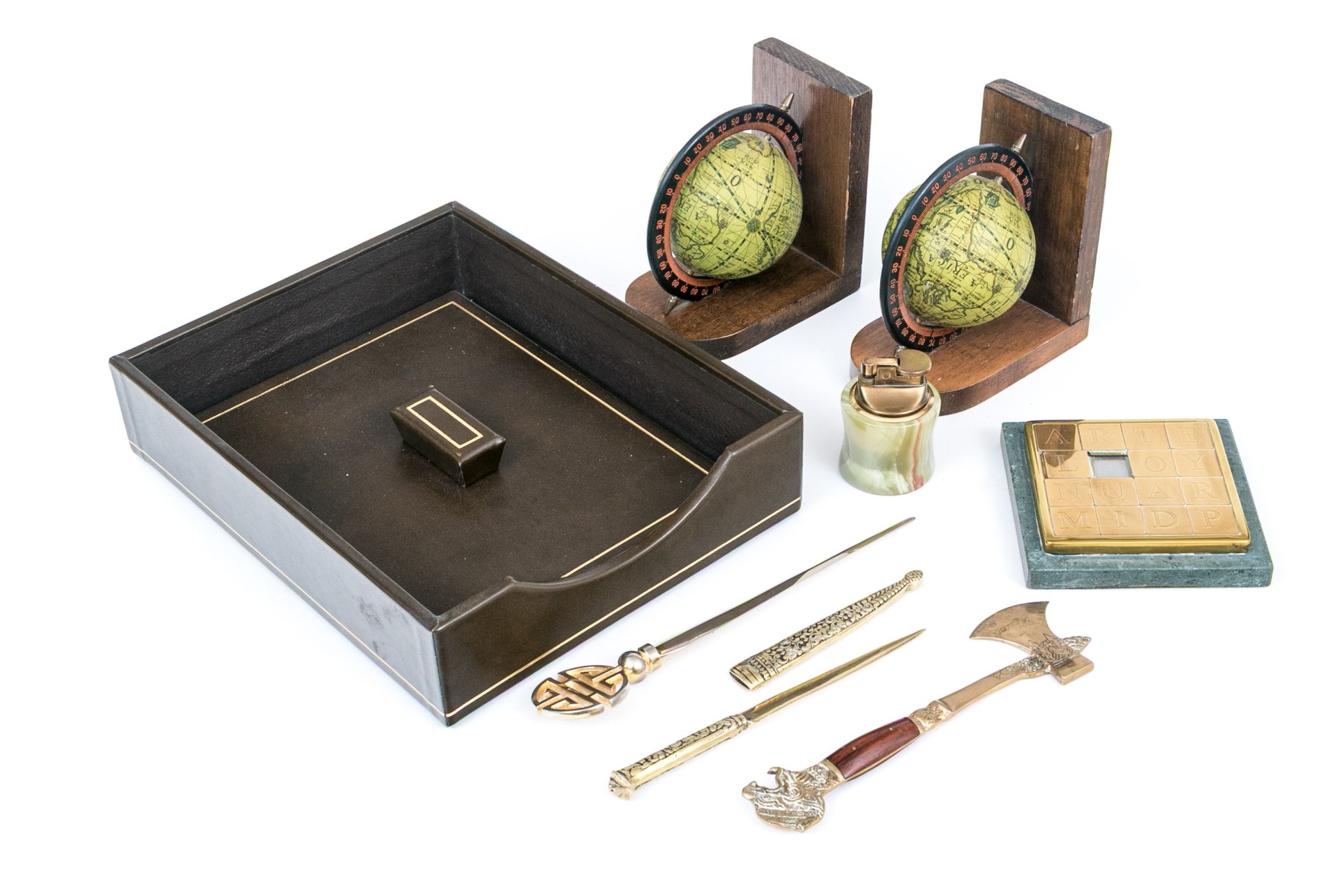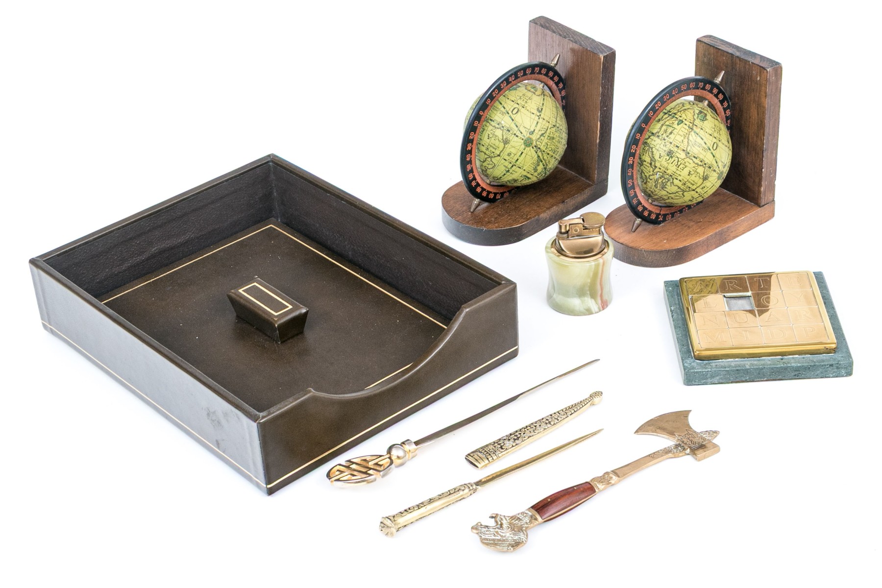 A handsome lot of vintage desk accessories including a leather wrapped paper caddy with the lid having a gilt tooled band, brass letter grid, letter opener with sheath, letter opener with Chinese Shou emblem finial, wood and brass axe form letter opener, lighter, and a pair of globe form bookends.