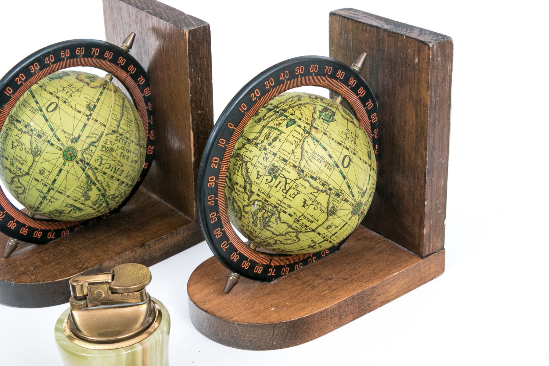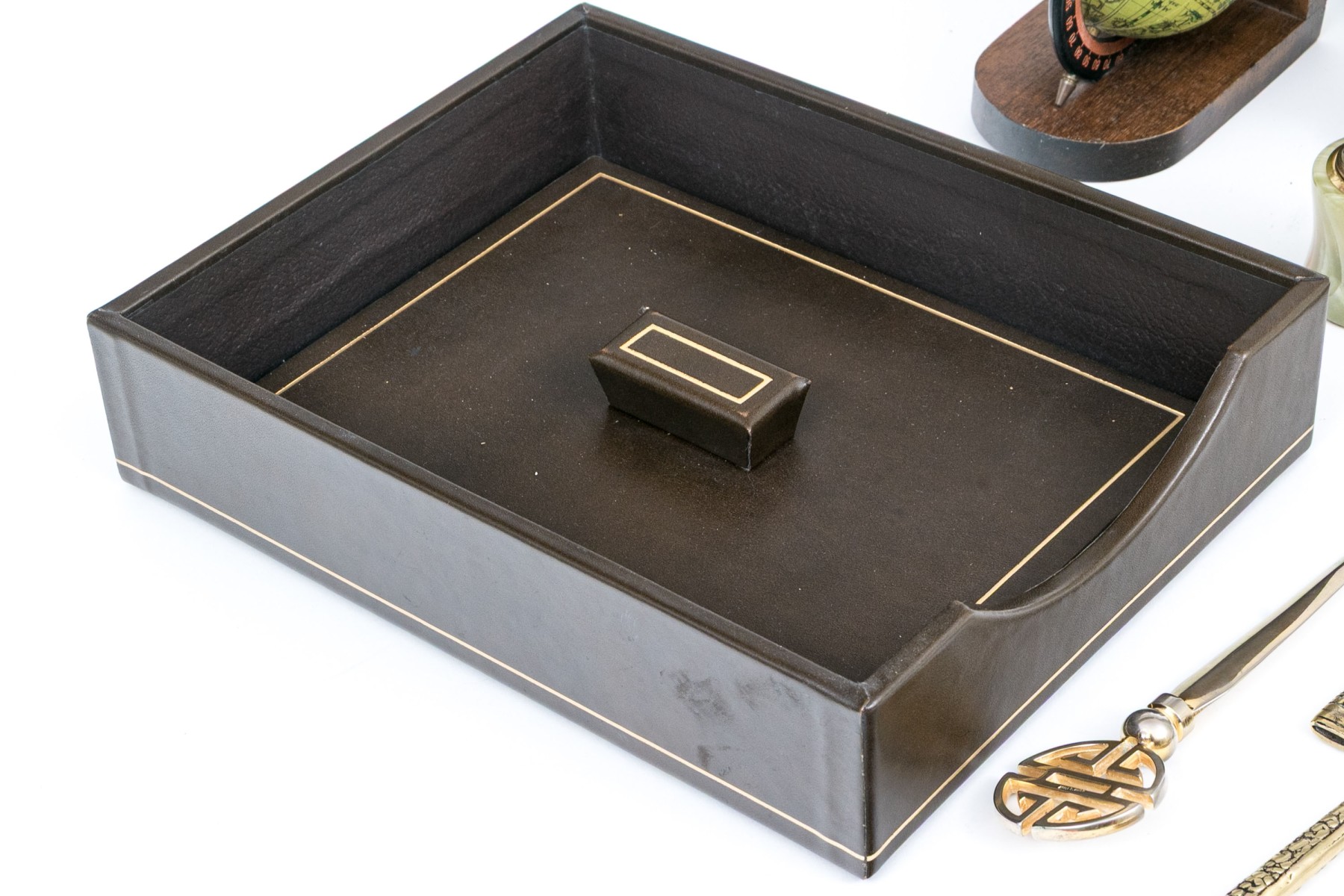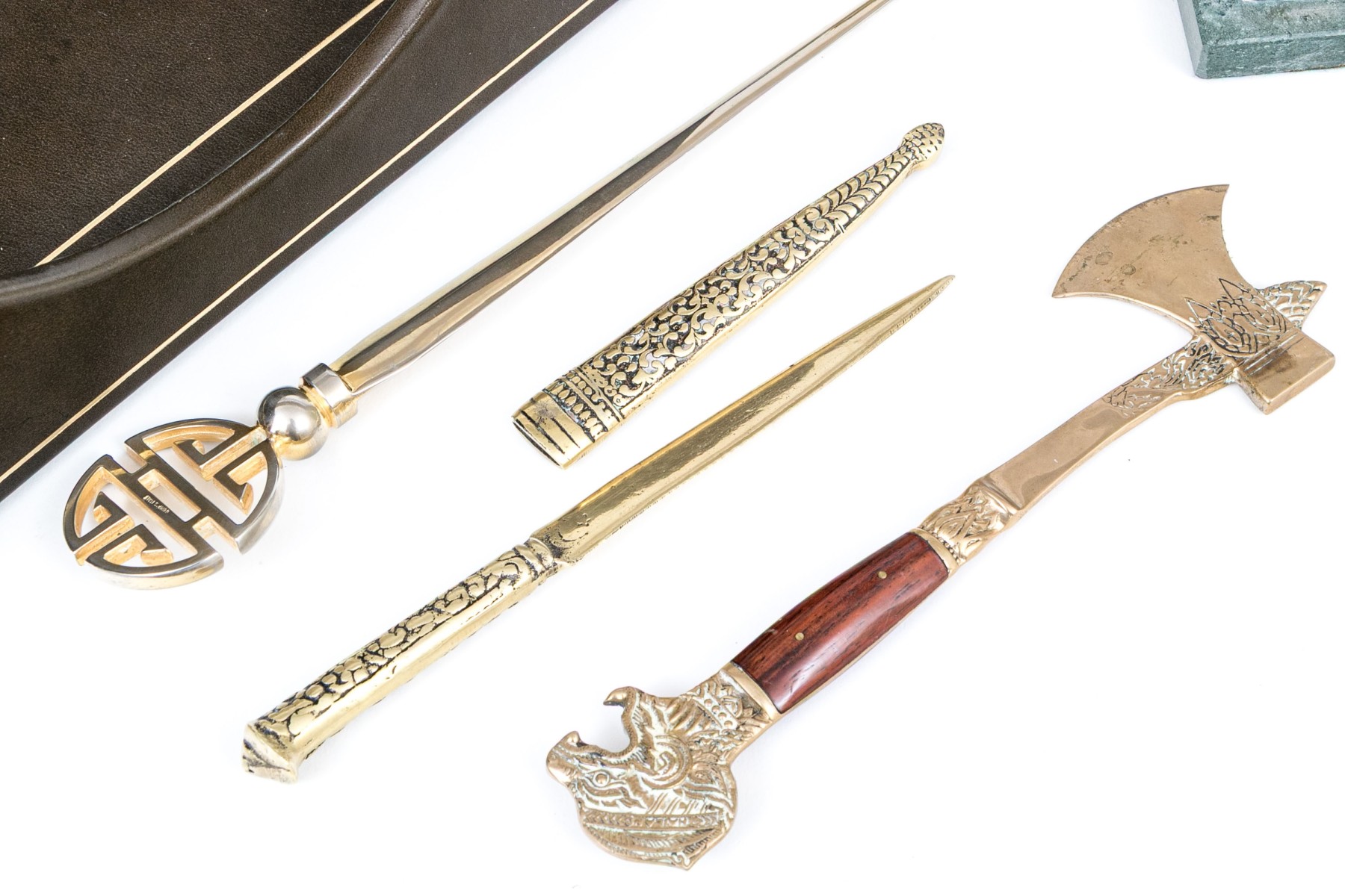 A handsome lot of vintage desk accessories including a leather wrapped paper caddy with the lid having a gilt tooled band, brass letter grid, letter opener with sheath, letter opener with Chinese Shou emblem finial, wood and brass axe form letter opener, lighter, and a pair of globe form bookends.