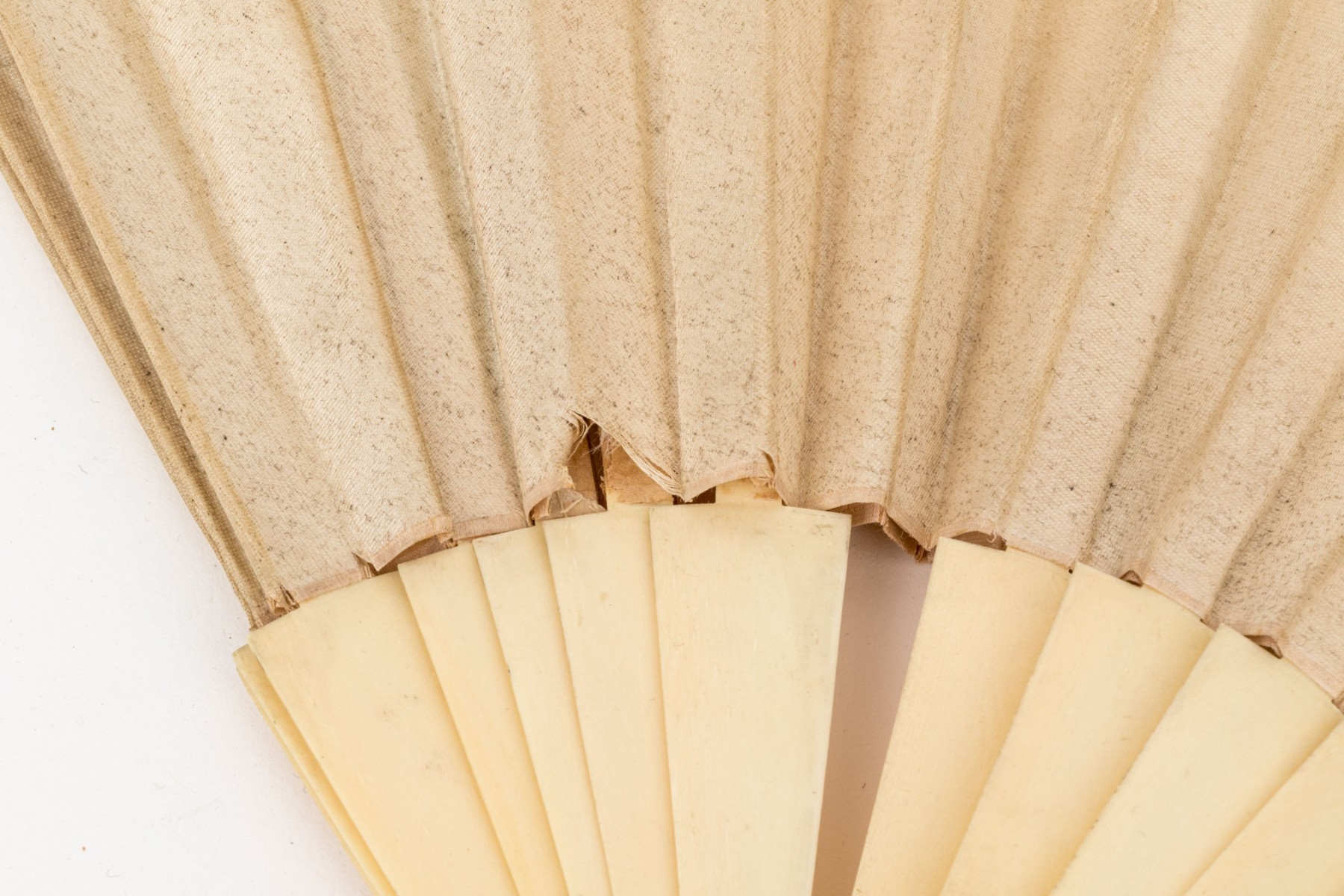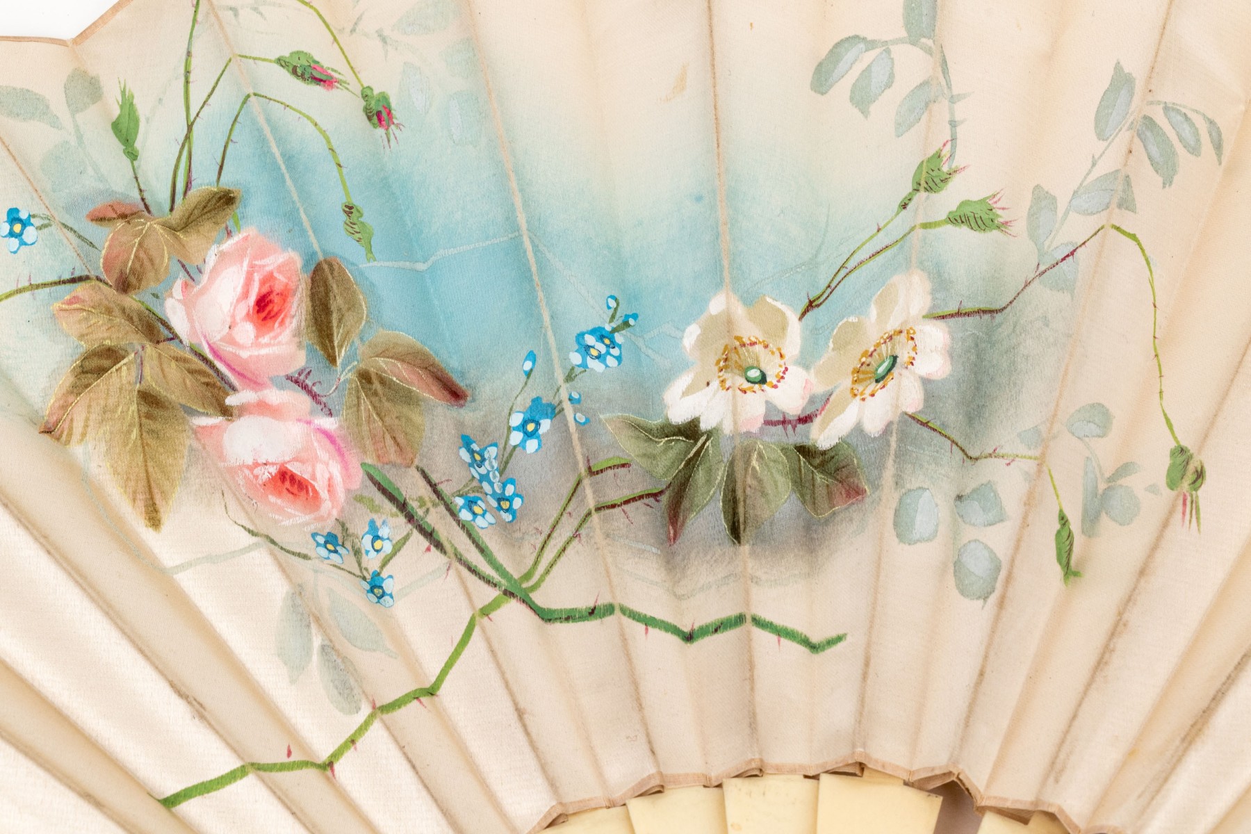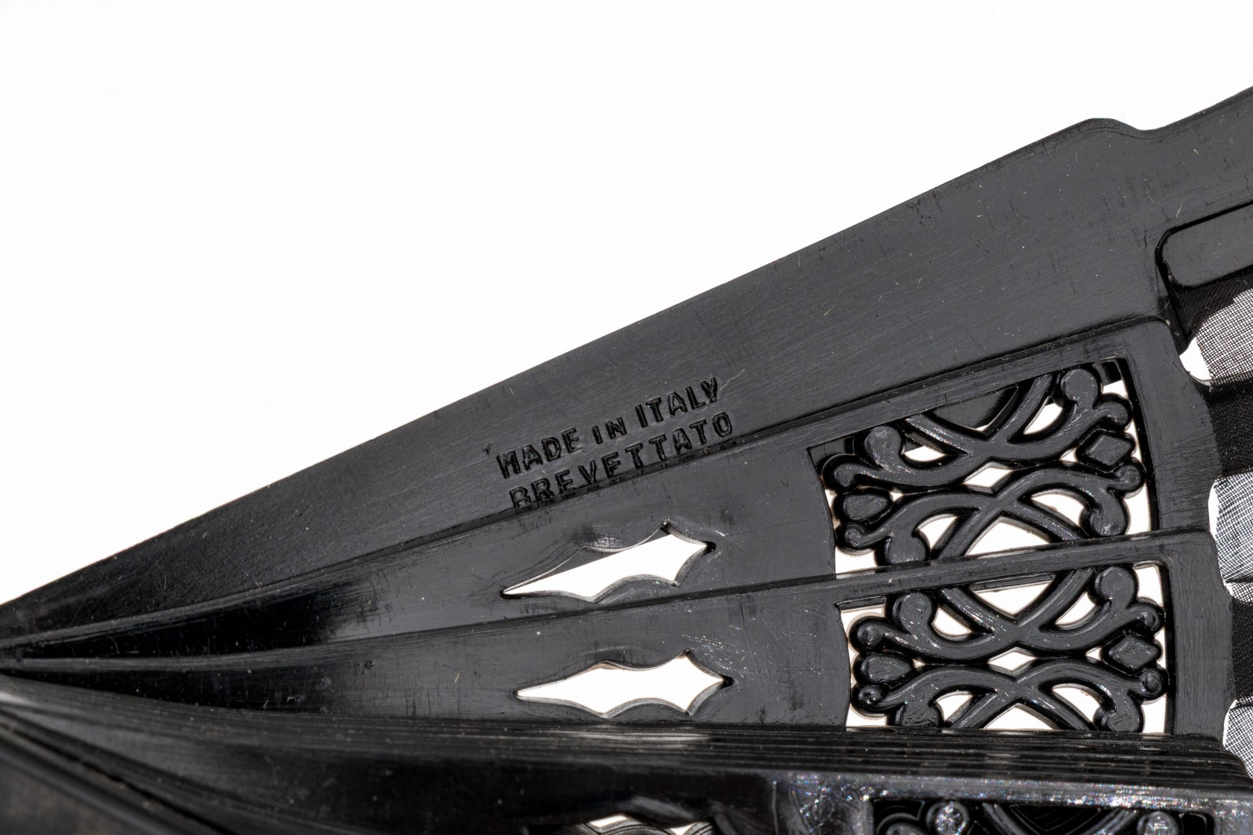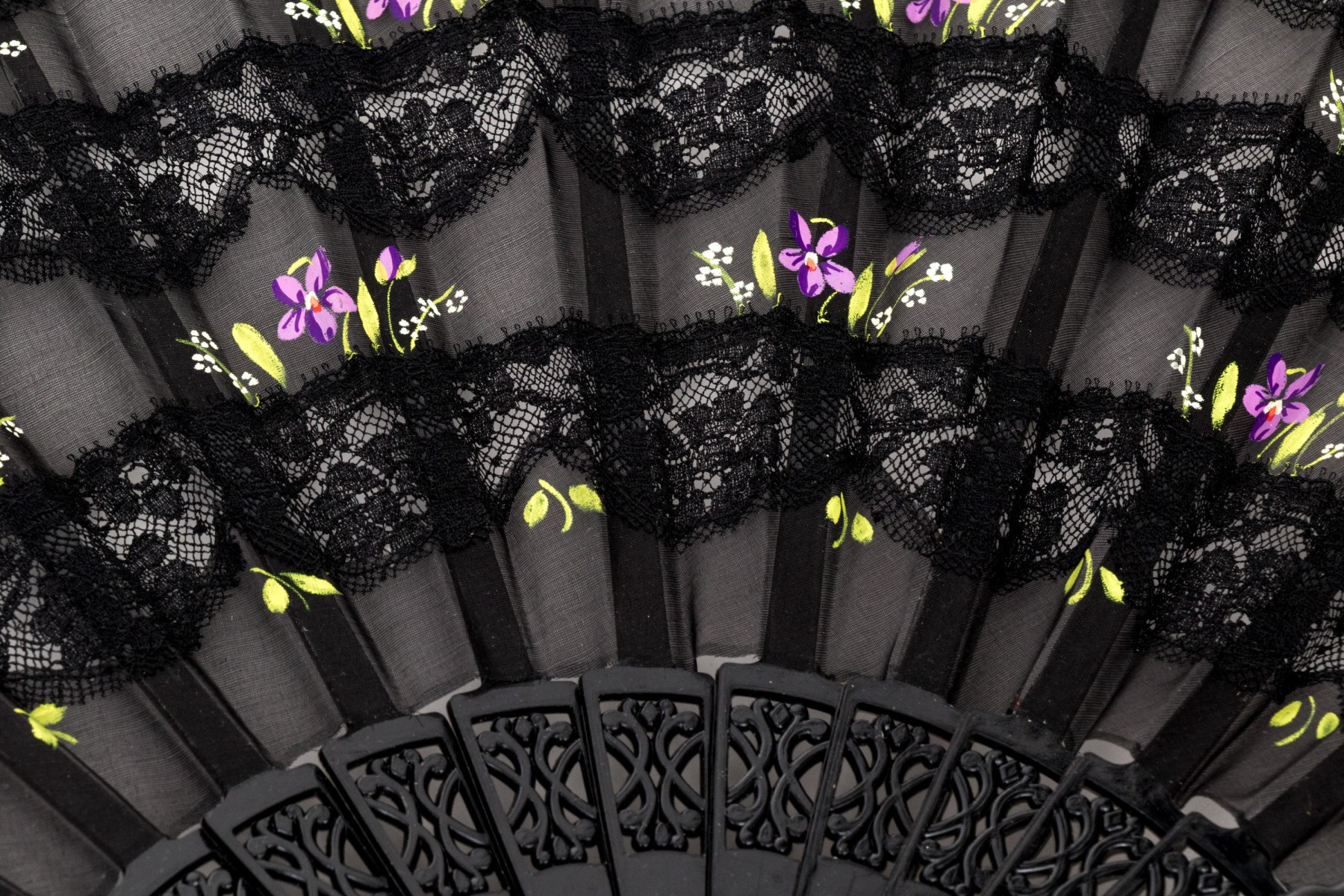 a painted black mesh and lace with plastic framed fan signed Gisa 10 1/2" L plus a tassel
