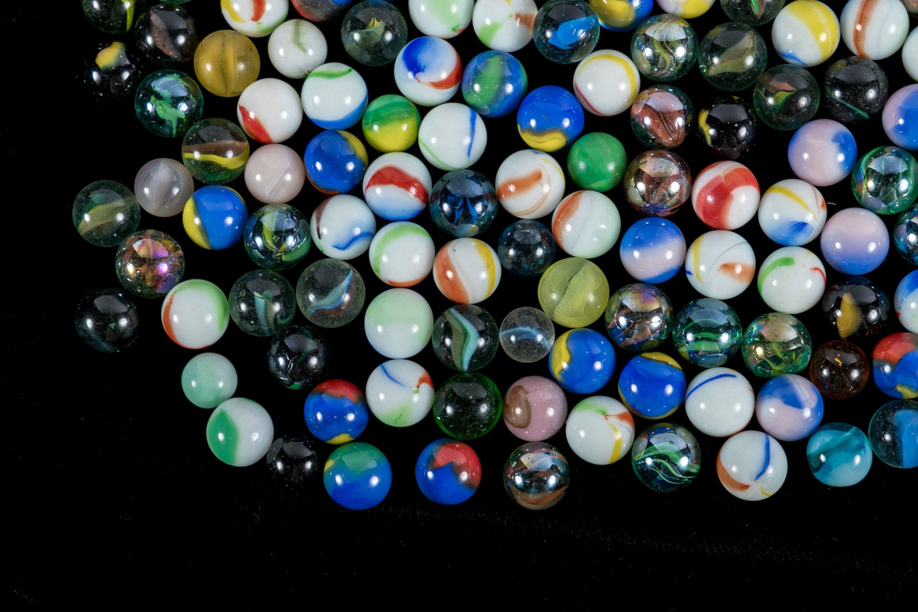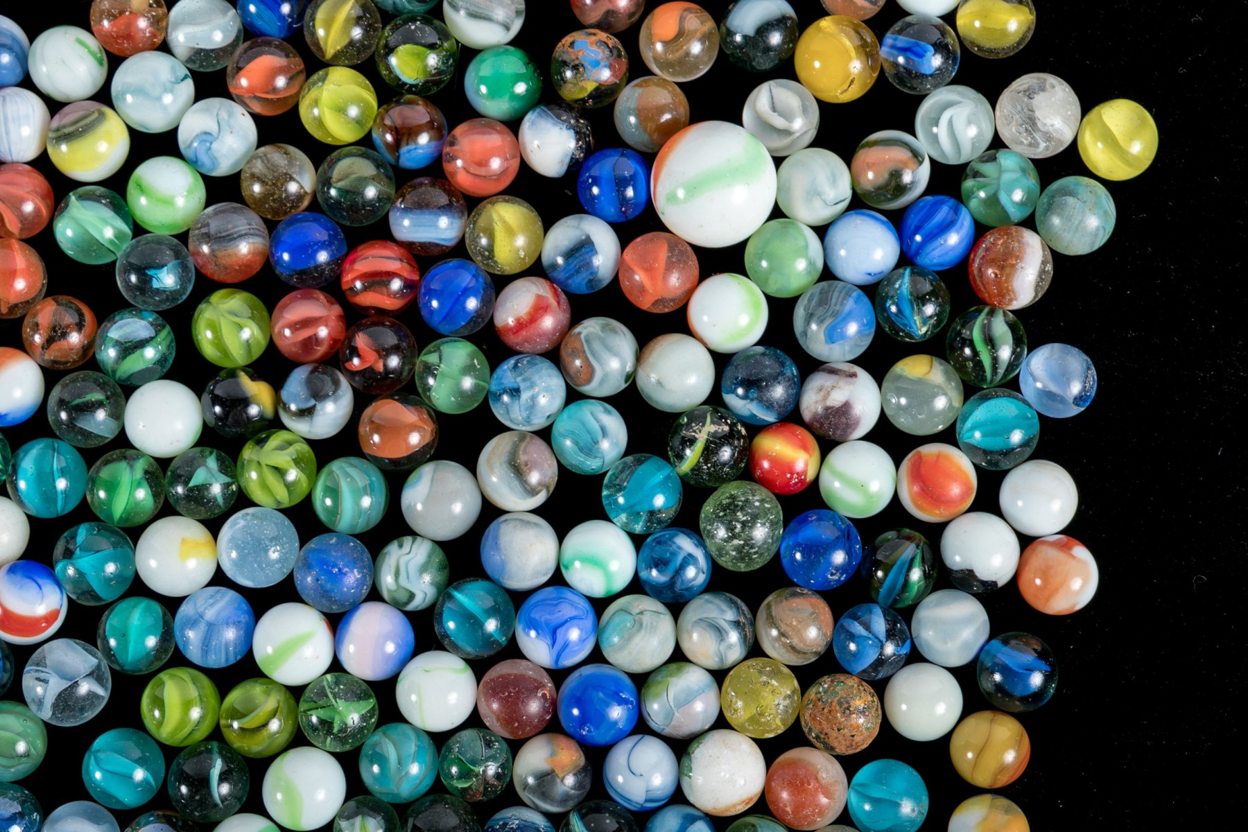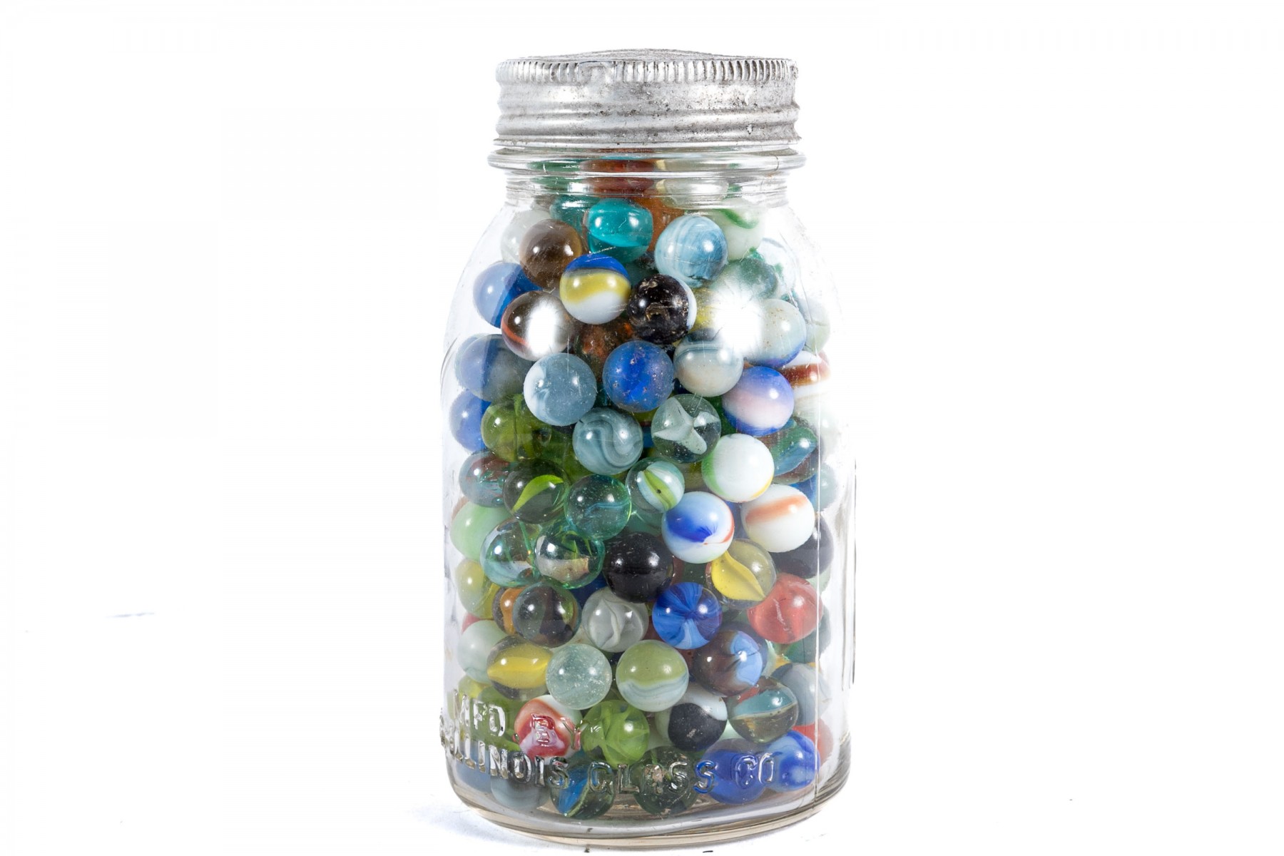 A wonderful collection of vintage marbles in a variety of designs, including swirled clear, milky white, and luster hues. Half of the collection is contained within a Presto glass mason jar.