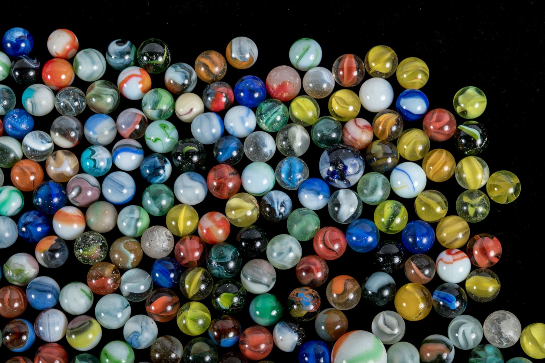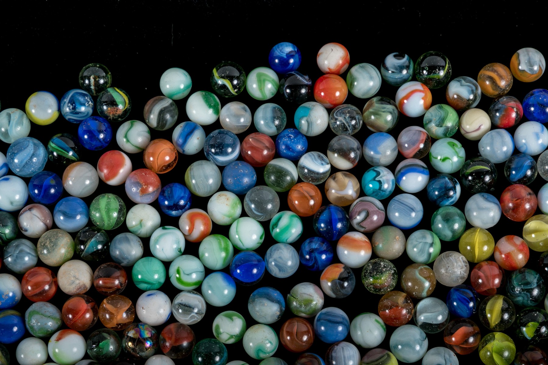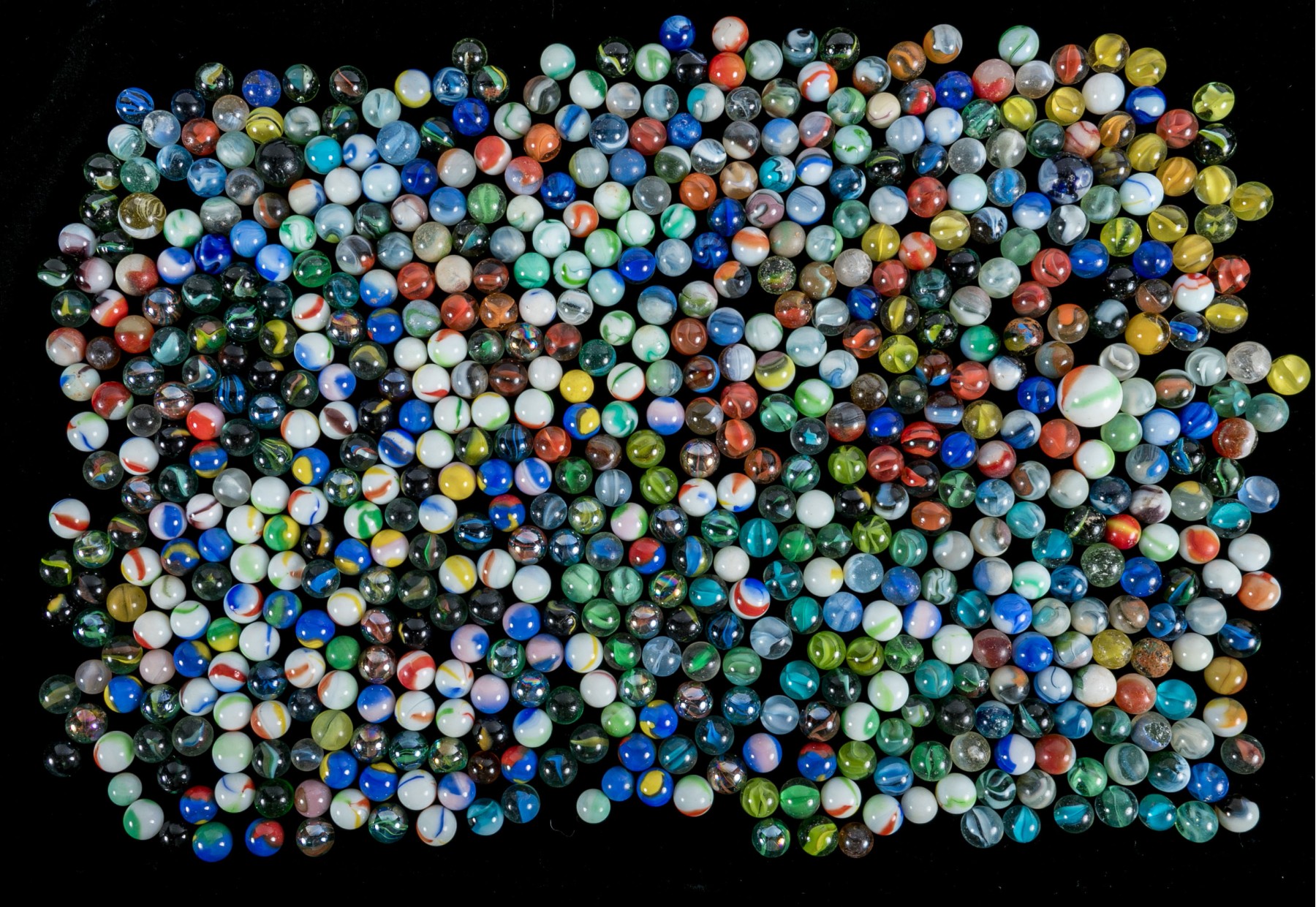 A wonderful collection of vintage marbles in a variety of designs, including swirled clear, milky white, and luster hues. Half of the collection is contained within a Presto glass mason jar.