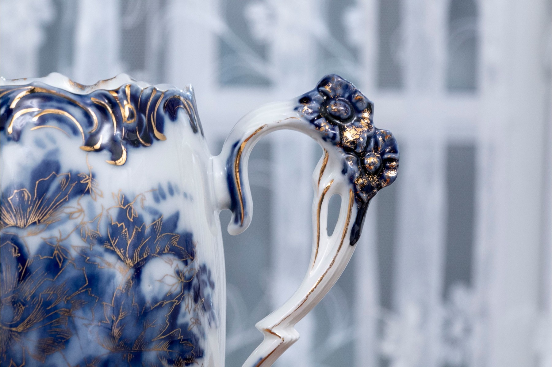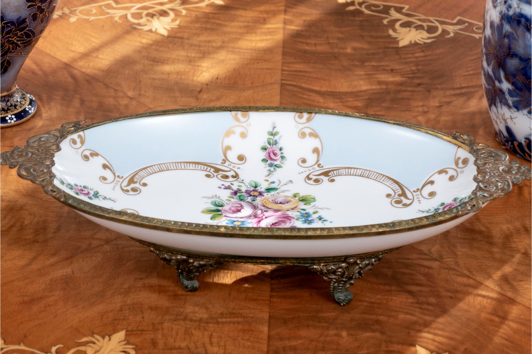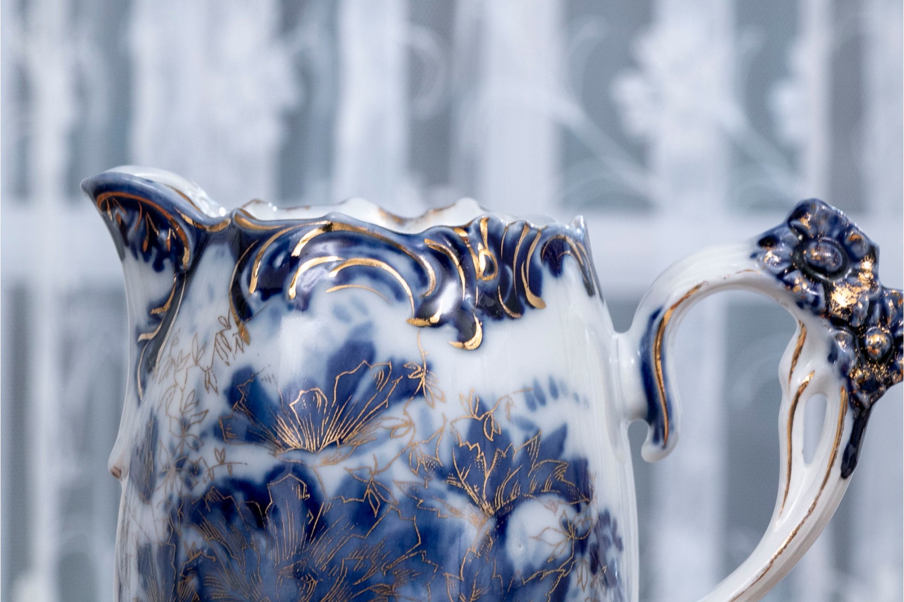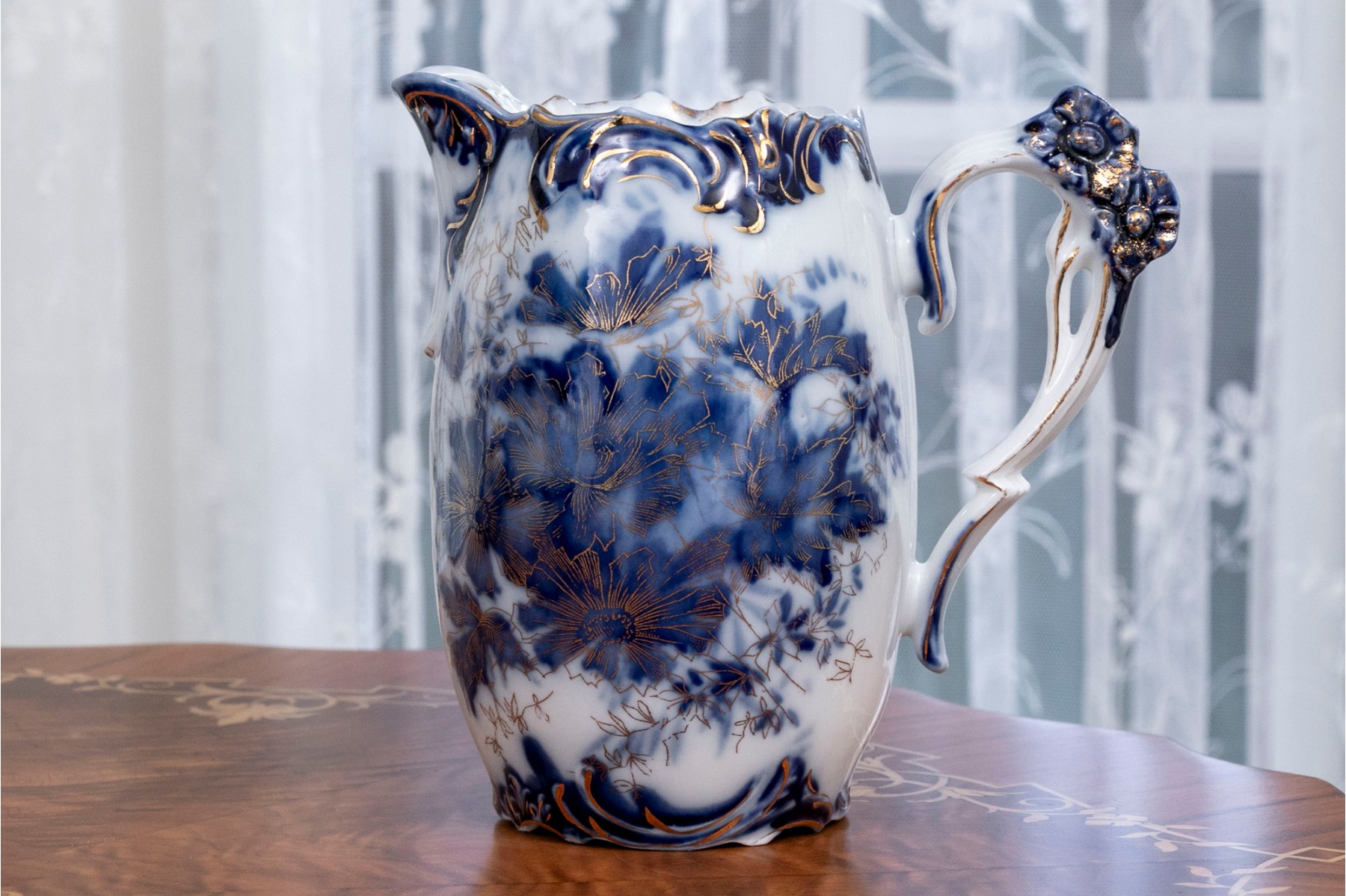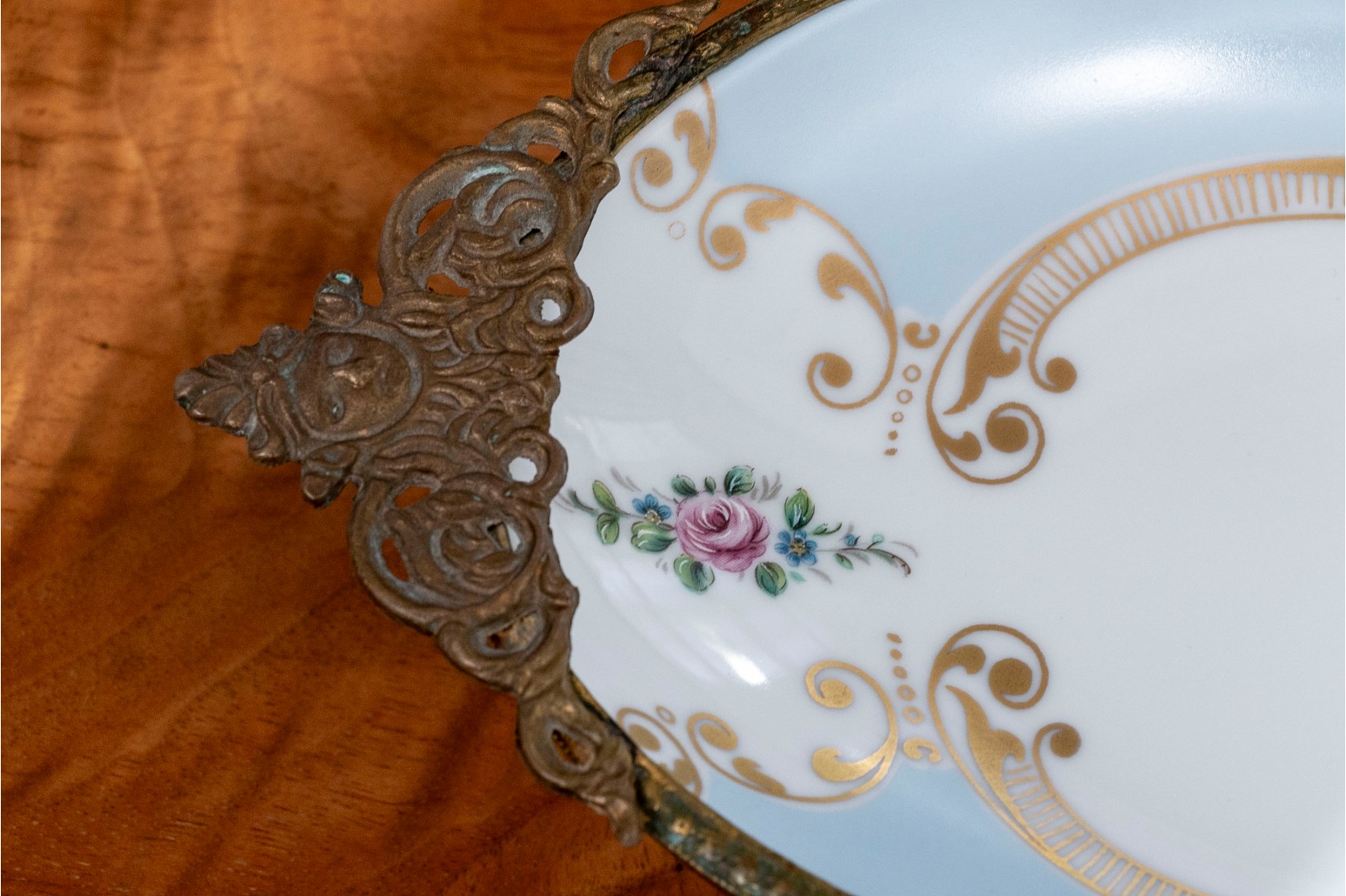 Collection of vintage porcelain comprised of a charming R.S. Prussia pitcher features blue, white, and gilt floral designs. The Royal Doulton vase boasts intricate florals and gilt handles, while a Limoges ormolu-mounted platter adds timeless elegance.