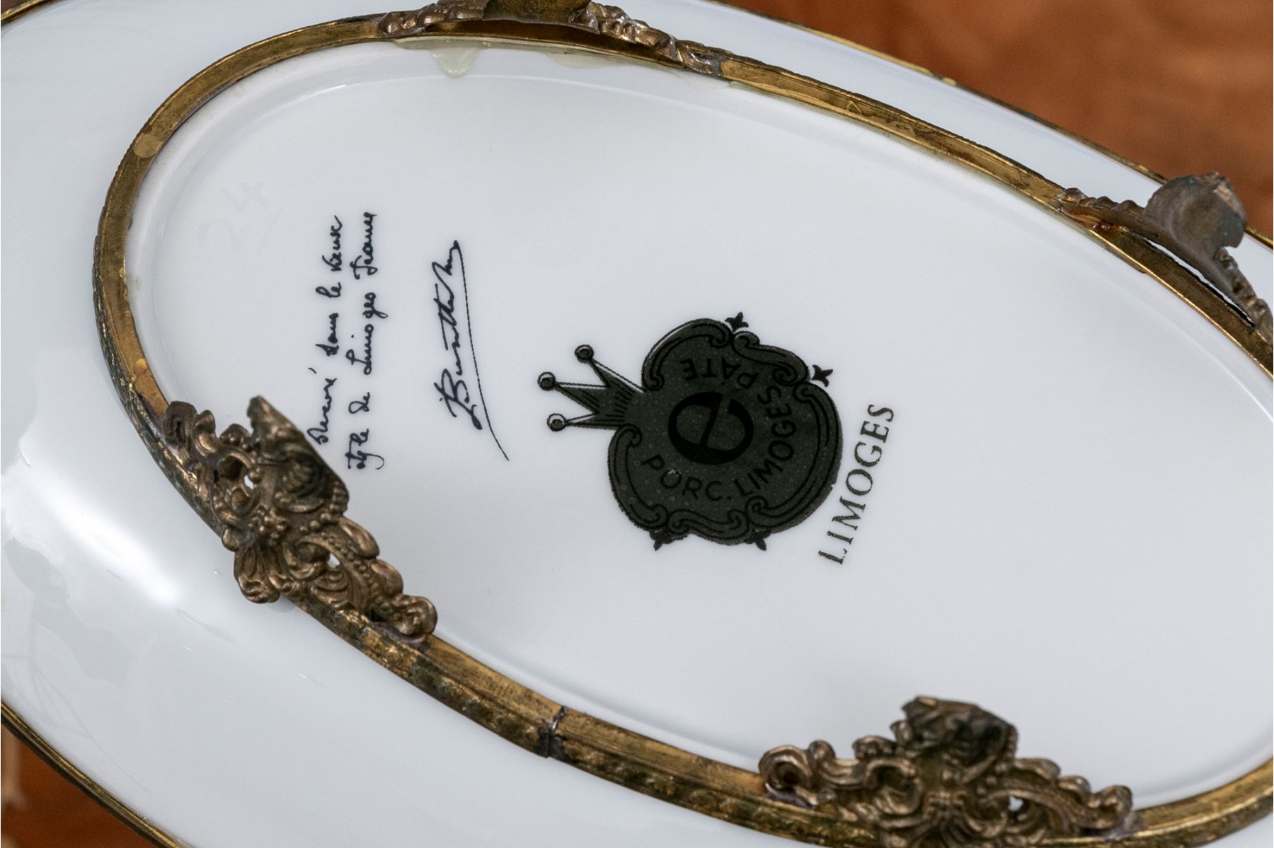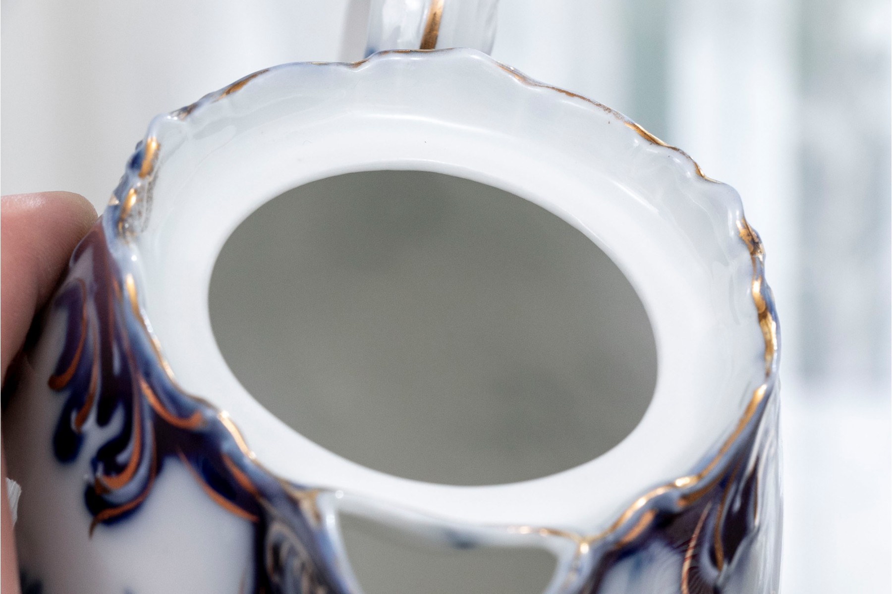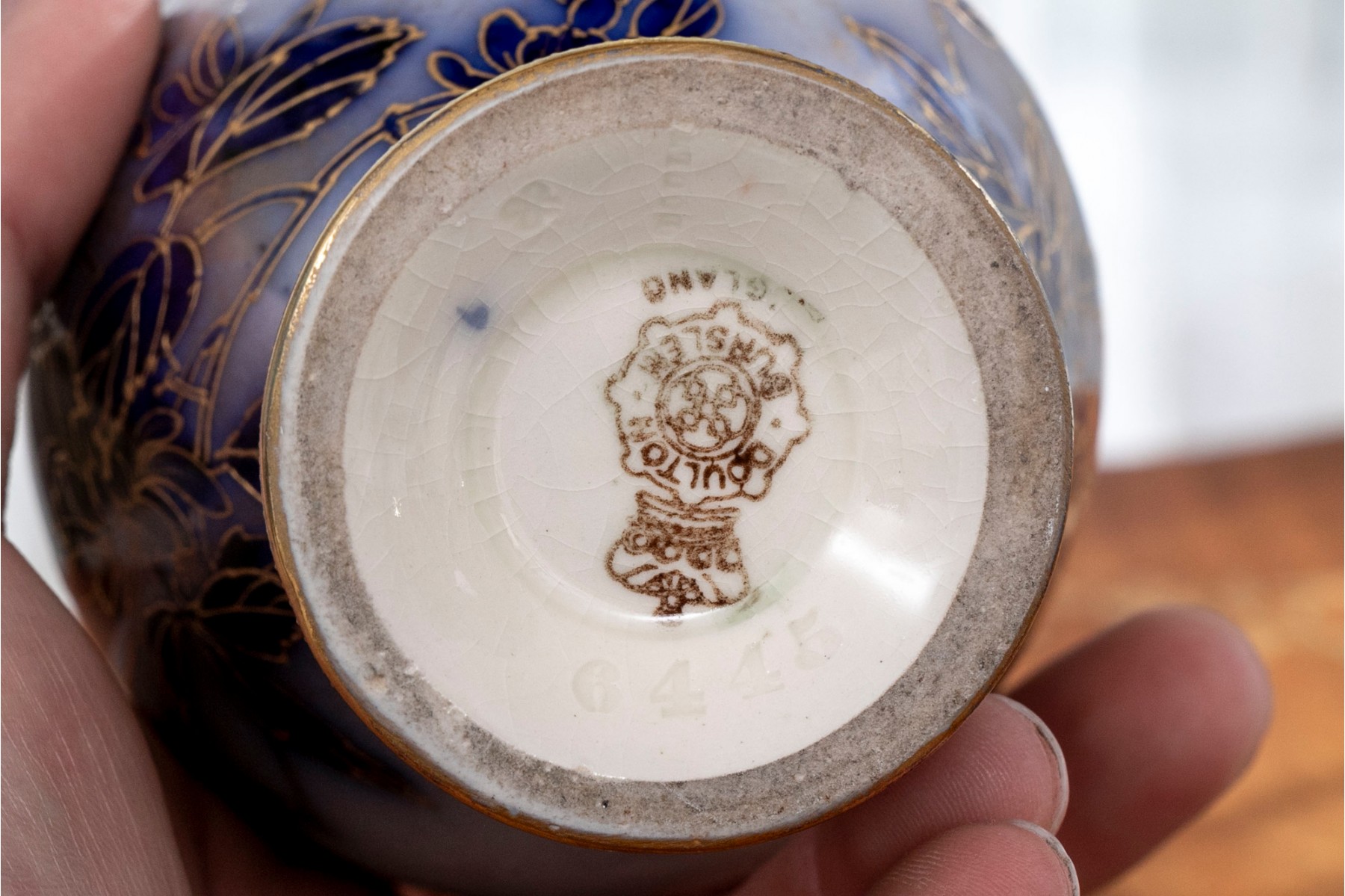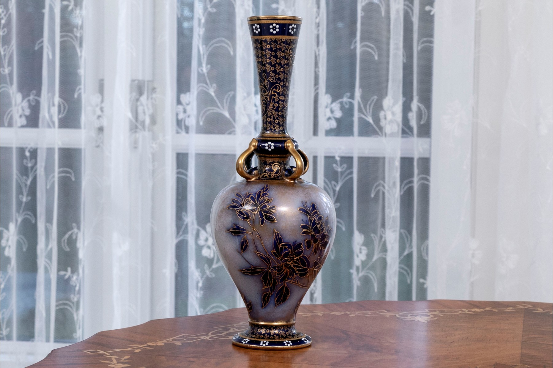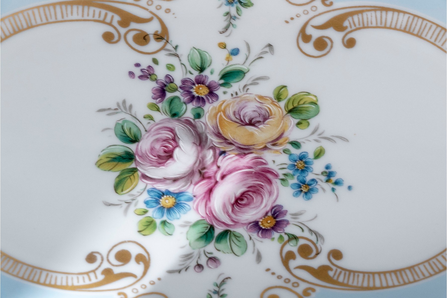 Collection of vintage porcelain comprised of a charming R.S. Prussia pitcher features blue, white, and gilt floral designs. The Royal Doulton vase boasts intricate florals and gilt handles, while a Limoges ormolu-mounted platter adds timeless elegance.