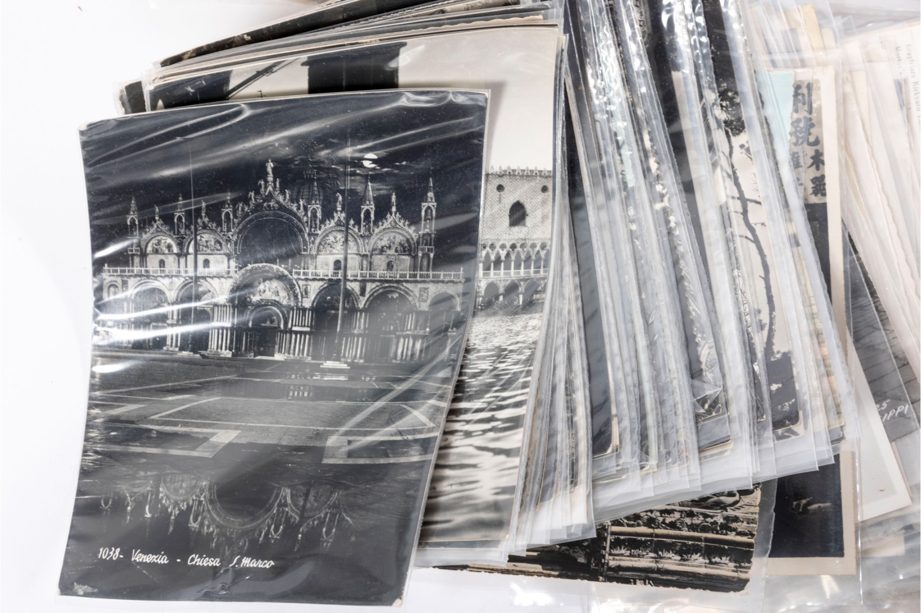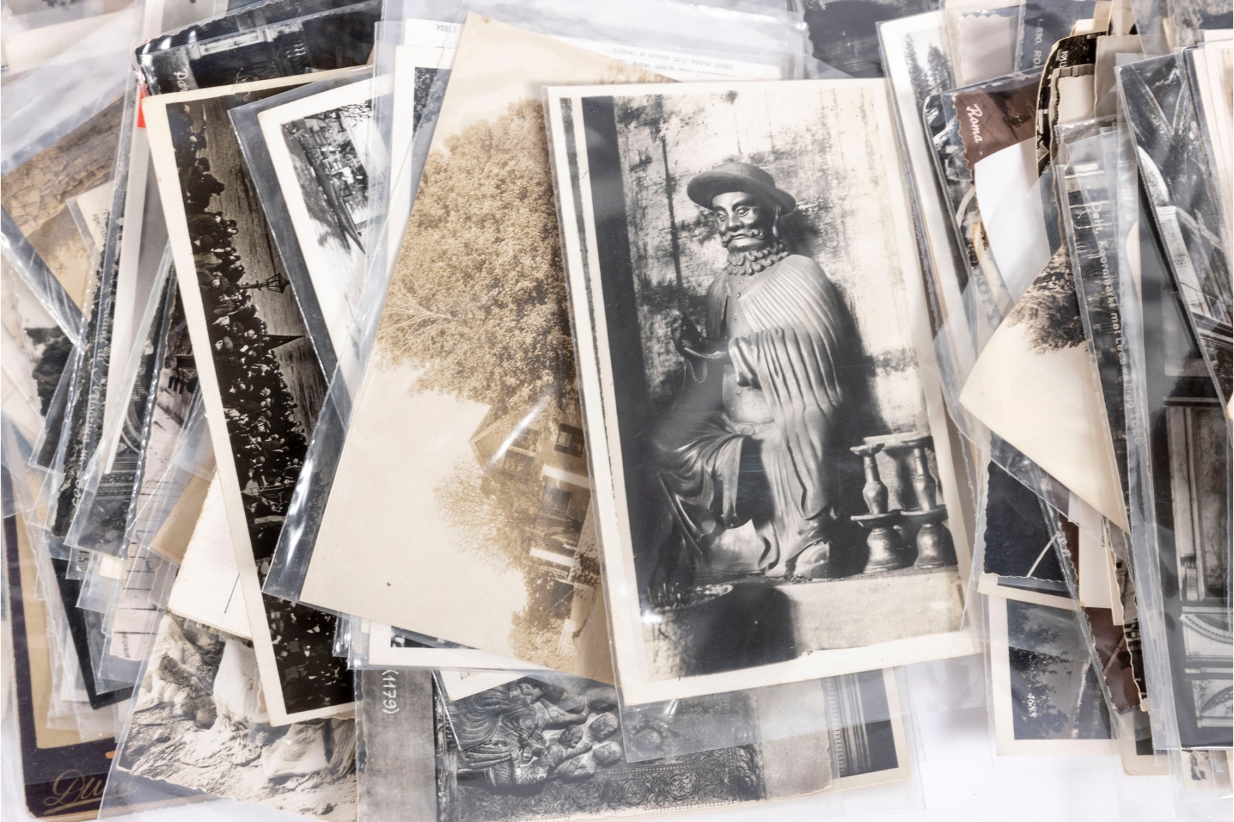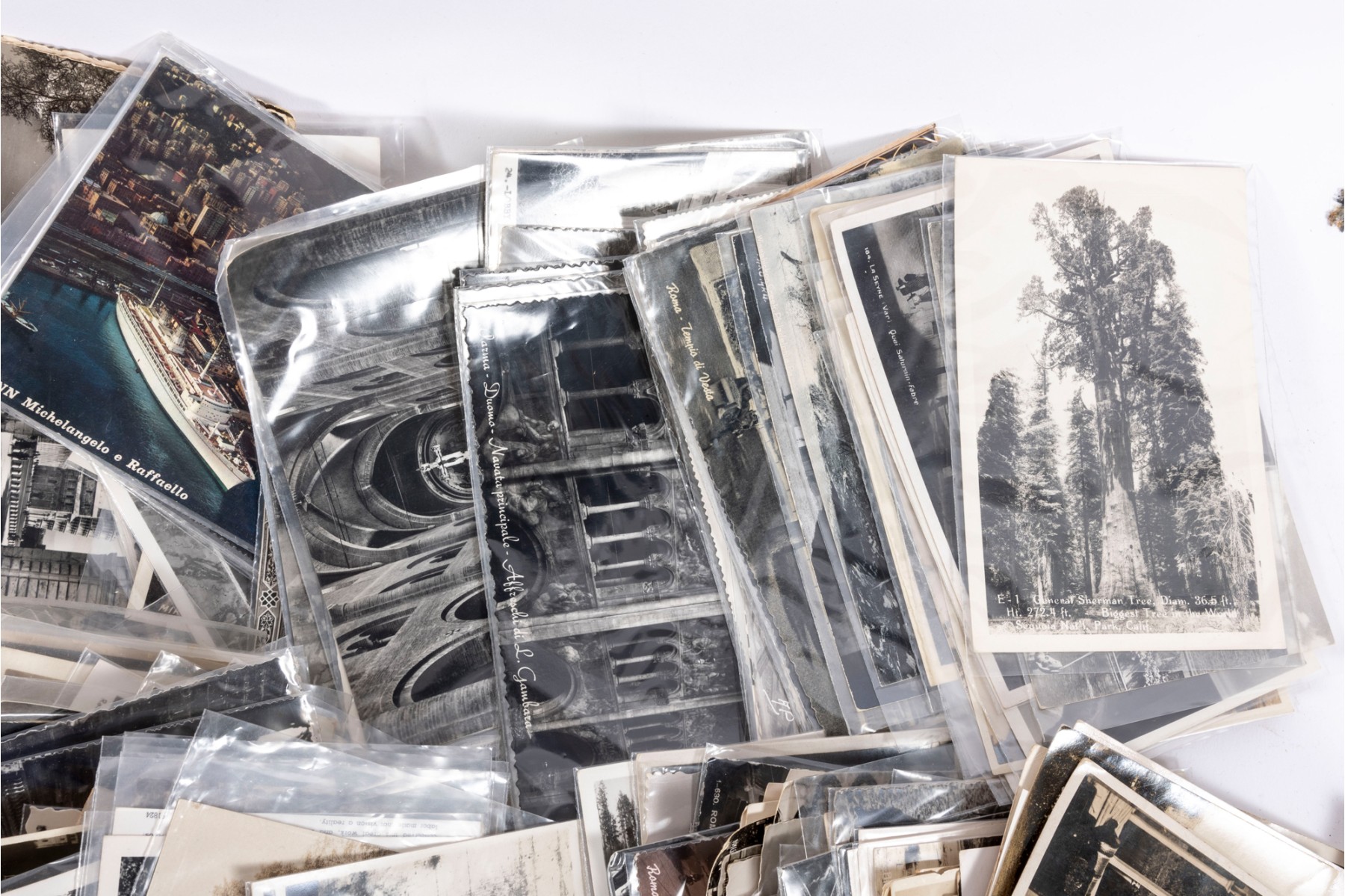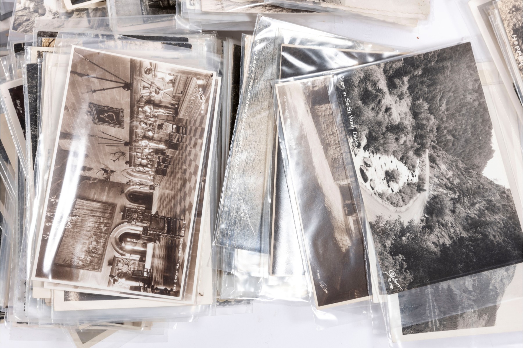A large collection of vintage post cards showcasing a multitude of photo locales in black & white. Contents as shown, see photos for details.