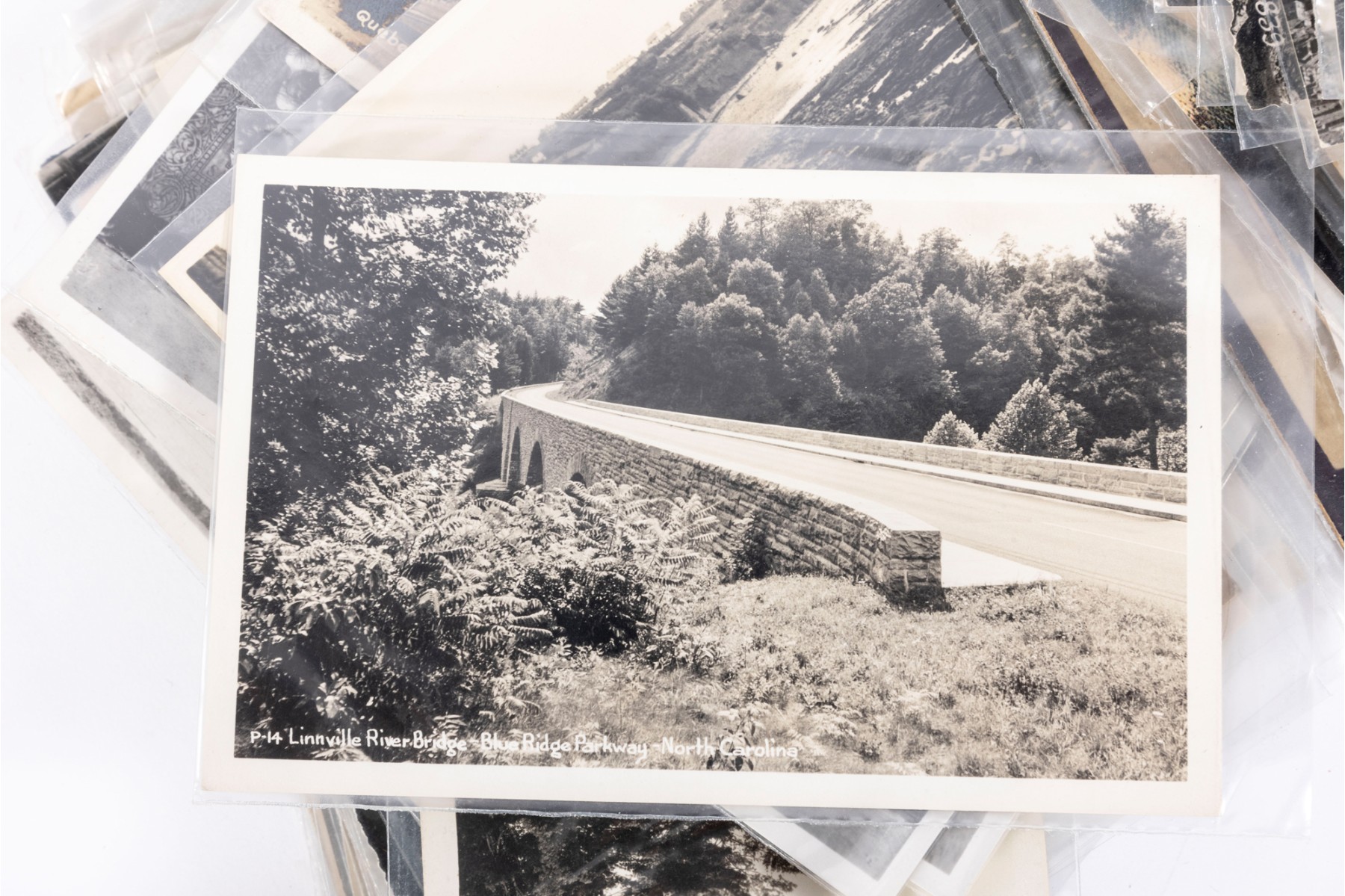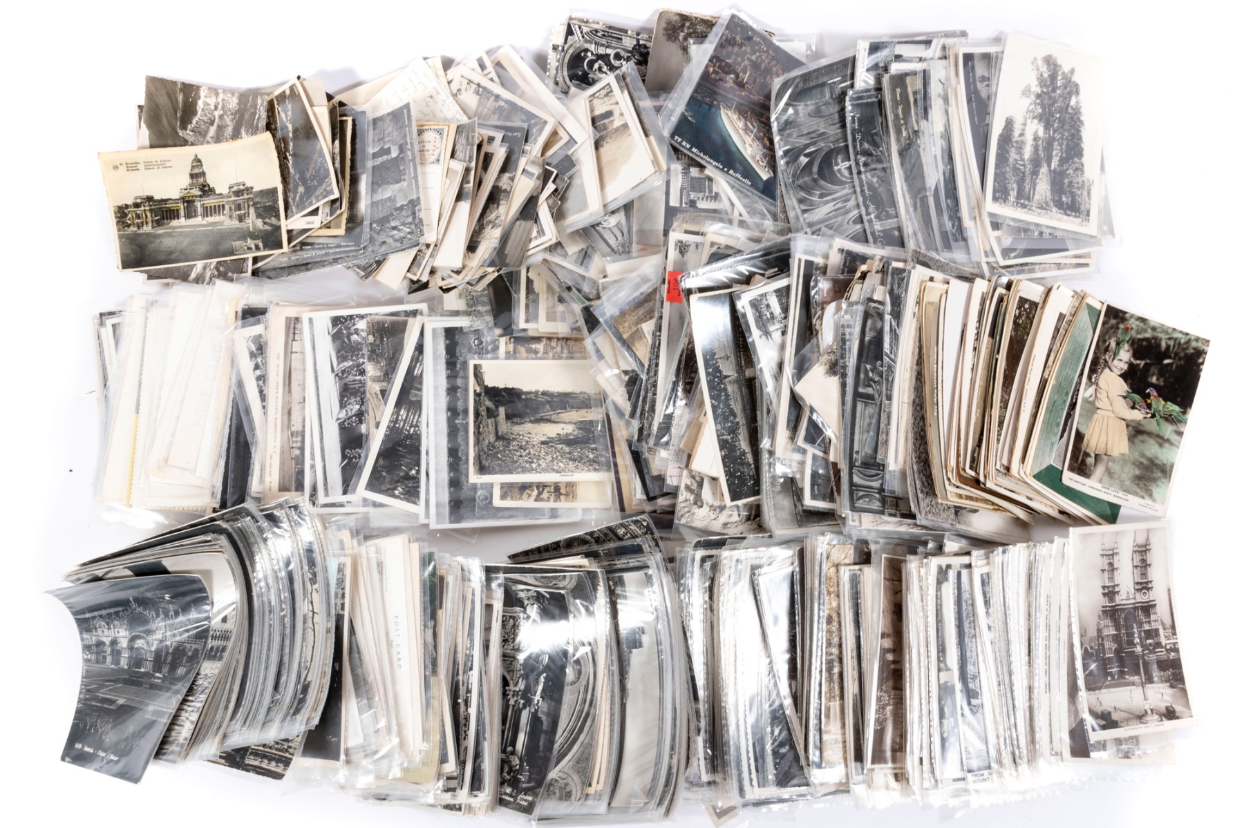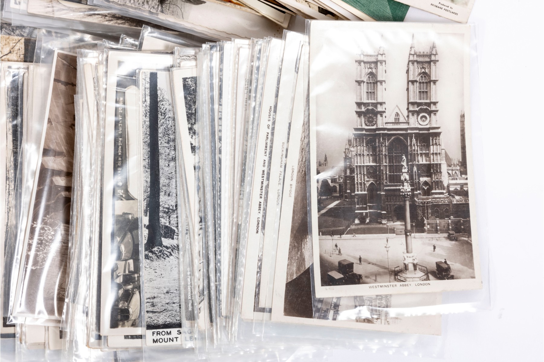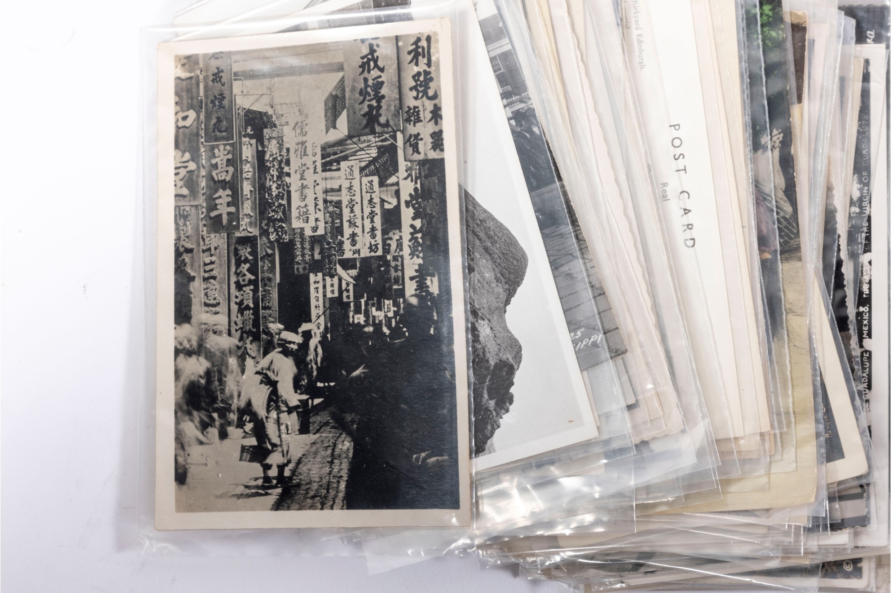 A large collection of vintage post cards showcasing a multitude of photo locales in black & white. Contents as shown, see photos for details.
