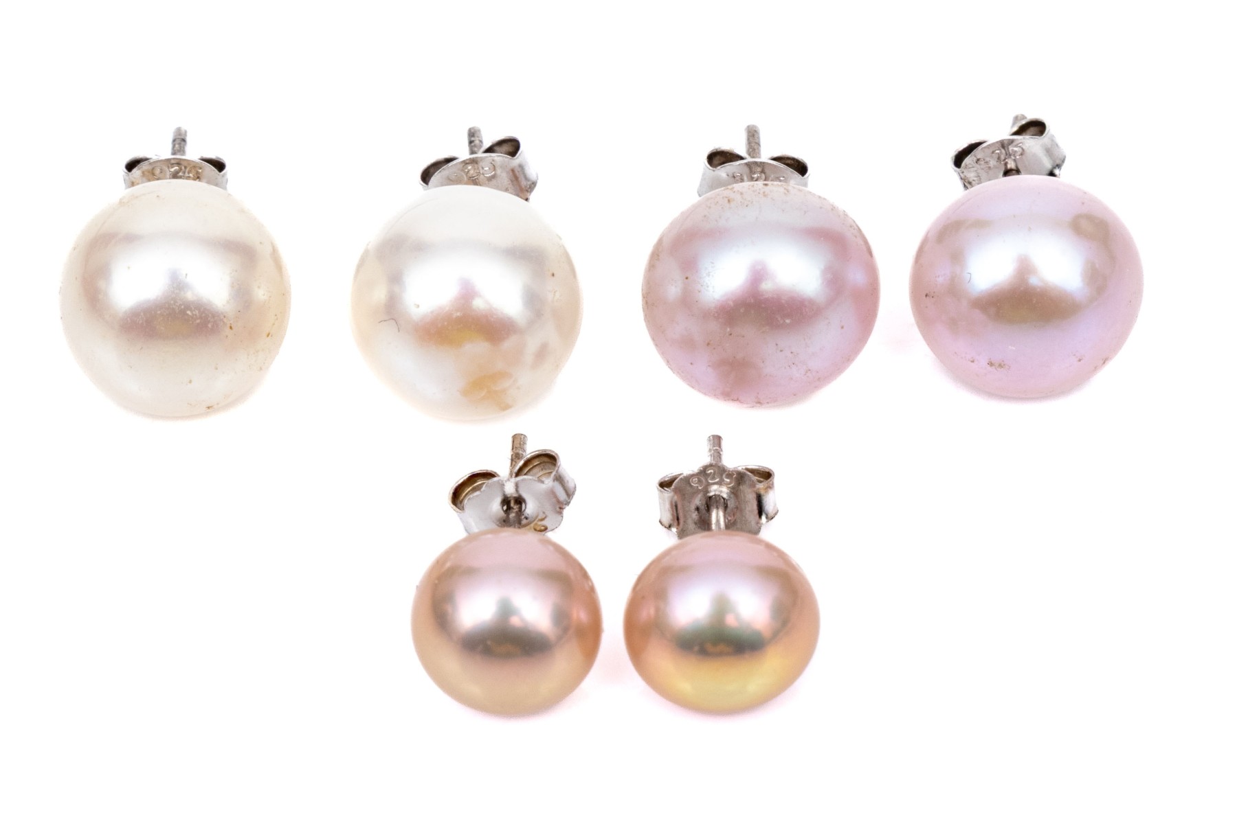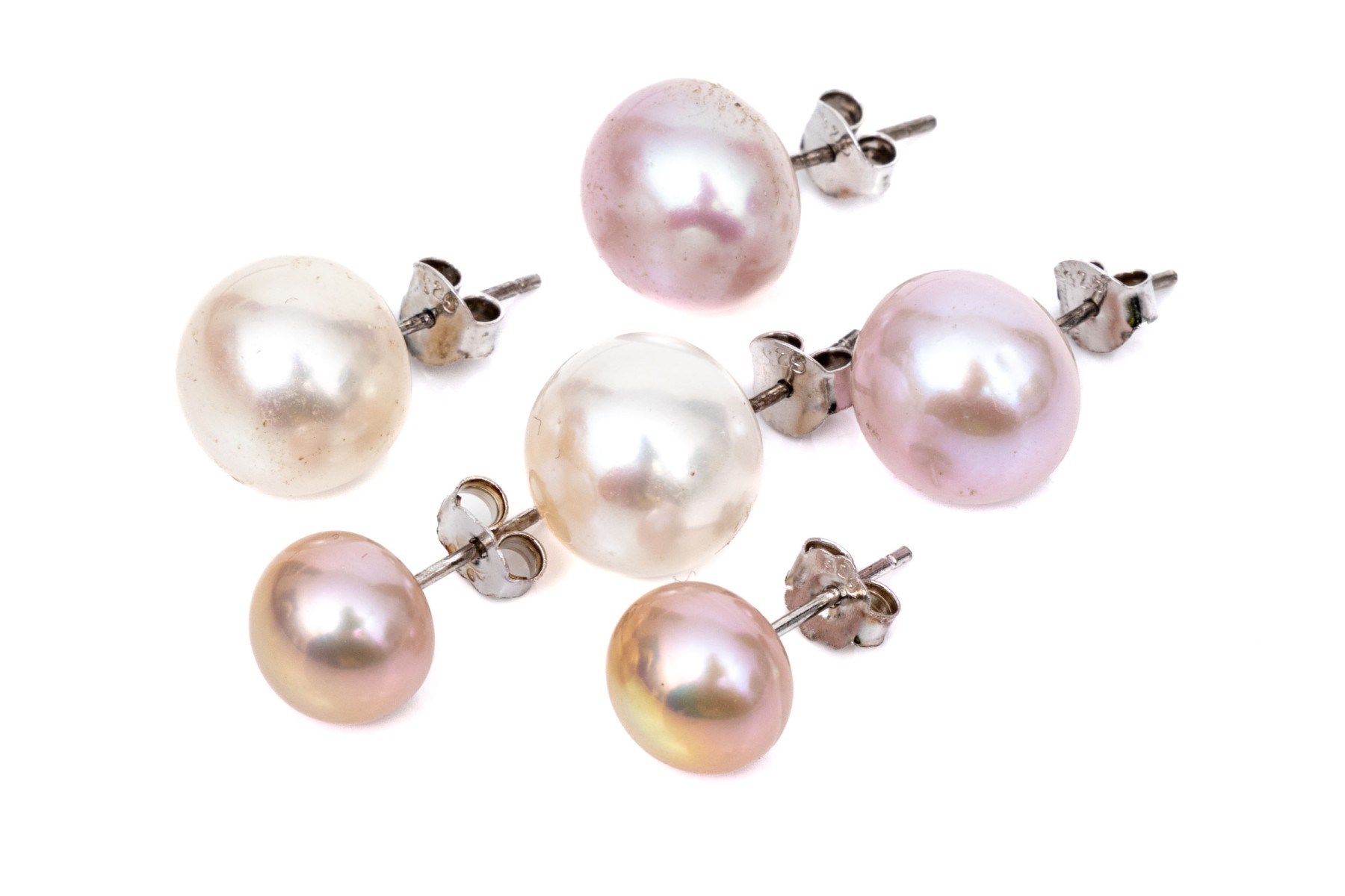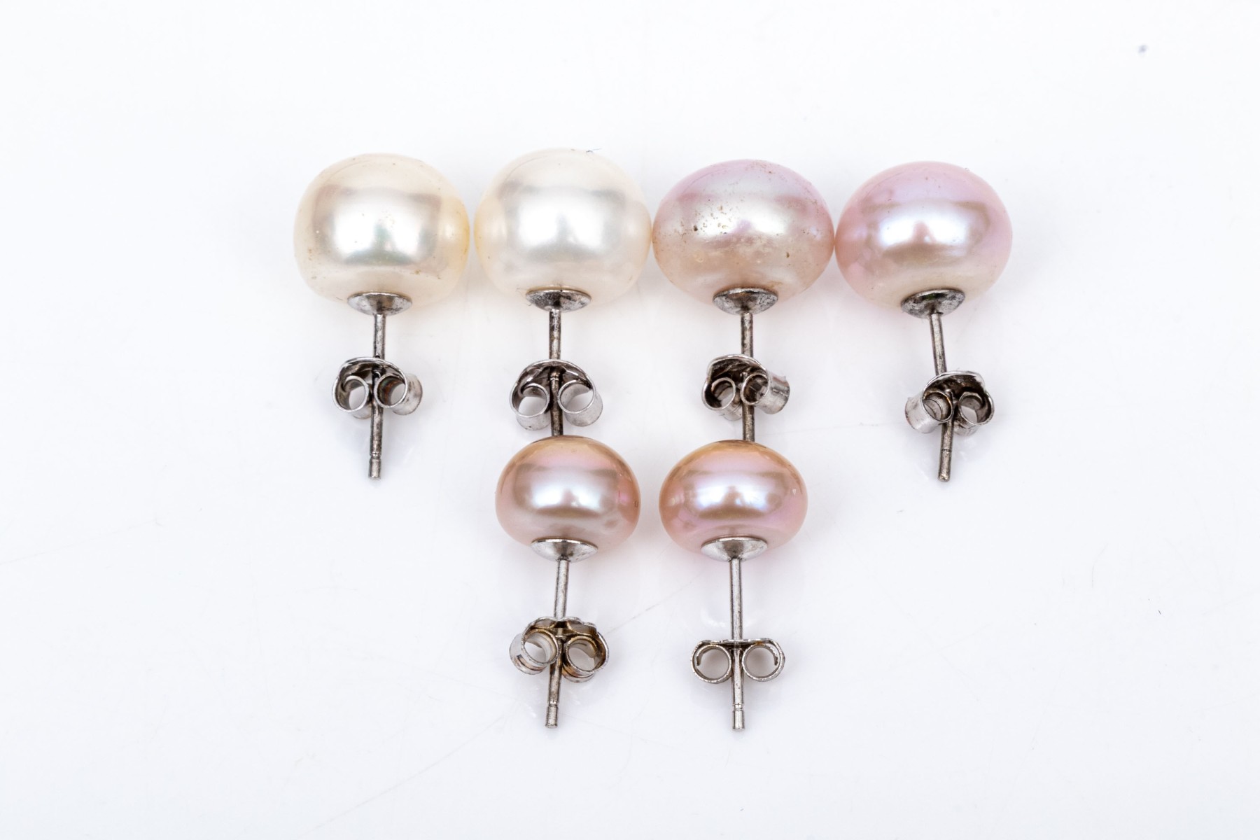 Collection of white and pink cultured freshwater pearl stud earrings, with sterling silver posts