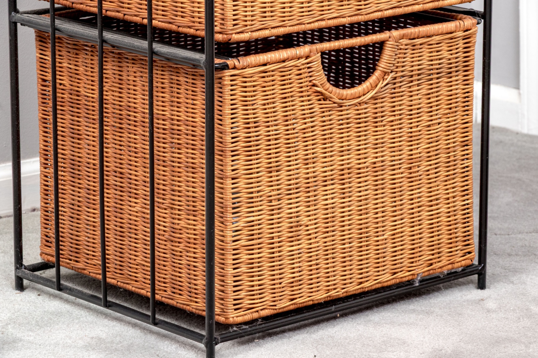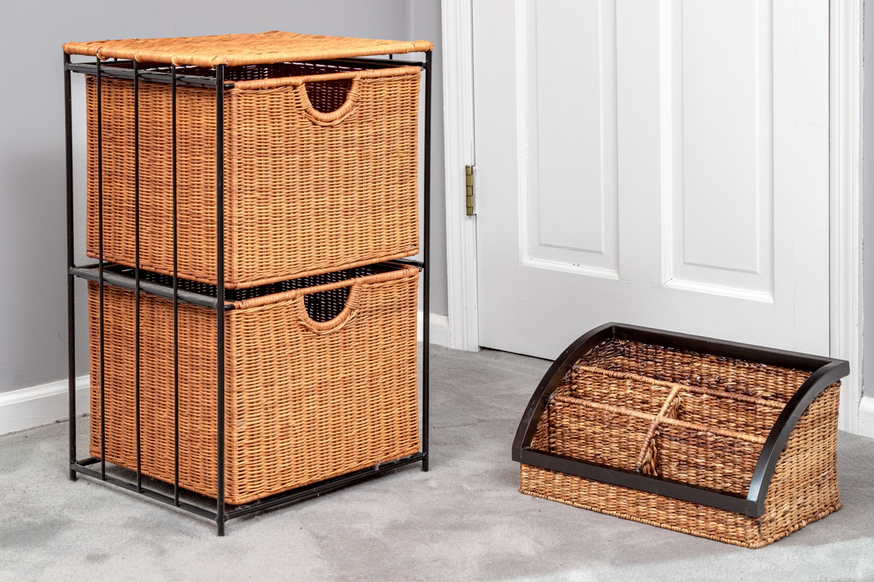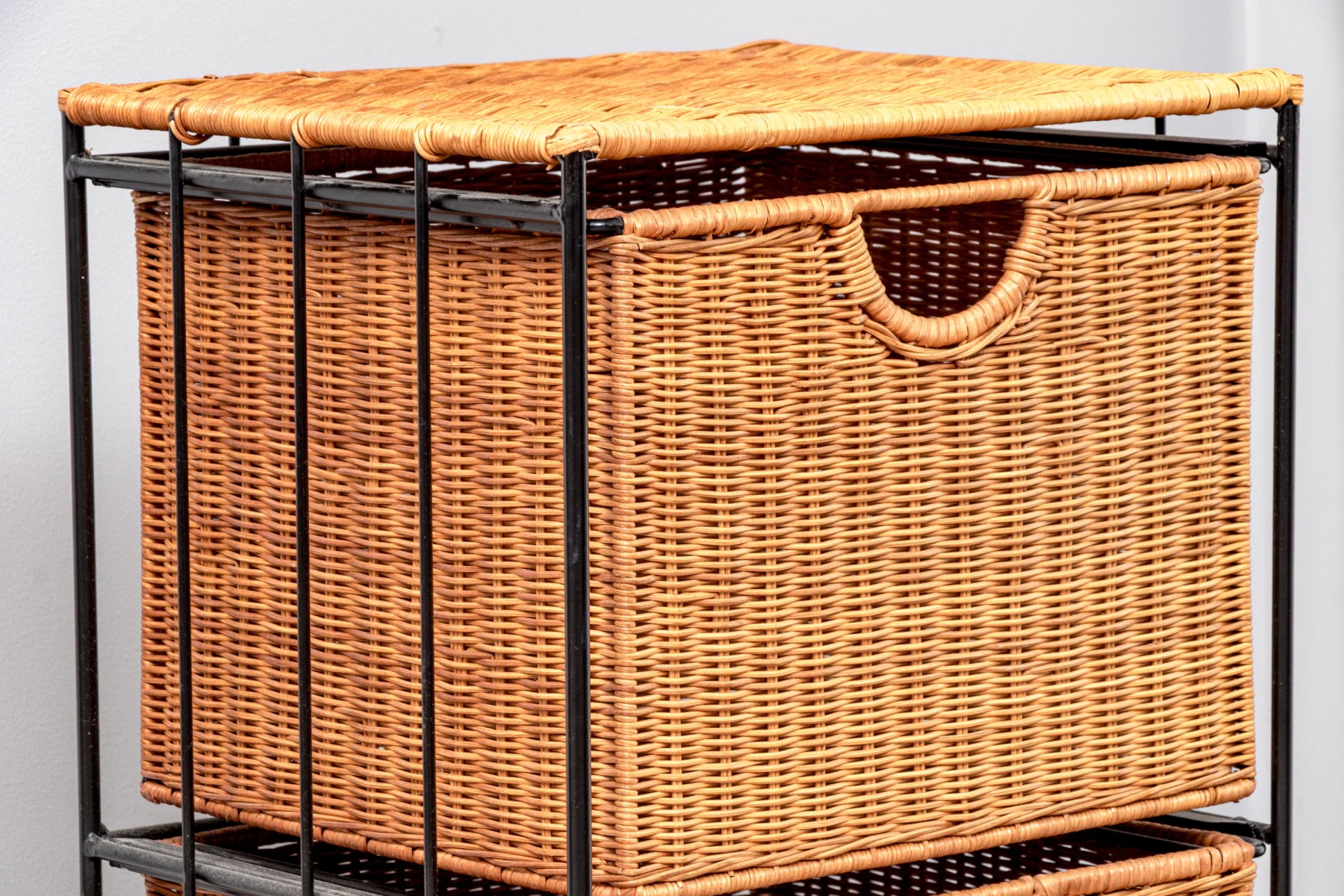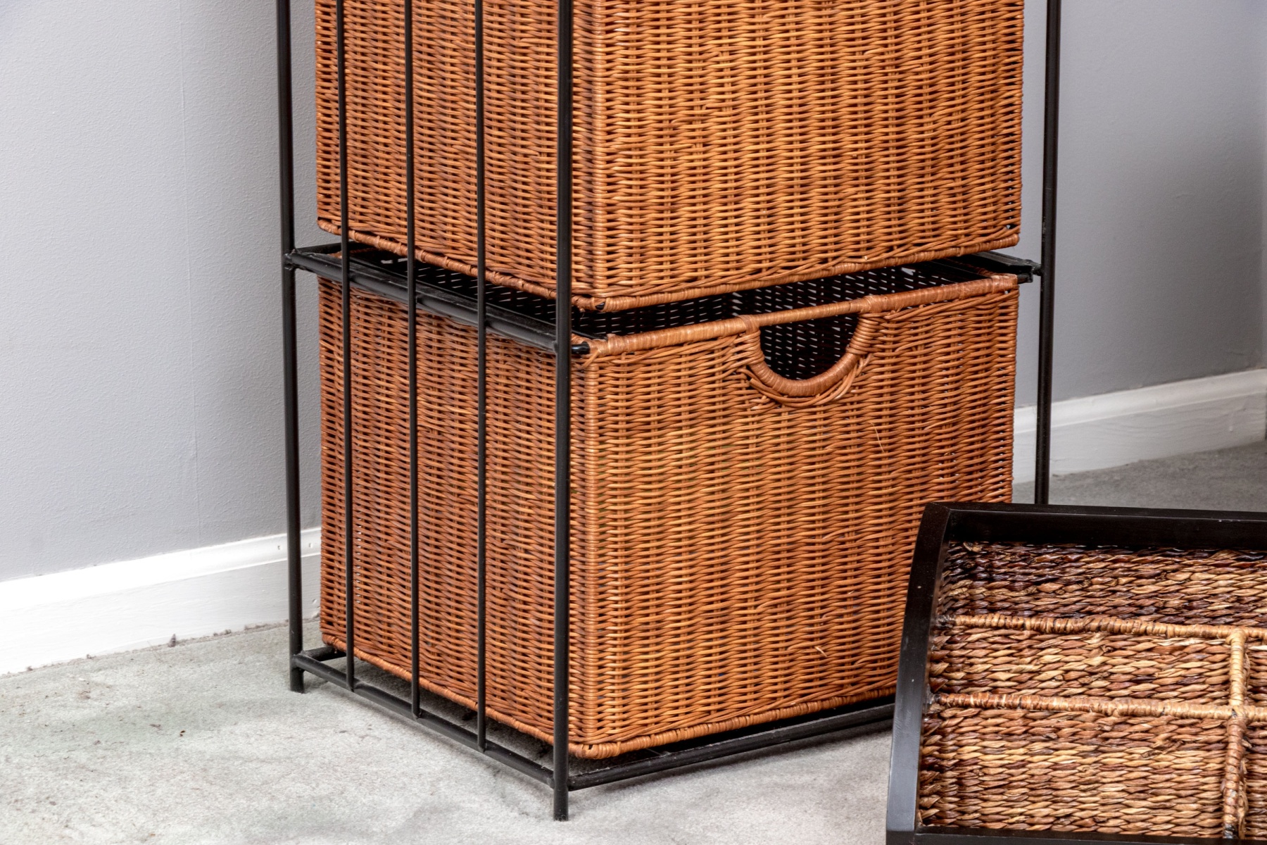 Comprised of two black metal framed case with two wicker woven square containment drawers with handle and wicker woven top, together with the same but having four wicker storage cubes and wicker top. Together with rectangular form wicker woven letter caddy.