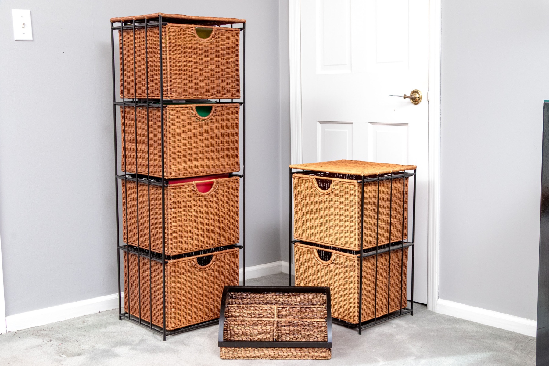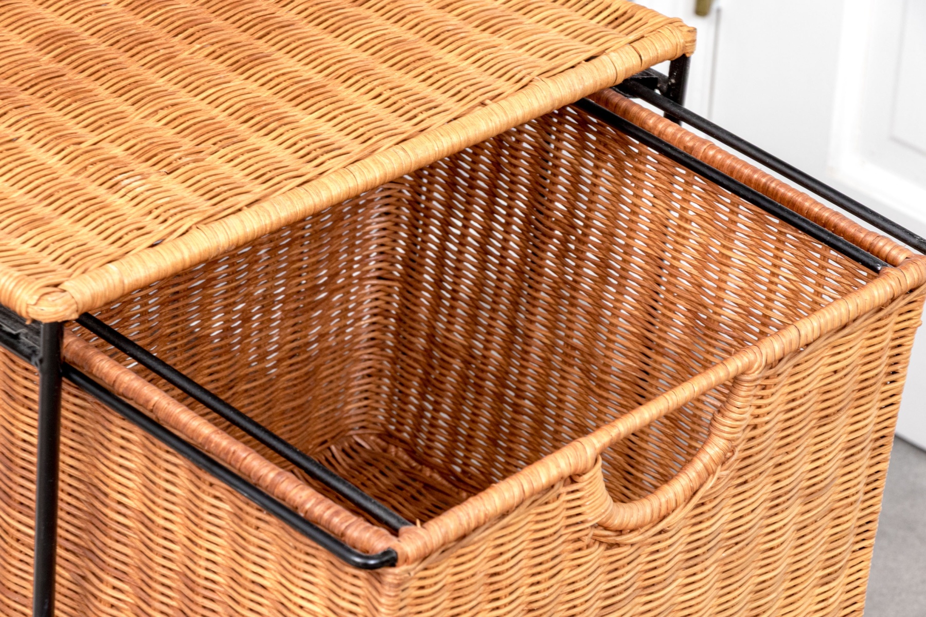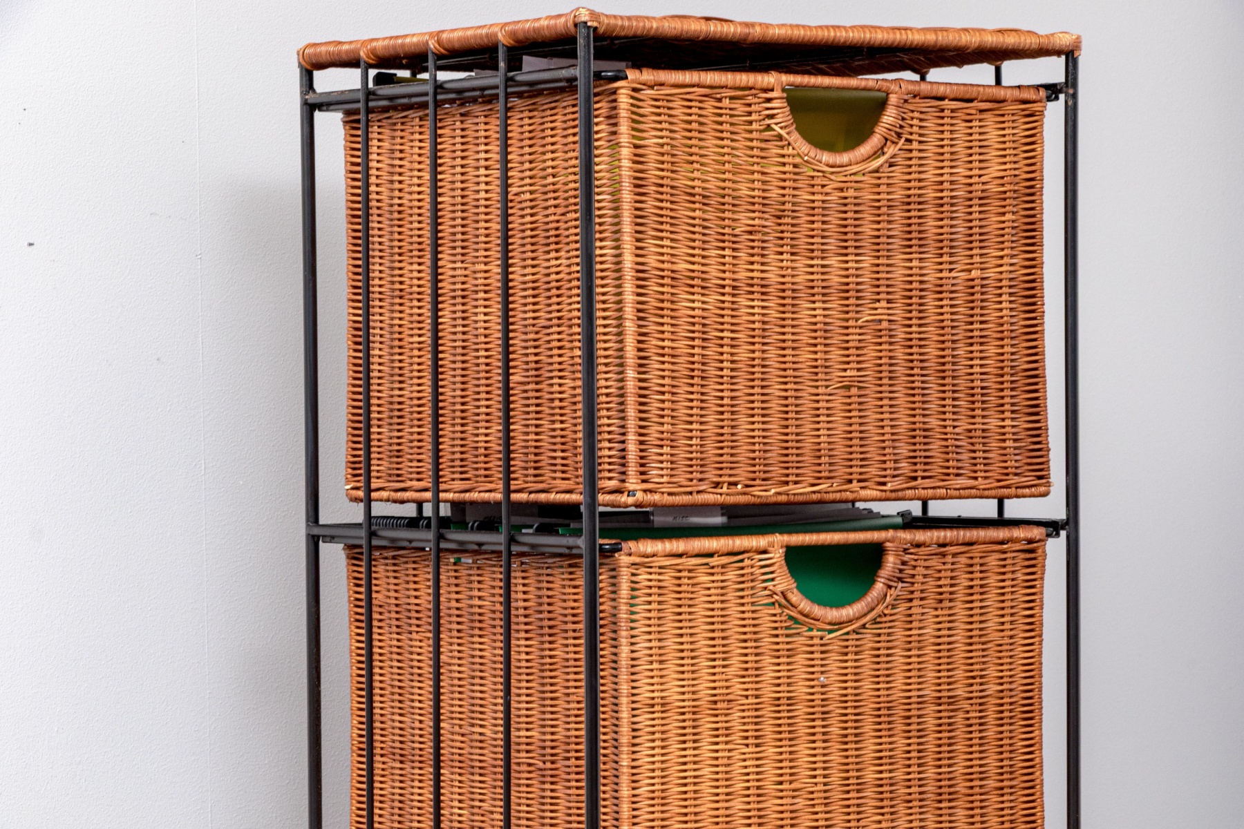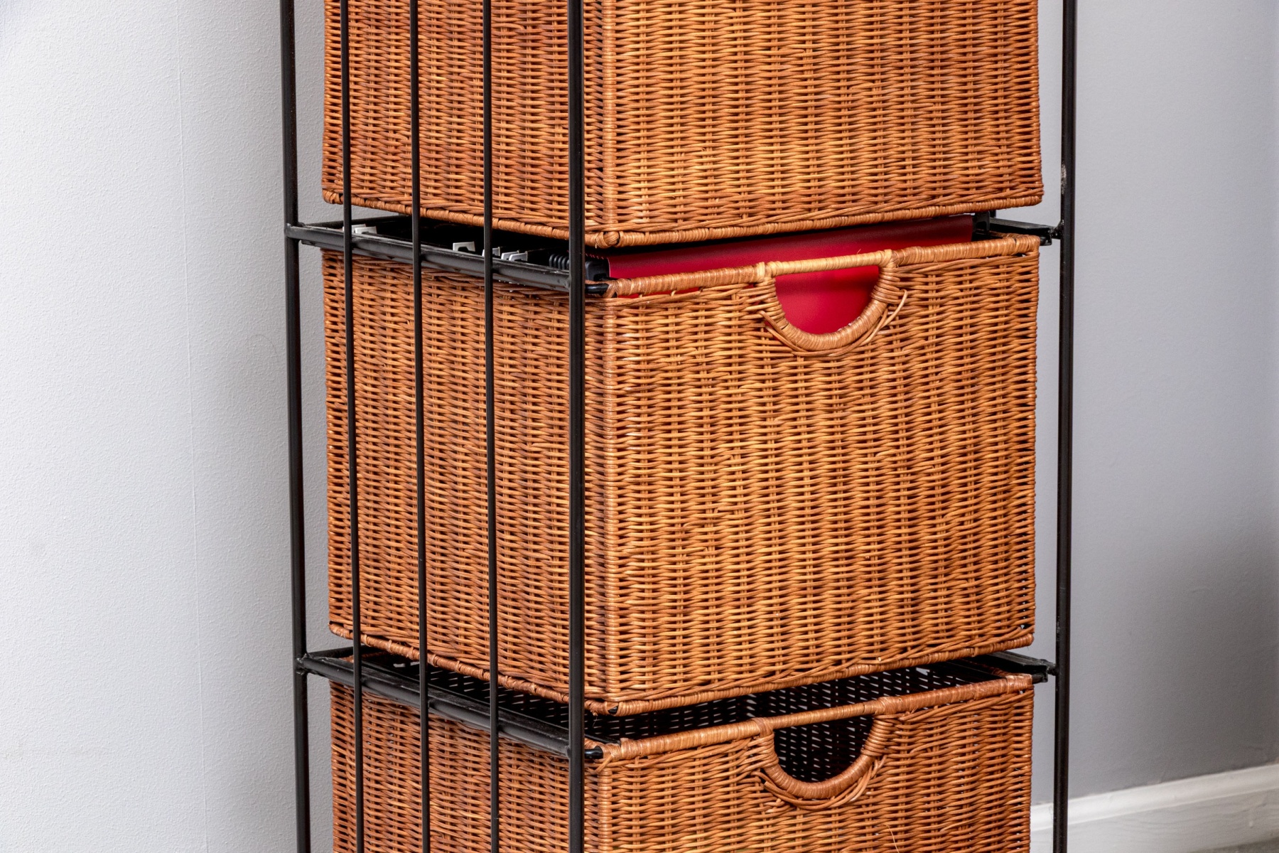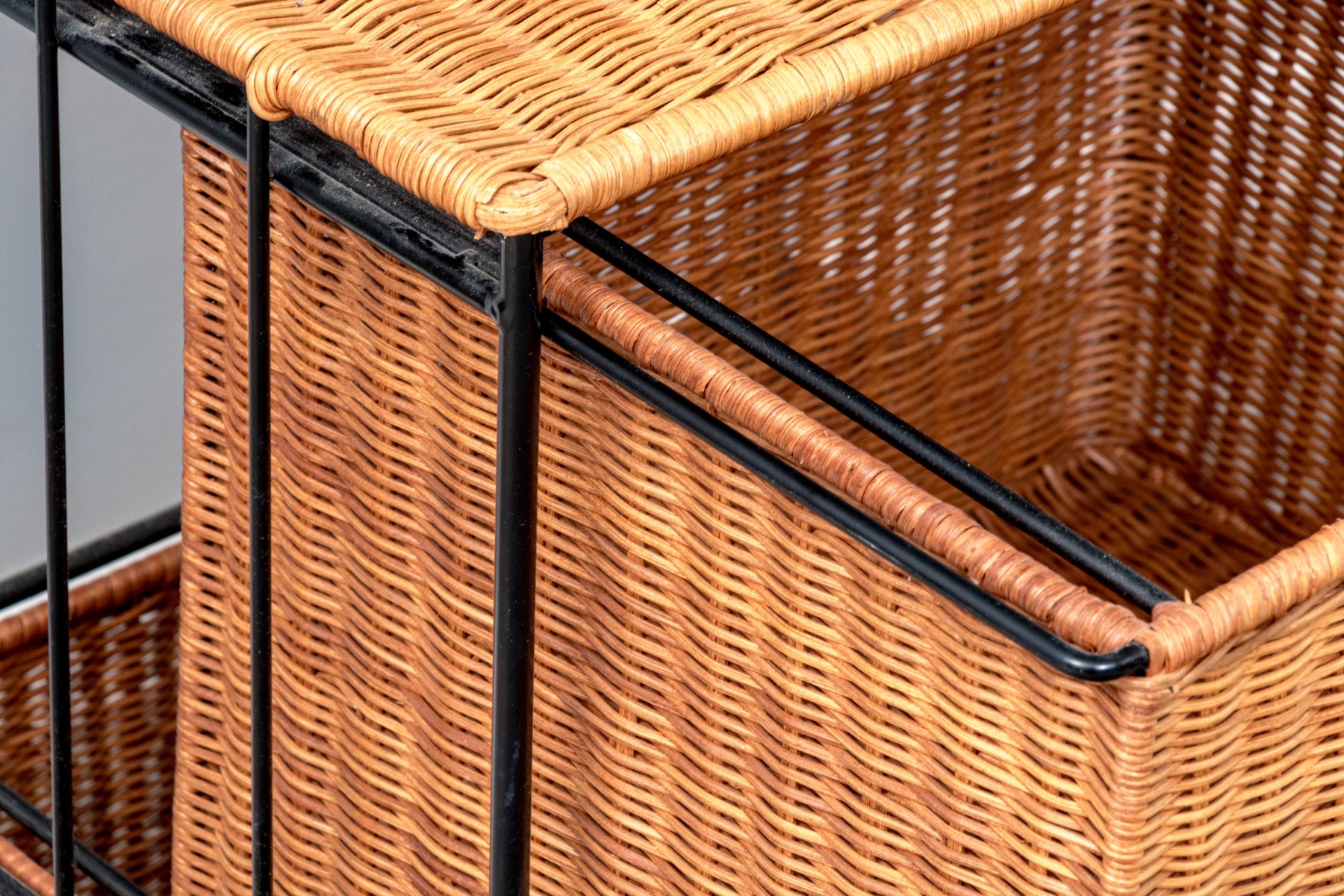 Comprised of two black metal framed case with two wicker woven square containment drawers with handle and wicker woven top, together with the same but having four wicker storage cubes and wicker top. Together with rectangular form wicker woven letter caddy.