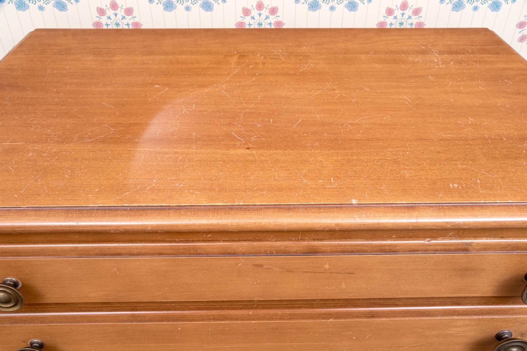 A charming chest on chest tallboy with great Colonial and Federal appeal, well crafted in honeyed brown maple wood with an upper chest fitted with two drawers, with the top drawer having the facade of two short drawers. The lower chest features two large drawers, all with large circular brass knobs and nicely beveled edges. Raised on classic bracket feet.