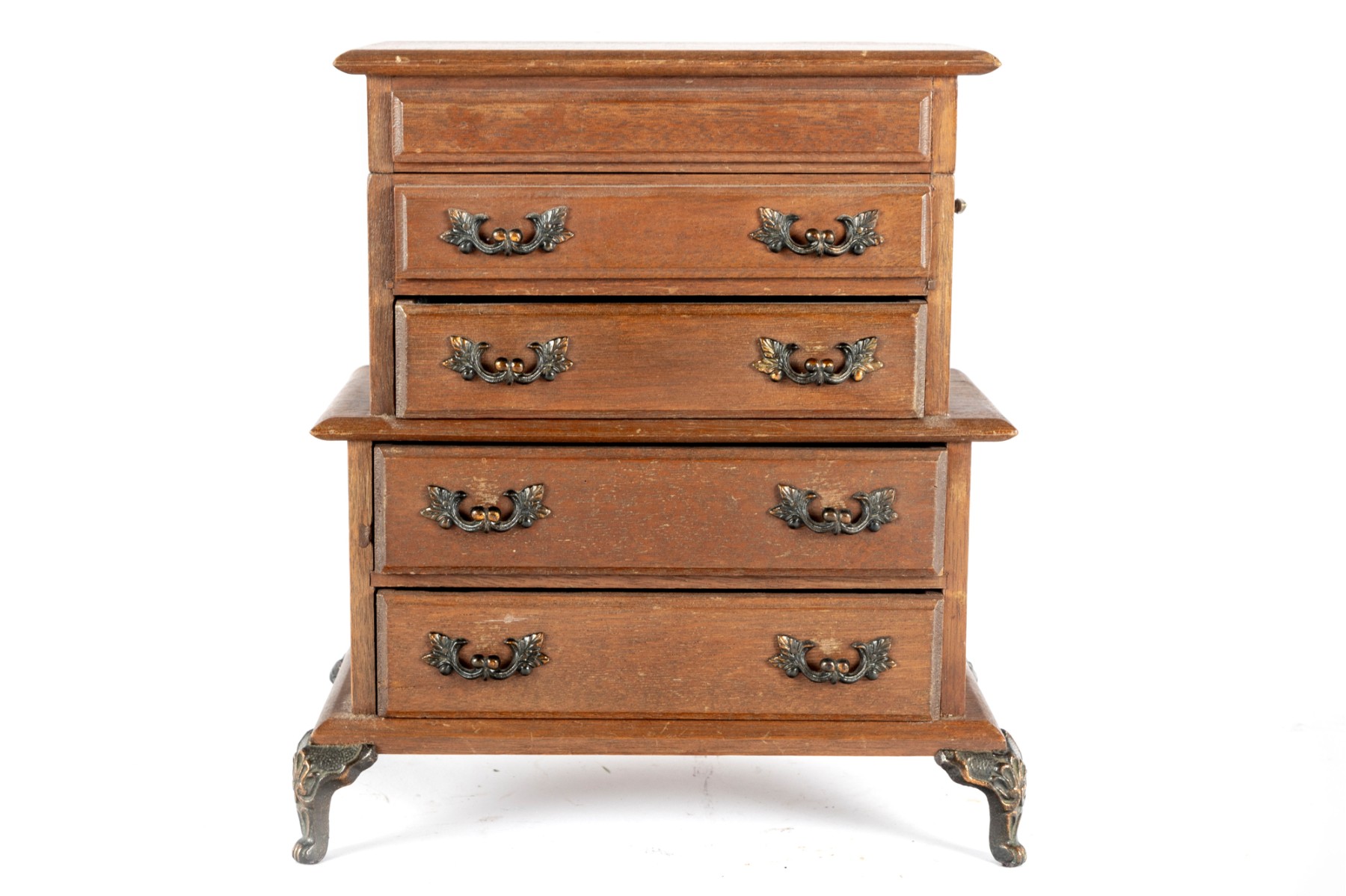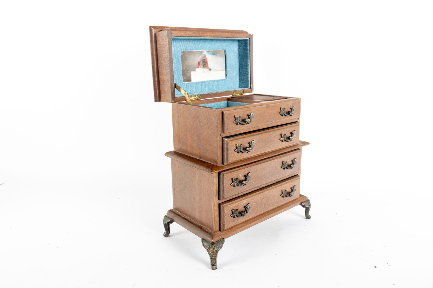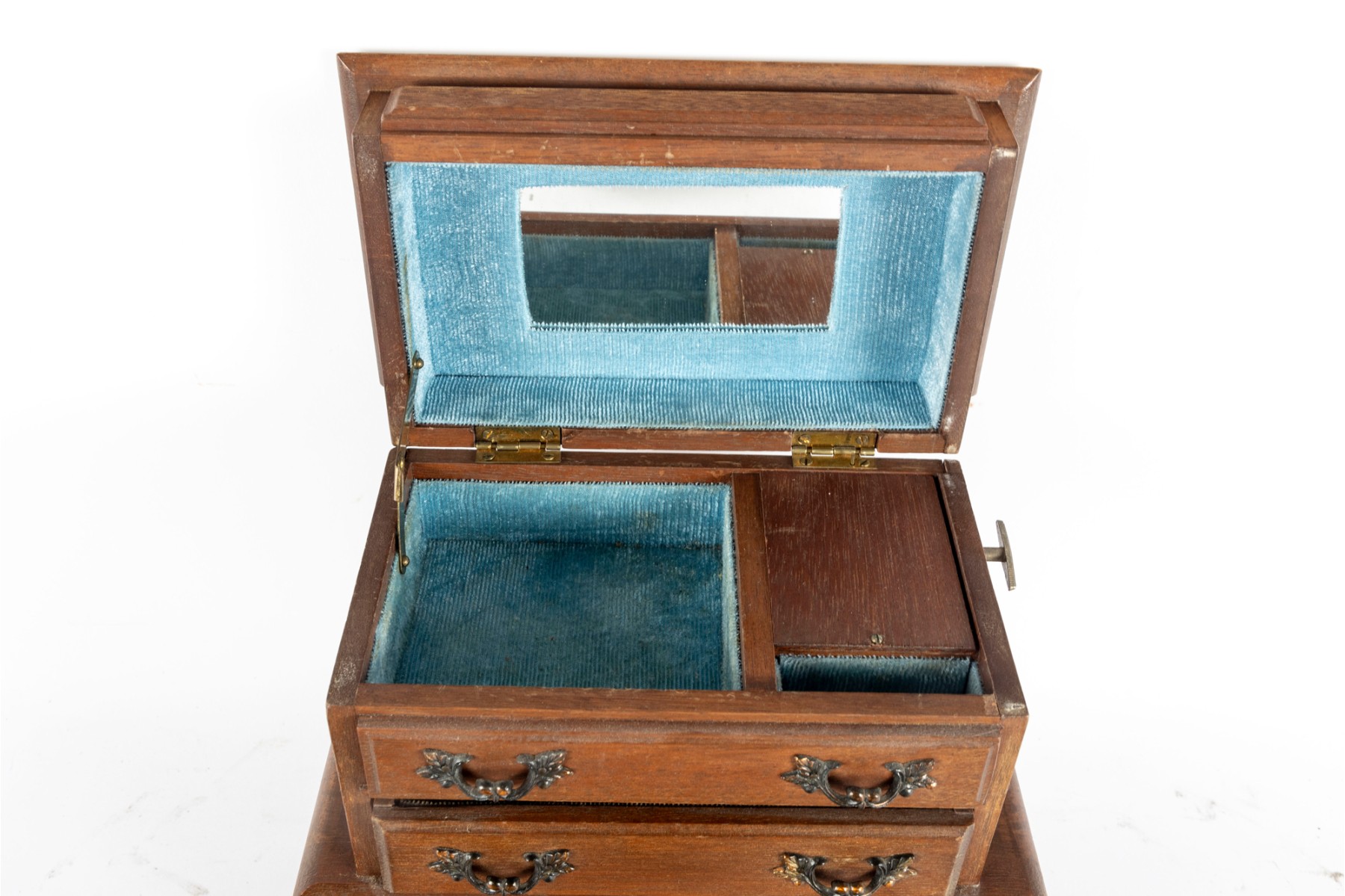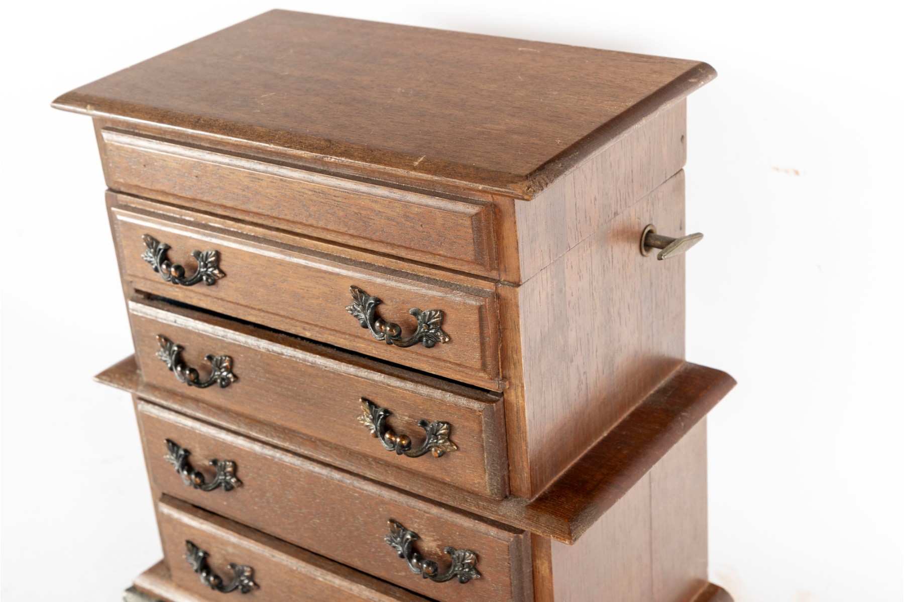 A salesman's sample style jewelry box in the form of a Colonial chest. Five drawers in total, all lined in blue velvet. The hinged top activates the music box and contains compartmental cubbies accompanied by a small vanity mirror.
