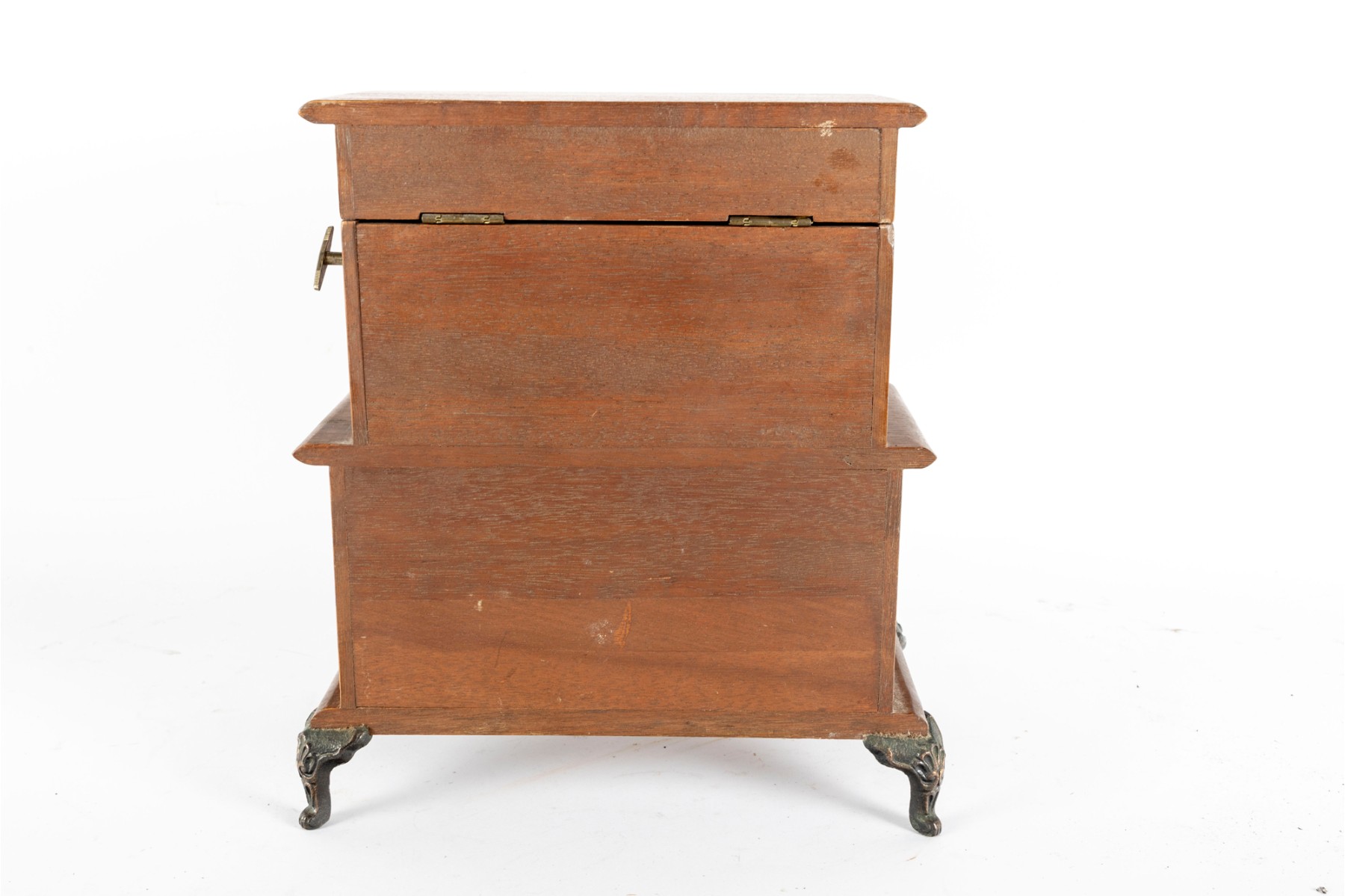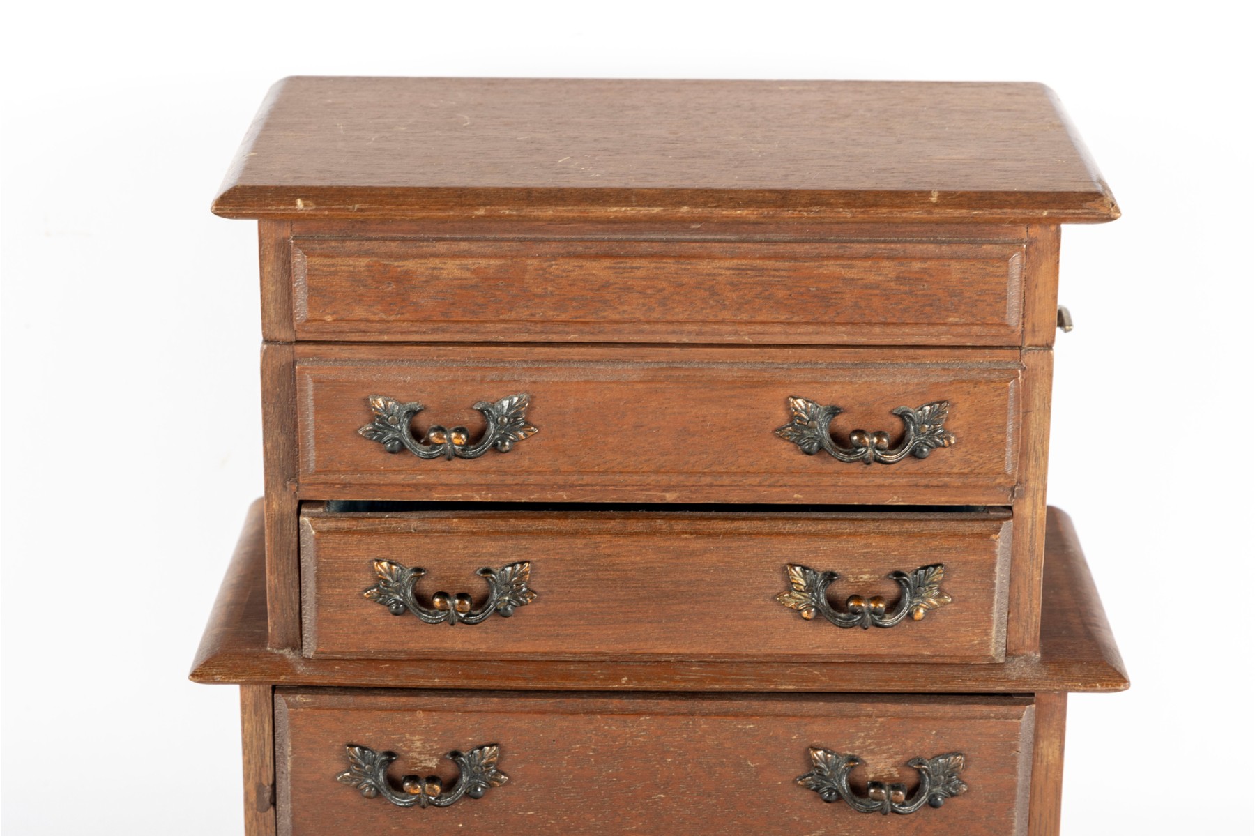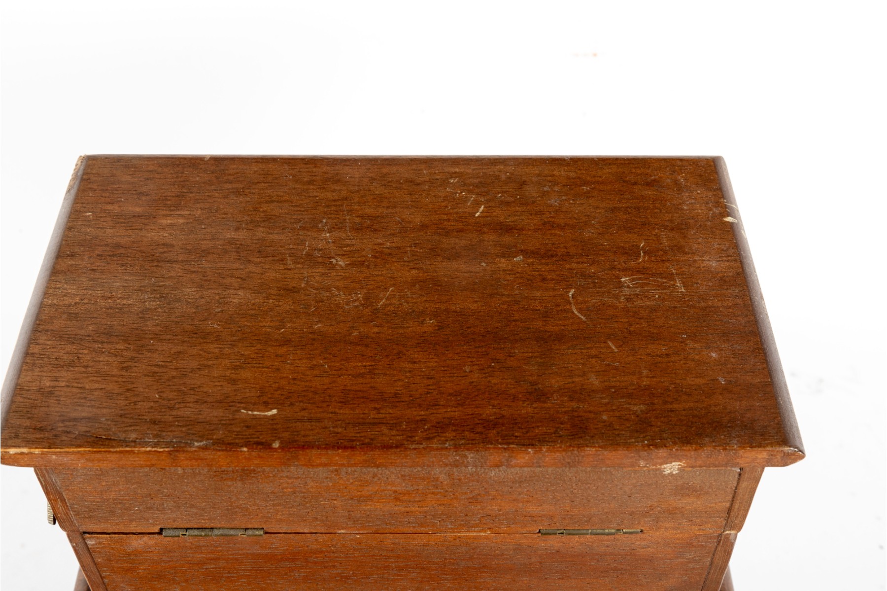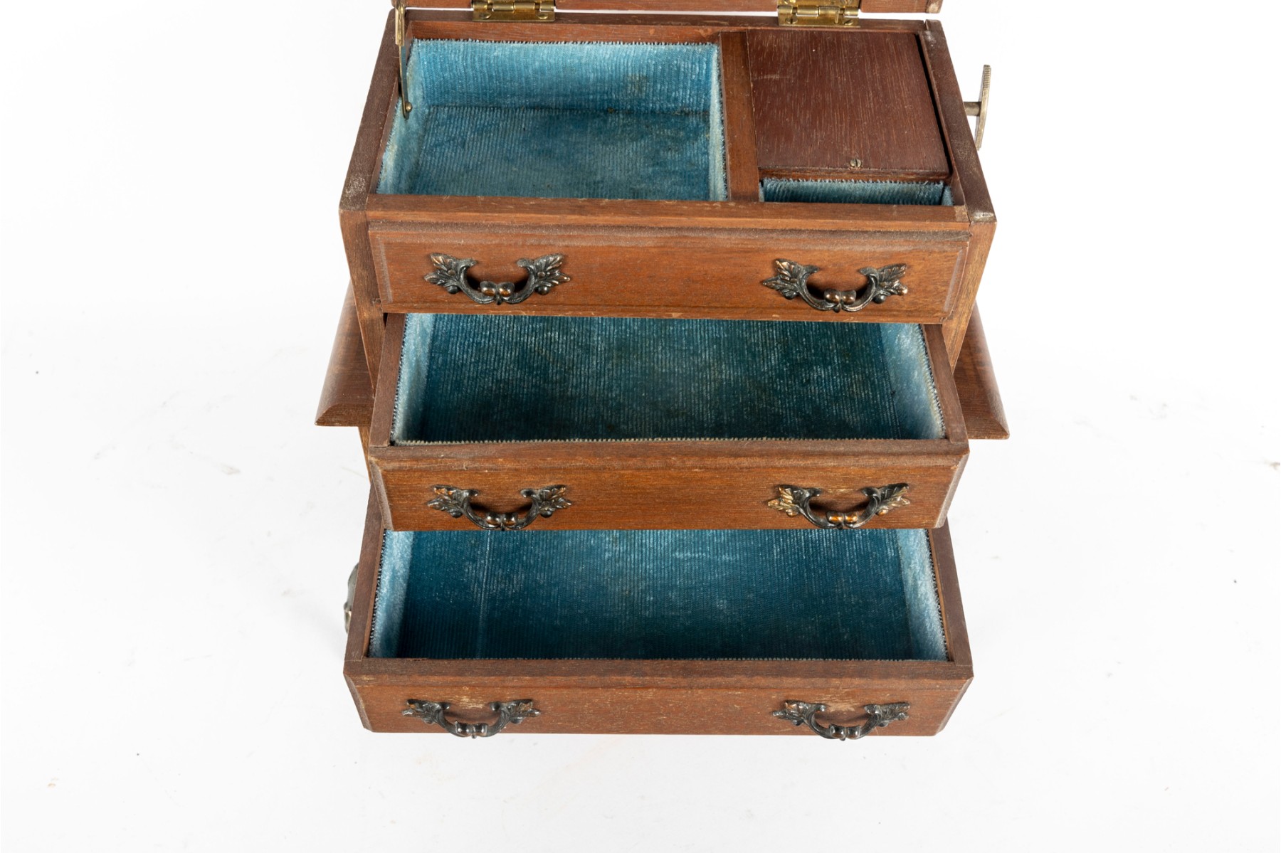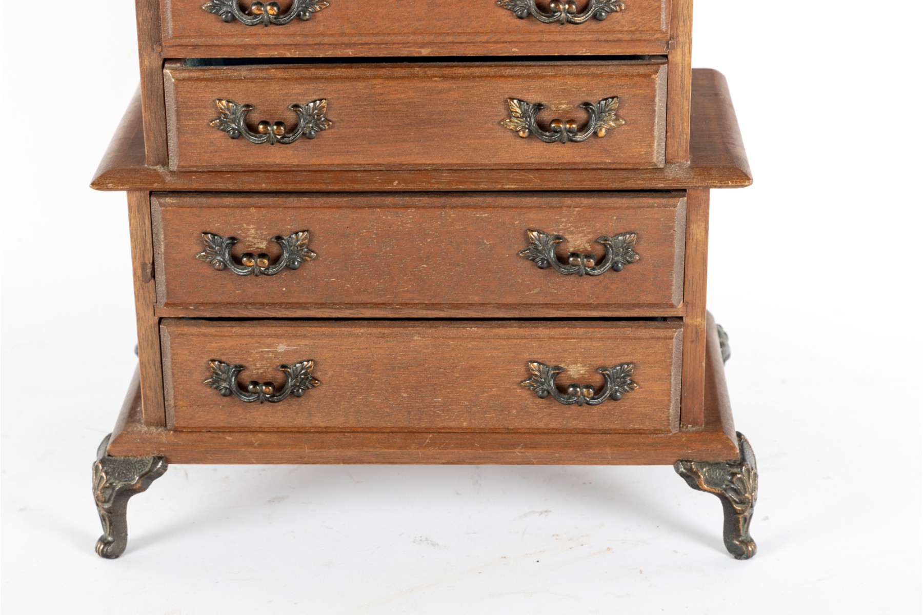 A salesman's sample style jewelry box in the form of a Colonial chest. Five drawers in total, all lined in blue velvet. The hinged top activates the music box and contains compartmental cubbies accompanied by a small vanity mirror.