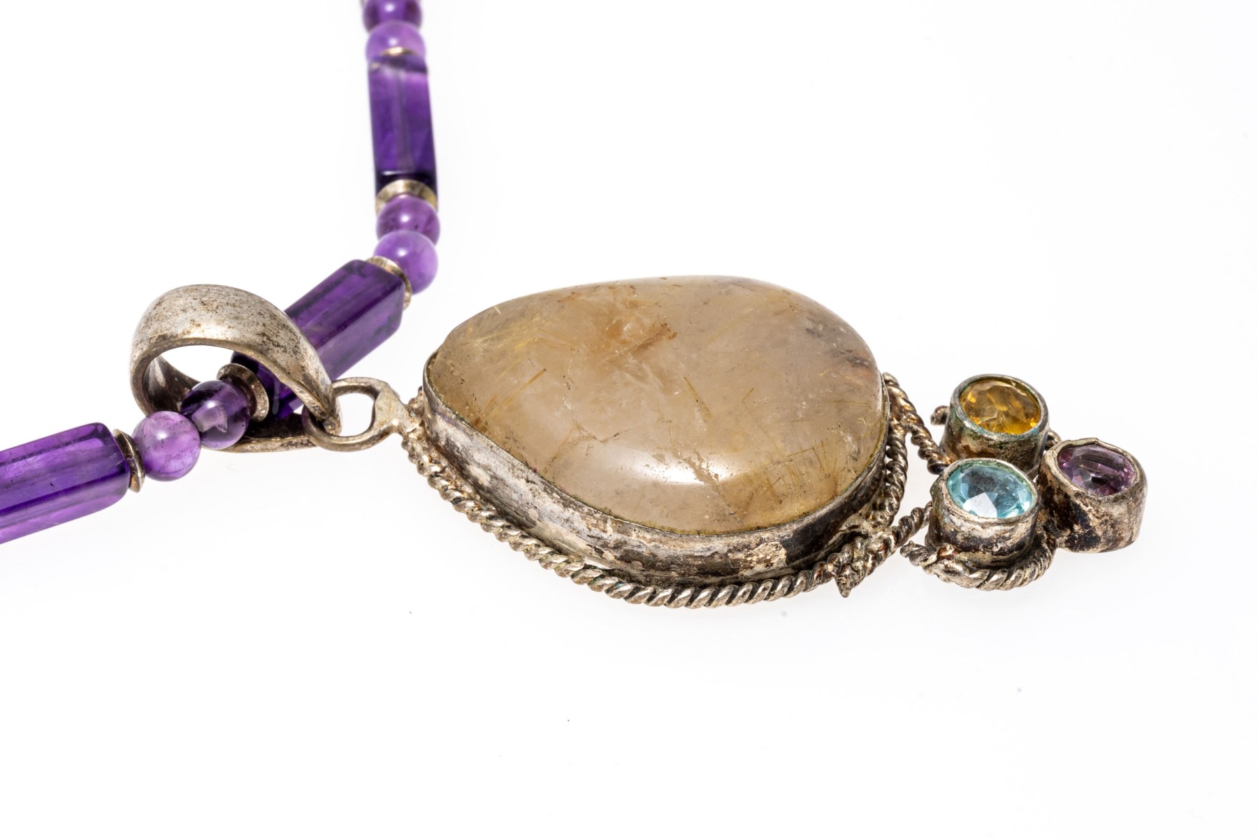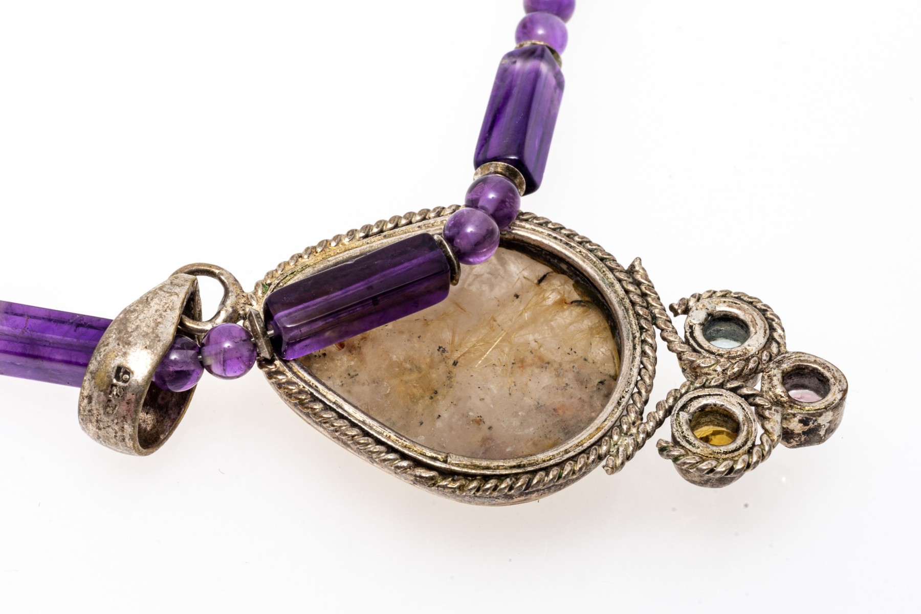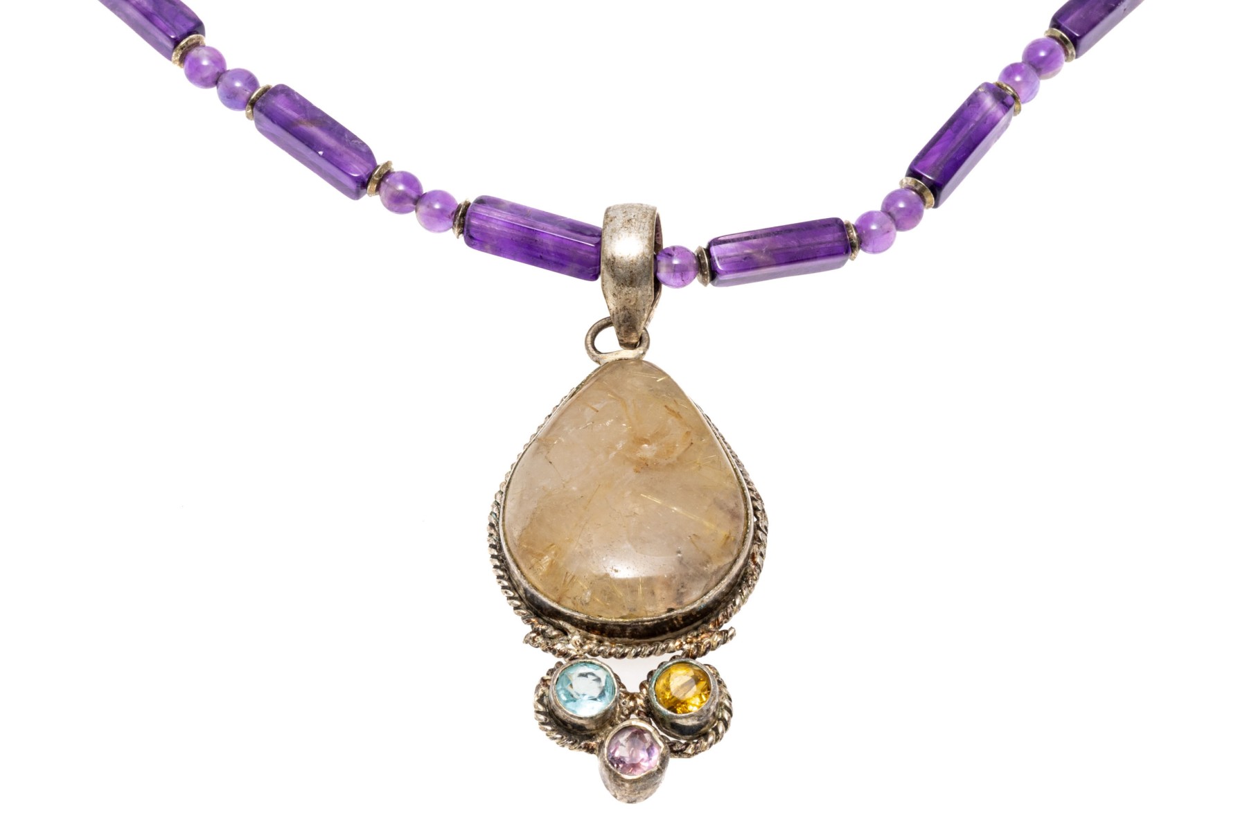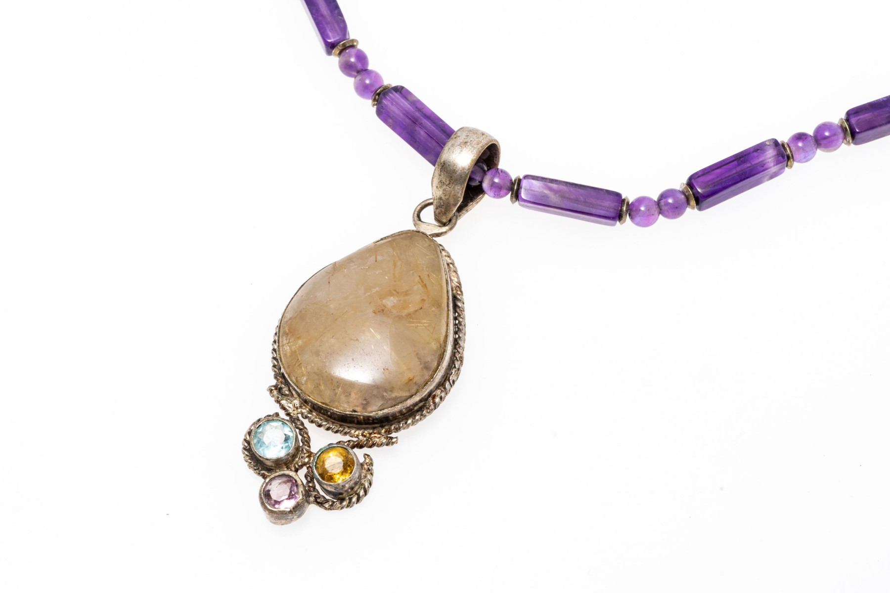 A necklace of strung amethyst beads with a fish hook clasp. Displayed on the necklace is a sterling silver pendant set with a pear cut rutilated quartz stone. Below the quartz are colorful cubic zirconia stones.