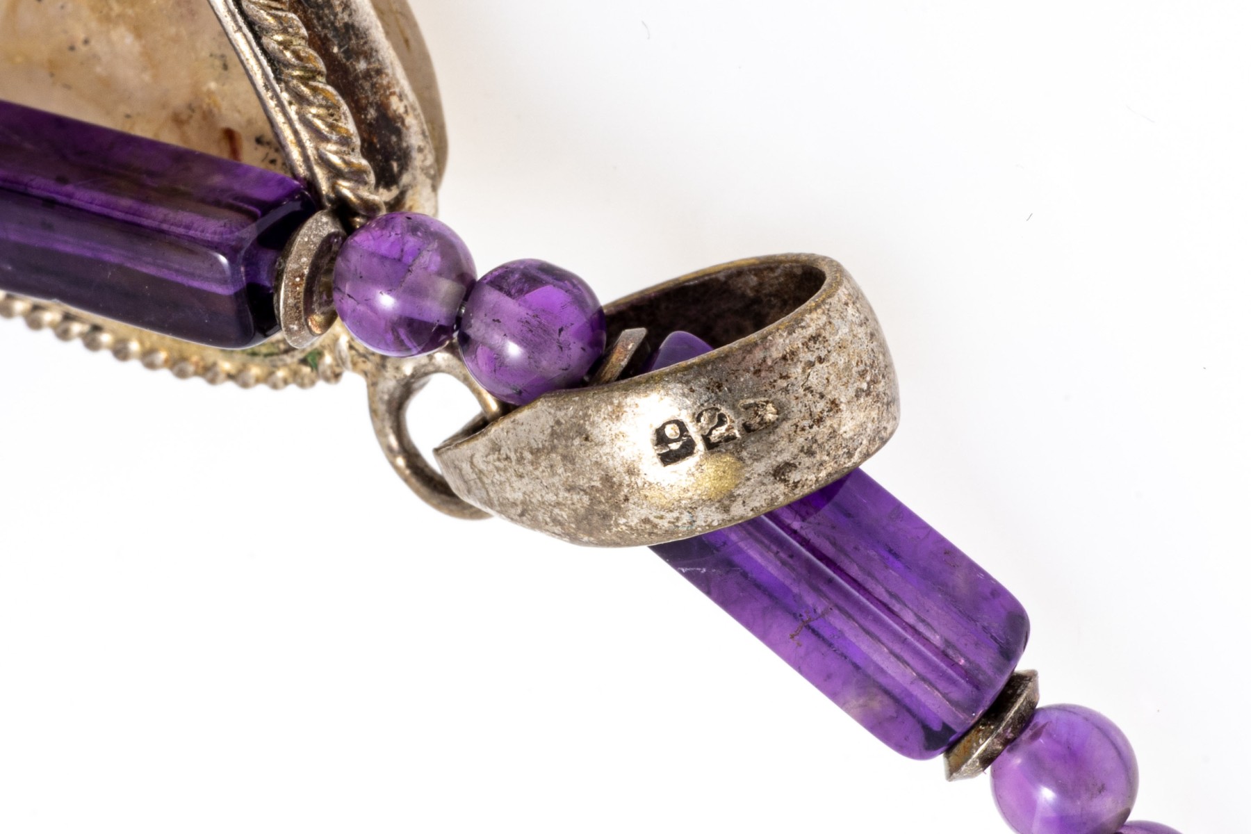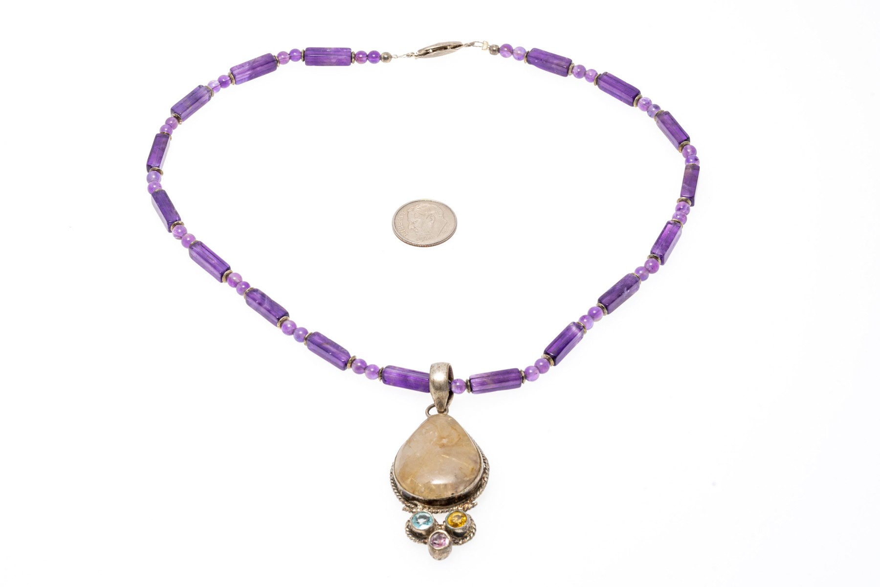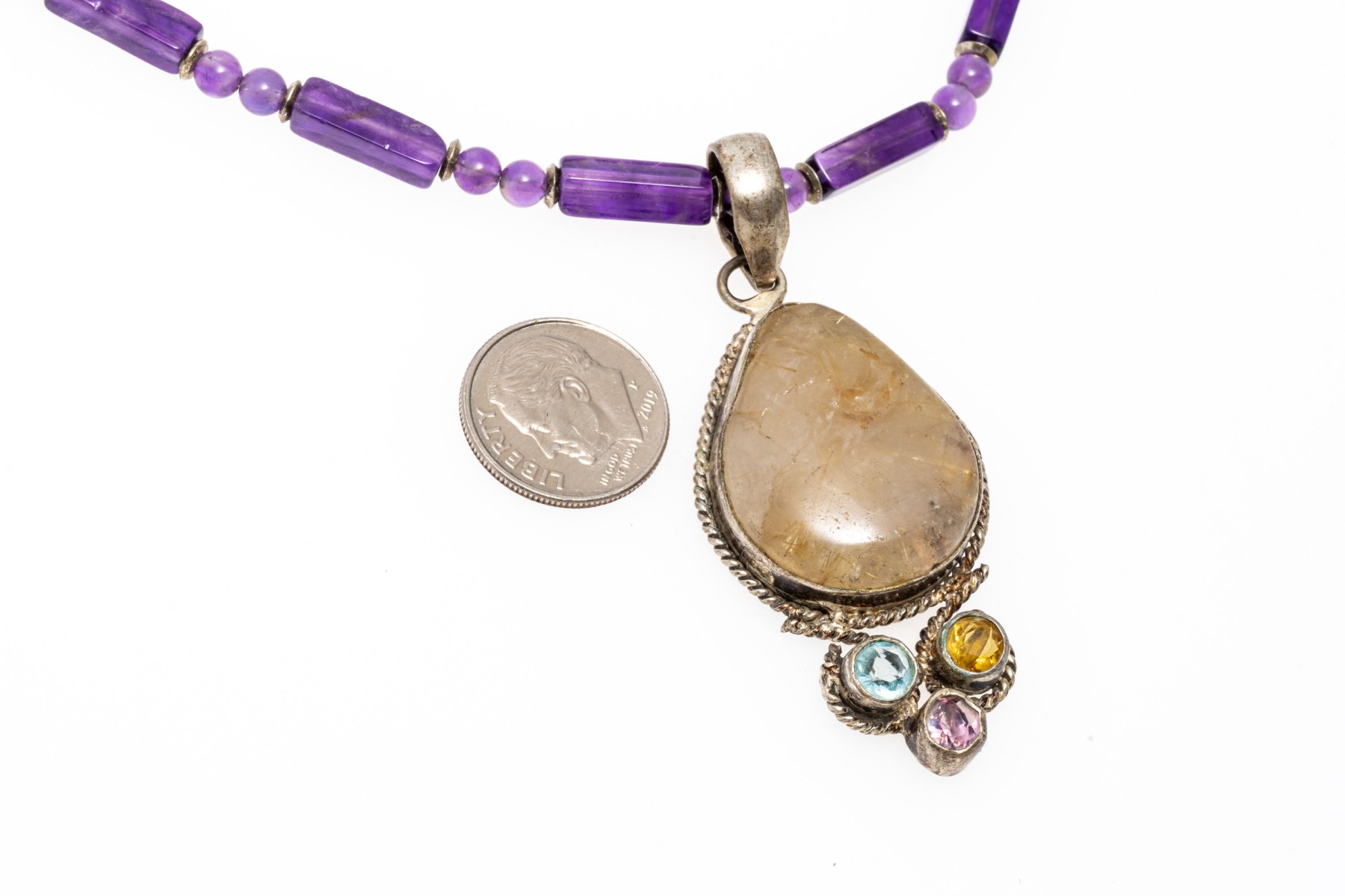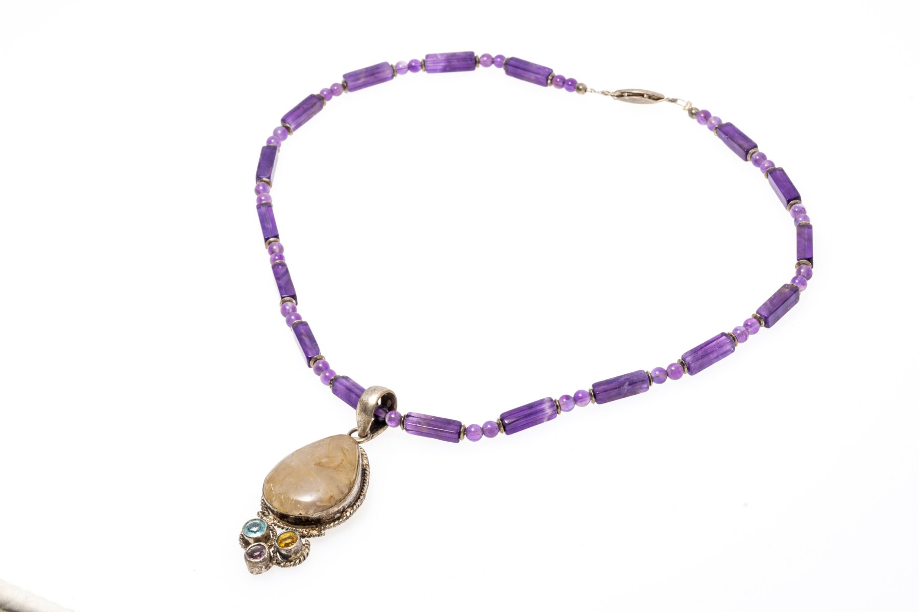 A necklace of strung amethyst beads with a fish hook clasp. Displayed on the necklace is a sterling silver pendant set with a pear cut rutilated quartz stone. Below the quartz are colorful cubic zirconia stones.