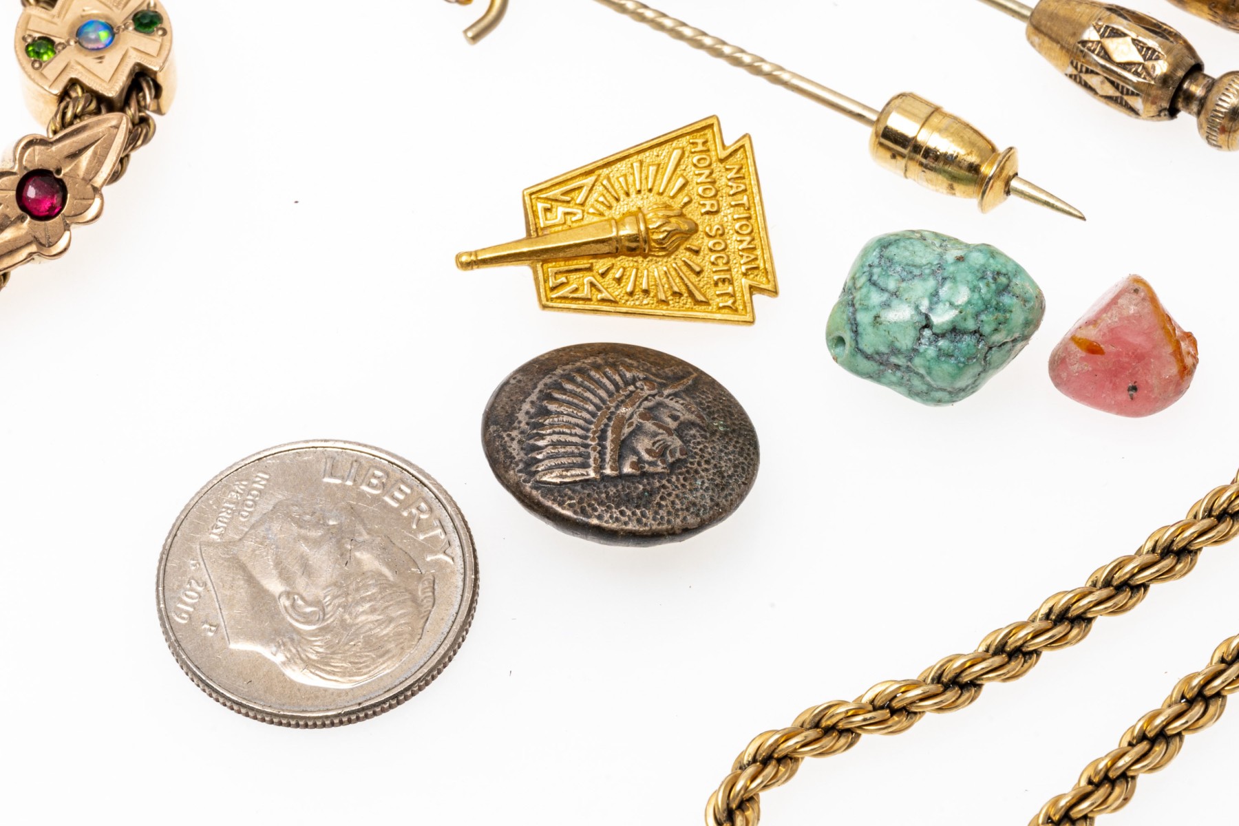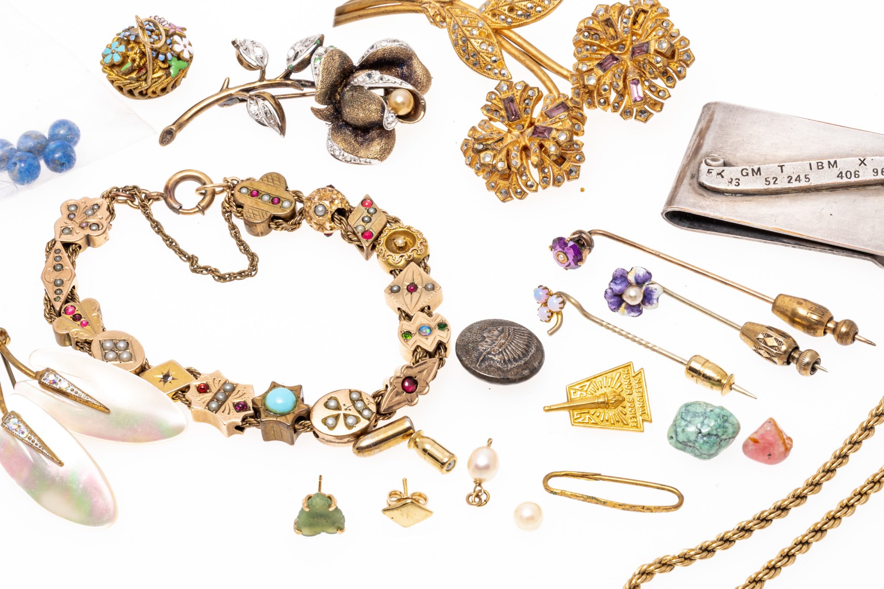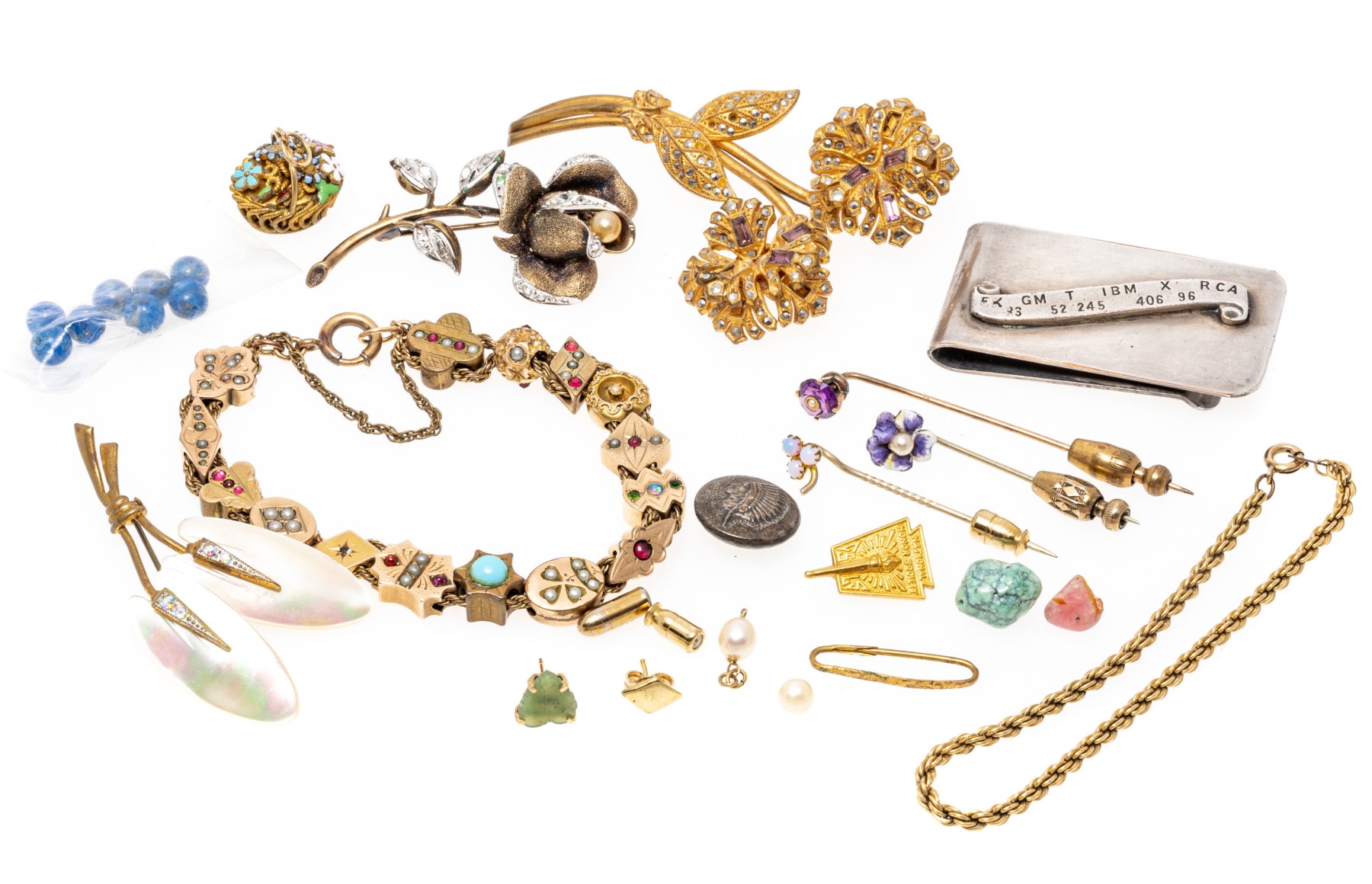 Collection of costume and gold filled jewelry. Bracelets, brooches and stick pins, cord necklace and loose beads.