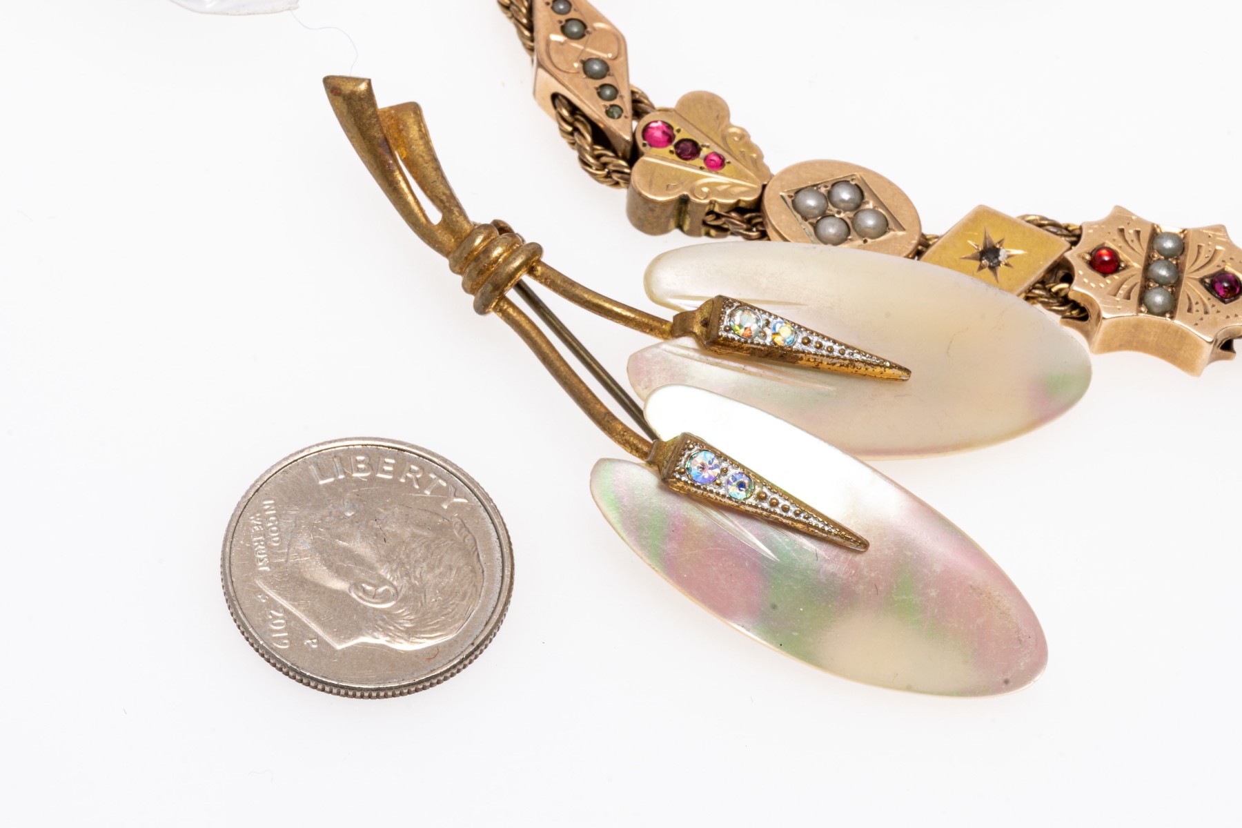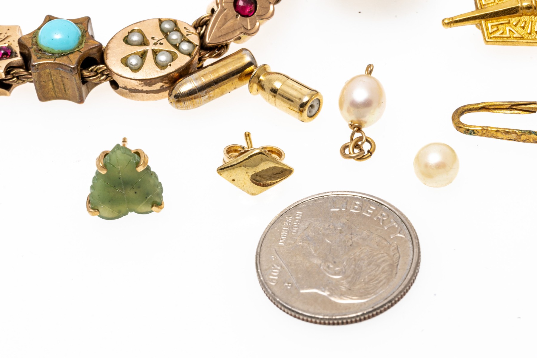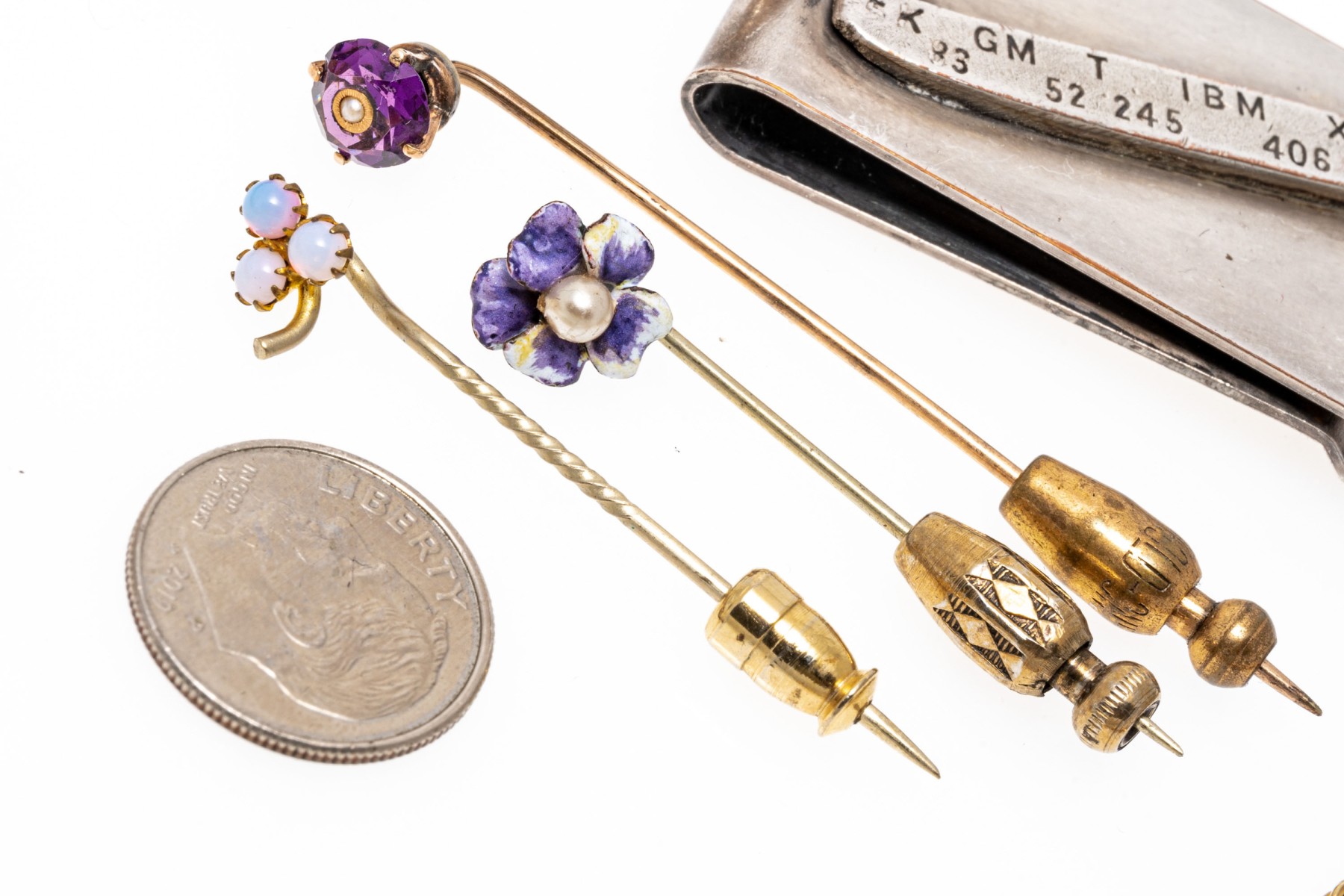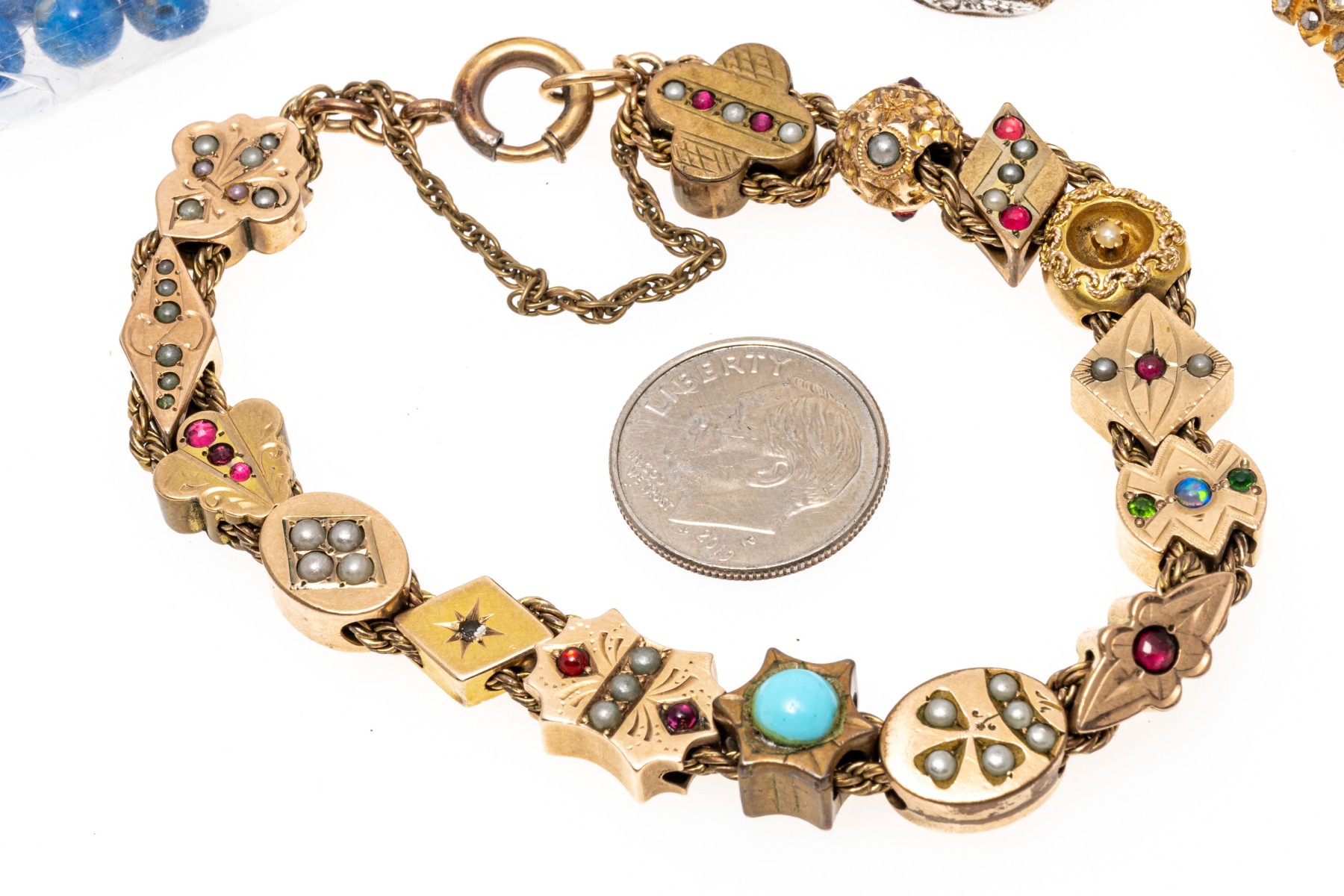 Collection of costume and gold filled jewelry. Bracelets, brooches and stick pins, cord necklace and loose beads.