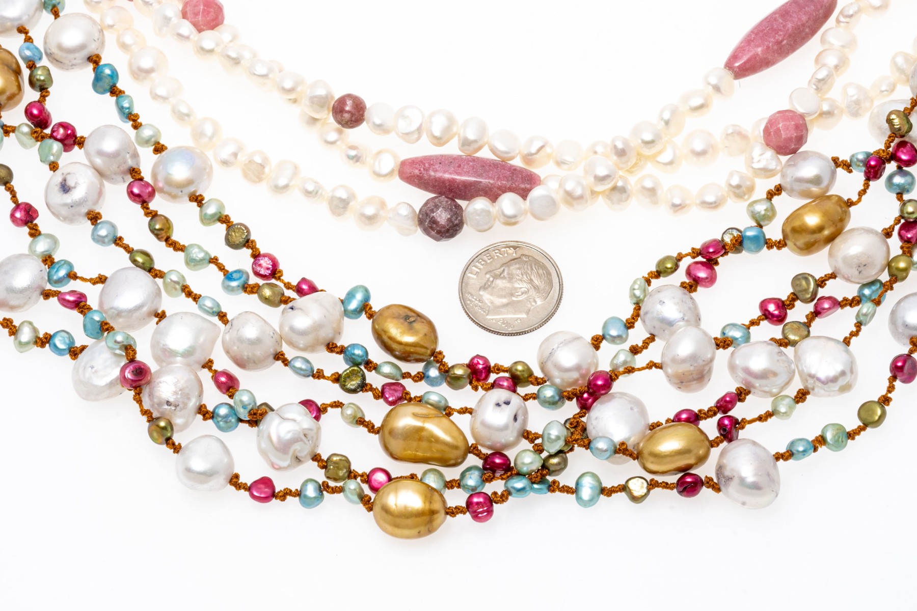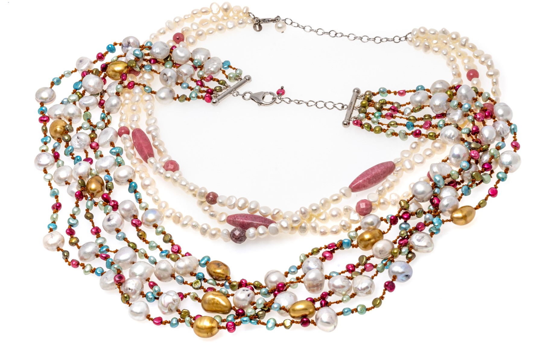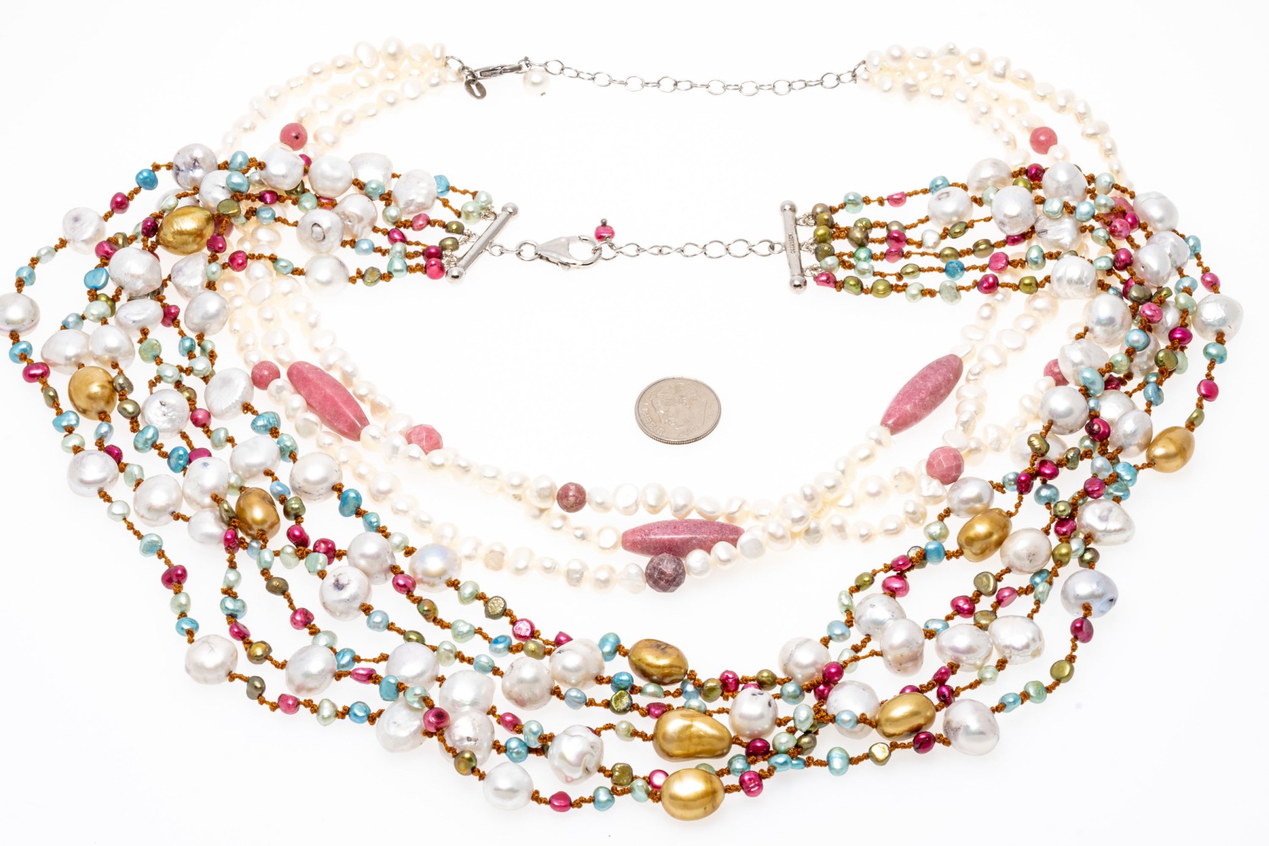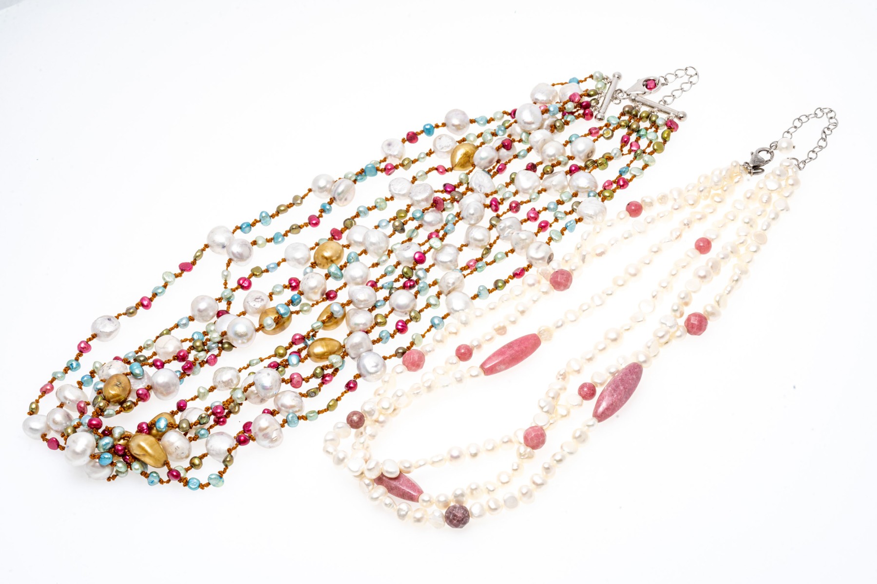 Colorful lot of two multi-strand of cultured freshwater necklaces, finished with sterling silver lobster claw style clasps