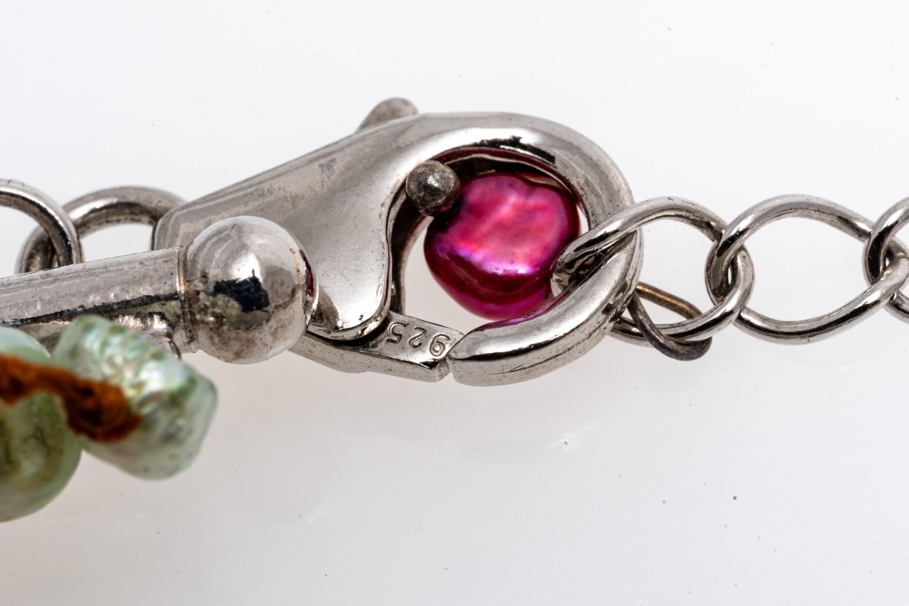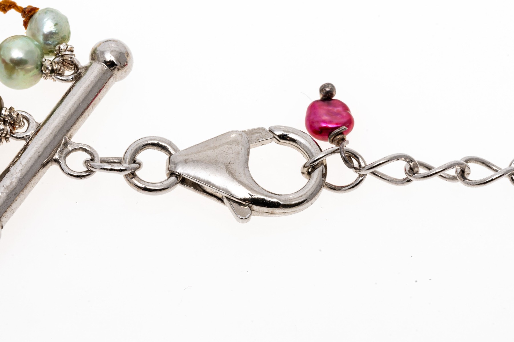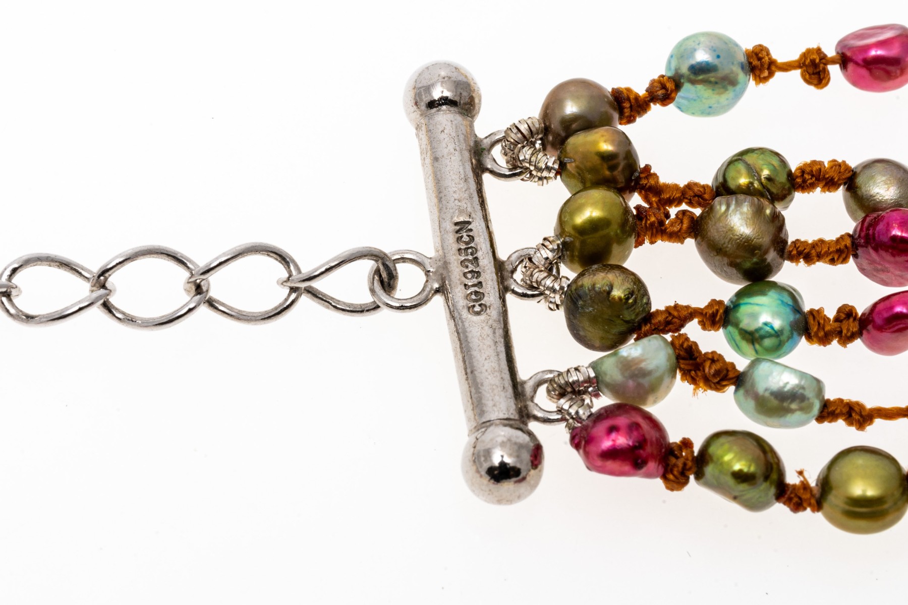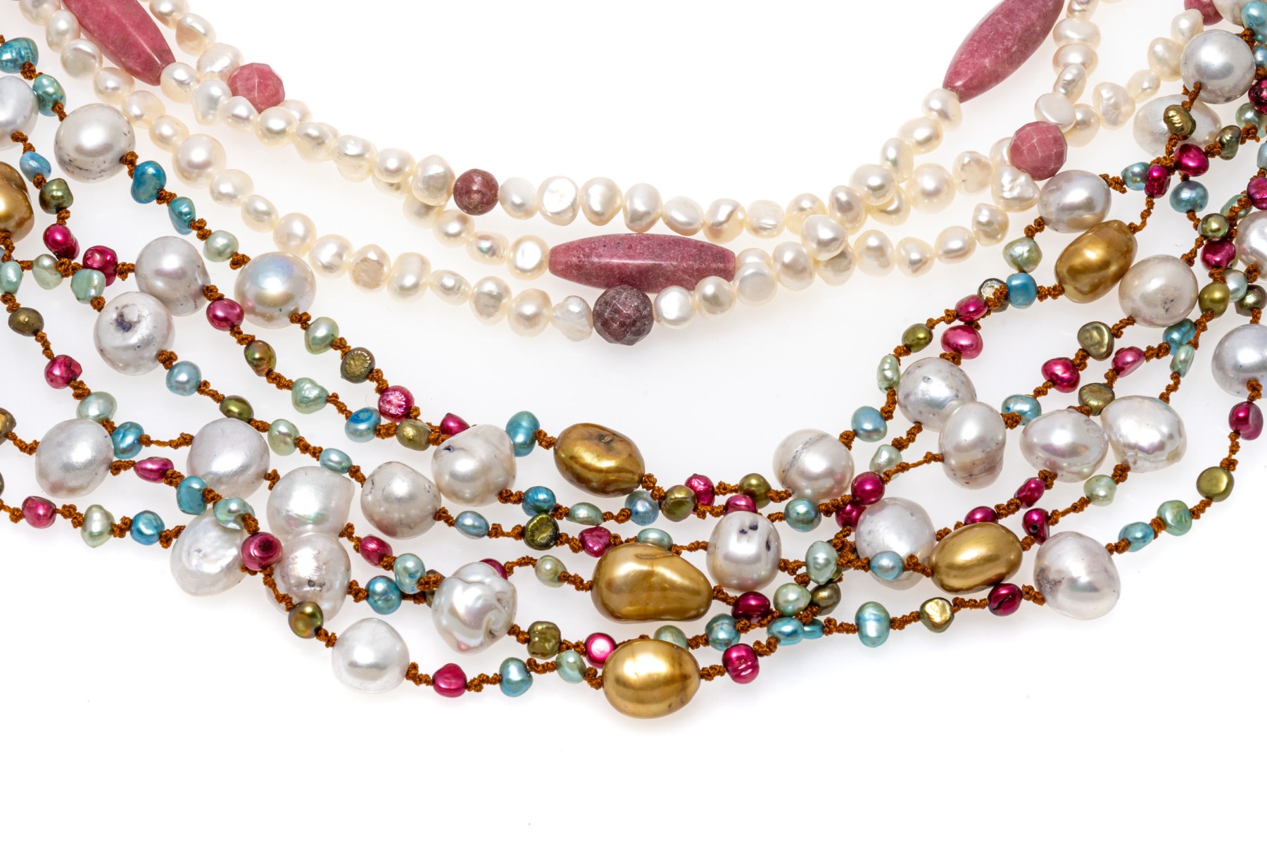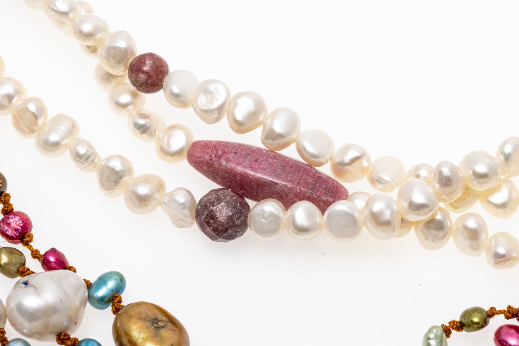 Colorful lot of two multi-strand of cultured freshwater necklaces, finished with sterling silver lobster claw style clasps