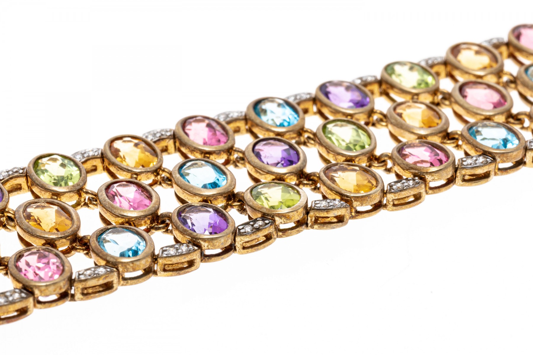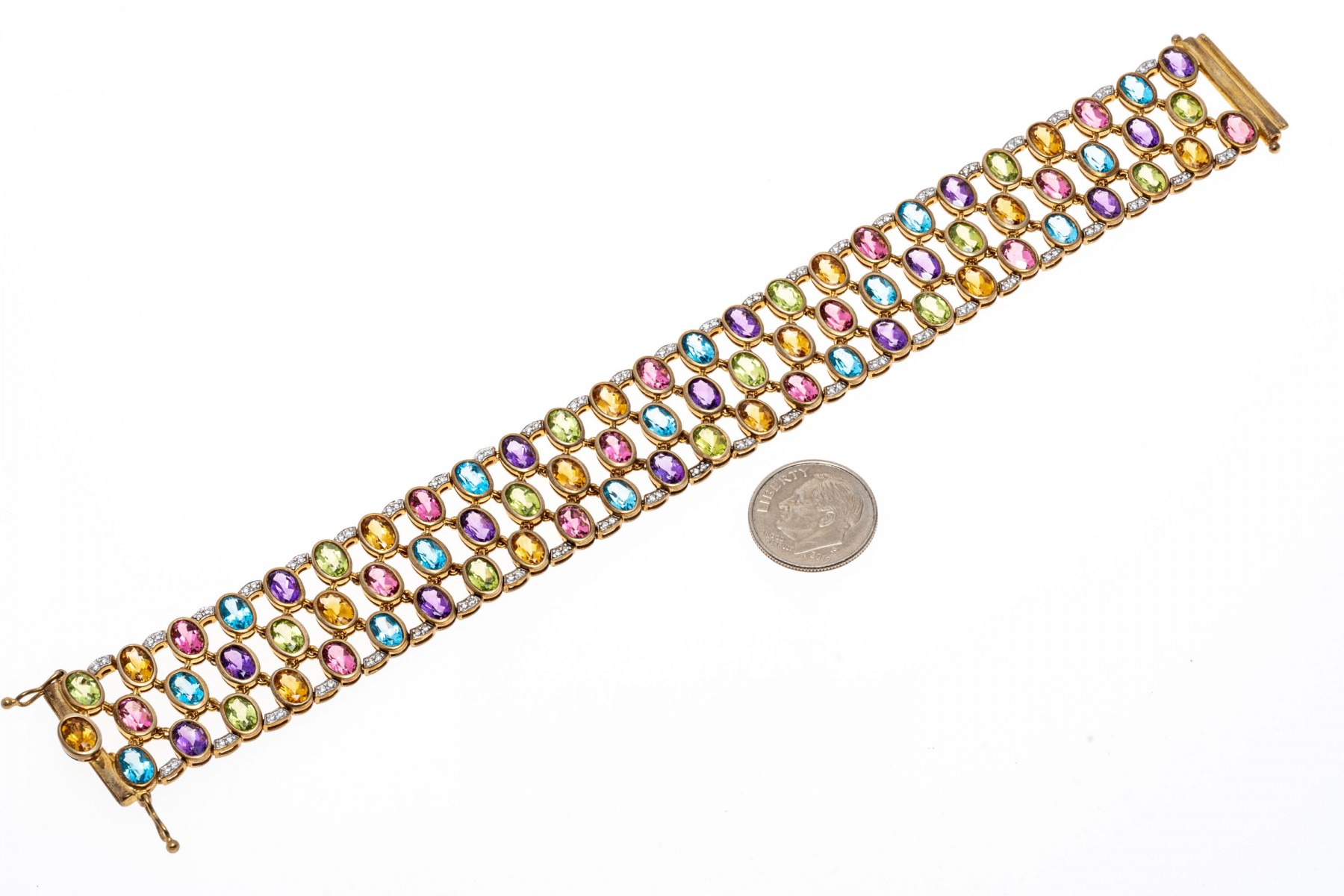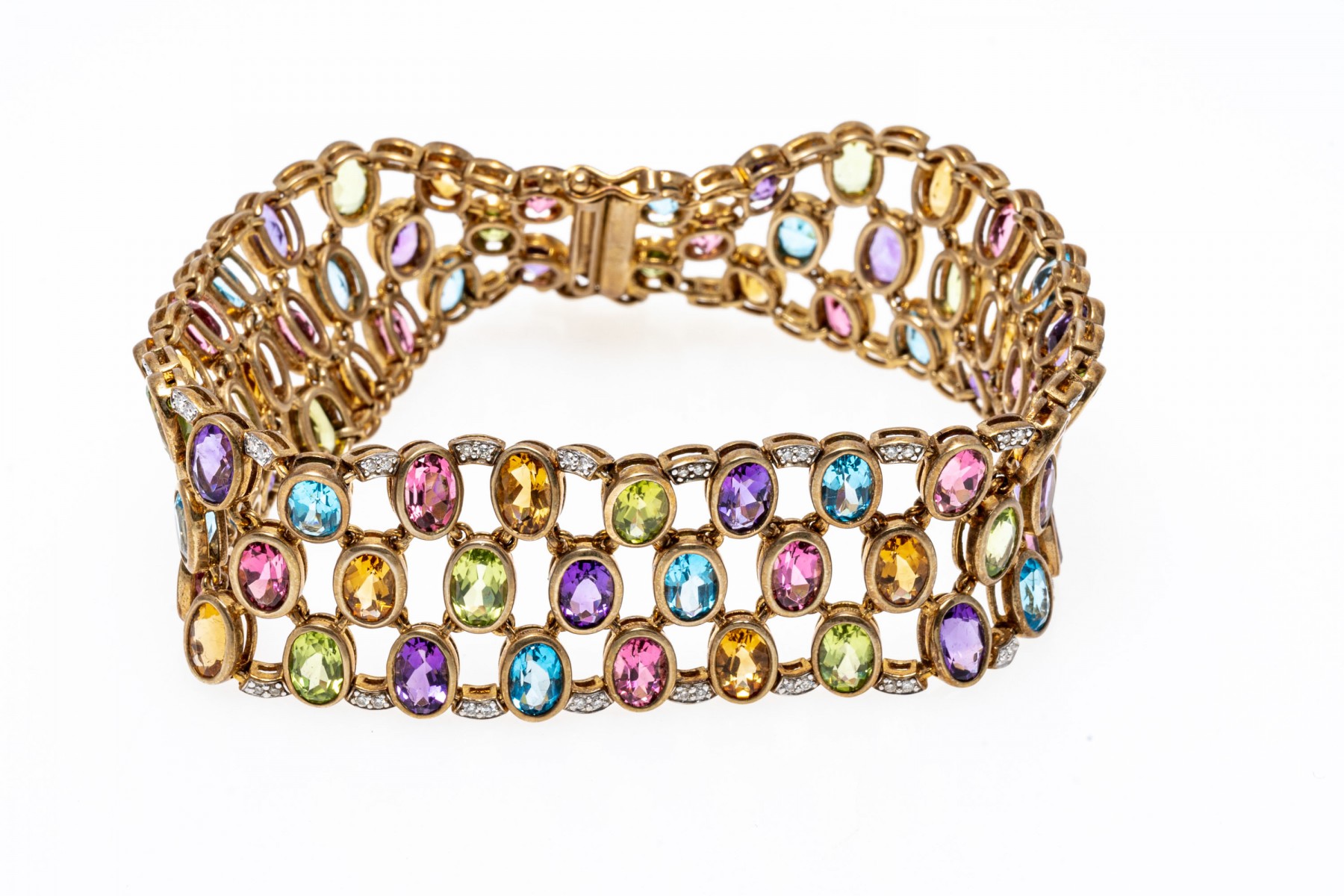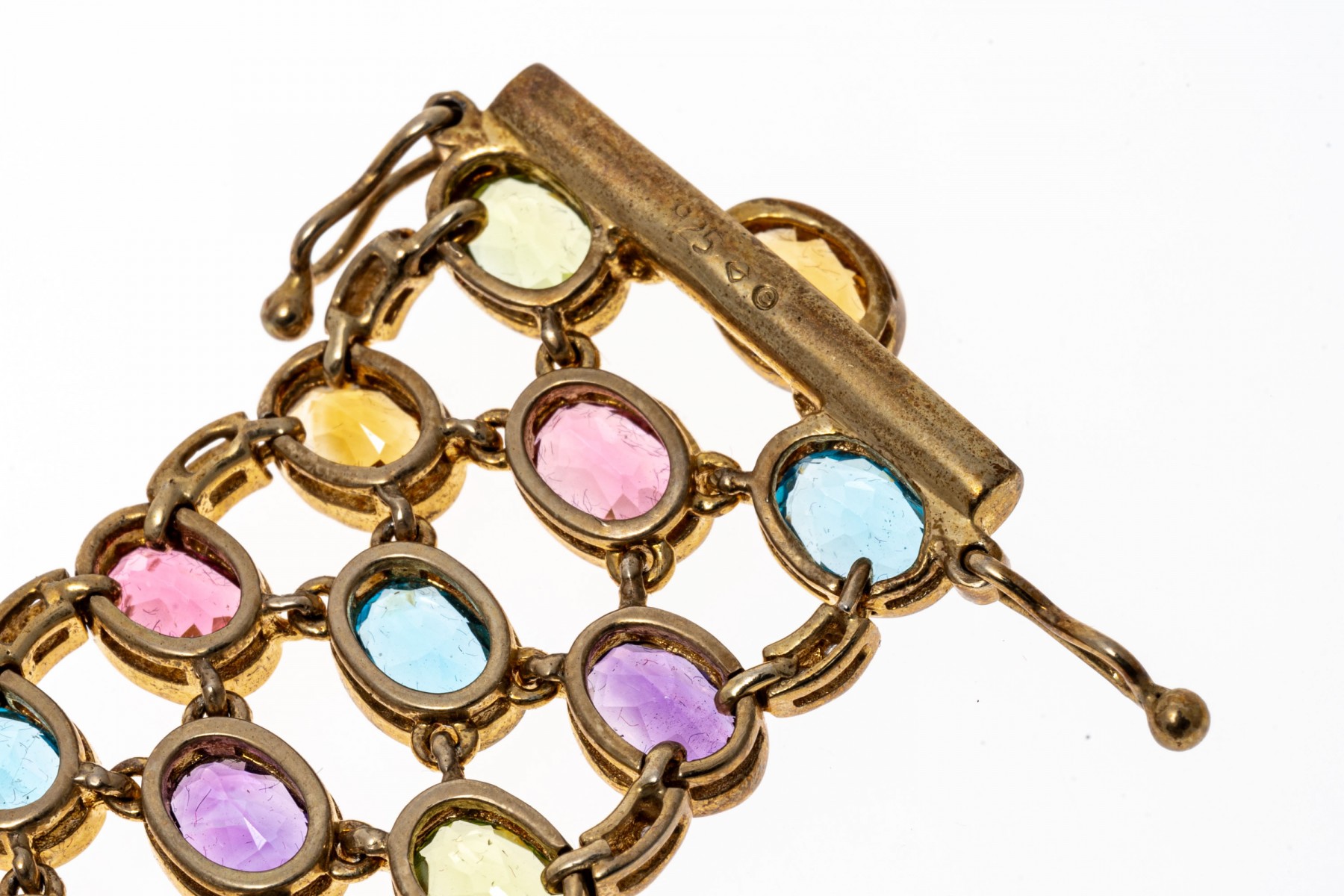 Colorful multi-stone sterling silver bracelet. Bezel set stones link together over the facet of this vermeil bracelet. Stones of citrines (approximately 5.25 TCW), amethyst (approximately 5.25 TCW), topaz (approximately 7.2 TCW), peridot (approximately 6.75 TCW), and pink tourmaline (approximately 6.15 TCW). A pin and two safety latch style clasp secures the bracelet.