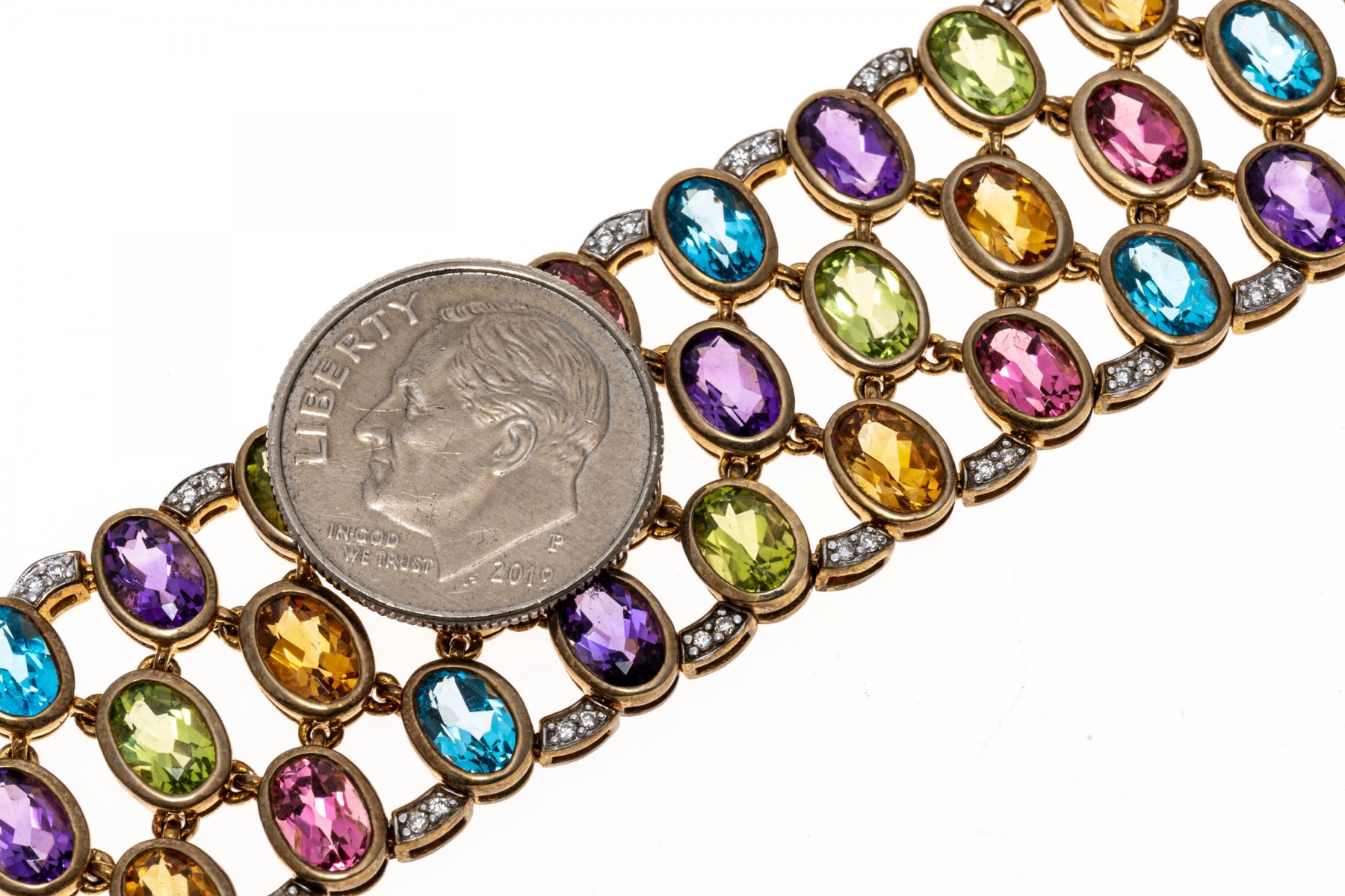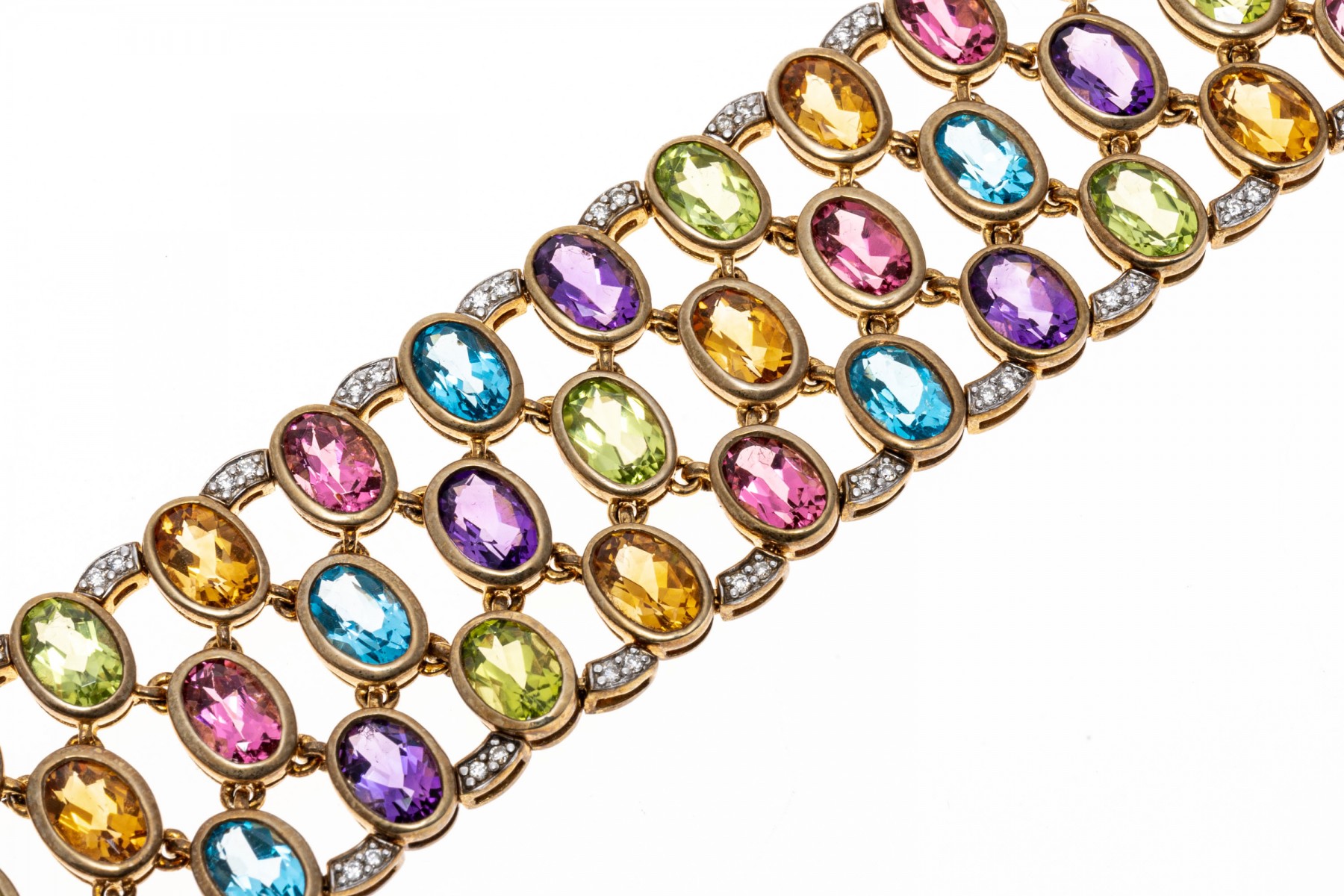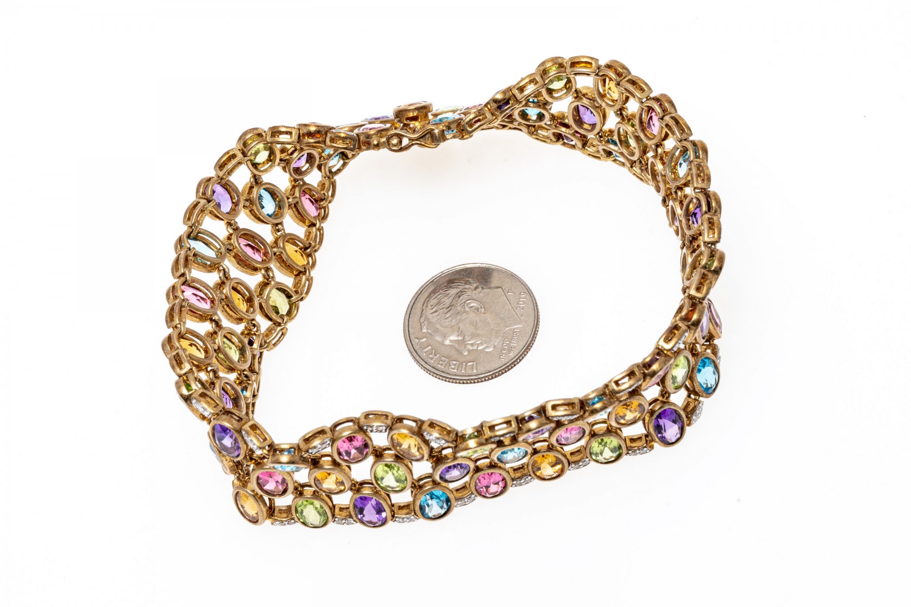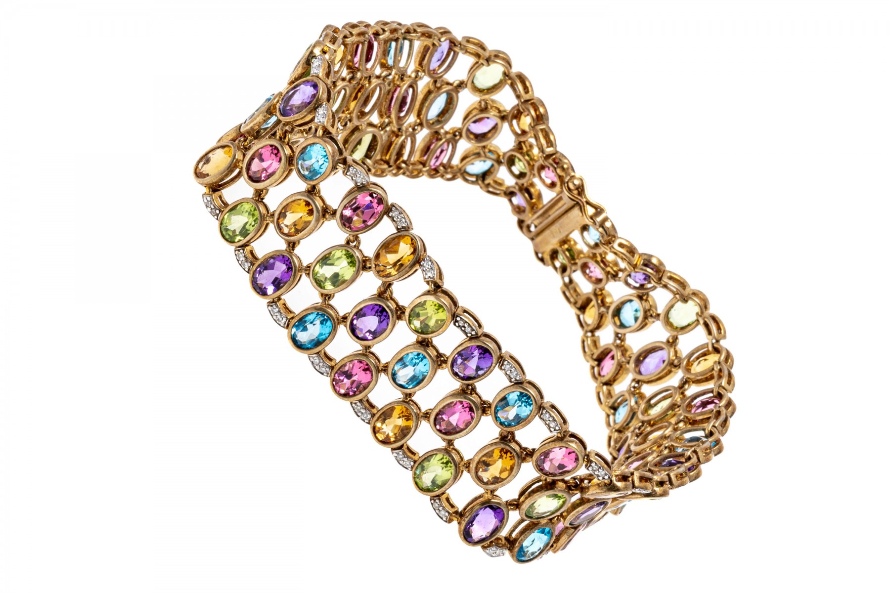 Colorful multi-stone sterling silver bracelet. Bezel set stones link together over the facet of this vermeil bracelet. Stones of citrines (approximately 5.25 TCW), amethyst (approximately 5.25 TCW), topaz (approximately 7.2 TCW), peridot (approximately 6.75 TCW), and pink tourmaline (approximately 6.15 TCW). A pin and two safety latch style clasp secures the bracelet.
