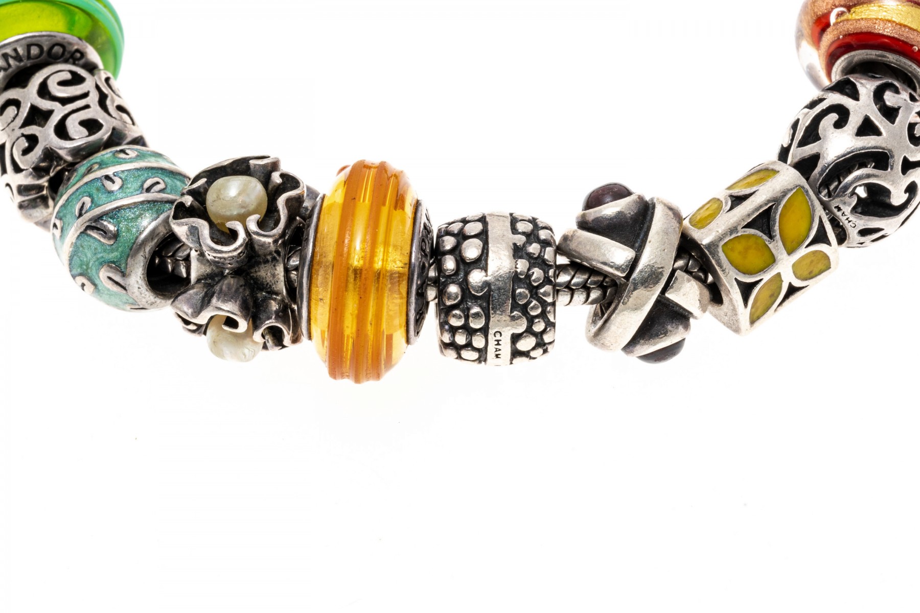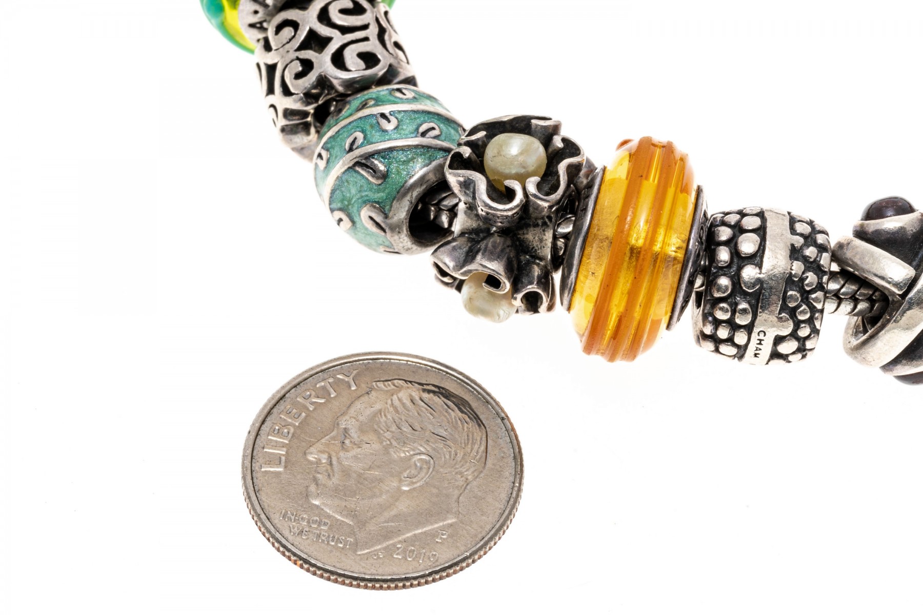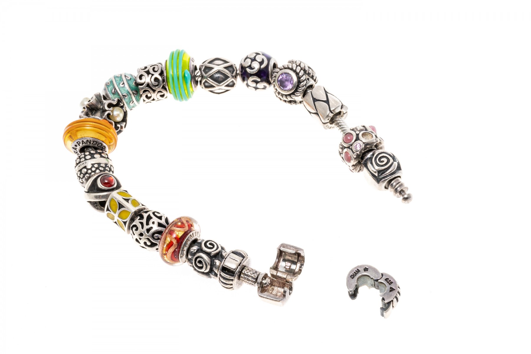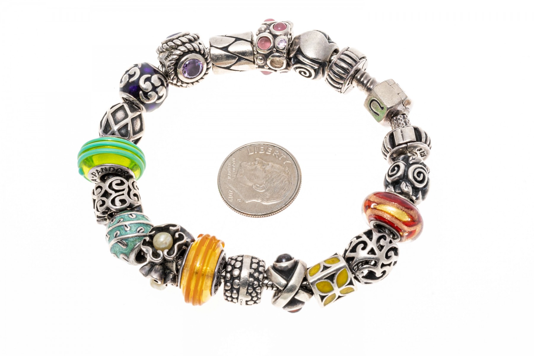 Sterling silver bracelet. Strung over the bracelet are various colorful beads. Ball latch style clasp.