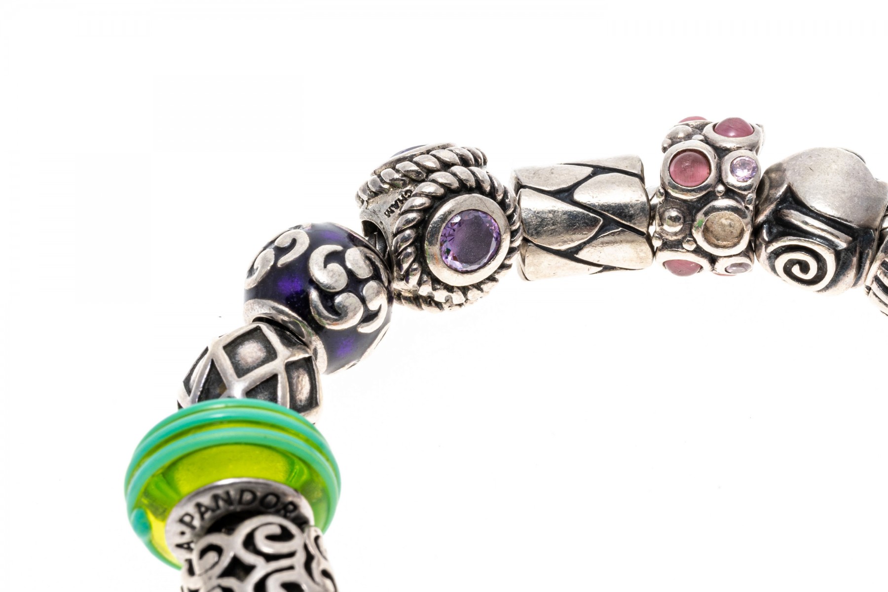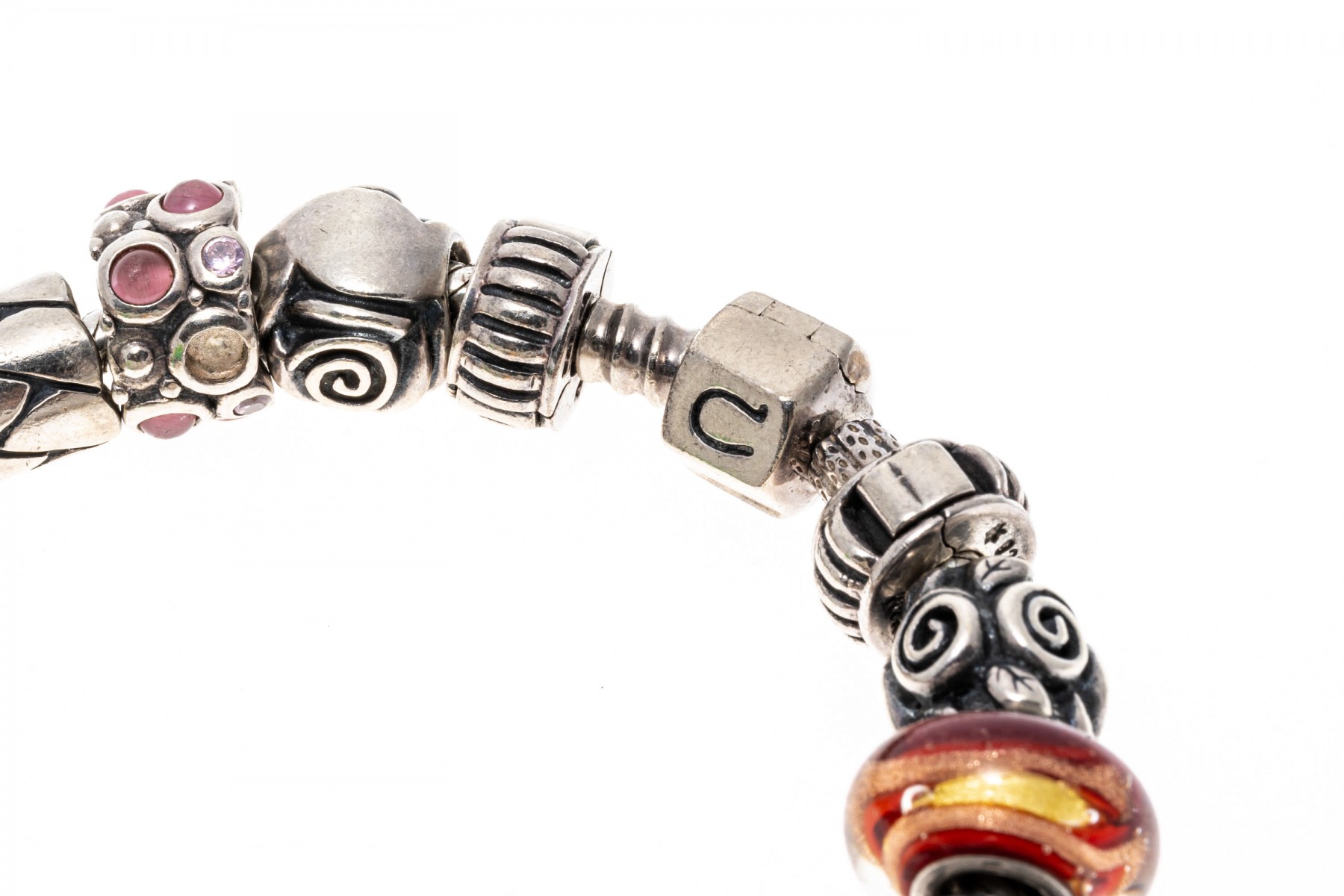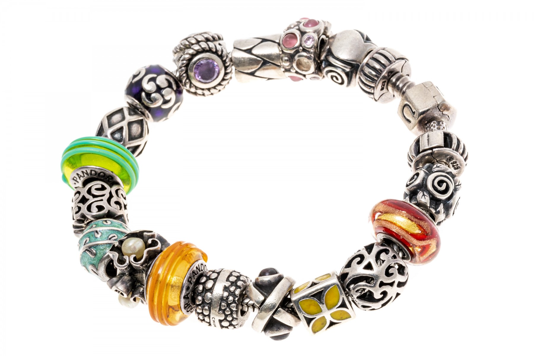 Sterling silver bracelet. Strung over the bracelet are various colorful beads. Ball latch style clasp.