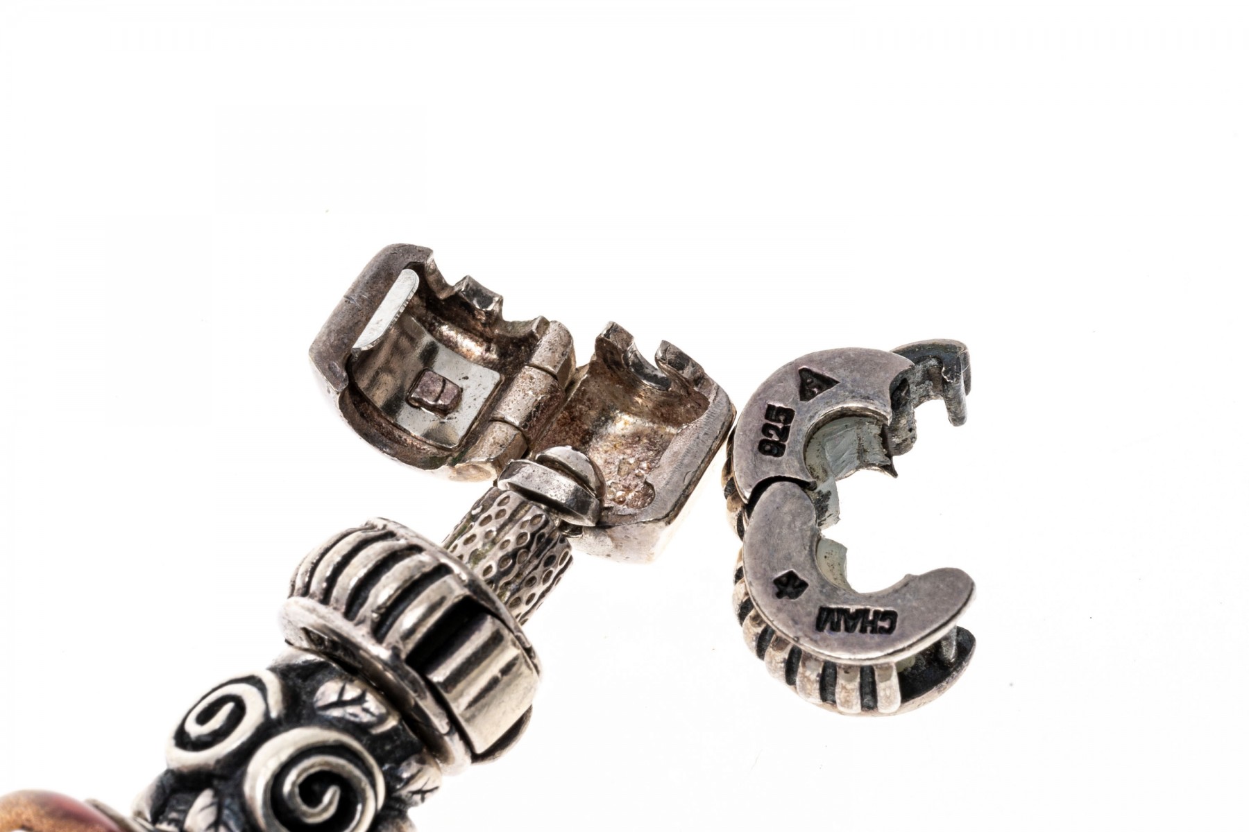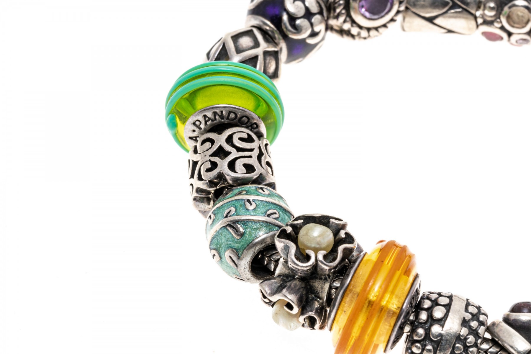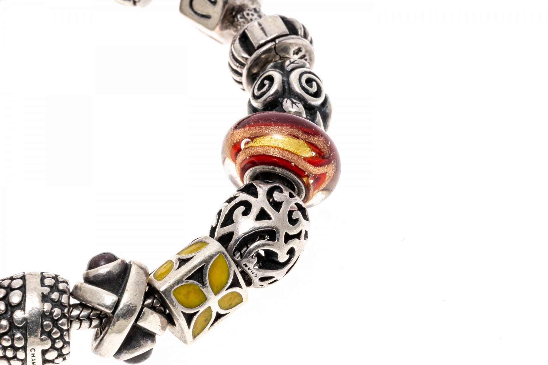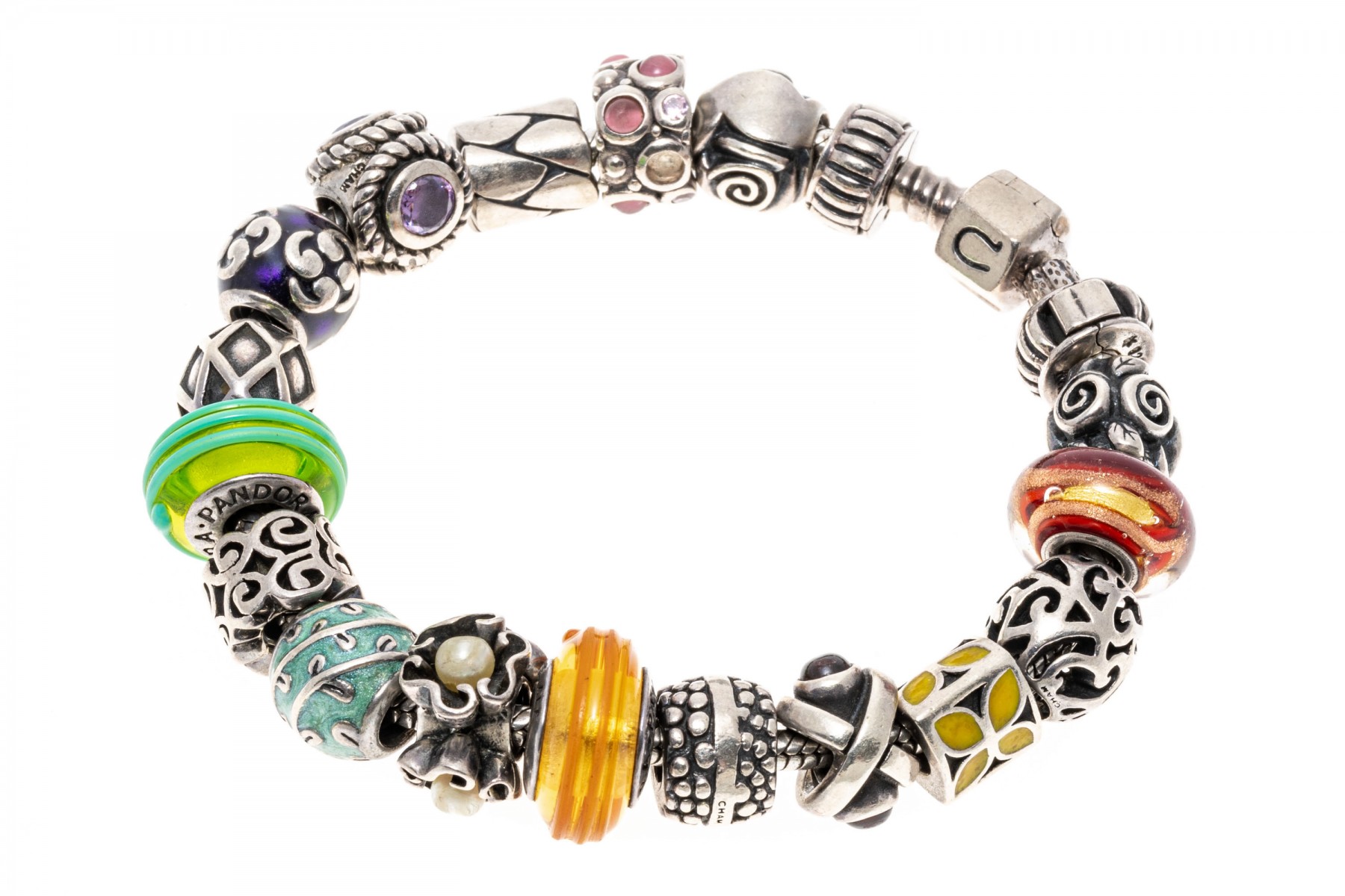 Sterling silver bracelet. Strung over the bracelet are various colorful beads. Ball latch style clasp.