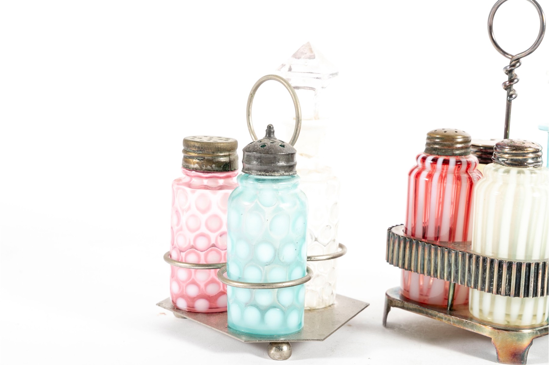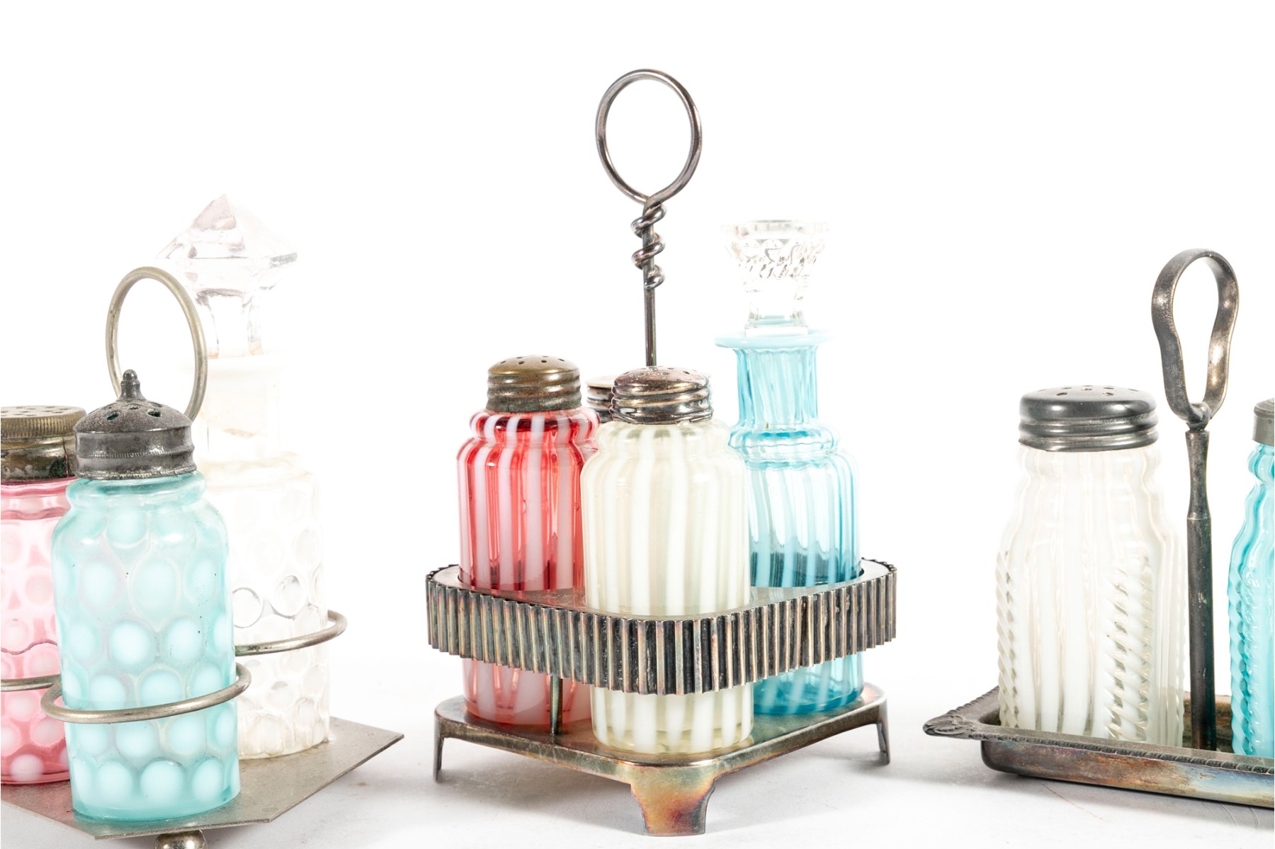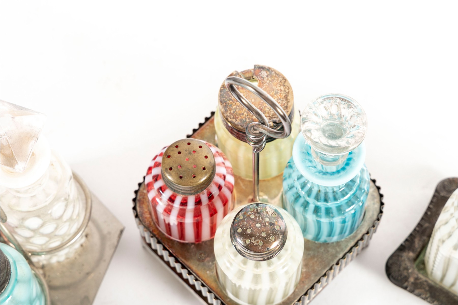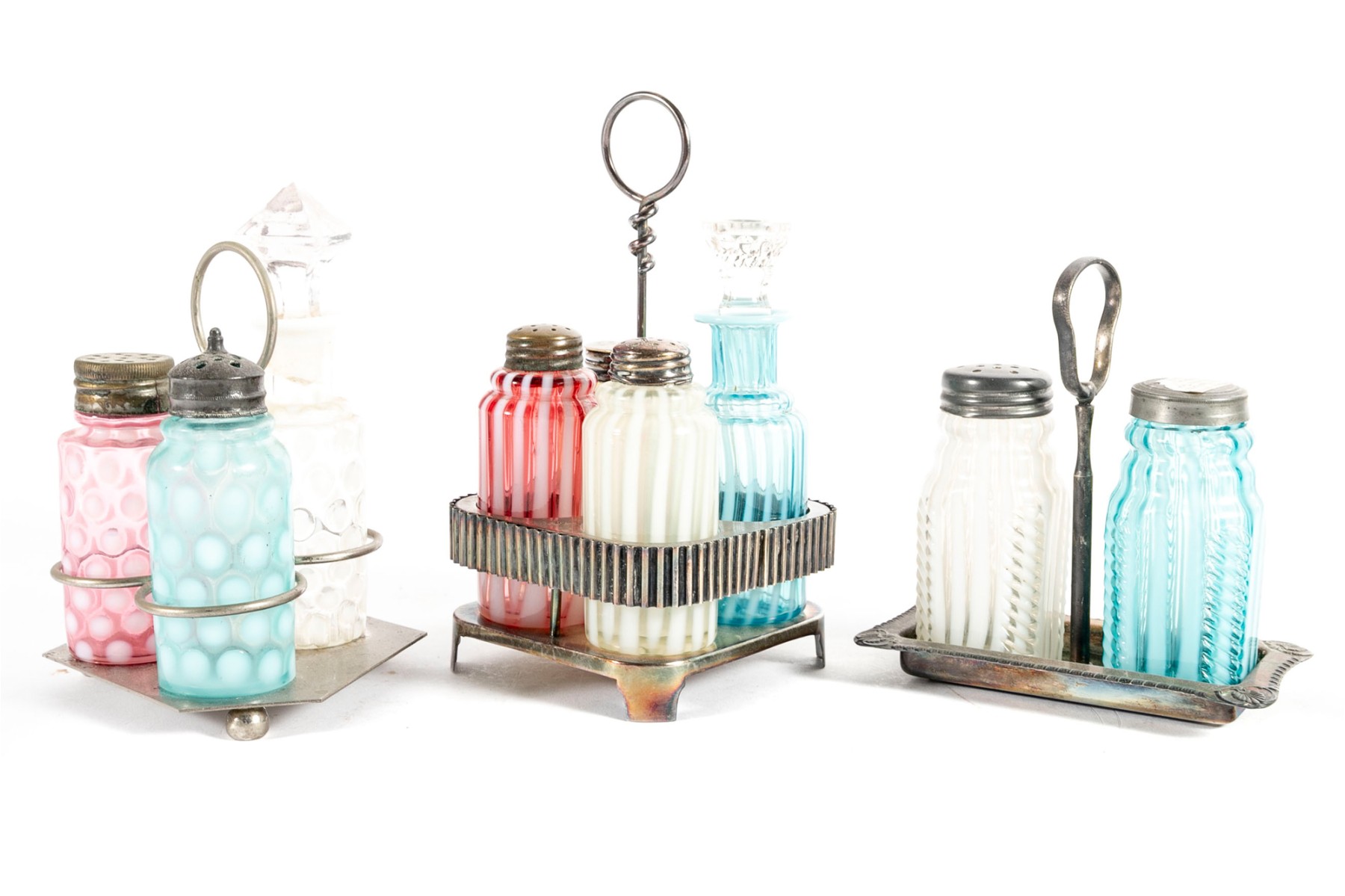 A fabulous group of three depression glass cruet sets on silverplated stands. Pieces come in blue, white, yellow, and cranberry, and are patterned with stripes and coin spots.