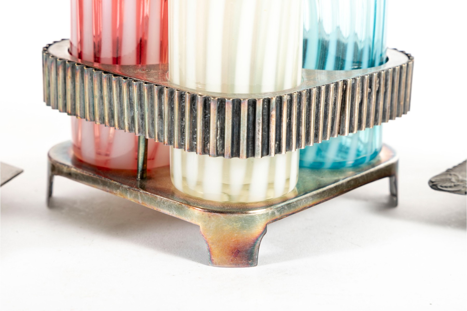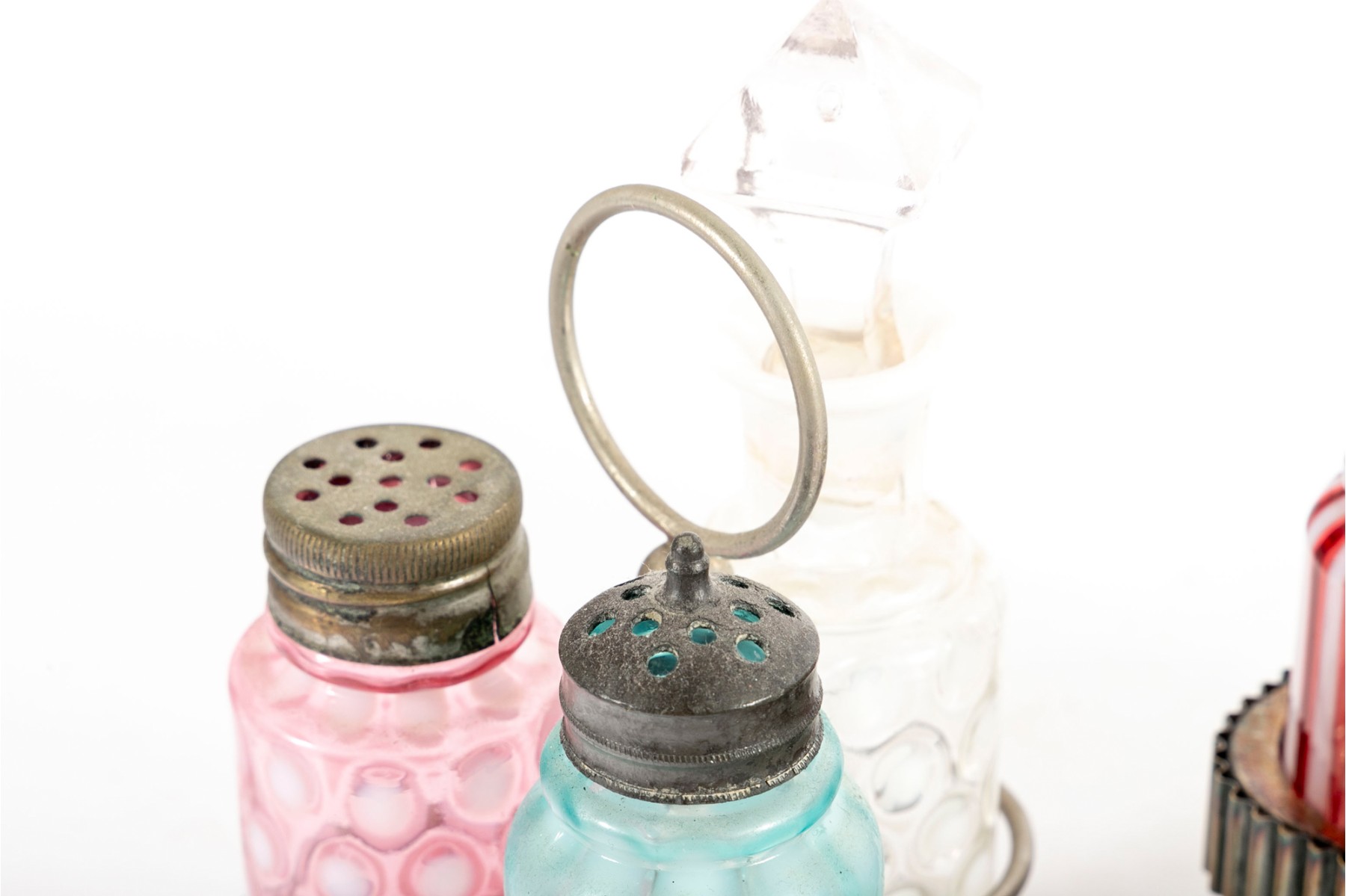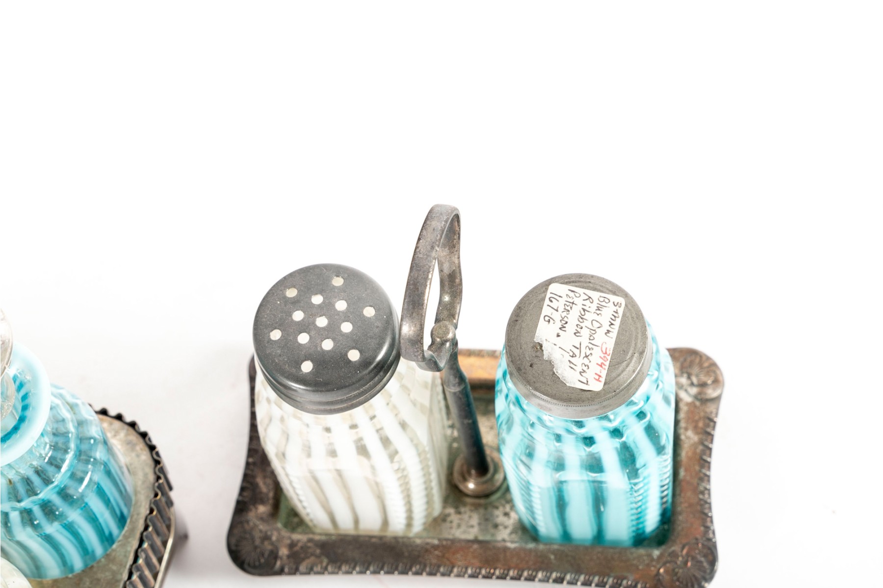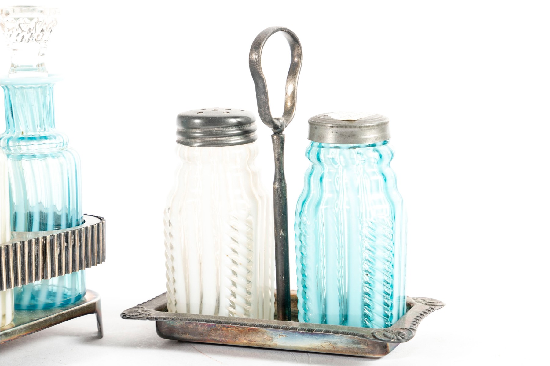 A fabulous group of three depression glass cruet sets on silverplated stands. Pieces come in blue, white, yellow, and cranberry, and are patterned with stripes and coin spots.