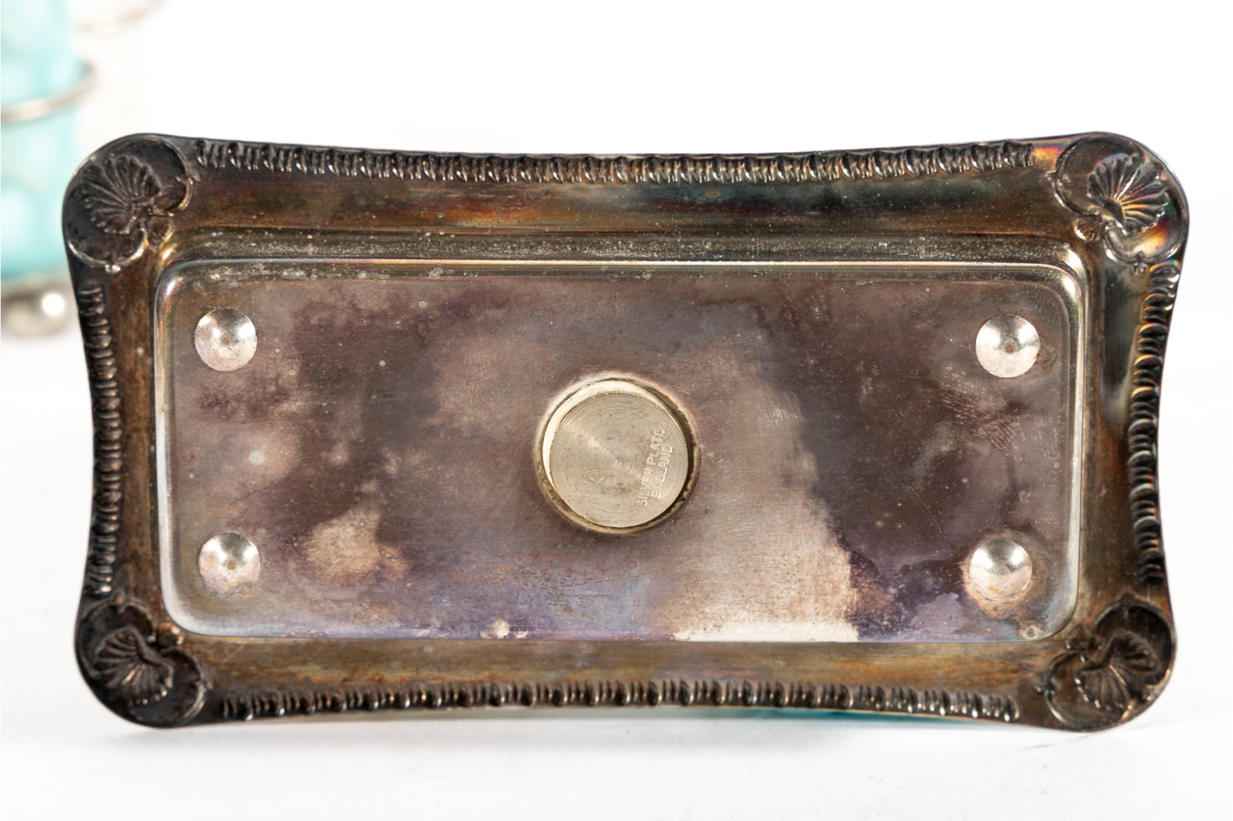 Displays well minor general wear. Chipped wear to the bottoms of the decanter stoppers. Tarnishing and metal wear to the lids, including some metal splitting around the threading.