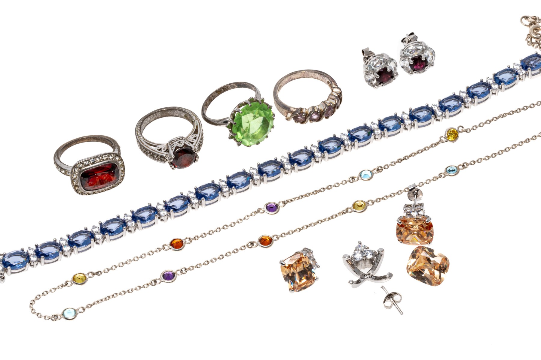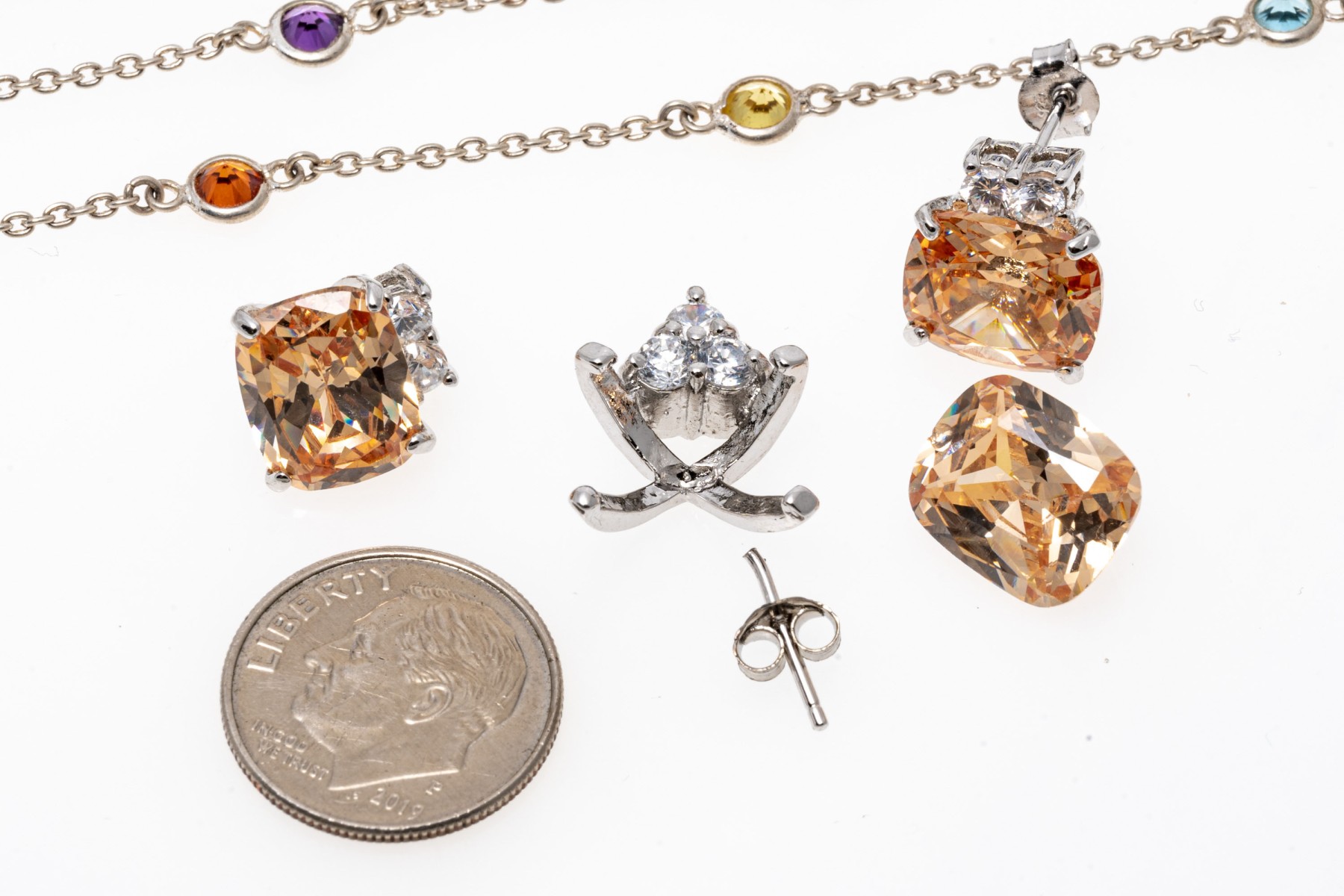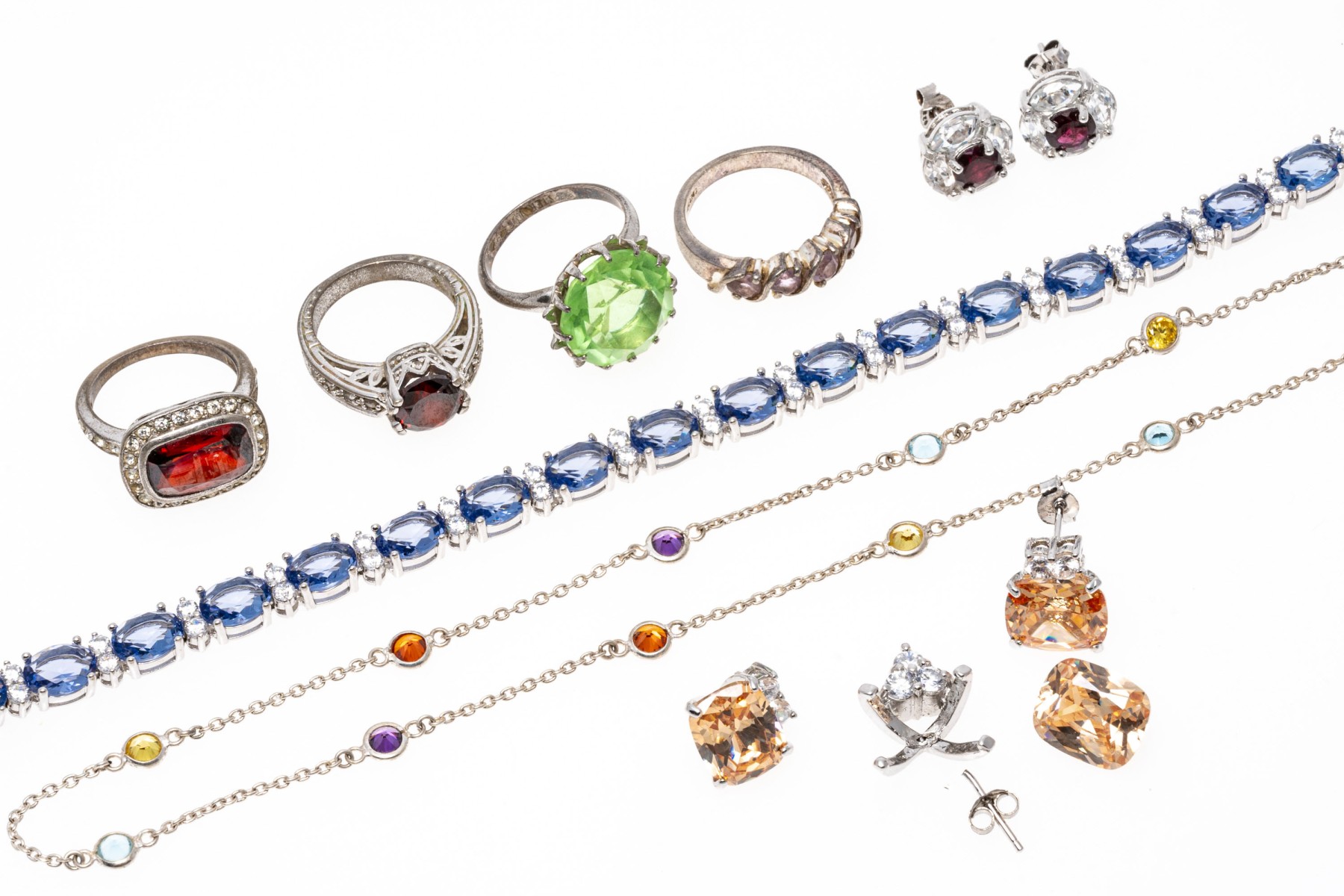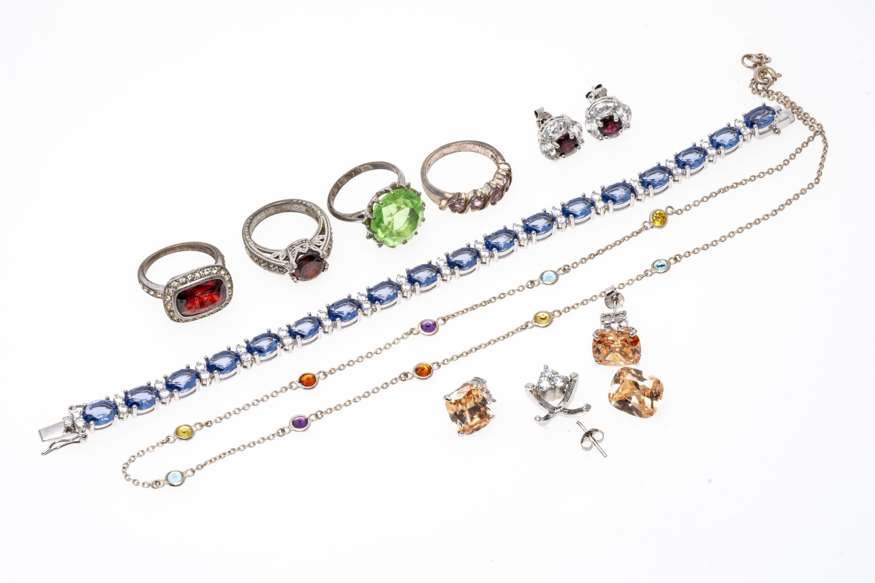 Collection of sterling silver jewelry set with colorful cubic zirconia stones. Necklace, bracelet, earrings and rings. Ring sizes 6, 6.75, 7 and 6.