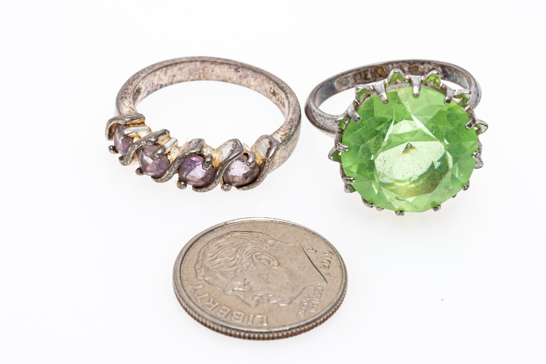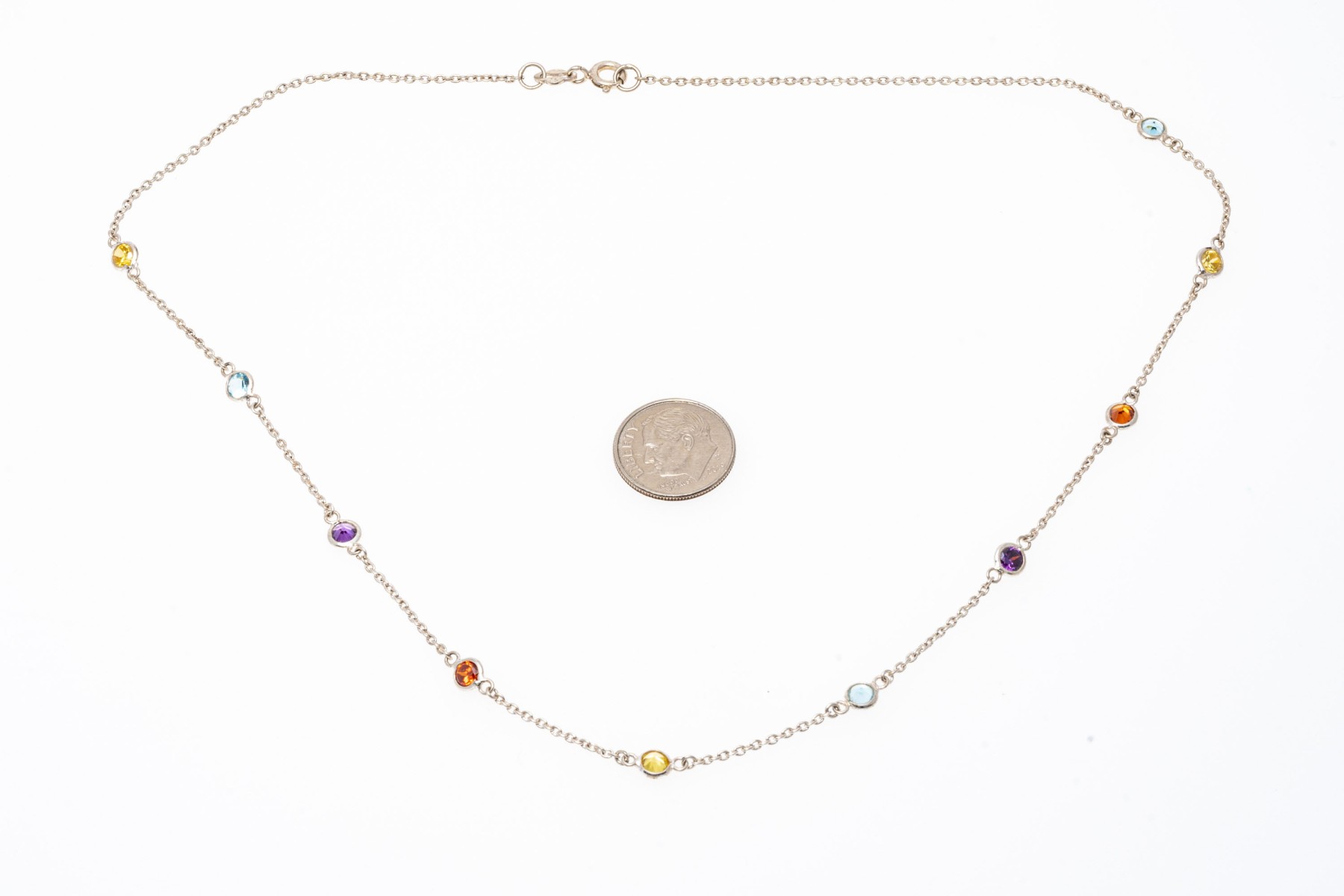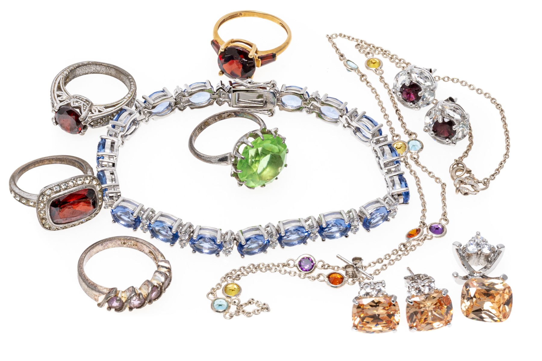 Collection of sterling silver jewelry set with colorful cubic zirconia stones. Necklace, bracelet, earrings and rings. Ring sizes 6, 6.75, 7 and 6.