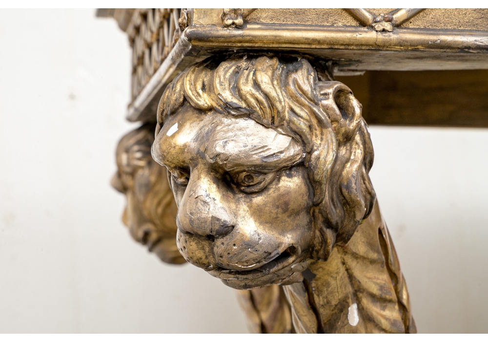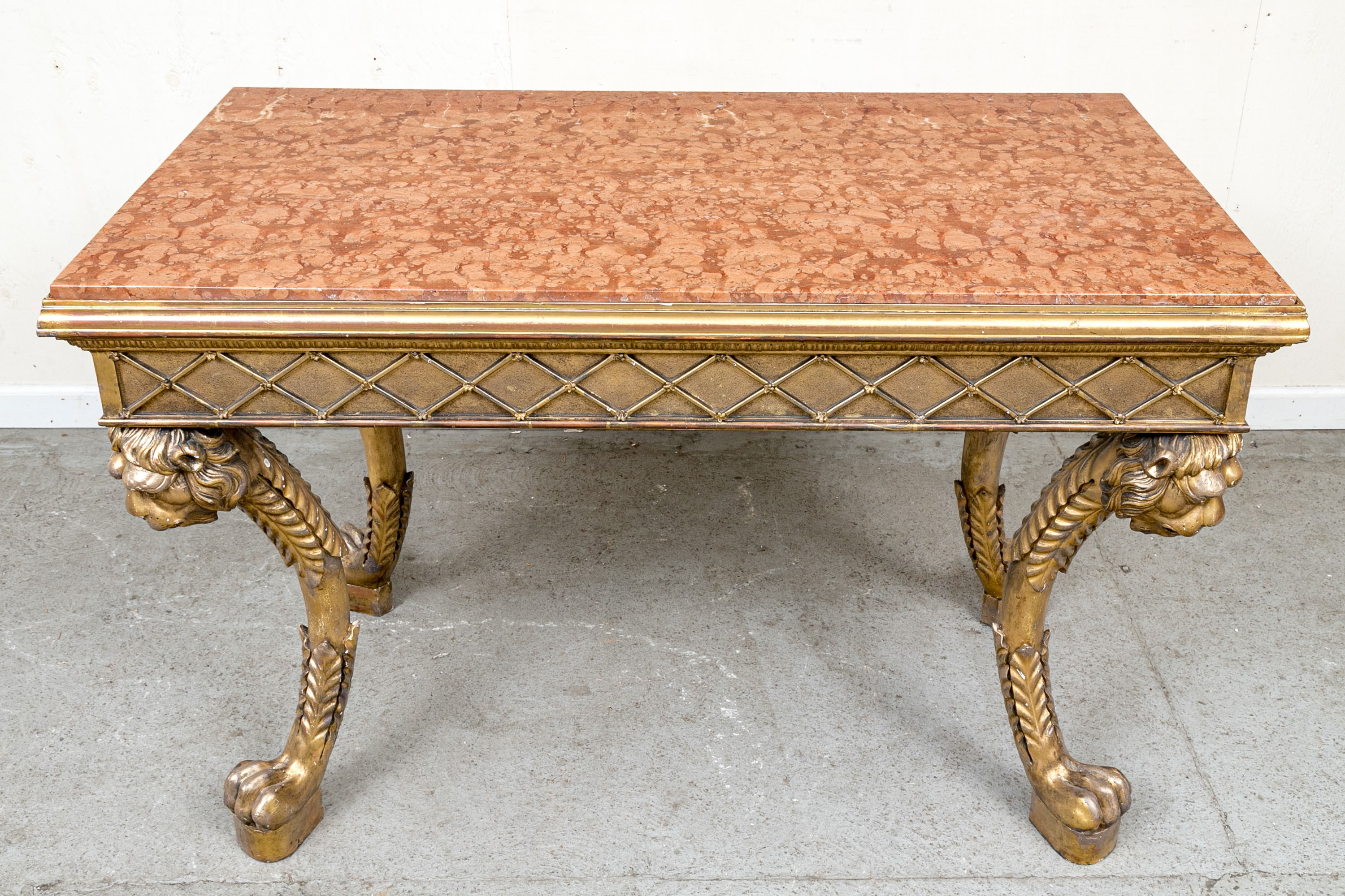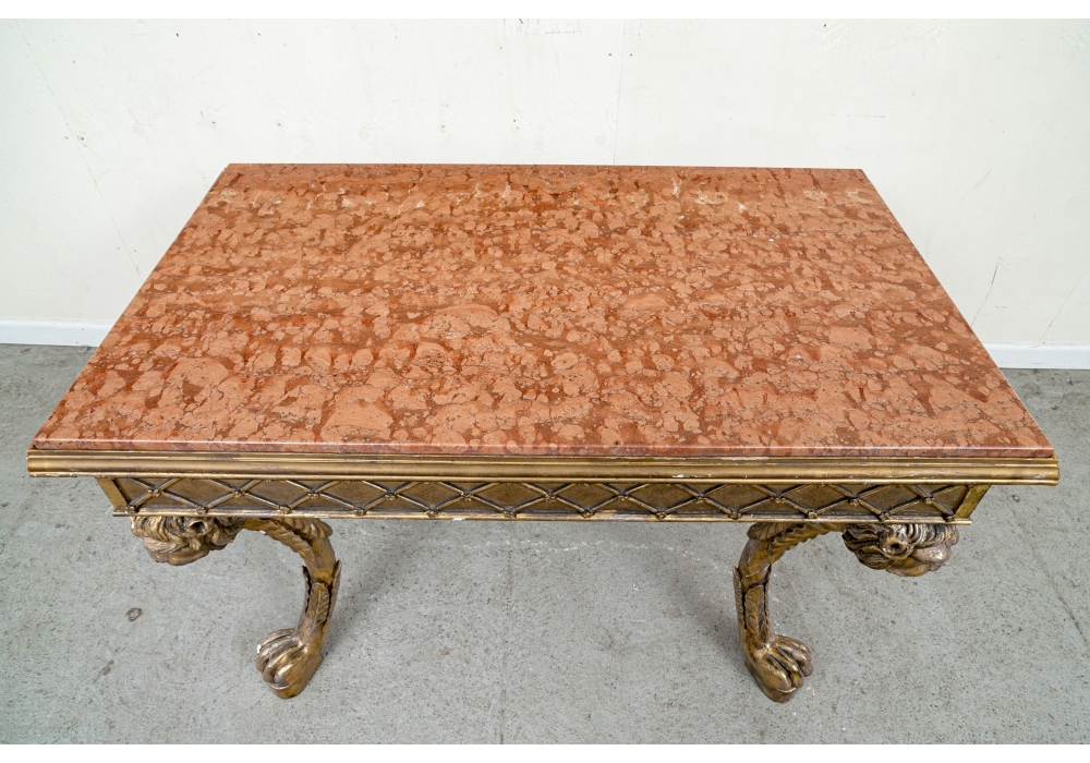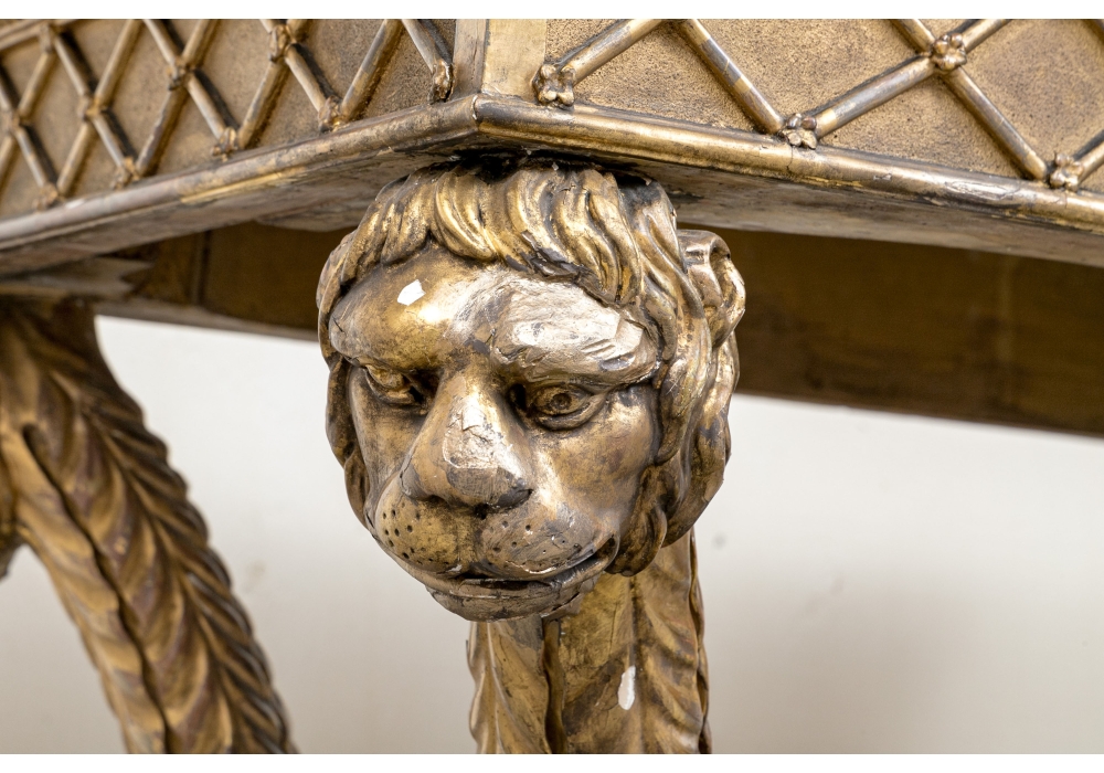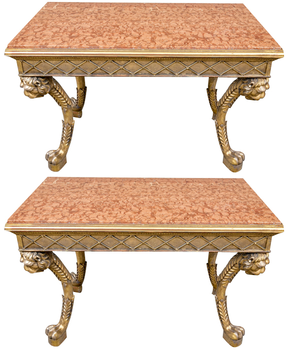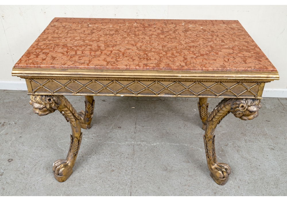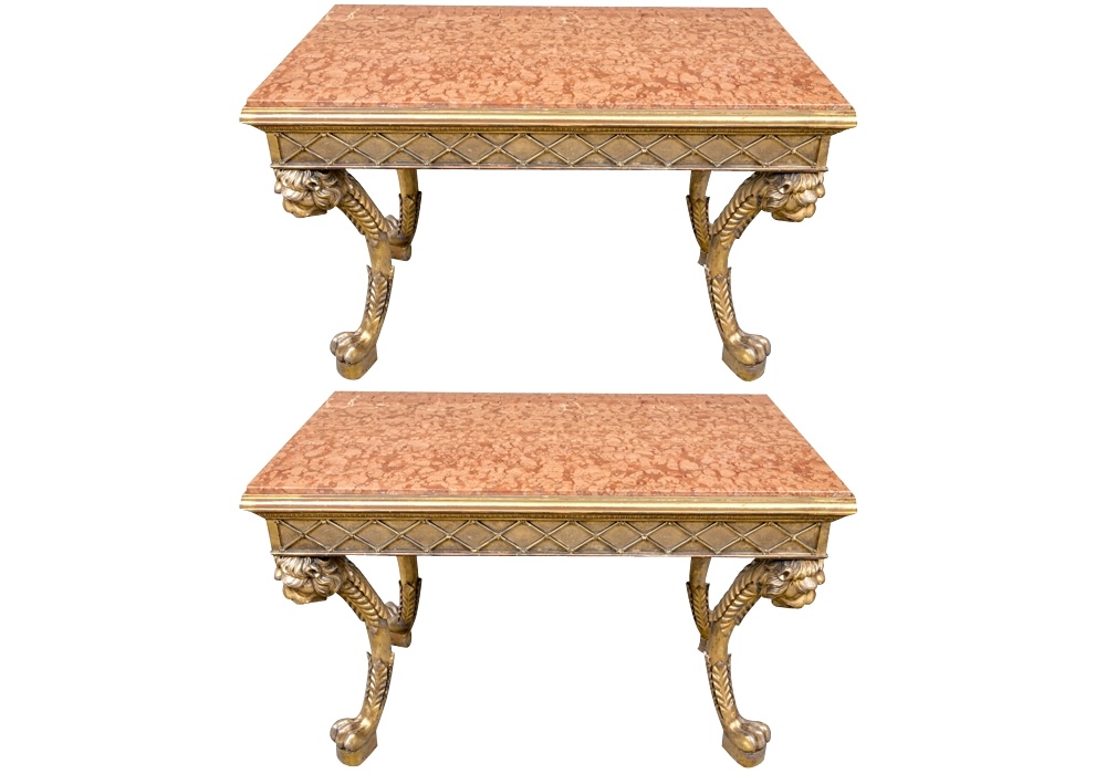 Pair of antique gilt console tables with inset rose marble tops. The console tables with raised lattice having flowers at intersections and surmounted on four open mouth lion head legs. The legs are carved and wrapped with dimensional leaves and terminating with bold paw feet on conforming plinths.